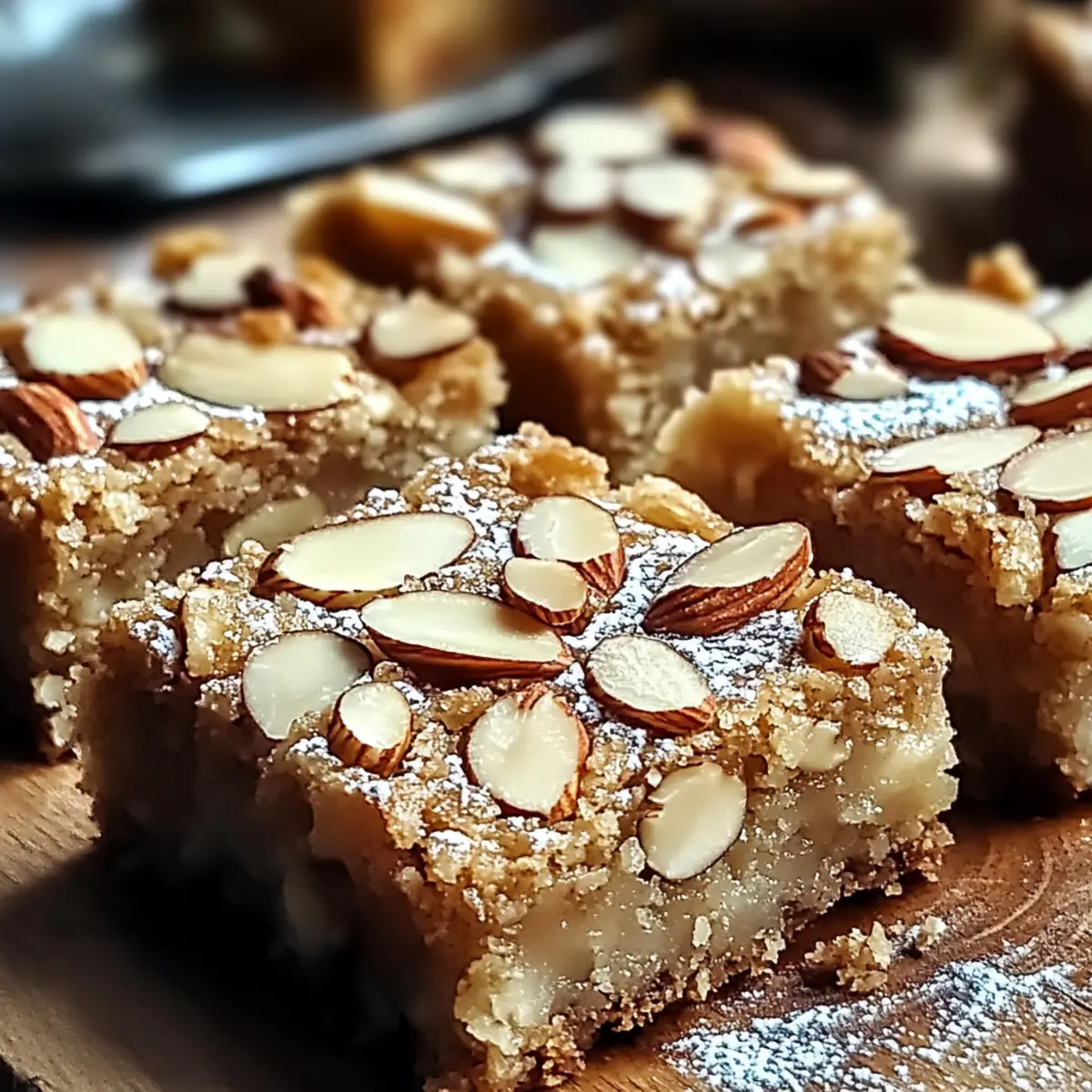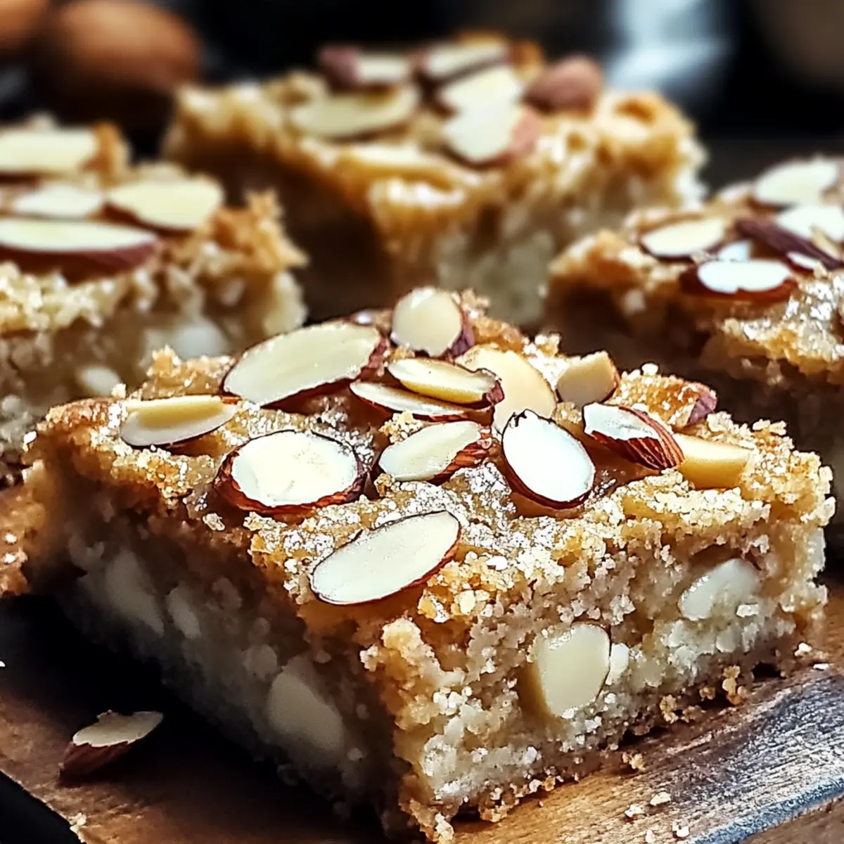 Jump to Recipe Print RecipeAs I was rearranging my pantry, a half-empty bag of almond flour caught my eye, and I instantly envisioned something special. That’s when I decided to create these Almond Croissant Blondies, a delightful fusion that marries the buttery richness of almond croissants with the chewy goodness of blondies. Not only are these treats a crowd-pleaser, but they also offer a fantastic make-ahead option for gatherings or cozy afternoons at home. Whether you’re gluten-free, dairy-free, or simply craving a delectable dessert, this easy recipe can be adapted to fit your dietary needs without compromising on taste. Curious how this all comes together? Let’s dive into the sweet, nutty world of these irresistible blondies! Why are Almond Croissant Blondies a must-try? Irresistible Flavor: These blondies combine rich almond essence with a chewy texture that will have your taste buds dancing with delight. Easily Adaptable: Whether you’re gluten-free, dairy-free, or vegan, this recipe can be tailored to suit your dietary needs, ensuring everyone can enjoy their goodness. Make-Ahead Magic: Perfect for meal prep, these blondies can be made in advance, allowing you to impress guests with minimal effort. Crowd-Pleasing Treat: Ideal for gatherings, these blondies are sure to become a favorite among friends and family, just like other desserts such as the Chocolate Croissant Bake. Comforting Texture: The chewy center and slightly crispy outside mirror the satisfaction of indulging in a classic pastry. Versatile Variations: Feel free to customize with chocolate chunks, citrus zest, or even cherry flavors for a delightful twist! Almond Croissant Blondies Ingredients For the Batter • Unsalted Butter – Adds richness and moisture; substitute with dairy-free butter for a vegan option. • Light Brown Sugar – Provides sweetness and contributes to a chewy texture; essential for the best flavor. • Eggs – Acts as a binder and provides structure; use flax eggs as a vegan alternative (1 tbsp flaxseed meal + 2.5 tbsp water per egg). • Vanilla Extract – Enhances overall flavor; fresh vanilla bean can elevate the taste further. • Almond Extract – Delivers a distinct almond flavor; extra vanilla extract can be used as a substitute. • All-Purpose Flour – Provides structure; opt for a gluten-free blend if necessary. • Baking Powder – Helps the blondies rise; ensure freshness for best results. • Salt – Optional, but enhances flavor in baked goods. • Almond Flour – Adds a nutty flavor and helps achieve the frangipane texture; ground almonds can work as a substitute. For the Toppings • Granulated Sugar – Provides sweetness; brown sugar can be used for a richer taste. • Sliced Almonds – Adds crunch and visual appeal; toasting enhances the flavor. These delightful Almond Croissant Blondies offer a smooth blend of rich flavors and textures that could become your new favorite dessert! Step‑by‑Step Instructions for Almond Croissant Blondies Step 1: Preheat and Prepare Your Pan Begin by preheating your oven to 350°F (175°C). While the oven warms up, line an 8×8-inch baking pan with parchment paper, ensuring it hangs over the edges for easy removal later. This preparation will set you up for the perfect Almond Croissant Blondies, giving them a beautiful, even bake. Step 2: Melt the Butter In a saucepan, melt the unsalted butter over low heat, stirring gently until fully liquefied. Once melted, remove it from the heat and let it cool slightly. In a medium mixing bowl, whisk the melted butter with light brown sugar until the mixture is smooth and glossy, showcasing that rich buttery goodness you’ll find in every blondie. Step 3: Incorporate the Eggs and Extracts Next, carefully incorporate your eggs, adding them one at a time and whisking vigorously after each addition. This process will help create a luscious texture in the blondies. Once the eggs are fully blended in, mix in the vanilla and almond extracts, filling your kitchen with the inviting aroma that perfectly complements the almond croissant flavor profile. Step 4: Combine Dry Ingredients In a separate bowl, sift together the all-purpose flour, baking powder, and salt. This helps ensure an even distribution of leavening. Gradually fold this dry mixture into your wet ingredients, using a spatula. Be careful not to overmix; you want the batter for your Almond Croissant Blondies to remain thick and slightly lumpy for that chewy texture. Step 5: Prepare the Frangipane For the lovely frangipane layer, beat together almond flour and granulated sugar in a small bowl. Add in the additional egg and mix until smooth and creamy. This mixture will bring a delightful almond richness to the blondies, providing a beautiful marbled effect when combined with the batter. Step 6: Assemble the Blondies Pour half of the blondie batter into your prepared baking pan and spread it evenly with a spatula. Next, dollop the frangipane mixture in spoonfuls across the blondie layer. Finally, spoon the remaining blondie batter on top and use a toothpick to swirl both mixtures together, creating a marbled masterpiece that captures the essence of almond croissants. Step 7: Add Toppings and Bake Before sliding the pan into the oven, sprinkle the sliced almonds generously over the top of the batter. This will add a crunchy texture to your Almond Croissant Blondies. Bake in the oven for 30-35 minutes, or until golden brown, and a toothpick inserted into the center comes out with moist crumbs. Step 8: Cool and Serve Once baked to perfection, remove the blondies from the oven and allow them to cool in the pan for about 10 minutes. Then, lift them out using the parchment paper and let them cool completely on a wire rack. For a charming presentation, dust with powdered sugar before slicing into squares and serving. Enjoy your delicious Almond Croissant Blondies! What to Serve with Almond Croissant Blondies Treat yourself and your loved on
