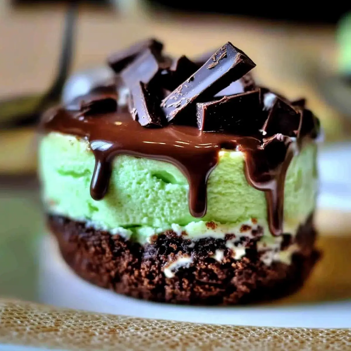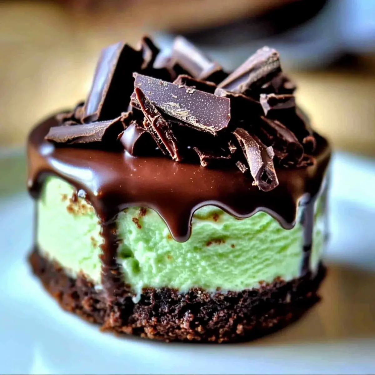 Jump to Recipe Print RecipeThe first time I tasted homemade cheesecake, I was utterly enchanted by its velvety texture—pure bliss with every bite. Fast forward to today, and I’m just as thrilled to share my Andes Mint Mini Cheesecakes, a delightful fusion of rich chocolate and refreshing mint that will elevate any dessert table. These bite-sized wonders are not only incredibly easy to whip up but also freezer-friendly, making them an ideal treat for those surprise guests or impromptu celebrations. Imagine having a sweet treat ready to go at a moment’s notice! So, are you ready to indulge your senses and impress your friends with these deliciously creamy delights? Let’s dive into this delectable recipe! Why Are These Cheesecakes So Irresistible? Decadent Flavor: Each bite of these Andes Mint Mini Cheesecakes is a heavenly blend of creamy mint cheesecake and rich chocolate crust, making them an instant hit for chocolate lovers. Easy to Make: With just a few simple ingredients and straightforward steps, you can whip up these delightful treats even if you’re a novice baker. Make-Ahead Magic: These mini cheesecakes can be prepared in advance and stored in the freezer, so you’ll always have a sweet surprise ready for guests or an afternoon craving. Crowd-Pleasing Appeal: Whether it’s a dinner party or a holiday gathering, their bite-sized form and unique flavor will delight friends and family alike. Versatile Variations: Feel free to customize with different toppings, like white chocolate or other mint candies, to make them your own! Enjoy these mouthwatering Andes Mint Mini Cheesecakes alongside a cup of coffee or tea for the ultimate treat experience. Andes Mint Mini Cheesecake Ingredients For the Crust • Nonstick Baking Spray – Prevents sticking; you can use regular cooking spray as a substitute. • Chocolate Graham Cracker Crumbs (1¼ cups) – Provides the crust base; can substitute with crushed regular graham crackers or digestive biscuits. • Granulated Sugar (2 tablespoons) – Adds sweetness to the crust. • Butter, melted (4 tablespoons) – Binds the crust ingredients; use unsalted butter for better control of salt levels. For the Filling • Cream Cheese, softened (2 x 8 oz boxes) – Main filling ingredient for creaminess; full-fat cream cheese is recommended for best results. • Granulated Sugar (¼ cup + 2 tablespoons) – Adds sweetness to the cheesecake filling. • Egg (1) – Provides structure and moisture; use room temperature eggs to mix easily. • Mint Extract (1 teaspoon) – Infuses the cheesecake with mint flavor; you can substitute with crème de menthe for a unique flavor. • Green Food Coloring (4 drops) – Optional, for aesthetic appeal. For Topping • Chocolate Chips (1¼ cups) – Melts down for topping; semi-sweet or dark chocolate works well. • Andes Mints (15, coarsely chopped) – Adds a minty chocolate finish; can replace with another mint chocolate candy if needed. These Andes Mint Mini Cheesecakes are not only a delightful treat; they also make for a perfect make-ahead dessert to impress your guests! Step‑by‑Step Instructions for Andes Mint Mini Cheesecakes Step 1: Preheat and Prepare Start by preheating your oven to 325°F (163°C). While the oven heats, spray the cavities of a mini cheesecake pan generously with nonstick baking spray to ensure easy removal later. This simple step lays the foundation for your Andes Mint Mini Cheesecakes, preventing any sticking for a smooth finish. Step 2: Make the Crust In a mixing bowl, combine 1¼ cups of chocolate graham cracker crumbs with 2 tablespoons of granulated sugar and 4 tablespoons of melted butter. Stir together until the mixture resembles wet sand. Evenly divide this crust mixture among the mini cheesecake cavities and press it firmly down to create a solid base. Step 3: Blend the Filling In a stand mixer, add two 8 oz boxes of softened cream cheese along with ¼ cup + 2 tablespoons granulated sugar. Mix these ingredients on medium speed until smooth and creamy, about 2-3 minutes. Keeping the Andes Mint Mini Cheesecakes creamy is crucial, so ensure there are no lumps before moving on to the next step. Step 4: Incorporate Wet Ingredients Next, add one room-temperature egg, 1 teaspoon of mint extract, and 4 drops of green food coloring to the cream cheese mixture. Blend on low just until combined. Be careful not to over-mix; you want consistency without incorporating too much air, which can lead to cracks in your cheesecakes. Step 5: Assemble the Cheesecakes Spoon the creamy filling evenly over the prepared chocolate crusts in the mini cheesecake pan. Make sure to fill each cavity just below the rim, allowing space for the cheesecakes to rise slightly while baking. This step will contribute to the smooth texture of your Andes Mint Mini Cheesecakes. Step 6: Bake to Perfection Carefully place the mini cheesecake pan in the preheated oven. Bake for about 20 minutes until the edges are set but the centers are still slightly jiggly. Avoid opening the oven door during baking to maintain a consistent temperature which helps prevent cracks in your cheesecakes. Step 7: Cool Gradually Once baked, turn off the oven while leaving the door slightly ajar with the help of a wooden spoon. This gentle cooling method allows the Andes Mint Mini Cheesecakes to set slowly, avoiding temperature shock. Let them cool in the oven for an additional 5 to 10 minutes before transferring to a wire rack. Step 8: Chill for Best Flavor After the cheesecakes are cool, refrigerate them for several hours or ideally overnight. This chilling time enhances their flavor and texture, allowing the mint and chocolate to meld beautifully. When ready to serve, carefully remove each mini cheesecake from the pan. Step 9: Final Touch with Chocolate Melt 1¼ cups of chocolate chips in a microwave-safe bowl in 30-second intervals, stirring each time until completely smooth. Once melted, drizzle the chocolate over the top of 
