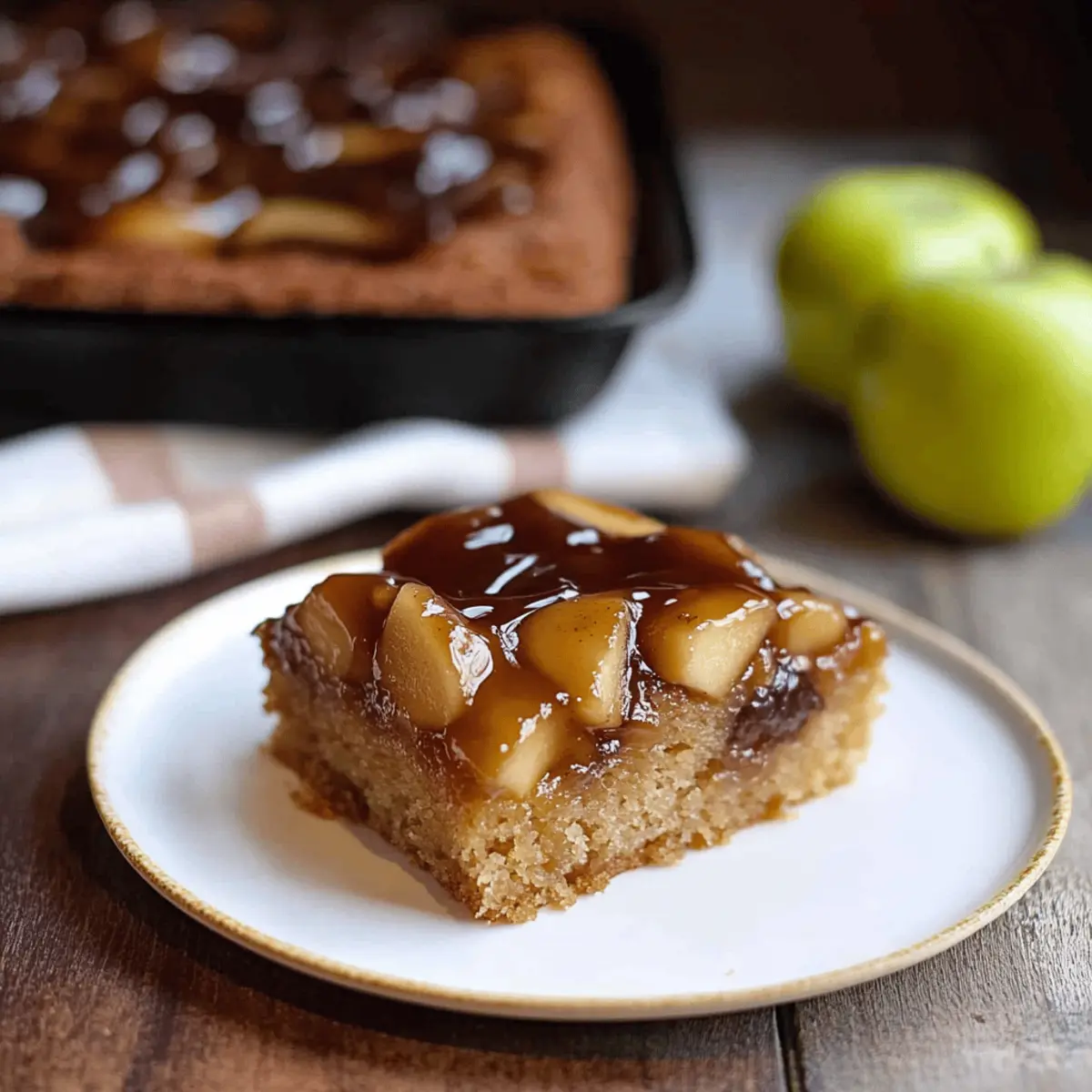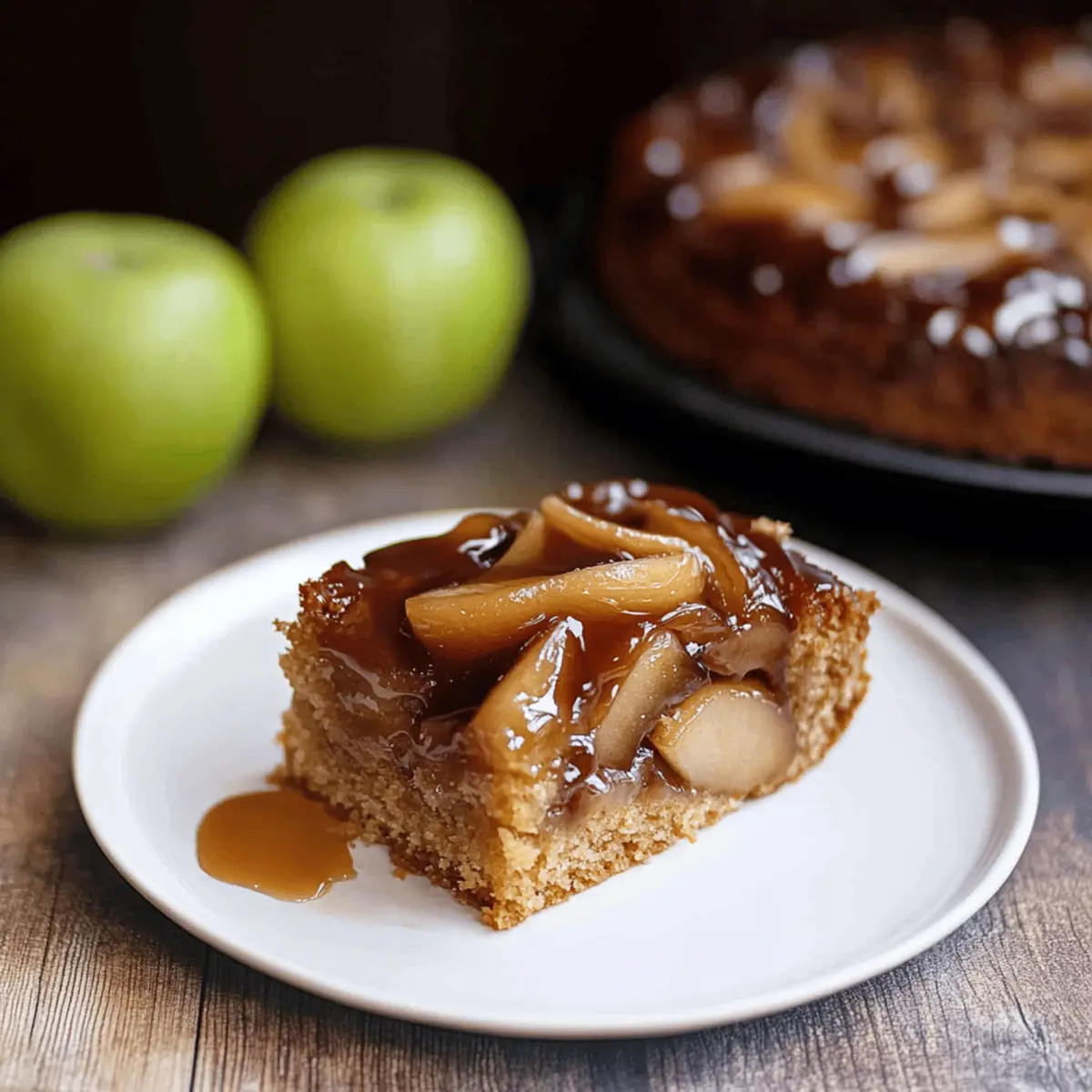 Jump to Recipe Print RecipeAs the leaves turn golden and the air grows crisp, I find myself dreaming of warm flavors and comforting desserts. Nothing embodies this cozy vibe quite like Apple Cinnamon Upside-Down Cake. This semi-easy recipe is a delightful escape, featuring gooey caramelized apples that are kissed by cinnamon—a perfect way to transform your autumn apples into something special. Not only does it fill your kitchen with tantalizing aromas, but this moist cake is also an irresistible treat for gatherings or quiet evenings at home. Can you imagine serving it warm with a scoop of vanilla ice cream? That’s pure comfort right there. So, why settle for fast food when you can whip up this slice of fall magic? Why is this cake a must-try? Moist and Flavorful: This Apple Cinnamon Upside-Down Cake is a delightful blend of tender cake and luscious caramelized apples, bursting with fall flavors. Gooey Caramel Magic: The homemade topping creates a rich, sticky goodness that perfectly envelops each apple slice. Semi-Easy to Make: With straightforward steps, it’s accessible for both novice and experienced bakers. Impressive Presentation: When inverted, the cake reveals a stunning display that makes it perfect for gatherings. Serve it warm with a scoop of vanilla ice cream, and you’ll have everyone reaching for seconds—just like with my Cloud Cake or Churro Cheesecake recipes! Apple Cinnamon Upside-Down Cake Ingredients Dive into this delectable fall dessert! For the Topping • Unsalted Butter (¼ cup) – Provides moisture and richness; feel free to substitute with salted butter but reduce additional salt. • Dark Brown Sugar (⅔ cup, packed) – Adds sweetness and depth from molasses; light brown sugar can be used as a substitute, though it slightly alters flavor. • Ground Cinnamon (½ teaspoon) – Enhances warmth and spiciness; try using Vietnamese cinnamon for a bold flavor without increasing quantity. • Apples (2 large, peeled, cored, and sliced) – The star ingredient that adds moisture and flavor; Granny Smith, Jonagold, or Honey Crisp are perfect for baking. For the Cake • All-Purpose Flour (1⅓ cups) – Provides structure and texture; use a gluten-free all-purpose blend to make it gluten-free. • Baking Powder (1 teaspoon) – Acts as a leavening agent for a light and fluffy cake. • Salt (¼ teaspoon) – Enhances flavor; you may skip it if using salted butter. • Granulated Sugar (1 cup) – Sweetens the cake; consider using coconut sugar for a richer taste. • Eggs (2) – Binds all the ingredients together while adding moisture; no substitutes recommended. • Vanilla Extract (½ teaspoon) – Imparts aromatic flavor; opt for pure vanilla extract for the best results. • Whole Milk (¼ cup) – Contributes to the tenderness of the cake; dairy-free alternatives like almond or oat milk work well too. Let your baking adventure begin with these simple yet essential ingredients for your Apple Cinnamon Upside-Down Cake! Step‑by‑Step Instructions for Apple Cinnamon Upside-Down Cake Step 1: Preheat Oven and Prepare Pan Begin by preheating your oven to 350°F (175°C). Take an 8-inch square baking pan and line it with parchment paper, then spray the sides with baking spray. This ensures that your Apple Cinnamon Upside-Down Cake will come out easily after baking and helps to achieve that beautiful, caramelized top. Step 2: Make the Caramel Topping In a medium saucepan over medium heat, melt ¼ cup of unsalted butter. Once melted, stir in ⅔ cup of dark brown sugar and whisk continuously until the mixture comes to a boil, which should take about 3–5 minutes. When bubbling, add ½ teaspoon of ground cinnamon, mix well, and immediately pour the caramel sauce into the prepared pan. Quickly arrange your sliced apples closely in the syrup to create an even layer. Step 3: Combine Dry Ingredients In a mixing bowl, whisk together 1⅓ cups of all-purpose flour, 1 teaspoon of baking powder, the remaining ½ teaspoon of ground cinnamon, and ¼ teaspoon of salt. This mixture forms the dry ingredients that will create a tender structure for your cake. Make sure it’s well-mixed to avoid any lumps in your Apple Cinnamon Upside-Down Cake batter. Step 4: Cream Butter and Sugar In a separate large bowl, use an electric mixer to beat together 1 cup of granulated sugar and ¼ cup of softened unsalted butter until light and fluffy, about 3–5 minutes. Add the eggs one at a time, mixing until just combined after each addition. Then, pour in ½ teaspoon of vanilla extract to enhance the cake’s flavor, ensuring your mixture is smooth and creamy. Step 5: Combine Mixtures Gradually add your dry ingredients to the butter and sugar mixture, alternating with ¼ cup of whole milk. Begin with dry ingredients, then add milk, and mix until just combined without overmixing. The batter for your Apple Cinnamon Upside-Down Cake should be smooth and thick. If necessary, scrape down the sides of the bowl to ensure everything is evenly mixed. Step 6: Assemble Cake Carefully pour the batter over the arranged apple slices in the pan, spreading it evenly to cover all the apples. Place the pan in the preheated oven and bake for 40–55 minutes. The cake is done when a toothpick inserted into the center comes out clean, and the top is golden brown and slightly springy to the touch. Step 7: Cool and Invert Once your Apple Cinnamon Upside-Down Cake is baked, remove it from the oven and let it cool in the pan for about 15 minutes. After cooling, run a knife around the edges of the cake to loosen it. With a quick motion, carefully invert the cake onto a serving platter and lift the pan away. The caramelized apple topping should be beautifully showcased on top! Apple Cinnamon Cake Variations & Substitutions Feel free to get creative with this delightful Apple Cinnamon Upside-Down Cake, making it truly your own! Fruit Swap: Substitute apples with pears or peaches for a different flavor twist. The j