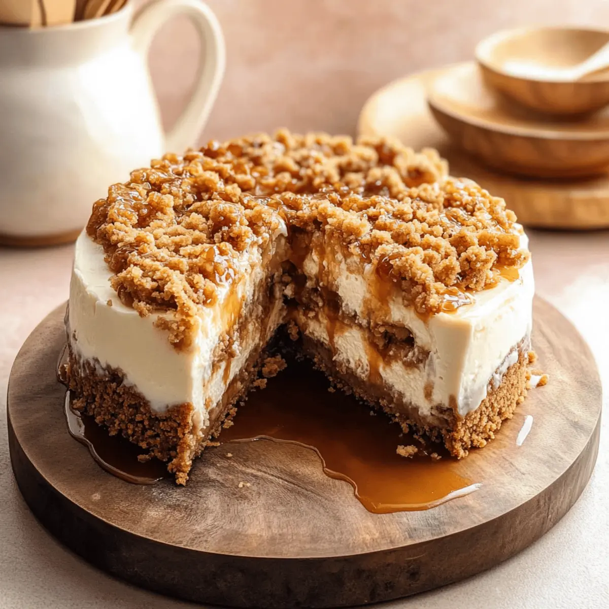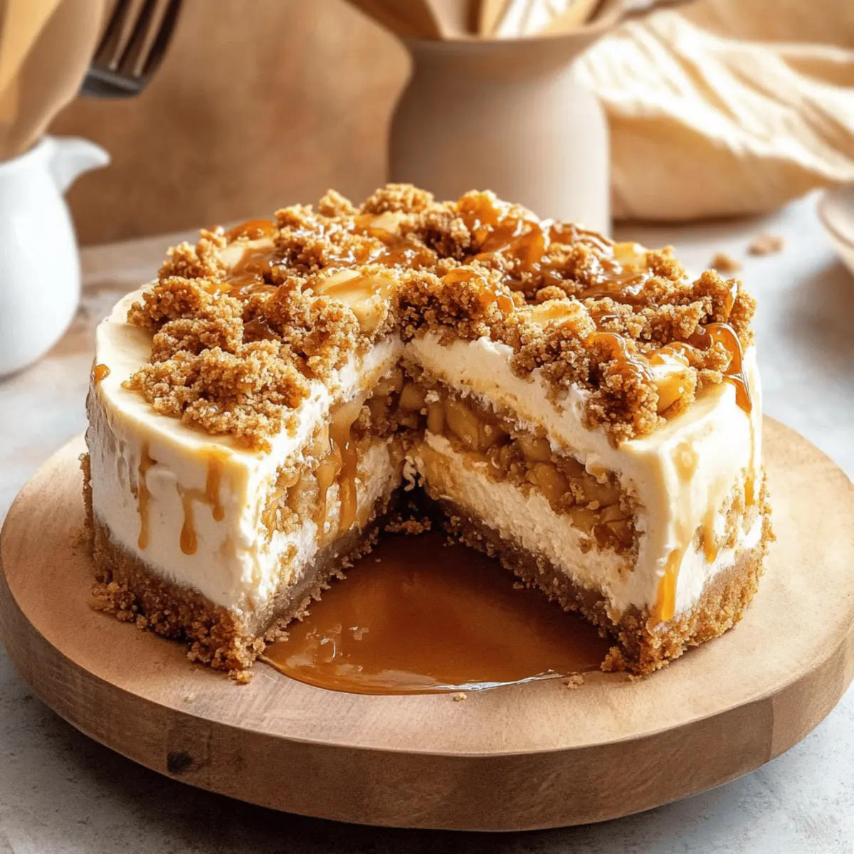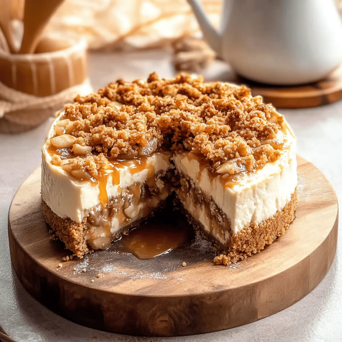 Jump to Recipe Print RecipeAs the seasons shift and a crispness fills the air, the magic of autumn invites us to embrace comforting treats. This Apple Crumble Cheesecake combines two beloved desserts into one irresistible creation, blending the creamy richness of cheesecake with the warm, spiced goodness of apple pie. With its buttery graham cracker crust and a crunchy crumble topping, this recipe offers a delightful way to savor fall’s flavors while impressing your friends and family. Not only is it a crowd-pleaser perfect for festive gatherings, but it’s also surprisingly simple to whip up—ideal for those of us who love homemade delights but are short on time. Are you ready to dive into this creamy, dreamy dessert that captures the essence of the season? Why is this Apple Crumble Cheesecake irresistible? Heavenly Combination: This cheesecake perfectly merges creamy cheesecake and spiced apple filling into a dessert that offers both comfort and indulgence. Time-Saving Delight: Minimal prep time and simple steps mean you can create this delicious treat without spending hours in the kitchen. Crowd-Pleasing Appeal: Whether at a family gathering or a festive celebration, this dessert will have everyone asking for seconds—just like our Berry Peach Cheesecake will! Texture Harmony: Each bite features a buttery crust, luscious cheese layer, and crunchy crumble that makes it simply irresistible. Customizable Goodness: Feel free to experiment with flavors or toppings, like adding nuts to the crumble or swapping apples for pears for a unique twist! Enjoy this delightful dessert that brings a seasonal warmth, similar to our Blueberry Cheesecake Bars for a fresh spin on classic flavors. Apple Crumble Cheesecake Ingredients • The following ingredients are key to creating a delicious Apple Crumble Cheesecake that your loved ones will adore. For the Crust Graham Crackers – Perfect for a buttery crust base; you can substitute with digestive biscuits for a similar crunch. Unsalted Butter – Binds both the crust and crumble together; use melted for easier mixing. Granulated Sugar – Sweetens the crust and cheesecake; caster sugar can be a great alternative. Cinnamon – Adds warm spice, essential for flavor depth in both the crust and apple filling. For the Cheesecake Filling Cream Cheese – The heart of the cheesecake; opt for full-fat and bring it to room temperature for a smooth consistency. Sour Cream – Balances the richness with a touch of tang; ensure it’s well-blended for best results. Eggs – Acts as a binder for the cheesecake filling; use room-temperature eggs for smoother mixing. Cornstarch – Stabilizes the filling for a smooth texture; flour can serve as a substitute if needed. For the Apple Filling Apples – Provides the delicious apple pie flavor; Granny Smith or Honeycrisp varieties are perfect for contrast. Brown Sugar – Enhances sweetness with caramel notes; feel free to swap with white sugar if necessary. Nutmeg – Complements the apples with aromatic warmth. Lemon Juice – Prevents apple browning while enhancing overall flavor. For the Crumble Topping Rolled Oats – Adds chewiness to the crumble; quick oats can create a finer texture. Flour (All-Purpose) – Essential for that crumbly topping; can easily be substituted with gluten-free flour for a gluten-free option. With these ingredients ready, you’re just a few steps away from creating a truly indulgent Apple Crumble Cheesecake that beautifully captures the essence of autumn! Step‑by‑Step Instructions for Apple Crumble Cheesecake Step 1: Prep Apple Filling Begin by peeling, coring, and slicing 4-5 apples into thin pieces. In a medium saucepan, melt 2 tablespoons of unsalted butter over medium heat, then add the apples along with ½ cup of brown sugar, 1 teaspoon of cinnamon, and a pinch of nutmeg. Cook for 5-7 minutes until the apples are fork-tender, then stir in a cornstarch slurry made from 1 tablespoon of cornstarch and 2 tablespoons of water. Allow the mixture to cool completely. Step 2: Make the Crust Preheat your oven to 350°F (180°C). In a mixing bowl, combine 1 ½ cups of graham cracker crumbs, ¼ cup of granulated sugar, and ½ teaspoon of cinnamon. Pour in 6 tablespoons of melted unsalted butter and mix until the crumbs are evenly coated. Press this mixture firmly into the bottom of a 10-inch springform pan to create a compact crust. Bake for 7-8 minutes until golden, then set aside to cool. Step 3: Cheesecake Filling In a large mixing bowl, beat 24 ounces of room-temperature cream cheese with 1 cup of granulated sugar until smooth and creamy. Add 1 cup of sour cream and 1 teaspoon of vanilla extract, mixing until well blended. Next, incorporate two lightly beaten eggs, one at a time, ensuring not to overmix. Finally, sift in 3 tablespoons of cornstarch and gently fold it into the mixture until just combined for your Apple Crumble Cheesecake filling. Step 4: Assemble Layers Pour half of the cheesecake filling over the cooled crust, spreading it evenly. Next, carefully layer the prepared apple filling over the cheesecake, ensuring it’s spread out evenly. Top this with the remaining cheesecake batter, smoothing the surface with a spatula. The layers create a delightful surprise when slicing into your Apple Crumble Cheesecake. Step 5: Add Crumble Topping In a separate bowl, mix together 1 cup of rolled oats, ½ cup of flour, and ¼ cup of brown sugar. Add 6 tablespoons of melted butter and mix until a crumbly texture forms. Sprinkle this crumble mixture generously over the top of the cheesecake layers, ensuring it covers evenly to create a satisfying crunch once baked. Step 6: Bake Lower the oven temperature to 300°F (150°C) and bake the Apple Crumble Cheesecake for about 60 minutes. The edges should be set while the center still jiggles slightly. Once done, turn off the oven and crack the door open, allowing the cheesecake to cool in the oven for 1-2 hours—this helps prevent cracks 