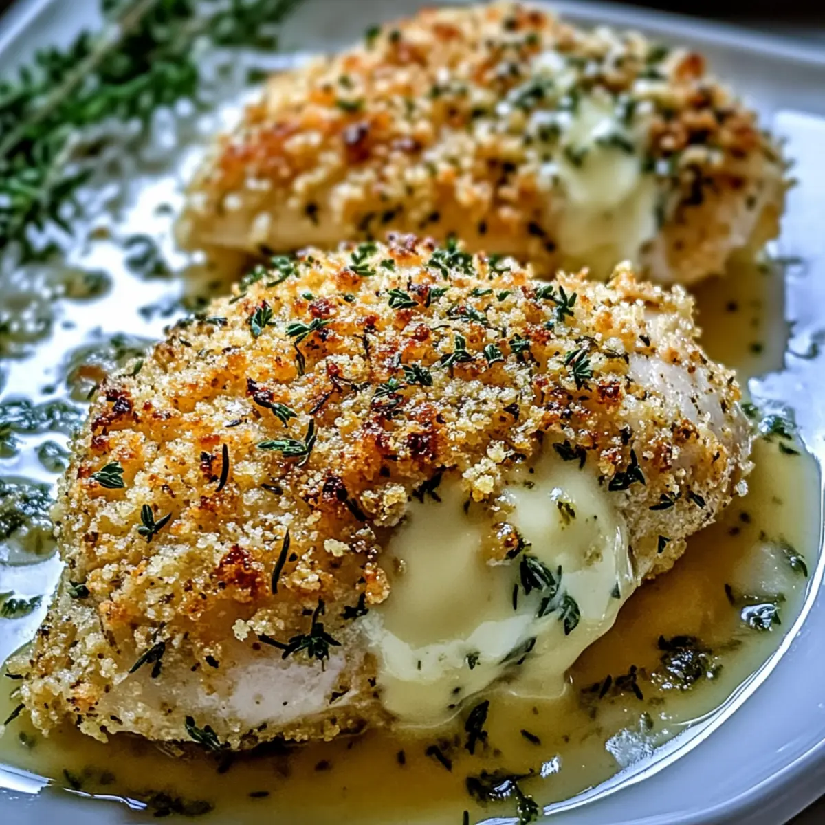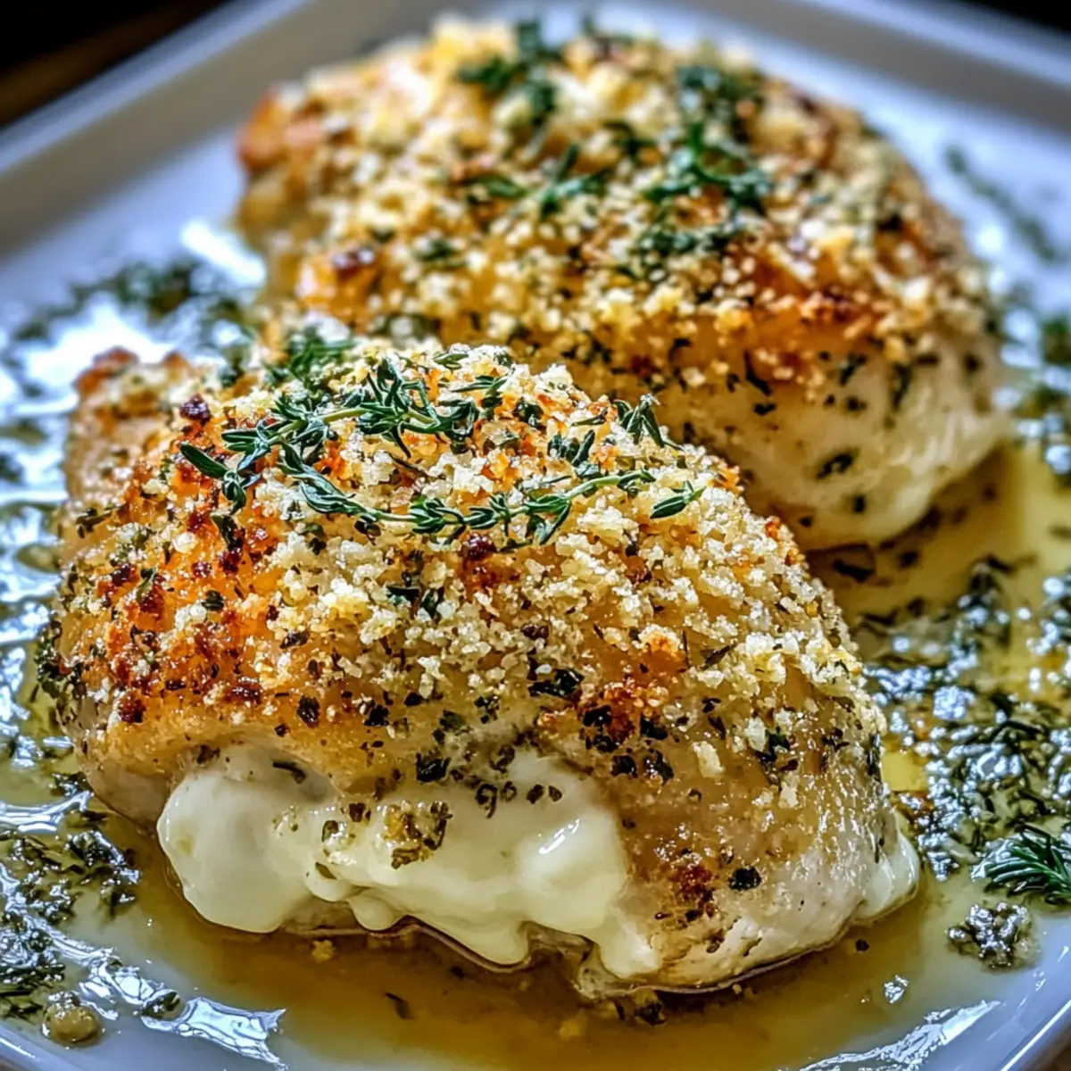 Jump to Recipe Print RecipeAs I sliced into the Herb-Crusted Baked Boursin Chicken, the aroma enveloped my kitchen like a warm hug—each bite a crescendo of creamy, garlicky goodness. This dish transforms simple chicken breasts into a gourmet experience, stuffed generously with Boursin cheese and cloaked in a crunchy herb-infused coating. What I love most is the quick prep; it’s ready in just 35 minutes, making it the perfect solution for busy weeknights or those moments when surprise guests drop by. Not only is this recipe a surefire crowd-pleaser, but its versatility allows you to swap ingredients, keeping dinner exciting. Are you ready to elevate your dinner game? Let’s dive into this delicious journey together! Why is this chicken recipe a must-try? Flavor Explosion: Each bite reveals a creamy center of Boursin cheese, bursting with garlicky goodness. Quick Preparation: With only 35 minutes from start to finish, weeknight dinners never felt this gourmet! Versatile Options: Customize easily by swapping Boursin with cream cheese or herbed goat cheese, just like in my Cowboy Butter Chicken recipe for an unforgettable twist. Impressive Presentation: The golden, crispy exterior creates a restaurant-quality dish that wows guests. Comfort Food Delight: This recipe balances sophistication and comfort, making it perfect for cozy family nights or special occasions! Baked Boursin Chicken Ingredients For the Chicken Boneless, skinless chicken breasts – Choose pieces of uniform thickness for even cooking. Boursin cheese (5.2 oz) – This rich and creamy filling can be swapped for cream cheese or herbed goat cheese for a delightful variation. For the Coating Panko breadcrumbs (1 cup) – Provides a wonderfully crunchy texture; you can use regular breadcrumbs, but they may change the crispiness level. Grated Parmesan cheese (1/4 cup) – Adds depth of flavor to the crunchy coating. Chopped fresh parsley (2 tbsp) – Enhances the dish’s flavor; dried parsley can be substituted in a pinch (1 tsp). Chopped fresh thyme (1 tbsp) – This aromatic herb brings brightness; dried thyme works as a substitute (1 tsp) if needed. Chopped fresh rosemary (1 tbsp) – Infuses the dish with herbal goodness; feel free to use 1 tsp of dried rosemary instead. Olive oil (1 tbsp) – Helps the breadcrumbs adhere to the chicken and boosts crispiness. Garlic powder (1 tsp) – Adds an essential layer of flavor. Onion powder (1 tsp) – Contributes a rich base flavor. Salt and pepper – Use these staples to season according to your personal taste. Melted butter (2 tbsp) – Ensures a rich, golden crust that is hard to resist. This Baked Boursin Chicken recipe is sure to impress with its ease and flavor! Step‑by‑Step Instructions for Baked Boursin Chicken Step 1: Preheat the Oven Begin by preheating your oven to 375°F (190°C). While the oven heats, take out a 9×13-inch baking dish and lightly grease it with cooking spray or a drizzle of olive oil. This will ensure your Baked Boursin Chicken doesn’t stick while it bakes, giving you that perfect golden crust. Step 2: Prepare the Coating In a mixing bowl, combine 1 cup of panko breadcrumbs, ¼ cup of grated Parmesan cheese, 2 tablespoons of chopped fresh parsley, 1 tablespoon of chopped fresh thyme, and another tablespoon of chopped fresh rosemary. Add 1 teaspoon each of garlic powder and onion powder, along with salt and pepper to taste. Mix thoroughly until all ingredients are well combined and set this aromatic mixture aside. Step 3: Stuff the Chicken Take your boneless, skinless chicken breasts and carefully create a pocket in each one by slicing horizontally, being careful not to cut all the way through. Generously stuff the pockets with Boursin cheese, allowing the creamy filling to ooze slightly out of the sides for added flavor. This rich filling is what makes the Baked Boursin Chicken so decadent! Step 4: Secure the Chicken If necessary, use toothpicks to close the openings of the stuffed chicken breasts. This step ensures that the creamy Boursin cheese stays securely inside during the cooking process. Just make sure to remove the toothpicks after baking to avoid any surprises at the dinner table! Step 5: Coat the Chicken Brush each stuffed chicken breast with about 1 tablespoon of olive oil, which helps the breadcrumb mixture adhere better. Then, take the prepared coating and firmly press it onto the chicken breasts, ensuring an even layer of that crunchy panko mixture envelops all sides. This step is crucial for achieving that delightful texture when baked. Step 6: Arrange in the Baking Dish Place the coated chicken breasts into the greased baking dish, making sure they are spaced apart for even cooking. Once arranged, drizzle the tops with 2 tablespoons of melted butter to enhance the flavor and promote a gorgeous golden-brown color. This extra touch will elevate your Baked Boursin Chicken to gourmet status. Step 7: Bake to Perfection Transfer the baking dish to your preheated oven and allow the Baked Boursin Chicken to bake for 30-35 minutes. Keep an eye on them as they cook; you’re looking for a beautiful golden-brown crust, and an internal temperature of 165°F (74°C) will ensure they are thoroughly cooked and safely ready to serve. Step 8: Rest Before Serving Once baked perfectly, remove the chicken from the oven and let it rest for about 5 minutes before serving. This resting period allows the juices to redistribute, keeping the chicken tender and juicy. Before plating, don’t forget to remove any toothpicks that secured the stuffing. Now your Baked Boursin Chicken is ready to take the center stage at your dinner table! Storage Tips for Baked Boursin Chicken Fridge: Store any leftovers in an airtight container for up to 3 days. To keep the coating crispy, place a paper towel inside the container. Freezer: If you have uncooked Baked Boursin Chicken, wrap it tightly in plastic wrap and aluminum foil, ensuring no air is trapped, and freeze 