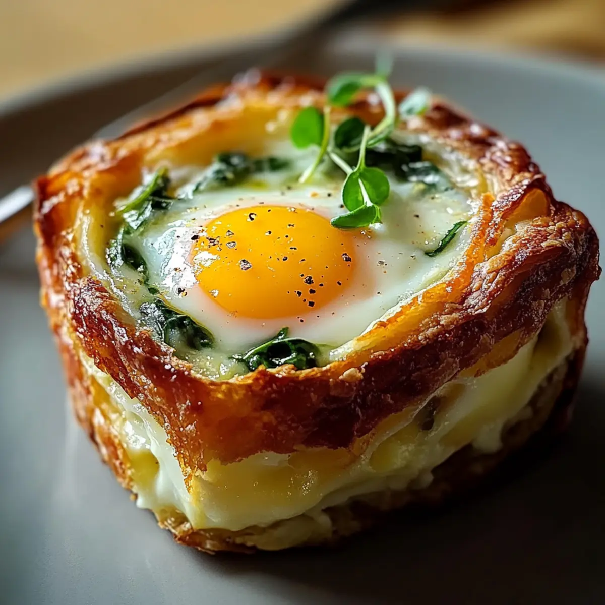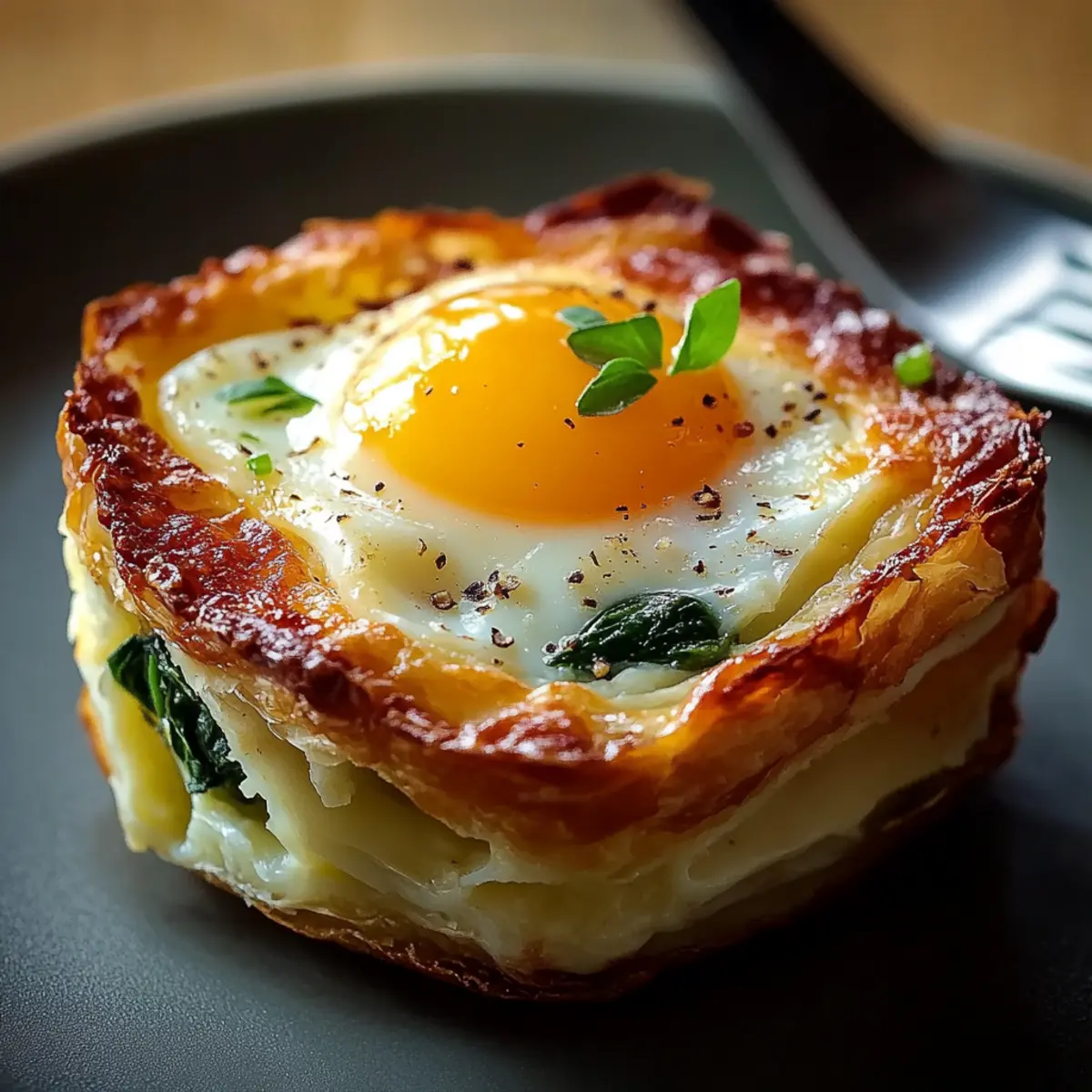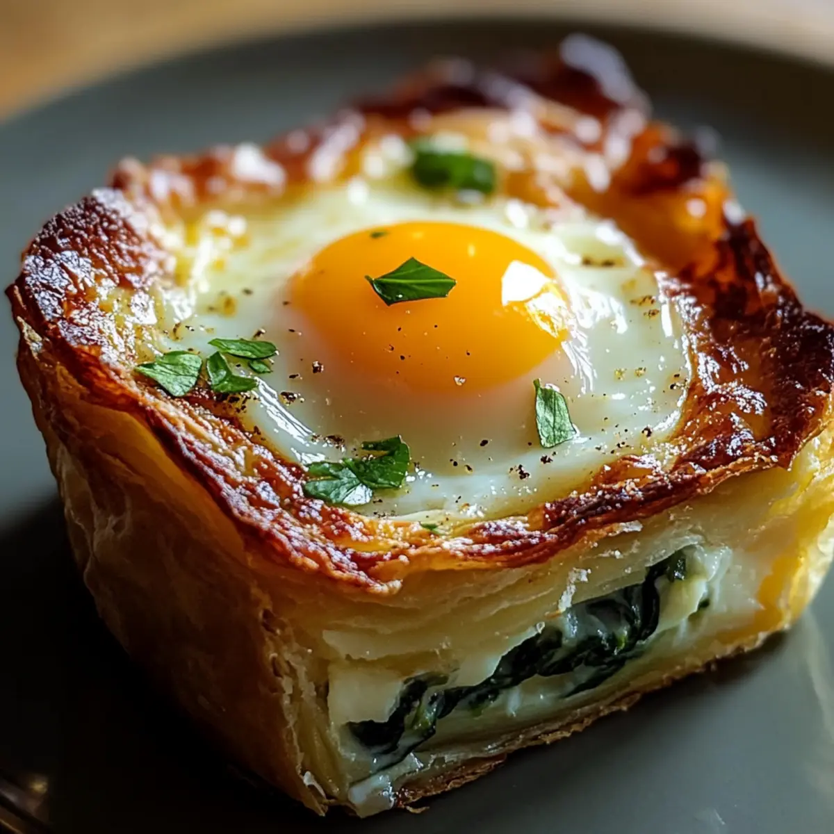 Jump to Recipe Print RecipeAs the warm, inviting aroma wafts through your kitchen, you can’t help but feel a touch of excitement—Baked Eggs Napoleon is on the horizon! Combining the delicate flakiness of puff pastry with a creamy spinach filling and perfectly baked eggs, this dish is an impressive yet easy brunch option sure to wow your guests. Not only does it showcase your culinary skills, but it’s also wonderfully adaptable, allowing you to play with ingredients from cheese to seasonal veggies. This recipe brings sophisticated charm to the table without requiring hours of prep, making it perfect for both casual weekends and special celebrations. Ready to elevate your brunch game? Let’s dive into this delightful dish together! Why is Baked Eggs Napoleon a must-try? Elevated Flavors: Indulge in the luxurious taste of creamy spinach and savory cheese enveloped in delicate puff pastry. This dish is a gourmet experience made easy! Versatile Ingredients: Mix and match with your favorite vegetables and cheeses—think fresh herbs or crispy prosciutto to personalize your creation. Try using seasonal veggies for an extra flavor kick! Crowd Pleaser: Perfect for entertaining guests or a relaxed brunch with family, it offers impressive presentation and taste without the fuss. Pair it with a light salad or fresh fruit for a complete meal! Time-Saving Delight: Enjoy the famous puff pastry that simplifies preparation while elevating your brunch game. Less time cooking means more time to savor delicious moments, just like with our Baked Maple Donut recipe! Simplicity in Cooking: Whether you’re a seasoned chef or a kitchen novice, this recipe is easy to follow, ensuring success every time. Give it a try—you won’t be disappointed! Baked Eggs Napoleon Ingredients For the Pastry • Puff Pastry – This flaky base is best made with frozen sheets that are properly thawed for easy handling. For the Filling • Eggs – Use large eggs as they provide the perfect richness for the filling. • Spinach – Fresh spinach offers great flavor and nutrition; try kale as a delicious alternative! • Cream Cheese – Contributes creamy tang; ricotta or goat cheese work well as substitutes. • Parmesan Cheese – Adds savory depth; for a sharper taste, swap in aged cheddar. • Heavy Cream – Provides essential richness; substitute with half-and-half for a lighter option. • Shallot – Enhances flavor; yellow onion can be used if shallots are unavailable. • Garlic – Infuses a lovely aroma; fresh is ideal, but garlic powder can be a quick fix. • Nutmeg – Offers warmth and depth; freshly grated nutmeg brings the best flavor, but it’s optional. Seasonings • Salt & Pepper – Essential for enhancing the overall flavors; season to taste. For Garnish • Chives – Fresh herbs add a flavor pop and a touch of color; parsley is a lovely alternative. Feel free to explore variations within this Baked Eggs Napoleon recipe and make it your own! Step‑by‑Step Instructions for Baked Eggs Napoleon Step 1: Prepare the Puff Pastry & Oven Begin by thawing your puff pastry overnight in the refrigerator to ensure it’s easy to handle. When you’re ready to start, preheat your oven to 400°F (200°C) and generously grease four 4-inch ramekins to prevent sticking during baking. Step 2: Form the Pastry Shells Once your pastry is thawed, roll it out on a lightly floured surface to about 1/8 inch thick. Use a round cutter to cut out circles, then gently press these circles into the prepared ramekins, allowing for a slight overhang. This will create a beautiful shell for your Baked Eggs Napoleon. Step 3: Blind Bake Pastry To ensure a perfectly crisp base, line the pastry with parchment paper and fill it with pie weights or dried beans. Bake in your preheated oven for 12-15 minutes, until the pastry edges are golden brown. Remove the weights and parchment, then bake for an additional 3-5 minutes until the center is set but still soft. Step 4: Prepare Creamy Spinach Filling While your pastry shells are baking, heat a drizzle of olive oil in a skillet over medium heat. Sauté the chopped shallots and minced garlic until they are fragrant, about 2-3 minutes. Incorporate the fresh spinach and cook until wilted. Stir in cream cheese, heavy cream, grated Parmesan, and a hint of nutmeg. Season with salt and pepper to taste for a delicious spinach filling. Step 5: Assemble Napoleon Once the spinach filling is ready, divide it evenly among the baked pastry shells, creating a warm and inviting base for your eggs. Carefully crack an egg into each shell, taking care not to break the yolk, and sprinkle with a little salt and pepper for added flavor. Step 6: Egg Wash & Season To add a beautiful golden finish, beat an egg in a small bowl and brush the edges of the puff pastry with the egg wash. If desired, sprinkle some Everything bagel seasoning on top for an added burst of flavor and texture that complements the Baked Eggs Napoleon perfectly. Step 7: Final Bake Return the filled ramekins to the oven and bake for 12-18 minutes, watching closely for your desired egg yolk doneness. For runny yolks, aim for around 12-14 minutes, and adjust the time slightly based on how you prefer your eggs cooked. Step 8: Garnish & Serve Once finished, carefully remove the ramekins from the oven, letting them cool slightly. Garnish each Baked Eggs Napoleon with freshly chopped chives for a vibrant touch, and serve them hot to delight your guests with this impressive brunch dish. Make Ahead Options These Baked Eggs Napoleon are ideal for meal prep enthusiasts looking to save time on busy weekends! You can prepare the puff pastry shells up to 24 hours in advance; simply blind bake them and let them cool completely before storing in an airtight container. The creamy spinach filling can be made up to 3 days ahead; just refrigerate it in a sealed container until you’re ready to assemble. When it’s time to indulge, simply divide the filling am