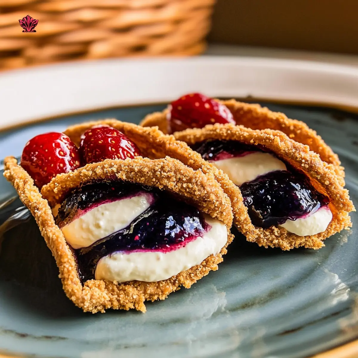 Jump to Recipe Print RecipeA warm summer breeze danced through the backyard as I pulled out a batch of Berrylicious Cheesecake Tacos, and I couldn’t help but share this delight with friends gathered for a sunny brunch. This whimsical recipe combines creamy cheesecake filling wrapped in a crunchy graham cracker crust, all nestled in a soft tortilla. The best part? These sweet treats come together in a snap, making them perfect for spontaneous gatherings or carefree afternoons. Plus, they’re a joyful twist on classic dessert that everyone will love. Drenched in luscious blueberry and strawberry jams, these tacos will have your guests raving—making them an instant summer favorite. Are you ready to dive into this playful dessert that’s sure to steal the spotlight at your next get-together? Why are these tacos a must-try? Unique Experience: Berrylicious Cheesecake Tacos offer a playful twist on traditional desserts, delighting your taste buds with every bite. Quick Preparation: These tasty treats come together in no time, making them a lifesaver for last-minute gatherings. Crowd-Pleasing Flavor: The vibrant flavors of blueberry and strawberry jam paired with creamy cheesecake filling are sure to impress guests at any summer party. Versatile Options: Feel free to customize with different fruit jams or add toppings, like toasted nuts, to suit your taste! Refreshing Treat: The lightness of these tacos provides the perfect end to a warm summer meal or an afternoon snack, just like my Churro Cheesecake Indulge. Berrylicious Cheesecake Tacos Ingredients • Make these delicious dessert tacos even more special with fresh, high-quality ingredients! For the Taco Shells Tortilla – A small 5-inch tortilla serves as the perfect base for these sweet treats. Graham Cracker Crumbs – These crumbs give that classic cheesecake flavor; opt for gluten-free options if needed. Unsalted Butter – This adds richness and helps the crumbs stick; coconut oil works too for a dairy-free alternative. For the Cheesecake Filling Cream Cheese (room temperature) – The star ingredient for a smooth and creamy filling. Heavy Cream – Whipping this makes the filling light and fluffy; coconut cream is a great non-dairy substitute! Powdered Sugar – Sweetens the filling while ensuring a smooth texture; granulated sugar can replace it, but it may alter the texture. Lemon Juice – A splash brightens up the flavor; lime juice can be used for a fruity twist. Vanilla Extract – Adds depth of flavor; always go for pure vanilla for the best outcome. For the Toppings Blueberry Jam – This is essential for that sweet fruity finish; homemade versions taste fresh and vibrant. Strawberry Jam – Another fruity layer that contrasts beautifully with the cheesecake filling; feel free to mix it up! Enjoy the delightful synergy of flavors in these Berrylicious Cheesecake Tacos! Step‑by‑Step Instructions for Berrylicious Cheesecake Tacos Step 1: Preheat Oven Begin by preheating your oven to 400℉ (200℃). This will ensure that the tortillas bake to a perfect golden brown. While the oven heats, gather your ingredients to streamline the process when you start working on the taco shells. Step 2: Prepare Tortillas Stack your small 5-inch tortillas and use a 1.5-inch cookie cutter to cut out 5 circles from each tortilla. Once cut, poke holes in each circle with a fork on both sides to prevent bubbling during baking. This step ensures your taco shells will have a nice texture once baked. Step 3: Coat Tortillas Melt the unsalted butter in a small bowl and dip each tortilla circle into the butter, ensuring it’s fully coated. Next, transfer the circles to a separate bowl filled with graham cracker crumbs and generously coat both sides. This flavorful layer is what gives the Berrylicious Cheesecake Tacos their classic cheesecake flavor. Step 4: Shape and Bake To shape your taco shells, place the coated tortilla circles between inverted cups of a cupcake pan. This method helps them hold their taco shape as they bake. Now, pop the pan into the preheated oven and bake for 10–12 minutes until they are golden brown. Once baked, allow the taco shells to cool completely before filling. Step 5: Make Filling In a large mixing bowl, combine the room-temperature cream cheese, lemon juice, and vanilla extract. Use an electric mixer to blend these ingredients until smooth and creamy. In another bowl, whip the heavy cream and powdered sugar until stiff peaks form. Gently fold the whipped cream into the cream cheese mixture, ensuring it maintains a light and airy texture for the Berrylicious Cheesecake Tacos. Step 6: Pipe Filling Prepare a piping bag by filling it with the creamy cheesecake mixture. Carefully pipe the filling into each cooled taco shell, letting it fill to your desired amount. This creates a delightful blend of flavors and textures within your tacos. Step 7: Top and Serve Finish off your Berrylicious Cheesecake Tacos by generously dolloping blueberry and strawberry jam on top. The vibrant colors and fruity flavors will elevate your dessert. Serve them immediately for the best texture and enjoyment, making these tacos a sweet centerpiece for any gathering. How to Store and Freeze Berrylicious Cheesecake Tacos Room Temperature: Store assembled tacos at room temperature for no more than 2 hours to prevent the shells from becoming soggy. Fridge: If you have leftover Berrylicious Cheesecake Tacos, store them in an airtight container in the fridge for up to 2 days. Keep the filling and shells separate to maintain crispness. Freezer: You can freeze unfilled taco shells for up to 3 months. Once cooled, place them in a freezer-safe container or bag, ensuring they’re airtight to avoid freezer burn. Reheating: Thaw frozen taco shells in the fridge overnight. Reheat in a warm oven (350°F) for a few minutes to restore their crispy texture before filling. Expert Tips for Berrylicious Cheesecake Tacos • Room Temperature Cream Cheese: Ens