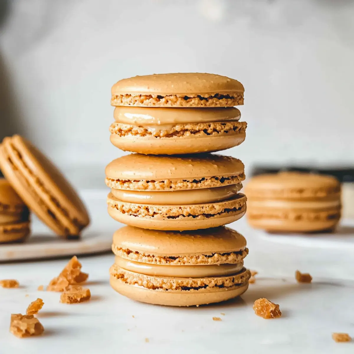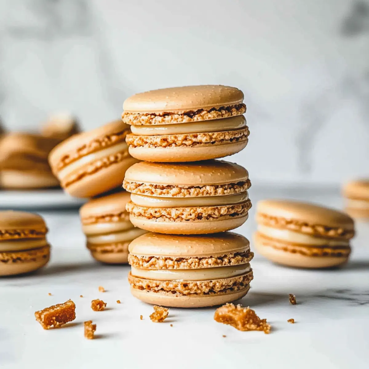 Jump to Recipe Print RecipeAs I sift through the layers of my kitchen, the scent of warm spices envelops me like a cozy blanket. These Biscoff macarons have gracefully become the new star of my dessert table, boasting crisp, light shells and a rich creamy cookie butter ganache. With all the charm of French cuisine, they make for an irresistible treat that elevates any occasion. Not only are these delightful morsels a sure-fire crowd-pleaser, but they also come together in no time, requiring just a handful of simple ingredients. Whether you’re looking to impress guests or simply indulge yourself, these macarons are the perfect pick-me-up. Ready to learn how to bring this delightful fusion of textures and flavors to your kitchen? Let’s get started! Why are these macarons a must-try? Irresistible Flavor: The combination of Biscoff and creamy ganache creates a dreamy flavor profile that captivates every taste bud. Easy to Make: Despite their elegant appearance, these macarons come together with simple techniques. Anyone can master them! Elegant Dessert: Perfect for special occasions or a sweet treat at home, they add a sophisticated touch to any dessert table. Versatile Options: Switch up fillings or colors according to your mood or the season—imagine seasonal flavors or festive decorations! Crowd Favorite: These macarons are bound to impress friends and family, whether at a gathering or simply enjoying with a cup of coffee. Add some flair to your baking repertoire and check out Biscoff Cookie Butter for a delicious twist on flavors that everyone will adore! Biscoff Macaron Ingredients • Dive into this delightful recipe by gathering simple yet essential ingredients for a perfect batch of Biscoff macarons. For the Macaron Shells Almond Flour – Provides structure and a delicate texture; no direct substitutions, but sunflower seeds can be used for a nut-free version. Powdered Sugar – Adds sweetness and a smooth texture to the shells; homemade powdered sugar can be made easily if necessary. Biscoff Cookies (finely crushed) – Enhances flavor and gives a unique appeal; can swap with another spiced cookie, but this will change the flavor profile. Egg Whites – Essential for creating the meringue structure; ensure they are at room temperature for better volume. Granulated Sugar – Stabilizes the meringue and adds sweetness; recommended to keep as-is for optimal results. For the Creamy Ganache White Chocolate – Forms the base of the ganache, providing a creamy texture; feel free to substitute with dark chocolate, but flavor will vary. Heavy Cream – Thins the ganache and adds richness; non-dairy alternatives may work but will affect texture. These ingredients will set you on the path to crafting beautiful Biscoff macarons, balancing richness and texture in every delightful bite! Step‑by‑Step Instructions for Biscoff Macarons Step 1: Make the Ganache Begin by melting 100g of white chocolate in a heatproof bowl over a simmering pot of water, stirring gently until smooth. Gradually mix in 100ml of hot heavy cream and 2 tablespoons of Biscoff spread until fully combined. Allow the ganache to cool at room temperature, then refrigerate for 1-2 hours until it thickens to a spreadable consistency. Step 2: Blend Dry Ingredients In a food processor, combine 120g of almond flour, 160g of powdered sugar, and 50g of finely crushed Biscoff cookies. Pulse the mixture several times to ensure a fine, smooth blend without lumps. This step is crucial for achieving the perfect texture of your Biscoff macarons, so take your time and then sift the mixture into a bowl. Step 3: Whip Egg Whites In a clean, dry mixing bowl, whip 100g of egg whites using an electric mixer on medium speed until foamy, about 2-3 minutes. Gradually add 100g of granulated sugar, increasing the speed to high. Continue whipping for 5-7 minutes until stiff peaks form and the meringue is glossy, ensuring the mixture holds its shape. Step 4: Fold the Batter Gently fold the sifted dry ingredients into the meringue using a spatula. Be careful not to over-mix; you want the batter to flow in thick ribbons when lifted. This folding technique requires a light hand to maintain the airy texture of your Biscoff macaron batter, which is essential for achieving those perfect shells. Step 5: Pipe the Shells Transfer the batter into a piping bag fitted with a round tip. On a baking sheet lined with parchment paper or a silicone mat, pipe 2-inch rounds, leaving space between each shell. Aim for even height and smooth edges, as this will create the beautiful macaron shape. Continue until the batter is used up, then gently tap the baking sheet on the counter to release any air bubbles. Step 6: Release Air Bubbles After piping, let the filled baking sheets rest at room temperature for 30-45 minutes, allowing a skin to form on the macaron shells. This is important for creating that signature chewy inside and crisp outside texture. You’ll know they’re ready when they are no longer tacky to the touch; this is a key step for perfect Biscoff macarons. Step 7: Bake Preheat your oven to 145°C (290°F). Once the macarons have rested, bake them for 14-15 minutes, keeping a close eye on them. The shells should lift cleanly from the baking mat. Let them cool completely on the baking sheets before attempting to remove them, ensuring they don’t crack during the cooling process. Step 8: Fill the Macarons Once the Biscoff macaron shells are cooled, prepare to assemble them. Fill a piping bag with the chilled ganache and pipe a small dollop onto the flat side of half the shells. Add a dot of Biscoff spread on top of the ganache for extra flavor before sandwiching with the remaining shells, creating delectable little treats that are sure to impress. Make Ahead Options These Biscoff macarons are a fantastic choice for meal prep, allowing you to savor their delightful flavors even on your busiest days! You can prepare the macaron shells up to 24 hours in adv