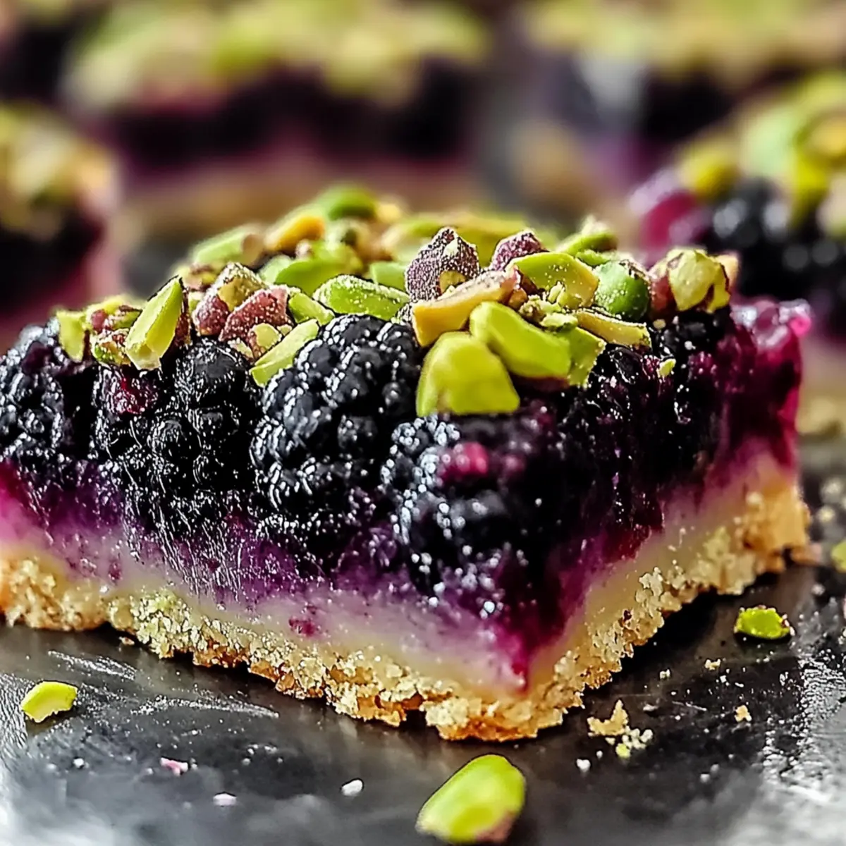 Jump to Recipe Print RecipeAs I set my sights on crafting a delightful dessert, the combination of juicy blackberries and crunchy pistachios danced in my mind. Enter the Blackberry Pistachio Dream Bars, a creation that promises to bring joy to any gathering. This easy-to-make recipe not only caters to those seeking gluten-free options but also offers a deliciously satisfying treat that’s sure to please a crowd. The buttery shortbread base provides the perfect canvas for the tart blackberries and nutty pistachios, creating a dessert that harmonizes texture and flavor in every bite. Ready to turn your kitchen into a sweet escape? Let’s dive into this delightful recipe! Why Are Blackberry Pistachio Dream Bars A Must-Try? Irresistible Flavor: The vibrant contrast between tart blackberries and crunchy pistachios creates an explosion of taste that will leave your taste buds singing. Versatile Delight: Easily customizable, you can swap in your favorite berries or nuts, making this recipe adaptable for any occasion, just like our favorite Maple Donut Bars. Easy to Make: With straightforward steps, even beginner bakers will shine in the kitchen, impressing family and friends alike. Gluten-Free Option: Not only can everyone indulge, but there’s also a gluten-free version, ensuring everyone at the table can enjoy these sweet bars together. Crowd-Pleasing Treat: Whether at a picnic, dinner party, or family gathering, these bars are bound to be the star of the show, much like our delightful Blueberry Cheesecake Bars. Blackberry Pistachio Dream Bars Ingredients For the Crust • All-Purpose Flour – Provides structure for the crust and topping; can be swapped with gluten-free flour for a gluten-free option. • Unsalted Butter – Adds richness and flakiness; use cold and cubed for best results. • Granulated Sugar – Sweetens both the crust and filling; you can reduce the amount for less sweetness. • Salt – Enhances the flavors throughout the dessert. • Large Egg Yolk – Binds the crust dough for a tender texture; avoid using the whole egg. • Ice Water – Helps combine crust ingredients while keeping the butter cold. For the Filling • Fresh Blackberries – The star ingredient, offering tartness and natural sweetness; swap with raspberries or blueberries for a lovely twist. • Lemon Juice – Brightens flavor and balances sweetness; fresh juice is best for the most vibrant taste. • Cornstarch – Thickens the blackberry filling for just the right texture. For the Topping • Light Brown Sugar – Provides moisture and sweetness for the topping; can substitute with granulated sugar if needed. • Baking Powder – Ensures a light and fluffy texture for the topping. • Pistachios – Adds a delightful nutty crunch; feel free to replace with almonds, walnuts, or omit entirely for a nut-free option. • Vanilla Extract – Infuses a luscious flavor, enhancing the overall taste of the bars. Now, gather these ingredients, and let’s create a batch of Blackberry Pistachio Dream Bars that your friends and family will rave about! Step‑by‑Step Instructions for Blackberry Pistachio Dream Bars Step 1: Preheat the Oven Begin by preheating your oven to 350°F (175°C). This will ensure that your Blackberry Pistachio Dream Bars bake evenly. While the oven heats up, gather all your ingredients and prepare your 9×13 inch baking pan by greasing it with a bit of butter or non-stick spray to prevent sticking. Step 2: Prepare the Crust In a mixing bowl, combine the all-purpose flour, granulated sugar, and salt. Using a pastry cutter or your fingers, cut in cold, cubed unsalted butter until the mixture resembles coarse crumbs, about pea-sized. Next, add the egg yolk and a few tablespoons of ice water, mixing until the dough comes together. Press this mixture firmly into the greased pan, creating an even layer, and bake for 15-20 minutes until golden and fragrant. Step 3: Make the Blackberry Filling While the crust bakes, place fresh blackberries and a bit of sugar in a saucepan over medium heat. Stir gently for about 5-7 minutes, until the berries release their juices and begin to break down. Add fresh lemon juice and cornstarch, stirring continuously for 1-2 minutes until thickened. Once the filling has cooled slightly, it will be ready to pour over your crust. Step 4: Prepare the Pistachio Topping In a separate bowl, mix together the light brown sugar, baking powder, and flour. Using a pastry cutter, cut in more cold butter until the mixture is crumbly. Add a beaten egg and vanilla extract into the mixture, mixing until well combined. Finally, fold in the chopped pistachios, ensuring they are evenly distributed throughout the topping. Step 5: Assemble and Bake After your crust has finished baking, carefully pour the cooled blackberry filling over it, spreading it evenly. Next, sprinkle the pistachio topping over the blackberry layer and press it down gently to help it stick. Return the assembled dessert to the oven and bake for 30-35 minutes, or until the topping is golden brown and the blackberry filling bubbles at the edges. Step 6: Cool and Slice Once baked, remove the pan from the oven and allow the Blackberry Pistachio Dream Bars to cool completely in the pan, which usually takes about 1-2 hours. This cooling period helps the bars set properly, making them easier to slice. Once cooled, cut into squares and serve, or store them in an airtight container for later enjoyment. What to Serve with Blackberry Pistachio Dream Bars Indulging in these dreamy bars creates the perfect opportunity to elevate your dessert experience with some delightful pairings. Vanilla Ice Cream: A scoop of creamy vanilla ice cream adds a luscious contrast to the tartness of the blackberries, making every bite unforgettable. Fresh Citrus Salad: Bright, juicy citrus fruits like oranges and grapefruits refresh the palate, balancing the sweetness with their zesty flavors. Herbal Tea: A cozy mug of chamomile or mint-i