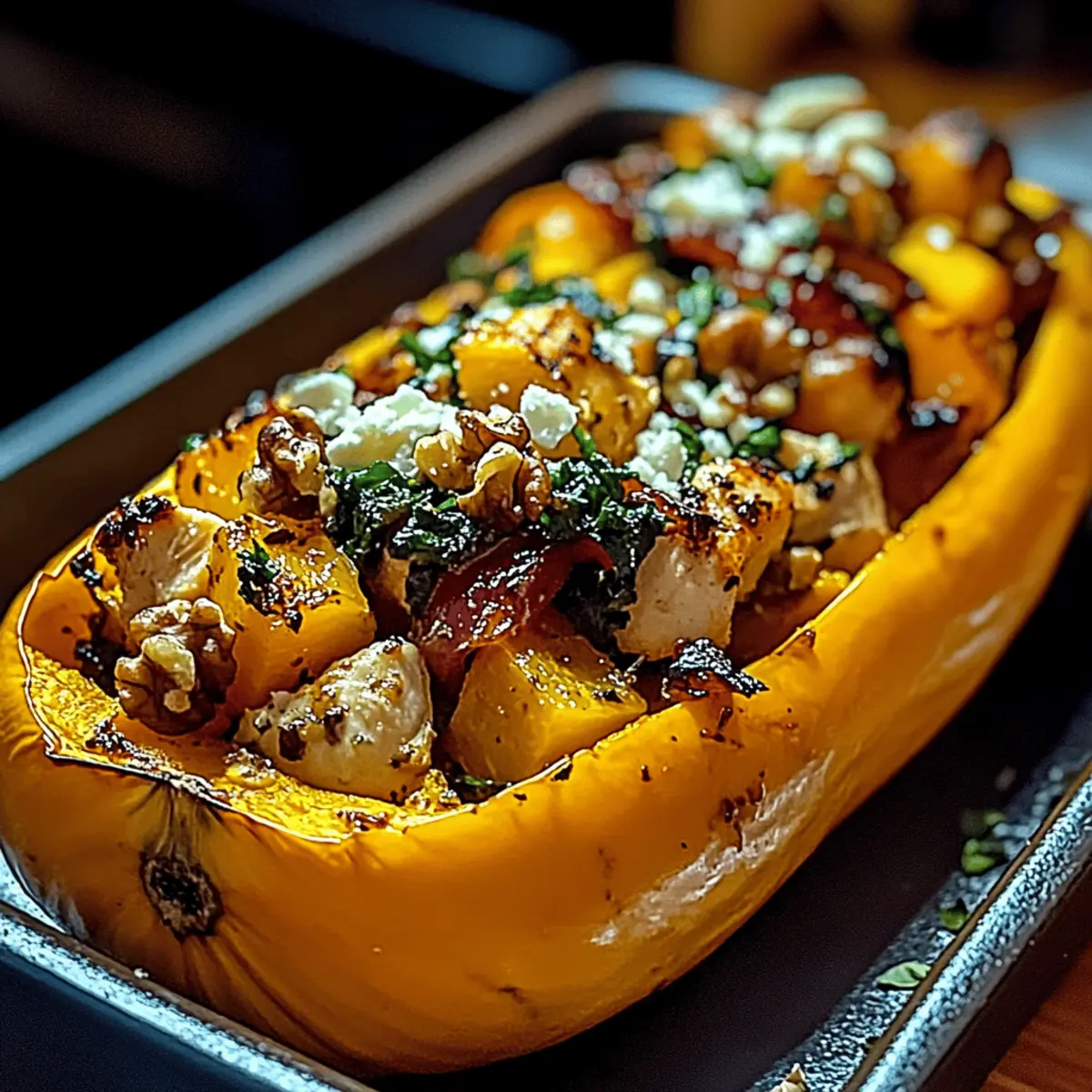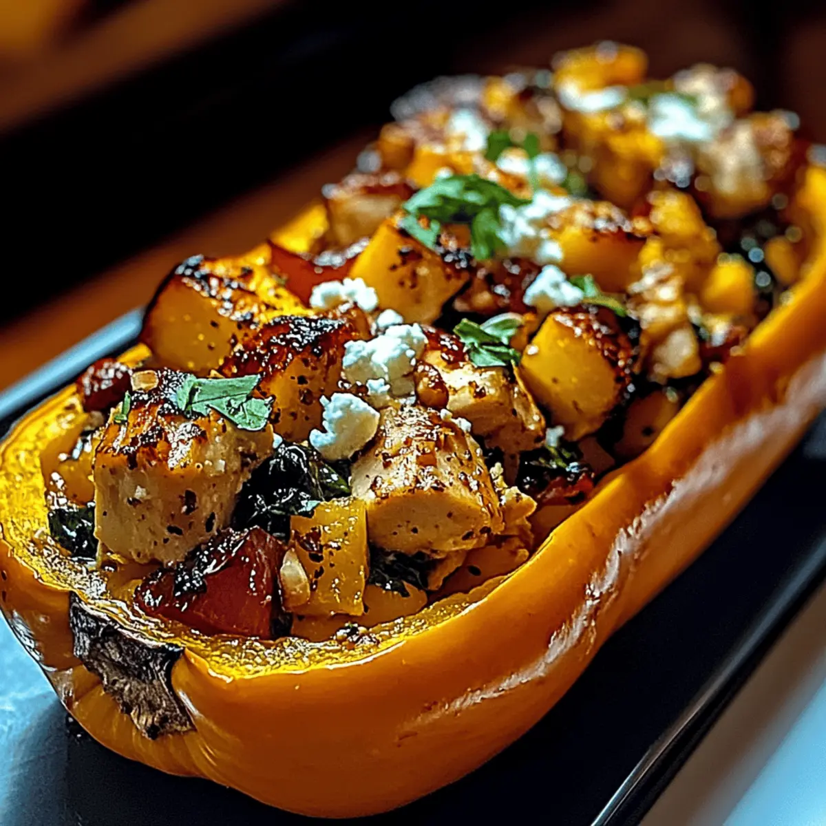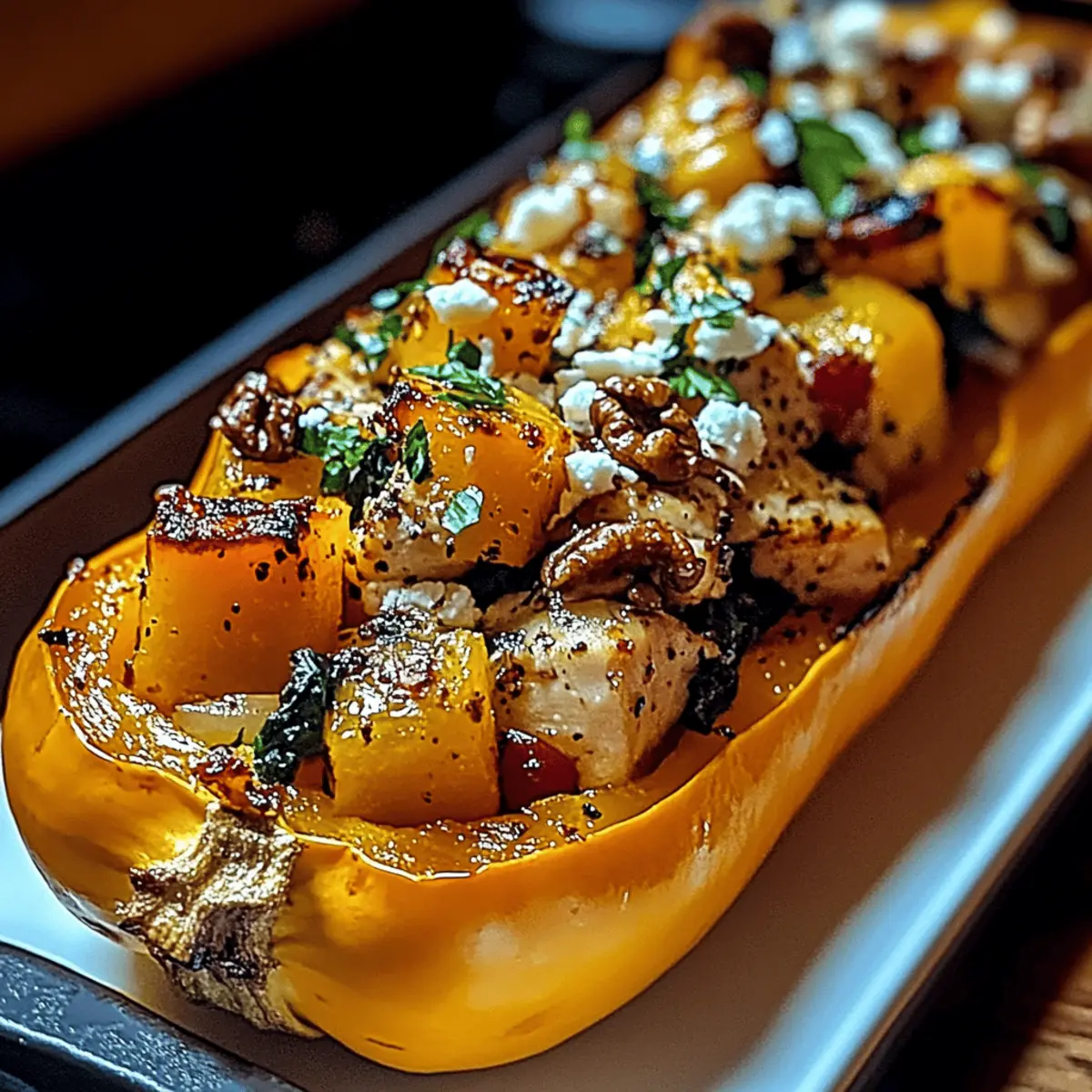 Jump to Recipe Print RecipeThe aroma wafting through my kitchen last week brought me back to cozy autumn evenings spent savoring warm meals with loved ones. That’s when I decided to whip up a batch of Sweet & Savory Honey Roasted Butternut Squash with Chicken. This recipe isn’t just about a delightful mix of flavors; it’s a healthy meal that’s bursting with nourishment, perfect for anyone looking to ditch fast food for something homemade and satisfying. With its gluten-free and Whole 30 compliant attributes, this dish invites everyone to the table, offering easily adaptable variations for any dietary style—be it turkey, steak, or a hearty vegetarian twist with quinoa or lentils. Are you ready to bring a touch of comfort to your cooking routine? Let’s dive into this culinary adventure together! Why Try This Butternut Squash Recipe? Versatile: This recipe is perfect for any dietary preference, allowing you to easily switch between chicken, turkey, steak, or even a delicious vegetarian option with quinoa. Healthy & Wholesome: Packed with nutrients and Whole 30 compliant, it’s a guilt-free indulgence that you can feel great about serving. Flavor Explosion: The sweet and savory notes from honey and spices create an irresistible harmony that tantalizes your taste buds with every bite. Easy to Make: With straightforward steps and minimal prep time, you’ll have a comforting meal ready in no time, perfect for busy evenings. Crowd-Pleaser: Impress your friends and family with this beautiful and hearty dish that turns any meal into a festive occasion. Don’t forget to check out my Chicken Broccoli Savory for another healthy weekday meal! Butternut Squash with Chicken Ingredients For the Butternut Squash • Butternut Squash – The star of the dish; pick a ripe one for optimal sweetness. • Olive Oil – Necessary for roasting; or try coconut oil for a different flavor. • Honey – Sweetens the dish beautifully but can be omitted for Whole 30 enthusiasts. • Salt – Elevates flavors; adjust according to taste. • Black Pepper – Adds a hint of warmth to the overall dish. • Cinnamon – An optional spice that brings warmth and depth. For the Chicken Filling • Chicken Breast – The main protein; dice into small pieces for even cooking. • Onion – Adds depth; yellow or sweet onions work best when sautéed. • Garlic – Freshly minced for aromatic goodness; enhances flavor. • Smoked Paprika – Introduces a smoky note; regular paprika can stand in if needed. • Ground Cumin – Contributes an earthy profile to the filling. • Dried Thyme – Boosts the savory flavor; fresh thyme can elevate it even more. • Spinach – Introduces freshness and nutrients; swap it with kale if preferred. • Walnuts/Pecans – Optional for added crunch and texture in the filling. • Feta Cheese – Adds creaminess; easily substituted with dairy-free cheese for vegan options. With these simple ingredients, you’re just a few steps away from crafting a cozy, mouth-watering meal featuring Butternut Squash with Chicken! Step‑by‑Step Instructions for Butternut Squash with Chicken Step 1: Preheat Your Oven Begin by preheating your oven to 400°F (200°C). This temperature is ideal for roasting and will help to caramelize the butternut squash beautifully. While the oven is heating, you can prepare your squash and chicken for the next steps. Step 2: Prepare the Butternut Squash Carefully slice the butternut squash in half lengthwise. Brush the cut sides with olive oil and drizzle honey on top, then sprinkle with salt, black pepper, and optional cinnamon for a warm kick. Arrange the squash cut-side down on a lined baking sheet to promote even roasting. Step 3: Roast the Squash Place the baking sheet in the preheated oven and roast the butternut squash for 30–40 minutes, or until it’s fork-tender. You’ll know it’s ready when the flesh is soft and begins to caramelize around the edges, giving off a sweet, savory aroma that fills your kitchen. Step 4: Sauté Onions and Garlic While the squash is roasting, grab a skillet and heat a tablespoon of olive oil over medium heat. Add the diced onion and fresh garlic, sautéing for 2–3 minutes until the onions are translucent and fragrant. This step builds a flavorful base for your chicken filling. Step 5: Cook the Chicken Add the diced chicken breast to the skillet, stirring well to combine with the onion and garlic. Season with smoked paprika, ground cumin, and dried thyme. Cook for about 6–8 minutes, or until the chicken pieces are no longer pink and just cooked through, ensuring they remain tender. Step 6: Add Spinach and Optional Ingredients Fold in the fresh spinach, cooking until just wilted, which should take about 1–2 minutes. If you’re using walnuts or pecans and feta cheese, stir them in at this point for added texture and creaminess. Remove the skillet from heat, and set aside. Step 7: Scoop Out the Squash Once the squash has roasted and cooled slightly, carefully scoop out the flesh, leaving about a ½-inch border to maintain the shape. Be gentle to avoid breaking the skin of the butternut squash. Set the scooped flesh aside for mixing. Step 8: Mix Filling Ingredients In a large bowl, combine the scooped butternut squash with the savory chicken mixture. Stir everything together until well blended, ensuring that the sweet and savory elements create a harmonious filling that highlights the flavors of the butternut squash. Step 9: Fill the Squash Spoon the chicken mixture generously into the squash halves, filling them to the brim. This hearty filling not only enhances the dish but also makes it visually appealing. Aim for an even distribution to ensure every bite is flavorful. Step 10: Bake Again Return the stuffed butternut squash to the oven and bake for an additional 10 minutes. This final baking will meld the flavors beautifully, so keep an eye on them, looking for a slight bubbling and a golden top. Step 11: Serve a