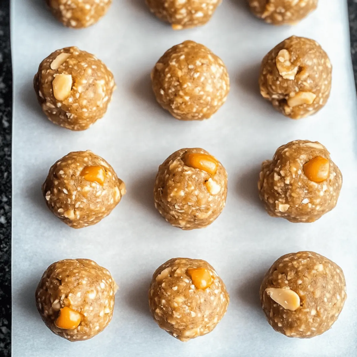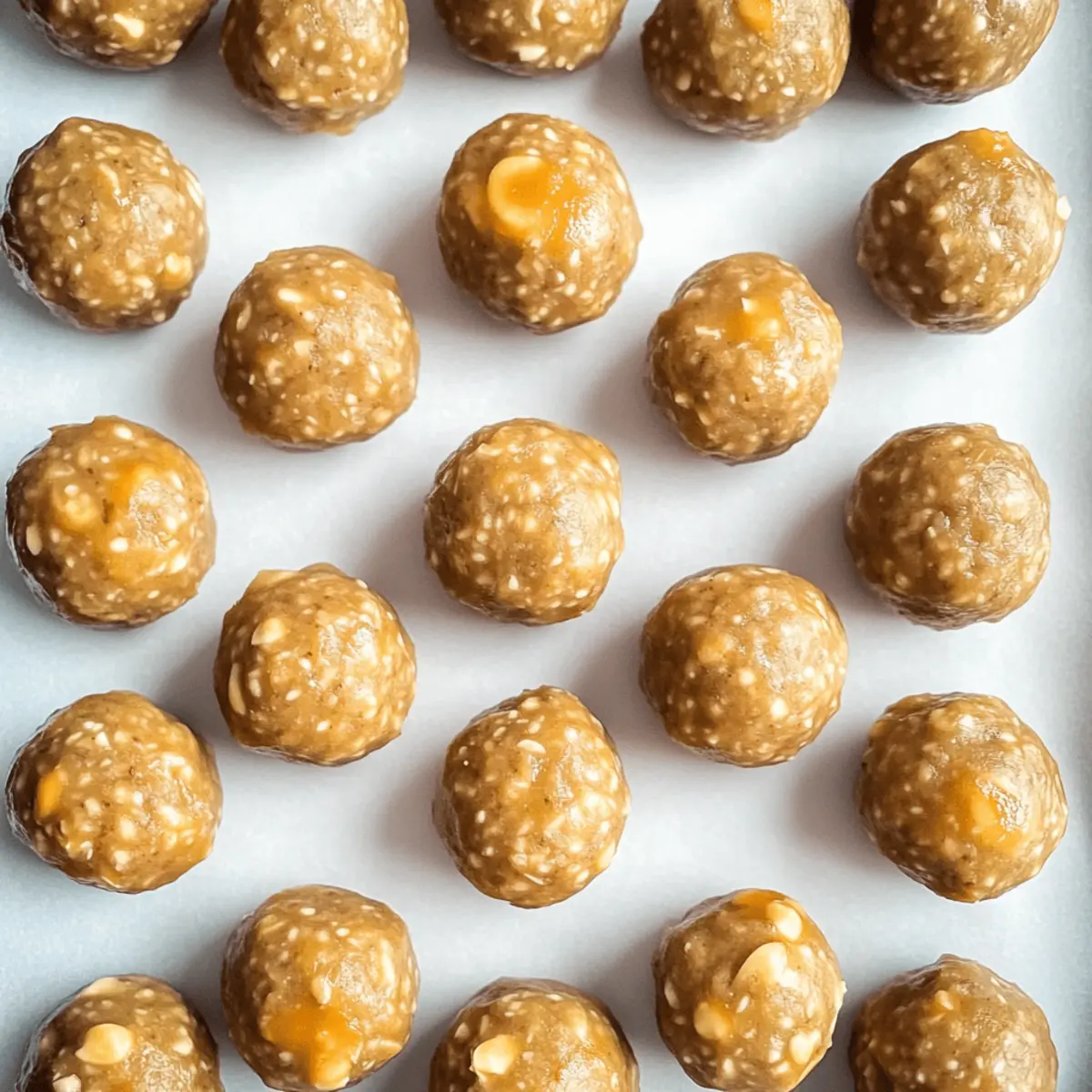 Jump to Recipe Print RecipeAs I stared at the clock, realizing snack time was just moments away, I felt a wave of panic wash over me. No one wants another uninspired store-bought option! That’s when these Butterscotch Protein Balls came to the rescue. They’re the ultimate no-bake solution to curb those cravings for something sweet yet wholesome. With just a handful of ingredients, you can whip them up in a flash, making them not only a delightful treat but also a fun way to engage your kids in the kitchen. Plus, the flexibility of this recipe means you can customize them to your liking—swap in your favorite nut butter or add a sprinkle of dried fruit. Are you ready to discover the secret to guilt-free snacking? Let’s dive into making these delightful bites! Why are Butterscotch Protein Balls a Must-Try? Versatile Customization: These protein balls are not just delightful but fully customizable. Swap out ingredients like peanut butter for almond butter or add nuts you love, making them uniquely yours. Quick and Easy: With no baking required, this recipe takes just minutes to prepare, perfect for busy days or spontaneous cravings. Nutritious Snack: Packed with wholesome ingredients, they deliver a healthy alternative to store-bought snacks, satisfying your sweet tooth without the guilt. Family Fun: Get your kids involved in making these delicious bites—it’s a fantastic way to bond while teaching them about healthy eating. Crowd-Pleaser: Whether for lunchboxes, parties, or movie nights, these protein balls are sure to impress both family and friends. If you love easy snack ideas, don’t forget to check out these Beef Pasta Protein options for more tasty goodness! Butterscotch Protein Balls Ingredients • For the Base Old-fashioned oats – Provides structure and chewiness; ensure they are fresh for best flavor. Peanut butter – Acts as a creamy binder; for easier mixing, warm it slightly first. Honey – Adds natural sweetness and helps everything stick together; adjust quantity if the mix feels dry. Butterscotch chips – Offers delightful bursts of flavor; wait until the mixture cools slightly before adding. • Optional Enhancements Walnuts – Add crunch and nutrients; feel free to swap with your favorite nuts or seeds. Chia seeds or mini chocolate chips – For added texture and sweetness; customize to your preference. These Butterscotch Protein Balls are a healthy, no-bake snack you’ll love! Step‑by‑Step Instructions for Butterscotch Protein Balls Step 1: Combine Ingredients In a large mixing bowl, add the old-fashioned oats, peanut butter, and honey. Stir the mixture together using a wooden spoon or spatula until the ingredients are well combined and sticky. This should take about 1-2 minutes. If using walnuts, fold them in at this stage to add crunch. The mixture should be cohesive and slightly gooey. Step 2: Add Butterscotch Chips Allow the oat mixture to cool slightly for about 5 minutes, then gently fold in the butterscotch chips. This prevents the chips from melting completely, keeping their shape for those delightful bursts of flavor. Mix until evenly distributed, ensuring that every bite of your Butterscotch Protein Balls will be sweet and flavorful. Step 3: Chill the Mixture Cover the bowl with plastic wrap or a lid, and refrigerate the mixture for at least 1 hour, or overnight if you have the time. Chilling helps bind the ingredients together and makes rolling easier later on. When you remove it from the fridge, it should feel firmer and easier to handle. Step 4: Roll into Balls Once the mixture has chilled and firmed up, take small portions and roll them into bite-sized balls, approximately 1 inch in diameter. You can lightly moisten your hands with water or a touch of oil to prevent sticking. Make sure they are compact, as this will help keep your Butterscotch Protein Balls intact. Step 5: Arrange and Store Place the rolled protein balls on a sheet of parchment paper to avoid sticking. Once you have formed all the balls, transfer them to an airtight container. They can be stored in the refrigerator for up to 2 weeks or frozen for up to 3 months, making them a convenient healthy snack ready whenever you need a quick bite. How to Store and Freeze Butterscotch Protein Balls Fridge: Store your Butterscotch Protein Balls in an airtight container in the refrigerator for up to 2 weeks. This keeps them fresh and ready to grab for a quick snack. Freezer: For longer storage, freeze the protein balls in a single layer on a baking sheet before transferring to a freezer-safe bag. They can last up to 3 months without compromising texture or flavor. Thawing: When you’re ready to enjoy, simply take out the desired number of balls and let them thaw in the fridge for a few hours or overnight for the best results. Serving: For a delightful treat, consider enjoying them chilled after thawing, or let them sit at room temperature for a few minutes for a softer texture. Make Ahead Options These Butterscotch Protein Balls are perfect for meal prep enthusiasts looking to save time in their busy schedules! You can prepare the mixture up to 24 hours in advance by combining the oats, peanut butter, honey, and nuts (if using) as outlined in the recipe. Simply refrigerate the mixture to allow it to set and make rolling easier later. To maintain quality, keep the mixture covered tightly to prevent drying out. When you’re ready to enjoy, just roll the chilled mixture into balls and store them in an airtight container. You’ll have delicious, homemade snacks ready whenever cravings strike, making them just as delightful as freshly made! Butterscotch Protein Balls Variations Embrace your creativity and make these Butterscotch Protein Balls your own with easy swaps and additions that elevate flavor and nutrition! Nut-Free: Substitute almond butter with sunbutter or tahini to keep it nut-free while maintaining creaminess. Dried Fruit: Fold in chopped dried apricots or cranberries fo