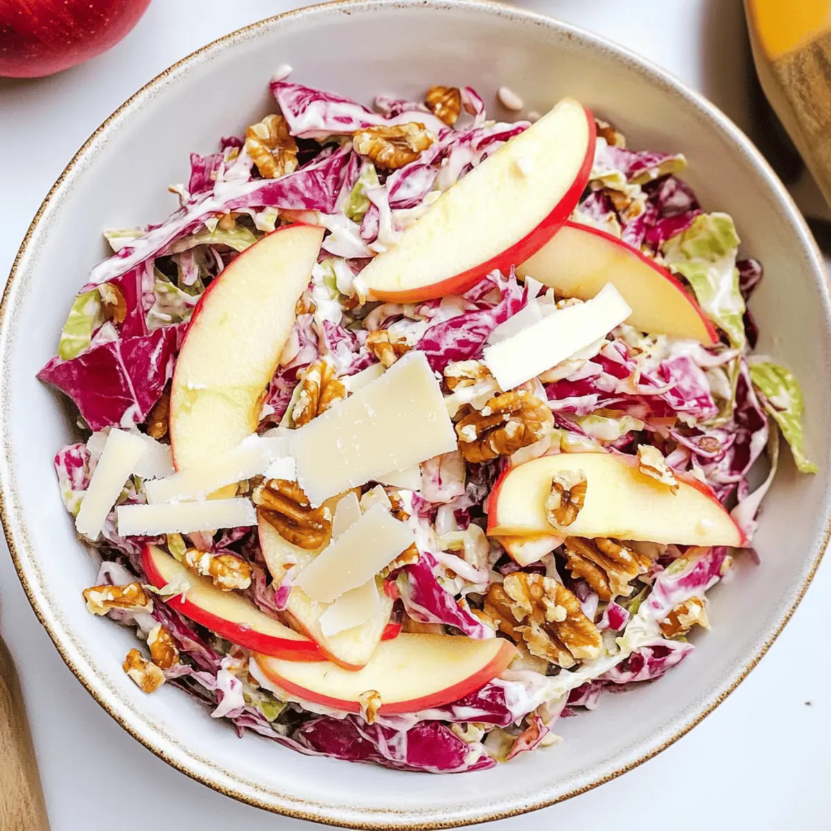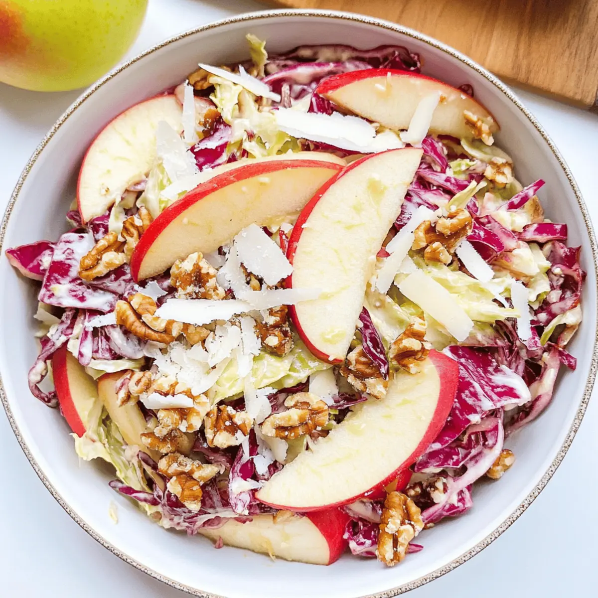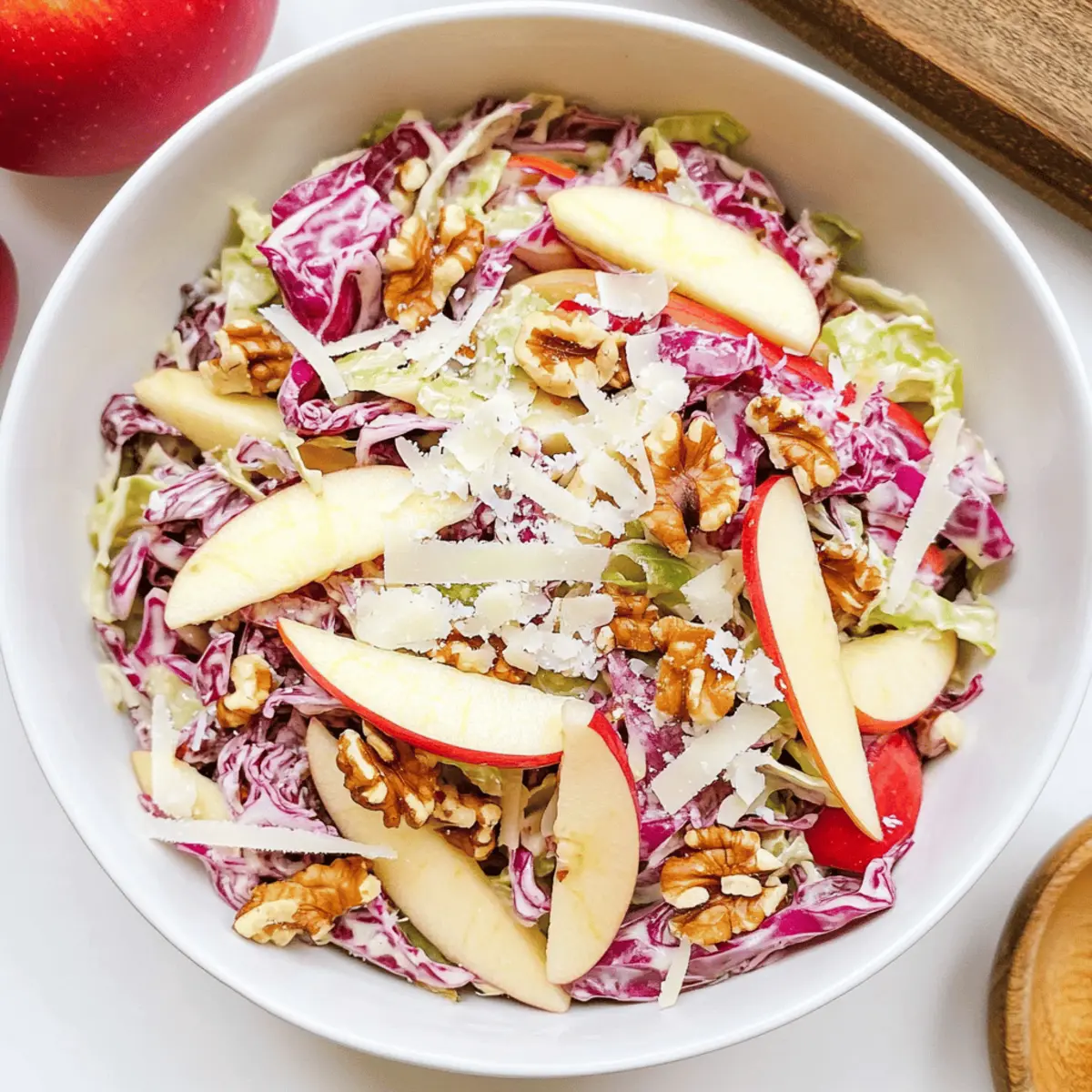 Jump to Recipe Print RecipeAs I stood in my kitchen, the aroma of fresh apples mingling with the crunch of cabbage swept me back to countless family gatherings. Nothing beats the vibrancy of a Cabbage Apple Salad, which intertwines the sweetness of apples with the satisfying crunch of finely sliced cabbage and a sprinkle of savory parmesan. This quick and easy salad is more than just a delicious side—it’s the perfect centerpiece for any meal. Packed with incredible health benefits and requiring minimal prep time, it’s a budget-friendly dish that promises to delight both the palate and the soul. Are you ready to whip up a salad that turns ordinary dinners into extraordinary feasts? Let’s dive in! Why is Cabbage Apple Salad a Must-try? Vibrant Flavors: This salad combines sweet apples with the crunchy freshness of cabbage, creating a delightful flavor explosion that’s both refreshing and satisfying. Quick to Prepare: In just 15 minutes, you can have this gorgeous dish ready, making it an ideal choice for busy weeknights or last-minute gatherings alongside other favorites like Peach Salad Summer or Crack Corn Salad. Crowd-Pleaser: Whether you serve it at a family BBQ or a holiday feast, this salad is sure to impress everyone with its colorful presentation and delicious taste. Healthy & Nutritious: Packed with vitamins A and C, this gluten-free dish is perfect for anyone looking to add something wholesome and vibrant to their meals. Versatile Base: You can easily tweak it—add proteins like chicken or quinoa to make it a complete meal, or swap in different nuts for a unique twist! Cabbage Apple Salad Ingredients For the Salad • Cabbage – a medium head (about 14 oz or 400 g) adds crunchy texture and color; use green, red, or a mix for vibrancy. • Apples – choose varieties like Gala, Pink Lady, Honeycrisp, or Granny Smith for natural sweetness and crispness. • Walnuts or Pecans – about ⅓ cup, toasted and chopped, brings a nutty flavor; feel free to substitute with hazelnuts or almonds. • Parmesan Cheese – ¼ cup of shaved parmesan provides savory depth; you can use crumbled mature cheddar if needed. For the Dressing • Extra Virgin Olive Oil – 3 tablespoons create a smooth base for the dressing, ensuring great flavor. • Apple Cider Vinegar – 2 tablespoons add acidity and balance to the salad dressing. • Honey – 2 teaspoons enhance the dressing’s sweetness; this pairs beautifully with the Cabbage Apple Salad. • Dijon Mustard – 1 teaspoon offers a tangy kick, which distinguishes it from spicier mustard varieties. • Salt and Freshly Cracked Black Pepper – essential for seasoning and enhancing the overall flavors of the salad. Step‑by‑Step Instructions for Cabbage Apple Salad Step 1: Slice the Cabbage Begin by removing the outer leaves from your head of cabbage, then cut it in half and remove the core. Using a sharp knife or mandolin, slice the cabbage into fine shreds, aiming for pieces about a quarter-inch thick. This will create a vibrant and crunchy base for your Cabbage Apple Salad. Step 2: Prepare the Apples Next, take your chosen apples and start by coring them. Slice each apple into 1/4-inch thick pieces or dice them into bite-sized cubes. This will add a delightful sweetness and crisp texture to the salad. Aim for approximately equal sizes for a uniform look and taste when mixed with the cabbage. Step 3: Toast the Nuts In a dry skillet over medium heat, add your walnuts or pecans and toast them for about 5 minutes, stirring frequently until they become fragrant and golden brown. Keep a close eye on them to prevent burning! Once toasted, reserve a few nuts for garnishing the salad later, and set the rest aside to cool. Step 4: Make the Dressing In a mason jar or small bowl, combine the extra virgin olive oil, apple cider vinegar, honey, Dijon mustard, salt, and freshly cracked black pepper. Secure the lid on the jar and shake vigorously until the dressing is well combined and emulsified. This dressing will enhance the flavors of your Cabbage Apple Salad beautifully. Step 5: Assemble the Salad In a large mixing bowl, combine the finely sliced cabbage, prepared apples, and half of the shaved parmesan cheese. Pour the homemade dressing over the salad and gently toss all the ingredients together to ensure everything is evenly coated. Allow the mixture to rest for 10 minutes; this helps the flavors meld together. Step 6: Serve the Salad Just before serving your refreshing Cabbage Apple Salad, garnish with the remaining toasted nuts and a sprinkle of the leftover parmesan cheese. This will add an extra touch of elegance and crunch to your dish. Serve at room temperature, and watch it quickly disappear at your table! What to Serve with Cabbage Apple Salad This delightful salad not only tantalizes the taste buds but also pairs effortlessly with many dishes for a wholesome meal experience. Grilled Chicken: Juicy, perfectly seasoned chicken adds heartiness, balancing the fresh flavors of the salad. Garlic Bread: The warm, toasty goodness of garlic bread offers a comforting crunch to complement the refreshing crunch of the cabbage. Quinoa Pilaf: Nutty and wholesome quinoa pilaf enhances the dish with a healthy grain, making it a fiber-rich accompaniment. Roasted Vegetables: Colorful roasted veggies amplify the salad’s vibrant tones, while their caramelized flavors deepen the overall meal experience. Creamy Yogurt Dip: A cool and tangy yogurt dip can be a refreshing partner, enhancing the salad with a creamy texture that contrasts perfectly. Red Wine: A chilled glass of red wine can elevate your meal, bringing a fruity finish that echoes the apples in the salad. Fruit Sorbet: For dessert, a light and fruity sorbet cleanses the palate and rounds off the meal wonderfully without weighing it down. How to Store and Freeze Cabbage Apple Salad Fridge: Store any leftover Cabbage Apple Salad in an airtight container in the refrigerator for up to 2 days t