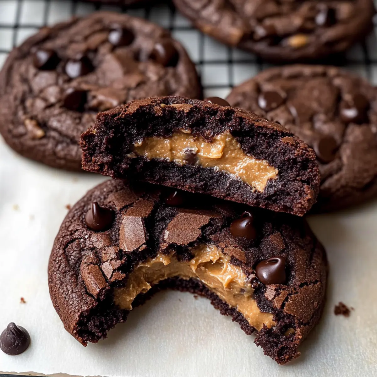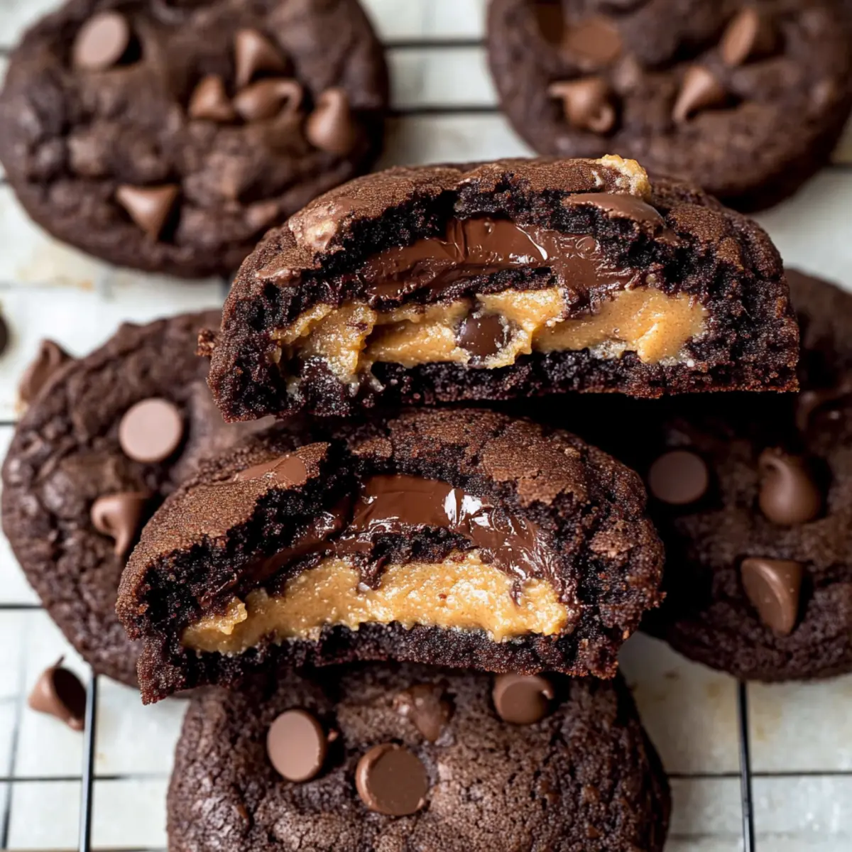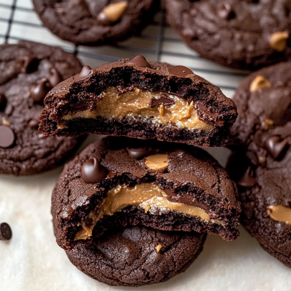 Jump to Recipe Print RecipeThe aroma of freshly baked cookies wafted through my kitchen, and just as I unveiled my latest creation, a friend exclaimed, “You’ve outdone yourself this time!” And let me tell you, I proudly introduced my Chewy Chocolate Peanut Butter Filled Cookies. This delightful dessert is a perfect union of rich, chocolatey goodness enveloping a creamy peanut butter center, ensuring every bite is an experience to savor. The best part? They’re incredibly easy to make, making them an ideal treat for unexpected guests or a cozy night in. Plus, their chewy texture makes them a guaranteed crowd-pleaser—perfect for anyone who’s tired of the same old snacks. Curious about how to whip up this delectable dessert that’s bound to become your new favorite recipe? Let’s dive in! Why Are These Cookies So Irresistible? Ultimate Indulgence: The perfect combination of smooth peanut butter and rich chocolate creates a flavor explosion. Easy to Make: You don’t need to be a baking expert; these cookies are straightforward and fun to prepare! Chewy Texture: Every bite offers a satisfying chewiness that makes them hard to resist. Crowd-Pleaser: Whether for a family gathering or an afternoon treat, these cookies are sure to impress. Pair them with a cold glass of milk for the ultimate experience after enjoying my Garlic Butter Steak or classic Chocolate Chip Cookies. Adaptable: Create your own twist by swapping in different nut butters or chocolate types! These options keep the cookie excitement alive. Chocolate Peanut Butter Filled Cookies Ingredients Get ready to bake the ultimate treat! For the Peanut Butter Filling Peanut Butter – Adds a rich, nutty flavor; use creamy JIF or Skippy for the best results. Powdered Sugar – Sweetens and stabilizes the filling; sift it to avoid lumps. Ground Cinnamon – Provides warmth and depth of flavor to enhance the peanut butter. For the Cookie Dough All-Purpose Flour – Gives structure to the cookie; make sure to spoon and level for accuracy. Dutch Process Cocoa Powder – Deepens the chocolate flavor; unsweetened cocoa can be a substitute. Baking Soda – Helps your cookies rise to the perfect height. Salt – Balances sweetness and elevates overall flavor. Unsalted Butter – Creates a delicious moisture; it should be melted for the best texture. Brown Sugar – Adds moisture and that signature caramel flavor thanks to its molasses. White Granulated Sugar – Contributes to the cookie’s crisp edges. Pure Vanilla Extract – Infuses aromatic sweetness into the dough. Large Eggs – Acts as a binding agent; ensure they’re at room temperature for easy mixing. Semi-Sweet Chocolate Chips – Creates gooey pockets of chocolate in each cookie. Enjoy baking these delightful Chocolate Peanut Butter Filled Cookies that are bound to please everyone! Step‑by‑Step Instructions for Chocolate Peanut Butter Filled Cookies Step 1: Prepare Peanut Butter Filling In a microwave-safe bowl, warm the peanut butter for about 30 seconds until it’s slightly softened. Stir in the sifted powdered sugar and ground cinnamon until smooth. Next, scoop small dollops of the filling onto a piece of wax paper, then place them in the freezer for at least 1 hour to firm up; this will make them easier to encase in the cookie dough later. Step 2: Make Cookie Dough In a large mixing bowl, sift together the all-purpose flour, Dutch process cocoa powder, baking soda, and salt; set this aside. In a separate bowl, whisk together the melted unsalted butter, brown sugar, granulated sugar, pure vanilla extract, and room temperature eggs until fully combined and smooth. Combining these mixtures is crucial for achieving the perfect texture of your chocolate peanut butter filled cookies. Step 3: Combine Mixtures Gradually add the dry ingredients to the wet mixture, stirring gently until just combined to avoid overmixing. Once the dough has come together, fold in the semi-sweet chocolate chips for those rich chocolate pockets in your cookies. The dough should be soft and slightly sticky, giving you a nice foundation for your tasty baked treats filled with peanut butter. Step 4: Form Cookie Balls Preheat your oven to 350°F (180°C) and line your baking sheets with parchment paper for easy cleanup. Using a cookie scoop (about 2 tablespoons), portion out the cookie dough. Press your thumb into the center of each ball to create a small well, then place a frozen dollop of peanut butter filling inside and cover it up with more cookie dough, smoothing it over the top to encase the filling completely. Step 5: Bake Arrange six cookie balls on each prepared baking sheet, giving them enough space to spread while baking. Place them in the preheated oven and bake for 13-15 minutes or until the edges look set and slightly firm while the centers are still soft. Let the cookies cool on the baking sheet for 5 minutes before carefully transferring them to a wire rack, where they will continue to set and cool completely. Chocolate Peanut Butter Cookies Variations Feel free to get creative with these cookie variations to make them truly your own! Nut Butter Swap: Substitute almond or cashew butter for a different nutty flavor that still complements the chocolate beautifully. Mixing different nut butters opens up a world of tastes; think about which nutty essence you crave today! Dark Chocolate Delight: Use dark chocolate chips instead of semi-sweet for a more intense chocolate experience. The richness of dark chocolate paired with creamy peanut butter creates an indulgent treat that chocolate lovers will adore. Crunchy Additions: Stir in chopped walnuts or pecans for extra crunch and a delightful texture contrast. Nuts add a satisfying bite and deepen the flavor profile, making each cookie even more irresistible. Salted Caramel Twist: Add a sprinkle of sea salt on top before baking for that sweet-and-salty flavor explosion. This little addition elevates your cookies and balances the sweetn