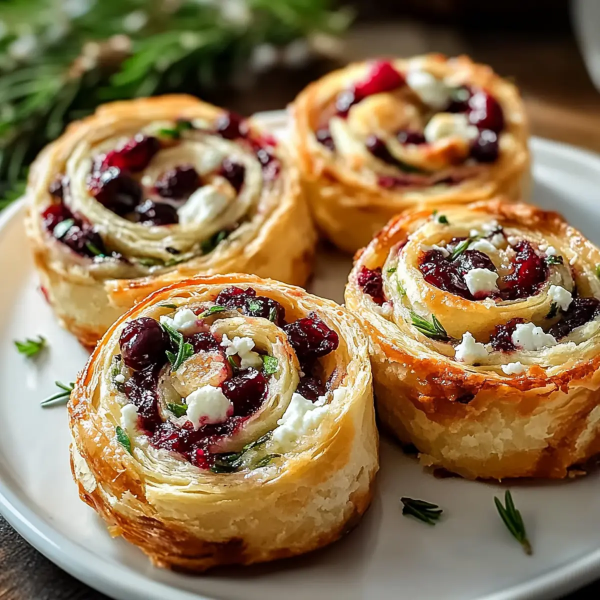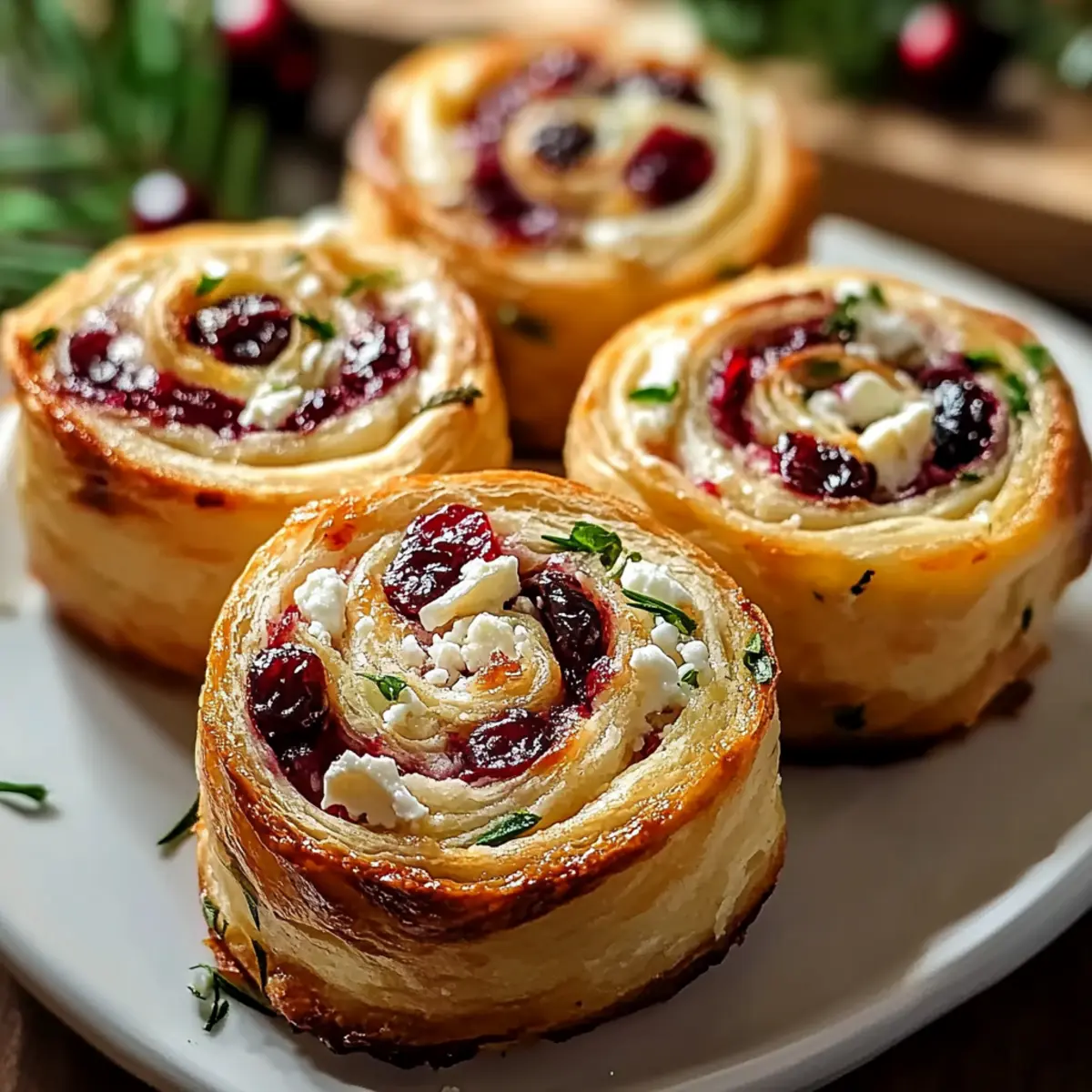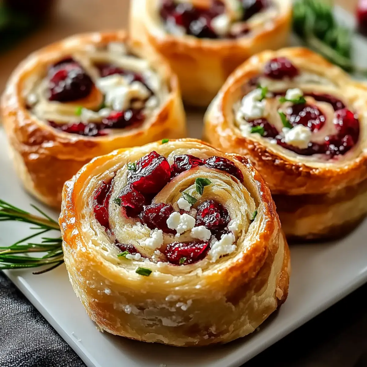 Jump to Recipe Print RecipeThe kitchen filled with a warm, inviting aroma as the holiday season approached, and I couldn’t help but feel the excitement bubbling within me. Have you ever been on the hunt for the perfect appetizer that balances elegance with ease? Look no further than these delightful Christmas Cranberry Feta Pinwheels! Nestled in buttery, flaky puff pastry, each bite combines the tartness of cranberries with the creamy saltiness of feta cheese, making them the ultimate crowd-pleaser. Not only are they a breeze to whip up, but they’re also incredibly versatile for any dietary need—whether you’re cooking for vegetarians or looking for simple gluten-free options. Ready to impress your guests with minimal fuss? Let’s dive into this festive recipe together! Why You’ll Love These Pinwheels Irresistible Flavor Combination: The sweet tartness of cranberries perfectly balances the salty creaminess of feta, creating a fantastic explosion of flavors in every bite. Easy to Make: With just a few simple steps, you can impress your guests without spending hours in the kitchen. This makes them perfect for last-minute holiday gatherings! Versatile Ingredients: Feeling adventurous? Swap out the feta for goat cheese or add a hint of heat with red pepper flakes for a personalized touch. Diet-Friendly Options: These pinwheels are adaptable for gluten-free diets with the right puff pastry choice, making them inclusive for everyone at the table. Crowd-Pleasing Appeal: Perfectly sized for parties, they’ll disappear before you know it! Pair them with a drizzle of balsamic glaze or a glass of sparkling cider for that festive touch. Try making these alongside other delightful recipes like the Feta Cranberry Rigatoni or the refreshing Cucumber Feta Salad, and watch your holiday spread shine! Christmas Cranberry Feta Pinwheels Ingredients For the Pastry • Puff Pastry – This flaky base is essential; opt for all-butter for the best flavor and texture. For the Filling • Cream Cheese – Softened at room temperature, it adds a creamy richness to the filling. • Feta Cheese – Its salty, tangy goodness pairs beautifully with cranberries; swap with goat cheese for a milder flavor. • Dried Cranberries – Sweet and vibrant, finely chop them for even distribution in your filling. • Fresh Rosemary & Thyme – Fresh herbs bring an aromatic depth; dried herbs can be used in a pinch. • Light Brown Sugar – Just a touch to balance the tartness of the cranberries; you can substitute with honey if preferred. • Black Pepper – A subtle spice that enhances the overall flavor without overpowering the dish. • Garlic Powder (optional) – Use this for an extra layer of savory flavor, based on your taste. For the Egg Wash • Egg – This gives the pinwheels a gorgeous golden finish; remember to beat it well! • Water or Milk – Mix with the egg for that glossy, beautiful pastry finish. Optional Garnishes • Fresh Rosemary Sprigs – For a festive touch of color on your presentation plate. • Whole Cranberries – They make for an inviting, beautiful garnish, perfect for any holiday spread. Now that you have all your ingredients ready, let’s make magic in the kitchen! These Christmas Cranberry Feta Pinwheels are just moments away from becoming a dazzling centerpiece at your festive gathering. Step‑by‑Step Instructions for Christmas Cranberry Feta Pinwheels Step 1: Prepare Filling Begin by beating 8 ounces of softened cream cheese in a mixing bowl until fluffy, about 2 minutes. Gradually fold in 4 ounces of crumbled feta, 1 cup of finely chopped dried cranberries, 2 tablespoons each of fresh rosemary and thyme, 2 tablespoons of light brown sugar, and a pinch of black pepper. Ensure all ingredients are well combined before moving to the next step. Step 2: Roll First Pastry On a lightly floured surface, roll out one sheet of all-butter puff pastry into a rectangle approximately 12×10 inches. Spoon half of the cranberry filling evenly onto the pastry, leaving a ½-inch border around the edges. Carefully roll the pastry tightly into a log, sealing the edges well to prevent any filling from escaping. Step 3: Chill Log Wrap the filled pastry log in plastic wrap and place it in the freezer for about 15-20 minutes, or in the refrigerator for 30-45 minutes. Chilling the log will firm it up, making it easier to slice later into uniform rounds for your Christmas Cranberry Feta Pinwheels. Step 4: Slice Log Once chilled, remove the log from the freezer or fridge. Using a sharp knife, carefully slice the log into ½-inch thick rounds. Lay the sliced pinwheels flat, ensuring they maintain their circular shape. Arrange them onto a parchment-lined baking sheet in a single layer, keeping some space between each pinwheel. Step 5: Repeat for Second Log Repeat the rolling and filling process with the second sheet of puff pastry, using the remaining cranberry filling. After rolling and sealing, chill this second log as you did the first. Once firm, slice into rounds and place them on a separate parchment-lined baking sheet. Step 6: Bake Preheat your oven to 375°F (190°C). While the oven heats, whisk together 1 egg with a splash of water or milk to create an egg wash. Brush the tops of each pinwheel with the egg wash to achieve a shiny, golden finish. Bake both trays for 15-20 minutes or until the pinwheels puff up and turn golden brown. Step 7: Cool and Serve After baking, allow the Christmas Cranberry Feta Pinwheels to cool slightly on the baking sheets for about 5 minutes, then transfer them to a wire rack. Serve them warm or at room temperature, garnished with fresh rosemary sprigs and whole cranberries if desired. What to Serve with Easy Christmas Cranberry Feta Pinwheels A festive gathering calls for delightful pairings that elevate your holiday spread and create memorable moments. Sparkling Cider: The bubbly sweetness of sparkling cider enhances the tart cranberries in the pinwheels, making 
