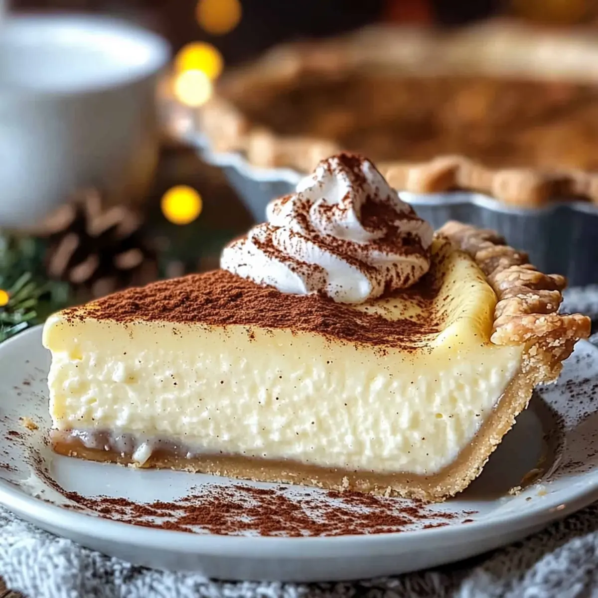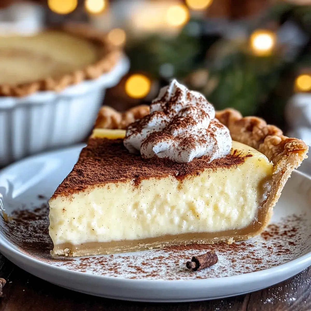 Jump to Recipe Print RecipeAmidst the glow of twinkling lights and the joyous sounds of the season, there’s a special comfort in the smell of freshly baked treats wafting through the house. This Christmas Eve Cinnamon-Vanilla Custard Pie is my go-to dessert for holiday gatherings, effortlessly combining a silky, creamy texture with the warm embrace of cinnamon and sweet vanilla. Not only is this holiday dessert simple enough for even the novice baker, but its stunning appearance also makes it a showstopper on any festive table. Whether you’re hosting family or bringing a dish to share, this pie promises to envelop everyone in a cozy, nostalgic spirit. Are you ready to create a centerpiece that will have your loved ones gathering around for just one more slice? Why is this pie a holiday must-have? Irresistible Aroma: The moment this pie bakes, your kitchen is transformed into a cozy holiday haven, filled with the enticing scent of cinnamon and vanilla. Effortless Elegance: Even if you’re a beginner, this recipe’s simple steps ensure a show-stopping dessert that’s as fun to make as it is to eat. Crowd-Pleasing Delight: Perfect for gatherings, this creamy custard pie offers a nostalgic taste that will have everyone reminiscing about holiday traditions. Versatile Recipe: Feel free to customize by adding a hint of nutmeg or swapping the crust for a graham cracker base. Make-Ahead Option: Prepare this pie in advance and keep it in the fridge for up to three days, giving you a stress-free holiday celebration. Bring on the festive cheer and grab an extra slice of this Christmas Eve Cinnamon-Vanilla Custard Pie, and for more delightful desserts, try my Lemon Raspberry Cookies or the ever-popular Blueberry Cookie. Christmas Eve Cinnamon-Vanilla Custard Pie Ingredients For the Crust • Pie Crust – Use a homemade butter crust for a rich flavor or opt for a store-bought one for quick convenience. For the Custard Filling • Eggs – Fresh, room-temperature eggs create a creamier texture that’s essential for the custard. • Granulated Sugar – Provides balanced sweetness that complements the warm spices beautifully. • Whole Milk – Lightens and adds creaminess; consider substituting with lower-fat milk if desired. • Heavy Cream – Contributes essential richness to the custard’s texture; don’t skip this! • Ground Cinnamon – The star spice that gives this pie its warm holiday flavor; you can steep a cinnamon stick for even more depth. • Vanilla Extract – Pure vanilla enhances the custard; for an upscale touch, use a vanilla bean. • Pinch of Salt – A tiny bit brightens the flavors and balances the sweetness. • Optional Add-ins – Ground nutmeg or orange zest are perfect for adding an extra festive note. Embrace the warmth and nostalgia that the Christmas Eve Cinnamon-Vanilla Custard Pie brings to your holiday gatherings, and get ready for smiles and satisfied sighs! Step‑by‑Step Instructions for Christmas Eve Cinnamon-Vanilla Custard Pie Step 1: Prepare the Crust Preheat your oven to 375°F (190°C). Fit your pie crust into a 9-inch pie dish, pressing it against the sides and bottom. Line it with parchment paper, then fill with pie weights or dried beans. Blind-bake for 15 minutes, then carefully remove the weights and bake for an additional 5 minutes or until the crust is golden and fragrant. Step 2: Infuse Cream In a medium saucepan over medium heat, combine whole milk, heavy cream, ground cinnamon, and vanilla extract. Stir gently, heating until steamy but not boiling—this should take about 5 minutes. You’ll know it’s ready when you start to see tiny bubbles around the edges, and the delightful scents of cinnamon and vanilla fill the kitchen. Step 3: Whisk Eggs In a mixing bowl, whisk together the room-temperature eggs and granulated sugar until the mixture is pale and slightly frothy. This step takes about 3-4 minutes. Achieving this lightness is key to ensuring a smooth custard filling for your Christmas Eve Cinnamon-Vanilla Custard Pie. Step 4: Temper Eggs Slowly pour the heated milk mixture into the egg mixture while whisking continuously. This gradual incorporation is crucial for preventing the eggs from curdling. Pour it in a steady stream for about 30 seconds, ensuring all ingredients blend seamlessly. If desired, strain the custard mixture through a fine mesh sieve into another bowl to achieve an ultra-smooth texture. Step 5: Bake Pie Lower the oven temperature to 325°F (160°C). Carefully pour the custard mixture into your pre-baked crust. Bake for 35-40 minutes, or until the edges are set and the center has a slight jiggle—this indicates a perfect creamy texture. Keep an eye on it, as overbaking can lead to cracks. Step 6: Cool and Chill Once baked, remove the pie from the oven and let it cool at room temperature for about 30 minutes. Then, refrigerate the pie for at least 2 hours to allow it to fully set and enhance the flavors. The chilling time is essential for the custard to achieve its signature smoothness for your Christmas Eve Cinnamon-Vanilla Custard Pie. Expert Tips for Christmas Eve Cinnamon-Vanilla Custard Pie • Water Bath Bake: For an ultra-creamy texture and to avoid cracks, place your pie dish in a larger baking dish filled with hot water during baking. • Right Baking Time: Keep a close eye on your pie; it should be removed from the oven when the center still jiggles slightly. It will firm up as it cools. • Fresh Ingredients Matter: Always use fresh, high-quality eggs and pure vanilla extract for the best flavor in your Christmas Eve Cinnamon-Vanilla Custard Pie. • Customize Flavors: Experiment with optional add-ins like ground nutmeg or orange zest to personalize the flavors and make your pie truly special. • Cooling Essentials: Allow it to cool at room temperature before chilling in the fridge; this helps set the custard and intensifies the flavors. Make Ahead Options This Christmas Eve Cinnamon-Vanilla Custard 