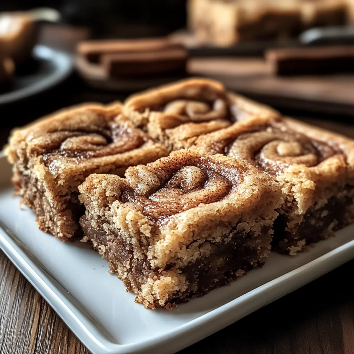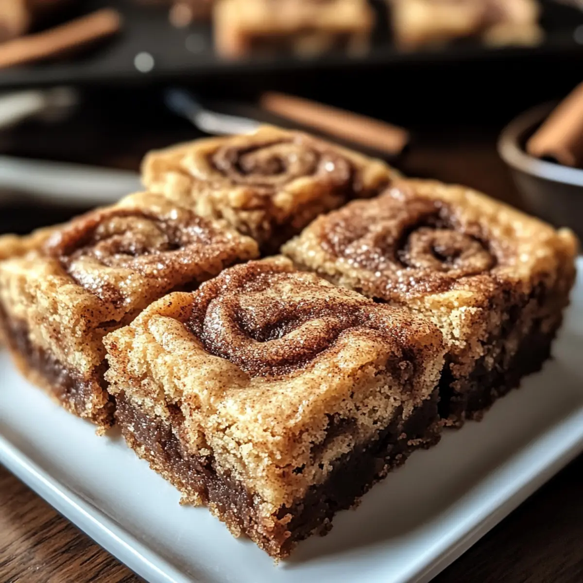 Jump to Recipe Print RecipeThe warm, inviting aroma of cinnamon can instantly transport you to a cozy kitchen on a chilly day. As I whisk together the ingredients for my Cinnamon Swirl Snickerdoodle Blondies, I can’t help but feel a wave of nostalgia washing over me—like autumn afternoons spent baking with family. This delightful recipe marries the iconic flavors of snickerdoodle cookies with the rich, buttery texture of blondies, making for a perfect treat that’s just as sweet as the memories it brings back. Not only are these bars quick and simple to prepare, but they’re also easily customizable to suit any dietary needs, whether you’re looking for gluten-free options or a lower-calorie indulgence. So, are you ready to whip up a batch that will have everyone reaching for seconds? Let’s get baking! Why try Cinnamon Swirl Snickerdoodle Blondies? Indulgent Flavor: Combining the sweet, spiced taste of classic snickerdoodles with buttery blondies is simply irresistible. Quick & Easy: This hassle-free recipe takes minimal prep time—ideal for busy bakers or last-minute dessert needs. Versatile Options: Whether you prefer gluten-free or low-calorie alternatives, you can easily customize this treat to fit your dietary preferences. Crowd-Pleasing: Perfect for potlucks, gatherings, or cozy afternoons with coffee, these blondies are guaranteed to impress everyone. Fun to Bake: Experience the joy of creating a beautiful cinnamon-sugar swirl that elevates the appeal of your dessert, just like my Cookie Butter Cinnamon treats! Cinnamon Swirl Snickerdoodle Blondies Ingredients For the Blondie Batter Melted Butter – provides richness and moisture; ensure it’s slightly cooled before mixing to prevent curdling the eggs. Brown Sugar – adds moisture and a deep caramel flavor; consider using coconut sugar as a lower glycemic substitute. Granulated Sugar – balances the flavors and adds sweetness. Eggs – act as a binder; use room temperature eggs for better incorporation. Vanilla Extract – enhances the overall flavor depth. All-Purpose Flour – provides structure; substitute with a gluten-free blend if necessary. Cream of Tartar – contributes the tangy flavor and chewy texture typical of snickerdoodles. Baking Soda – serves as the leavening agent. Salt – enhances the overall flavor profile. For the Cinnamon-Sugar Swirl Granulated Sugar – creates the signature sweetness; use finely ground sugar for better blending. Cinnamon – adds that warm, aromatic swirl; use finely ground cinnamon for the best results. Optional Topping Cinnamon-Sugar Mix – sprinkle extra for a delightful crispy finish on top of your blondies. Get ready to savor every bite of your cinnamon swirl snickerdoodle blondies! Step‑by‑Step Instructions for Cinnamon Swirl Snickerdoodle Blondies Step 1: Preheat and Prepare Begin by preheating your oven to 350°F (175°C). While it warms up, take a 9×13-inch baking dish and grease it generously with cooking spray or butter. To ensure easy removal of your blondies later, line the dish with parchment paper, allowing some excess to hang over the edges. This will become a handy lift-out feature once the blondies cool. Step 2: Mix the Wet Ingredients In a large mixing bowl, whisk together the melted butter, brown sugar, and granulated sugar until the mixture is smooth and well combined. This should take about 2-3 minutes. Next, crack in the eggs one at a time, whisking after each addition, then stir in the vanilla extract until the mixture has a glossy texture. Step 3: Combine Dry Ingredients In a separate bowl, sift together the all-purpose flour, cream of tartar, baking soda, and salt. This ensures the dry ingredients are evenly mixed and will help to create that ideal chewy consistency. Gradually incorporate the dry mixture into the wet ingredients, stirring gently until just combined. Avoid overmixing to achieve the perfect texture for your Cinnamon Swirl Snickerdoodle Blondies. Step 4: Make the Cinnamon-Sugar Swirl In a small bowl, combine granulated sugar and cinnamon for the swirl. Stir in a bit of melted butter until the mix resembles damp sand. This cinnamon-sugar blend adds the signature flavor that makes the blondies so irresistible. Set this aside as you prepare to layer your batter in the baking dish. Step 5: Layer the Blondie Batter Spread half of the blondie batter evenly across the prepared baking dish, creating a smooth layer. Then, sprinkle the cinnamon-sugar mixture over the batter, ensuring even coverage. Next, dollop the remaining batter on top of the cinnamon layer and use a knife to create a gentle swirl, mixing the two layers slightly for that beautiful cinnamon swirl effect. Step 6: Bake it to Perfection Carefully place your baking dish in the preheated oven and bake for 30-35 minutes. You’ll know they’re done when the edges turn a lovely golden brown and a toothpick inserted in the center comes out with moist crumbs – not wet batter. Keep an eye on them in the last few minutes to avoid overbaking! Step 7: Cool and Slice Once baked, remove the blondies from the oven and let them cool in the pan for about 20 minutes. This step is crucial for better slicing. After cooling, use the parchment overhang to lift the blondies out of the pan. Place them on a cutting board and slice into squares. Serve warm or at room temperature, and relish your homemade Cinnamon Swirl Snickerdoodle Blondies! What to Serve with Cinnamon Swirl Snickerdoodle Blondies Delight in building a complete dessert experience that will leave everyone wanting more. Creamy Vanilla Ice Cream: The rich creaminess of vanilla ice cream perfectly complements the warmth of the cinnamon in the blondies. Espresso or Coffee: A cup of deep, aromatic coffee enhances the sweet flavors and creates a cozy vibe that’s hard to resist. Chai Tea: The spiced notes of chai tea mirror the cinnamon flavor, making them a fantastic pairing for an afternoon treat. Fresh Berries: A medley of seas