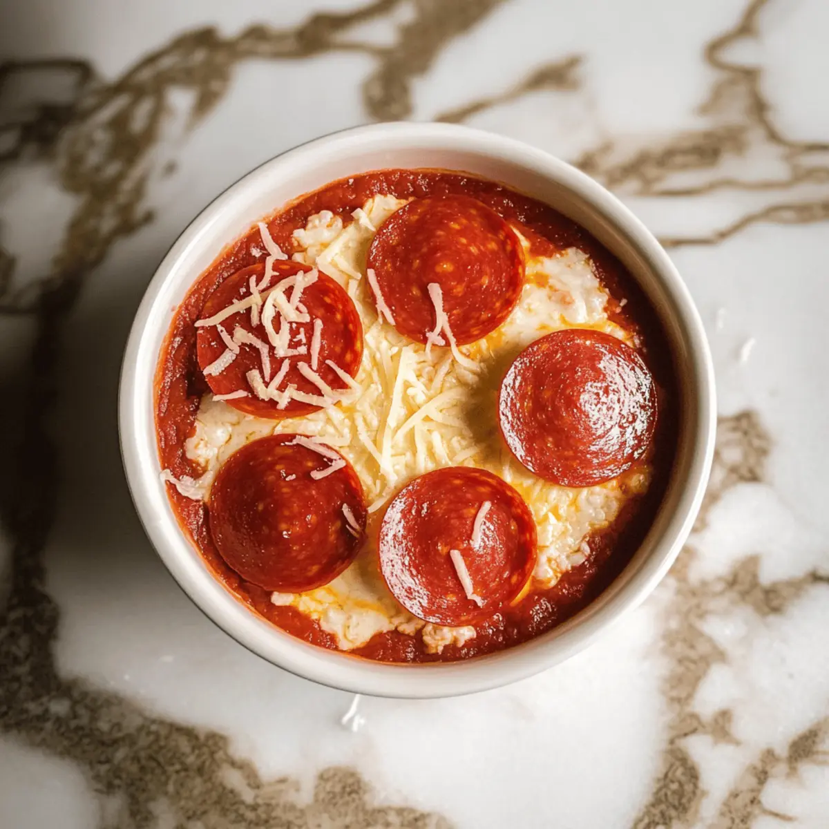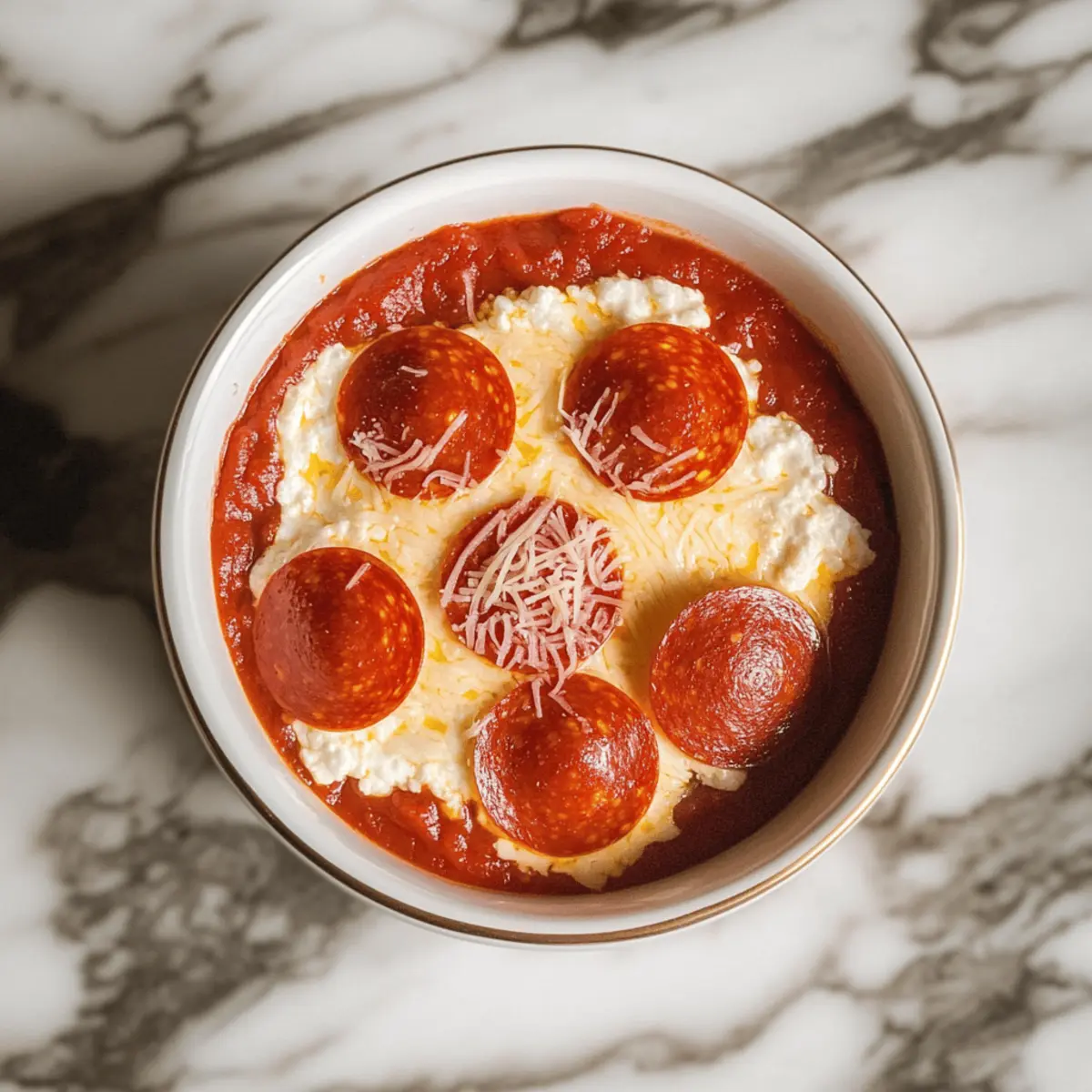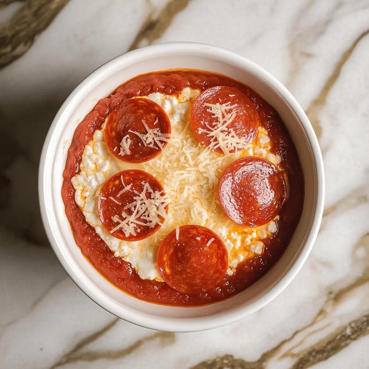 Top each ramekin with four mini pepperoni slices, arranging them in a circle. This adds a traditional pizza flair and some crispy bite. For a vegetarian option, you can skip the pepperoni or substitute it with your favorite vegetables. Each topping will add texture and enhance the overall appeal of your Cottage Cheese Pizza Bowls.