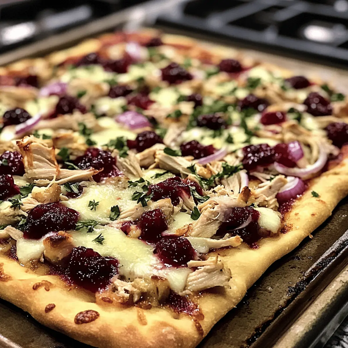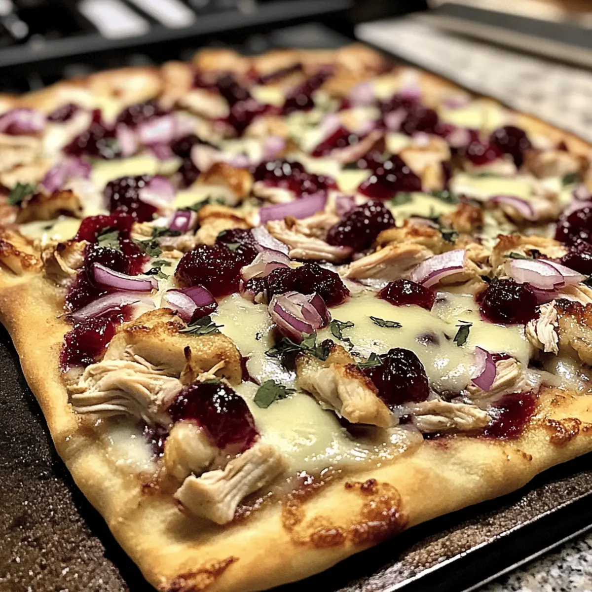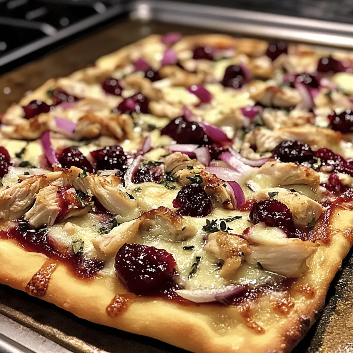 Jump to Recipe Print RecipeAs I pulled the golden, bubbling pizza from the oven, the tantalizing aroma of cranberry and Brie wafted through the kitchen, instantly transforming my evening into something special. This Cranberry Chicken & Brie Pizza is not just easy to make—it takes a mere 25 minutes! It’s the perfect blend of savory and sweet, making it a family-friendly dish that’s also a clever way to use up those holiday leftovers. Imagine a crispy crust cradling tender shredded chicken, creamy Brie, and a pop of tangy cranberry bliss. It’s quick, comforting, and utterly satisfying. Ready to elevate your pizza game and impress your loved ones? Let’s dive into how to create this delightful treat! Why is this pizza a must-try? Quick prep: Ready in just 25 minutes, this recipe fits perfectly into your busy weeknight routine. Unique flavor: The combination of creamy Brie, savory chicken, and tangy cranberry sauce creates a pizza experience that’s anything but ordinary. Family-friendly: Kids and adults alike will love its sweet and savory profile; it’s bound to become a family favorite! Holiday leftovers: Transform your remaining turkey or chicken into something extraordinary, making mealtime both festive and resourceful. Versatile topping: Feel free to mix it up with fresh arugula or alternative cheeses for a personalized touch. Whether you pair it with a light salad or enjoy it solo, your taste buds are in for a treat with this stunning Cranberry Chicken & Brie Pizza! Cranberry Chicken & Brie Pizza Ingredients For the Crust Pizza Crust – Use store-bought or homemade for your base; it provides the foundation of this delicious pizza. Olive Oil – Enhances the crust’s crispiness and adds a subtle flavor; don’t skip this step! For the Toppings Shredded Chicken – Provides protein and texture; leftover holiday chicken works wonders here. Cranberry Sauce – Adds tang and sweetness; opt for whole-berry varieties to amp up the flavor. Brie Cheese – Offers a creamy richness; it’s the star of the show with its distinctive flavor. Shredded Mozzarella – Contributes that gooey texture we all love; it balances the creaminess of Brie perfectly. Red Onion – Adds a delightful crunch and a slight bite; be sure to slice it thinly. Thyme – Enhances the savory profile with aromatic notes; fresh thyme is fantastic if you have it! Salt and Pepper – Essential seasoning to elevate overall flavor; adjust to taste. Fresh Arugula or Spinach – Top your pizza with this for a burst of freshness and a bit of peppery finish; it transforms each slice! Transform your holiday leftovers into this delightful Cranberry Chicken & Brie Pizza that your whole family will adore! Step‑by‑Step Instructions for Cranberry Chicken & Brie Pizza Step 1: Preheat Your Oven Begin by preheating your oven to 425°F (220°C). This temperature is crucial for achieving a perfectly crispy crust while melting the Brie to creamy perfection. Once the oven reaches the desired heat, prepare your baking sheet or pizza stone by lightly greasing it with olive oil to prevent sticking. Step 2: Prepare the Pizza Crust Roll out your pizza crust on the prepared baking sheet or pizza stone to your desired thickness. Ensure the edges are slightly thicker for a nice crust. Brush a light layer of olive oil across the surface of the crust, which will help it become golden brown and enhance the flavor as it bakes. Step 3: Mix the Chicken and Cranberry Sauce In a mixing bowl, combine the shredded chicken with the cranberry sauce. Stir until the chicken is thoroughly coated with the sauce. The sweet and tangy cranberry will infuse its flavor into the chicken, creating a delicious filling for your Cranberry Chicken & Brie Pizza. This mixture is best if prepared shortly before assembling the pizza. Step 4: Assemble the Pizza Spread the chicken and cranberry mixture evenly over the rolled-out pizza crust, leaving a small border around the edges. Next, layer generous slices of Brie cheese on top, allowing its rich creaminess to melt beautifully. Follow with a sprinkle of shredded mozzarella for that gooey and satisfying texture that everyone loves, and add thinly sliced red onion for an extra crunch. Step 5: Season the Pizza Drizzle a bit of olive oil over the assembled pizza, ensuring it helps to promote browning and flavor. Sprinkle fresh thyme, salt, and pepper over the top for added dimension. The combination of thyme’s aromatic profile and the other toppings will elevate the overall flavor of your Cranberry Chicken & Brie Pizza, making each bite a treat. Step 6: Bake the Pizza Place the pizza in the preheated oven and bake for 12-15 minutes. Keep an eye on it, and watch for the cheese to melt and become bubbly while the crust turns a lovely golden brown. The aroma of baking Brie mixed with cranberries and chicken will soon fill your kitchen, tempting everyone to the table! Step 7: Cool and Add Fresh Greens Once baked, remove the pizza from the oven and allow it to cool slightly to prevent burns when slicing. Top it with fresh arugula or spinach to add a burst of freshness and a peppery, vibrant flavor that contrasts beautifully with the rich cheese and sweet chicken. Step 8: Slice and Serve Now it’s time to slice your stunning Cranberry Chicken & Brie Pizza! Use a sharp pizza cutter for clean cuts and serve warm, either as a delightful main dish or stunning appetizer. Your family will appreciate this easy yet festive addition to the table, turning ordinary evening into a special occasion! Variations & Substitutions for Cranberry Chicken & Brie Pizza Feel free to unleash your inner chef and customize this pizza to fit your taste and dietary needs! Turkey Twist: Substitute shredded chicken with leftover turkey for a festive touch that enhances flavor. Mixing turkey with cranberry sauce brings out the holiday spirit, transforming this pizza into a delightful celebratory meal. Vegan Delight: Use plant-based chicken strips and d