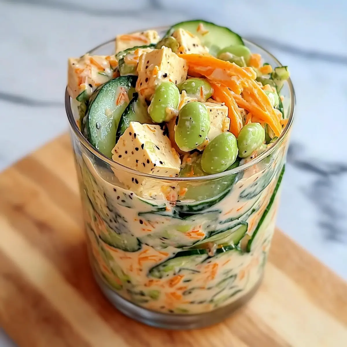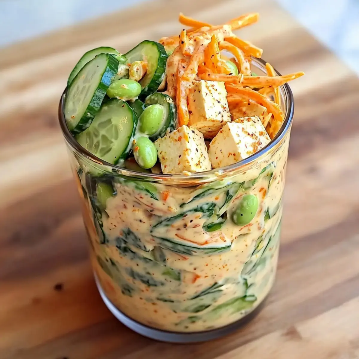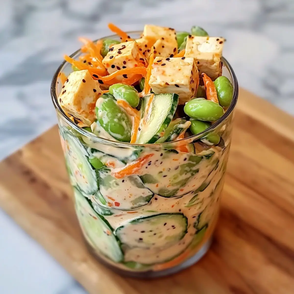 Jump to Recipe Print RecipeAs I tossed together the ingredients for my Creamy Asian Cucumber Salad Bowl, I couldn’t help but marvel at how simple yet satisfying it was to create something so vibrant without turning on the stovetop. This no-cook, vegan dish combines crunchy cucumbers, rich tofu, and a creamy, spicy dressing that just invites you to dig in. With just a handful of fresh ingredients, it’s quick to prepare and perfect for meal prep—I love how the flavors meld together overnight. Whether you’re looking for a light lunch or a colorful side for your next get-together, this salad is sure to impress. What fresh twists will you add to make it your own? Why is this salad a must-try? Vibrant Colors: The Creamy Asian Cucumber Salad Bowl bursts with fresh greens, offering not just flavor but eye-catching appeal to your table. Healthy Delight: Packed with plant-based proteins, this salad makes a nutritious meal choice, ensuring you stay full and satisfied without the heaviness of fast food. No-Cook Convenience: With zero cooking required, it’s perfect for those busy weeknights or lazy weekends when you want something quick and easy that doesn’t sacrifice taste. Flavor Versatility: This recipe is highly customizable—swap in whatever seasonal veggies you have on hand or substitute tofu with grilled chicken, shrimp, or even your favorite beans for added protein. Meal Prepping Friendly: Make ahead and let the flavors meld overnight for an even more delightful experience. You’ll love having this refreshing dish ready to go, especially during warm summer days. Enjoy it as a stand-alone meal or pair it with Cucumber Pasta Salad or Cucumber Feta Salad to create a delightful spread for your next gathering! Creamy Asian Cucumber Salad Bowl Ingredients For the Salad: • Cucumber – Provides a crisp, watery base; select firm and fresh cucumbers for the best texture. • Tofu – Adds a crunchy element; opt for baked or extra-firm tofu for better texture. You may substitute with grilled chicken or tempeh for non-vegan options. • Edamame – Offers protein and a nutty flavor; frozen edamame works well, just thaw before adding. • Carrot – Adds a natural sweetness and crunch; use shredded or julienned for ease of mixing. • Spring Onion – Enhances the salad with a mild onion flavor; green onions can serve as an alternative. For the Dressing: • Vegan Cream Cheese – Provides creaminess; a coconut-based version gives a milder flavor. Regular cream cheese can substitute for non-vegan diets. • Vegan Mayo – Contributes richness; any mayonnaise can substitute, but this will alter the vegan status. • Sriracha – Adds heat; adjust quantity based on your spice preference. Chili paste can substitute for a different flavor profile. • Chili Crisp Oil – Offers umami and texture; a blend of olive oil and dried chili flakes makes a simpler alternative. • Soy Sauce – Brings saltiness and depth of flavor; tamari is a great choice for a gluten-free option. • Sesame Seeds – Optional garnish for added nuttiness; poppy seeds can serve as a substitute. Enjoy crafting your Creamy Asian Cucumber Salad Bowl with these fresh and colorful ingredients! Step‑by‑Step Instructions for Creamy Asian Cucumber Salad Bowl Step 1: Prepare Vegetables Begin by washing and thinly slicing your cucumbers into rounds or half-moons for the Creamy Asian Cucumber Salad Bowl. Aim for about ¼ inch thick slices for the perfect crunch. Layer these sliced cucumbers in a large jar, pressing them down lightly to create a solid base that will hold the other ingredients without spilling. Step 2: Layer Ingredients Next, add thinly sliced spring onions on top of the cucumbers, followed by neatly layered tofu and thawed edamame. Shredded carrots can then be sprinkled evenly across the layers, providing a pop of color and sweetness. This order helps maintain texture and flavor, creating a visually appealing salad that looks as good as it tastes. Step 3: Make Dressing In a medium-sized mixing bowl, combine vegan cream cheese, vegan mayo, Sriracha, chili crisp oil, and soy sauce. Whisk these ingredients together until smooth and creamy, ensuring there are no lumps. This creamy dressing is vital for the Creamy Asian Cucumber Salad Bowl, as it combines richness with spice, ready to elevate your salad. Step 4: Assemble Spoon the dressing over the layered vegetables inside the jar, keeping it near the top. This technique helps preserve the crispness of the layers below, preventing them from becoming soggy. Make sure every layer is coated for maximum flavor impact, ensuring each bite is a delightful mix of crunchy veggies and creamy dressing. Step 5: Garnish To enhance the flavors of your salad, top it off with a sprinkle of sesame seeds and optional nori flakes if desired. This not only adds a nutty taste but also a lovely visual finish that showcases your delicious Creamy Asian Cucumber Salad Bowl. It’s the perfect finishing touch to an already colorful dish. Step 6: Refrigerate Seal the jar tightly with a lid and place it in the refrigerator for at least 1 hour, allowing the flavors to meld beautifully. If possible, let it chill overnight for the best flavor outcome. This waiting game amplifies the taste and ensures a refreshing meal is at your fingertips. Step 7: Serve When ready to serve your Creamy Asian Cucumber Salad Bowl, give the jar a gentle shake to mix the dressing and ingredients together. You can enjoy it straight from the jar or over a bed of rice or noodles, making it a versatile and satisfying dish that’s sure to please everyone at your table. Expert Tips for Creamy Asian Cucumber Salad Bowl • Fresh Ingredients: Use the freshest cucumbers and veggies available. This enhances flavor and ensures your Creamy Asian Cucumber Salad Bowl is crisp and vibrant. • Layer Smart: Place wet ingredients like dressing on top to avoid soggy bottoms. Proper layering keeps your salad fresh and textures inta