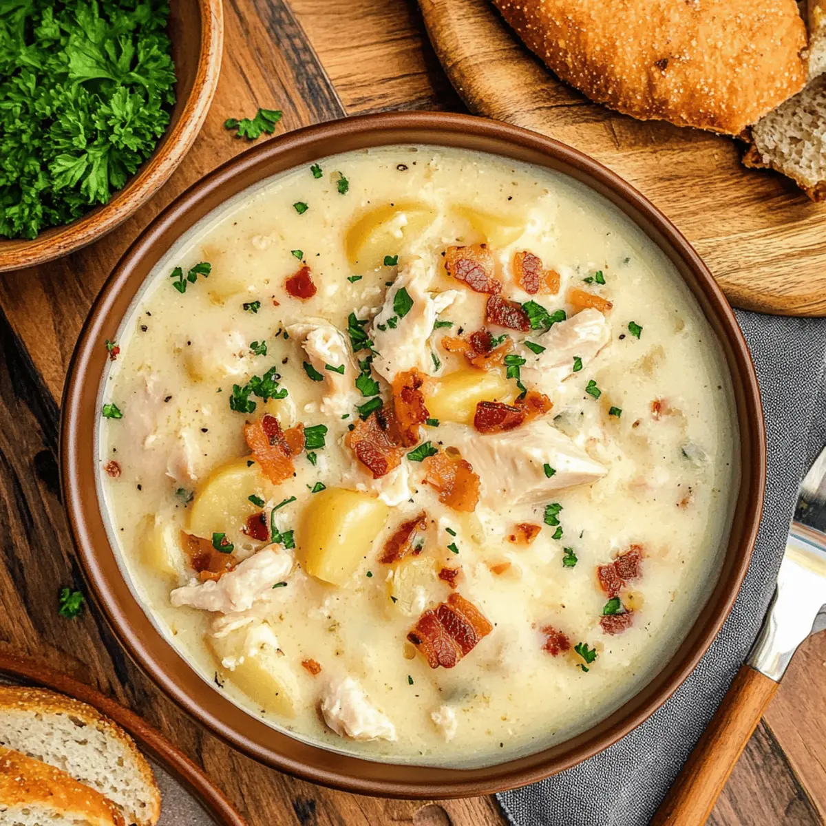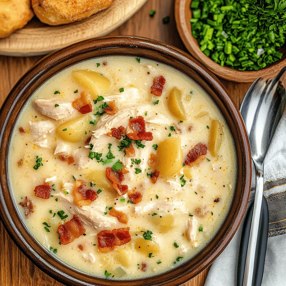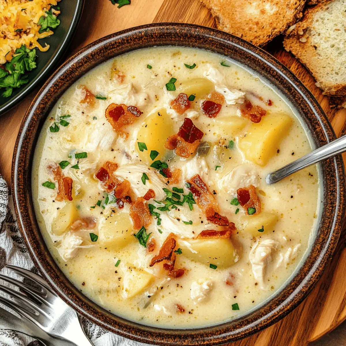 Jump to Recipe Print RecipeAs the chilly winds whip outside, there’s nothing quite like the aroma of a bubbling pot of Creamy Chicken and Potato Soup embracing the kitchen. This enchanting dish brings together tender chicken, velvety potatoes, and a touch of crispy bacon in a luscious broth. It’s not only a comfort food favorite that warms you from the inside out, but it’s also incredibly easy to make—perfect for busy weeknights or as a stress-free meal prep option you can stash in the freezer. Imagine cozy evenings gathered around the table, spooning up hearty bowls of soup that invite relaxation and connection with loved ones. Ready to discover how simple it is to create this delightful dish in your own kitchen? Let’s dive in! Why is this soup so comforting? Creamy, rich texture: Each spoonful envelops you in warmth, making it the ultimate cozy meal on chilly nights. Hearty and filling: Loaded with tender chicken and potatoes, it promises to satisfy even the most ravenous appetites. Easy to prepare: With straightforward steps, you can whip it up in under an hour—perfect for busy schedules. Freezer-friendly: Make a big batch and save some for later; it reheats beautifully, offering comfort on demand! Crowd pleaser: Everyone loves a hearty soup; serve it at family gatherings or with friends for instant cheer. Pair it with crispy bread or a side salad for a complete meal, and don’t forget to check out my Chicken Broccoli Sizzling for another delightful option! Creamy Chicken and Potato Soup Ingredients • Dive into the deliciousness with these comforting essentials! For the Soup Base Bacon – Adds smoky flavor and crunch; can be omitted for a lighter version or substituted with turkey bacon for a healthier alternative. Unsalted Butter – Provides richness and aids in sautéing vegetables; can be replaced with olive oil for a dairy-free option. Onion – Offers aromatic sweetness; substitute with shallots for a milder flavor. Carrots – Adds natural sweetness and color; other vegetables like peas or bell peppers can be used for variation. Celery – Adds depth and flavor; can substitute with fennel for a different profile. Garlic – Enhances overall flavor; use garlic powder if fresh is unavailable. All-Purpose Flour – Thickens the soup base; gluten-free flour can be used as a substitute to make it gluten-free. Chicken Broth – Provides the soup’s base flavor; vegetable broth or stock can be used for a vegetarian version. Chicken Bouillon Cube – Intensifies the broth flavor; replace with a second cup of chicken broth if desired. Thyme – Adds earthiness; oregano or rosemary can be used as alternatives. Bay Leaf – Infuses flavor during cooking but should be removed before serving. Salt/Pepper – Essential for seasoning; use to taste, or swap with your favorite seasoning blend. For the Hearty Fill Russet Potatoes – Contributes heartiness, making the soup filling; waxy potatoes like Yukon Gold can be used without peeling. Cooked/Diced Chicken Breast – Provides protein; rotisserie chicken is a great shortcut. Heavy Cream – Adds creaminess and richness; substitute with half-and-half or coconut milk for a lighter version. Bring comfort to your kitchen with these simple, wholesome ingredients, perfect for your Creamy Chicken and Potato Soup! Step‑by‑Step Instructions for Creamy Chicken and Potato Soup Step 1: Cook the Bacon In a large pot or Dutch oven, cook 4-5 strips of bacon over medium heat until crispy, about 6-8 minutes. Once browned, remove the bacon and set it aside on a paper towel-lined plate, leaving about ¼ cup of the drippings in the pot for extra flavor. Step 2: Sauté the Vegetables Add 2 tablespoons of unsalted butter to the drippings and melt over medium heat. Add a chopped onion, diced carrots, diced celery, and minced garlic, sautéing for around 5 minutes until the vegetables are softened and fragrant, stirring occasionally for even cooking. Step 3: Make the Roux Sprinkle in ¼ cup of all-purpose flour and whisk vigorously for 2-3 minutes to create a roux, which will thicken your Creamy Chicken and Potato Soup. Gradually add in 4 cups of chicken broth, whisking continuously until the mixture is smooth and free of lumps. Step 4: Combine Ingredients Return the pot to medium heat and add 1 chicken bouillon cube, 1 teaspoon of dried thyme, 1 bay leaf, salt, and pepper to taste. Toss in 4 cups of diced russet potatoes. Increase the heat to high, bringing everything to a boil before reducing the heat to low and letting it simmer for 20 minutes until the potatoes are fork-tender. Step 5: Add Chicken and Cream Once the potatoes are tender, stir in 2 cups of cooked, diced chicken breast and 1 cup of heavy cream to give the soup its richness. Let it simmer on low for an additional 10 minutes, allowing the flavors to meld perfectly in your Creamy Chicken and Potato Soup. Step 6: Final Adjustments and Serve Finally, taste the soup and adjust the seasonings as needed. Remove the bay leaf before serving. Ladle the hearty soup into bowls, and top with the crispy bacon and any desired toppings, inviting everyone to enjoy this comforting dish. Creamy Chicken and Potato Soup Variations Feel free to explore these delightful twists on your Creamy Chicken and Potato Soup, making each bowl even more special! Dairy-Free: Replace heavy cream with coconut milk for a creamy texture without dairy. It adds a subtle sweetness that pairs beautifully with the savory flavors. Vegetable Boost: Throw in a handful of fresh spinach or kale during the last few minutes of cooking for added nutrition and a pop of vibrant color. The greens will wilt perfectly, enhancing both taste and presentation. Spicy Kick: Add a teaspoon of red pepper flakes or a splash of your favorite hot sauce to ignite the flavor and warm up your soul. Perfect for those chilly nights when you crave a little heat! Gluten-Free: Substitute the all-purpose flour with a gluten-free blend or cornstarch for 