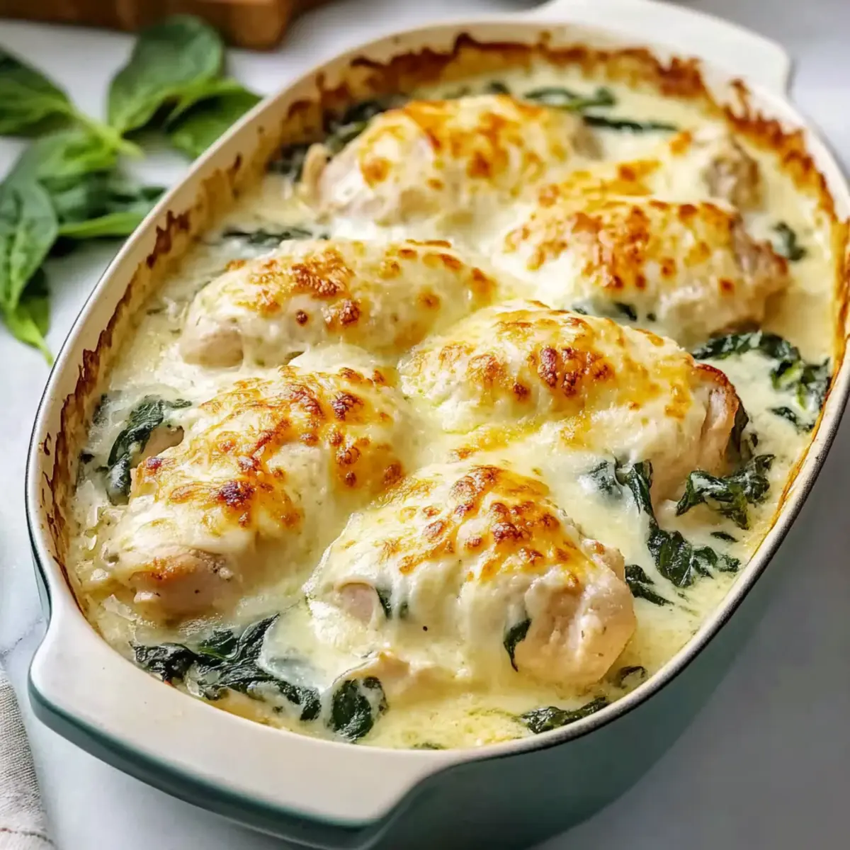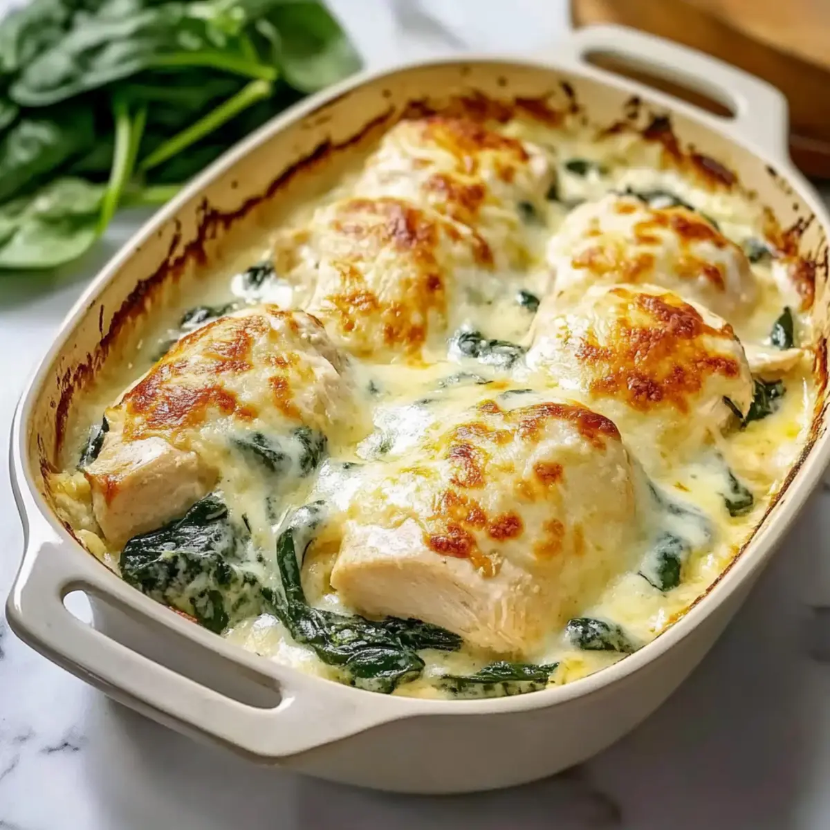 Jump to Recipe Print RecipeYou know those days when you crave a hearty meal but simply can’t find the time to cook? That’s exactly where my Irresistible Creamy Chicken and Spinach Casserole comes in. This one-dish wonder is not just a meal; it’s a comforting embrace after a long day. With just 15 minutes of prep, you can toss tender chicken, vibrant spinach, and gooey cheese together in an easy-to-make casserole that even the busiest families will adore. Plus, it’s a fantastic way to sneak in some greens while keeping everyone happy—who doesn’t enjoy a creamy masterpiece topped with melted cheese? Let’s dive into how this family-friendly comfort food can become your weeknight hero! What ingredient will you make your own? What makes this casserole the best? Ease of Preparation: In just 15 minutes, you can whip this creamy chicken and spinach casserole together and pop it in the oven. Perfect for busy evenings! Comfort Food: Packed with tender chicken and rich cheeses, it delivers the ultimate cozy vibes that everyone craves. Healthy Twist: The addition of spinach adds a dose of nutrients, making this dish not only delicious but also great for sneaking in some greens. Versatile Options: Feel free to mix it up! You can substitute chicken thighs, or even swap in different cheeses or veggies. Crowd-Pleasing: It’s a guaranteed hit for the whole family, from picky eaters to culinary adventurers—it’s a meal that brings everyone to the table. Try serving it alongside some buttered egg noodles or a crisp green salad for balance! Creamy Chicken and Spinach Casserole Ingredients For the Sauce • Mayonnaise – Adds creaminess and richness to the sauce; best texture comes from Hellmann’s. • Sour Cream – Contributes tanginess and further creaminess; can substitute with Greek yogurt for a lighter option. • Parmesan Cheese – Provides a nutty flavor and helps thicken the sauce; freshly grated cheese melts better than pre-shredded. • Garlic Salt – Introduces savory depth; regular salt and garlic powder can be used as alternatives. • Onion Powder – Offers a subtle onion flavor; can be replaced with finely chopped onions if preferred. • Pepper – Adds seasoning to enhance flavor; adjust based on personal taste. For the Main Ingredients • Chicken – The main protein source; boneless, skinless breasts or thighs work well; thighs remain moist even if slightly overcooked; rotisserie chicken can be used as a shortcut. • Spinach – Provides nutrition and a vibrant color; use fresh or thoroughly drained frozen spinach to avoid excess moisture. For the Cheese Topping • Monterey Jack Cheese – Melts beautifully and adds a creamy texture; Tillamook is favored for its melting quality. Enjoy crafting your Creamy Chicken and Spinach Casserole with these ingredients! Step‑by‑Step Instructions for Creamy Chicken and Spinach Casserole Step 1: Preheat the Oven Begin by preheating your oven to 375°F. This moderate temperature ensures that your creamy chicken and spinach casserole bakes evenly without burning. While the oven heats up, gather your ingredients and equipment, including a 9×13-inch baking dish that you will use to assemble the casserole. Step 2: Prepare the Baking Dish Lightly grease the 9×13-inch baking dish with cooking spray or a drizzle of olive oil. This little step prevents the creamy filling from sticking, allowing for easy serving later. A greased dish also helps the layers of the casserole meld beautifully without any resistance. Step 3: Cut the Chicken Next, take your boneless, skinless chicken and cut it into 1-inch cubes. This size promotes even cooking and ensures each piece absorbs the rich flavors of the creamy sauce. Place the cubed chicken into a mixing bowl and set it aside while you prepare the sauce. Step 4: Grate the Cheese Grab your box grater or food processor and grate the Monterey Jack and Parmesan cheeses. Aim for a fluffy texture, as freshly grated cheese melts better than pre-shredded varieties. Approximately 1 cup of each cheese will create a luscious topping that enhances the creamy chicken and spinach casserole. Step 5: Whisk the Sauce In a separate mixing bowl, whisk together the mayonnaise, sour cream, garlic salt, onion powder, and pepper until the mixture is smooth and well combined. This creamy sauce is the heart of your casserole, providing delicious flavor and moisture. Set this aside as you prepare the next step. Step 6: Layer the Spinach Spread the spinach evenly across the bottom of your greased baking dish. If using fresh spinach, ensure it is chopped into bite-sized pieces, while frozen spinach should be thoroughly drained to avoid excess moisture. This layer adds nutrition and vibrant color to the creamy chicken and spinach casserole. Step 7: Add the Chicken Evenly layer the cubed chicken over the spinach. The chicken should cover the spinach completely, creating a hearty base for your casserole. This step ensures that the chicken cooks through, giving each bite the tender, juicy texture you desire. Step 8: Pour the Sauce Gently pour the creamy sauce over the chicken, making sure to cover all pieces evenly. Use a spatula to spread the sauce, ensuring every chicken cube is enveloped in that delicious creamy filling. This step is crucial for bringing the entire dish together as it bakes. Step 9: Sprinkle the Cheeses Now, sprinkle both the grated Monterey Jack and Parmesan cheeses over the top of the casserole. This will create a melty, golden crust that adds both flavor and visual appeal. Make sure to cover the whole surface for a beautiful finish that draws everyone to the table. Step 10: Bake the Casserole Place the dish on the bottom rack of the preheated oven and bake for 30-35 minutes. You’ll know it’s ready when the chicken reaches an internal temperature of 165°F and the cheese turns bubbly and golden brown. The tantalizing aroma will fill your kitchen as the casserole bakes. Step 11: Let it Rest Once d