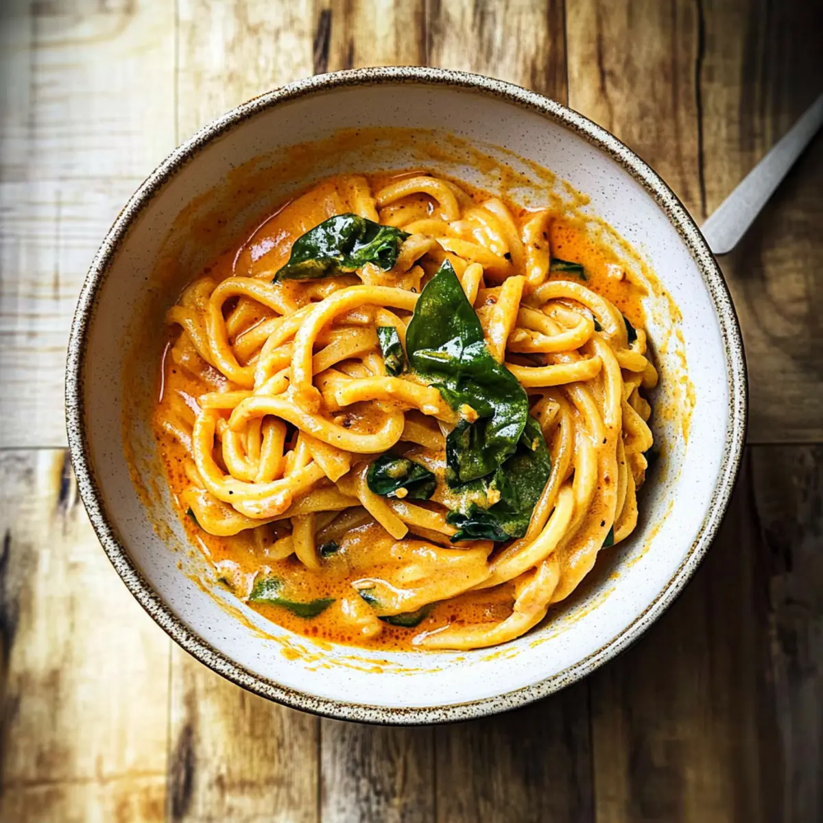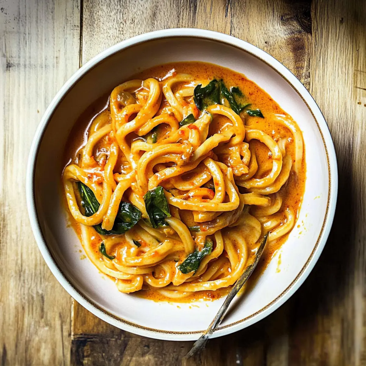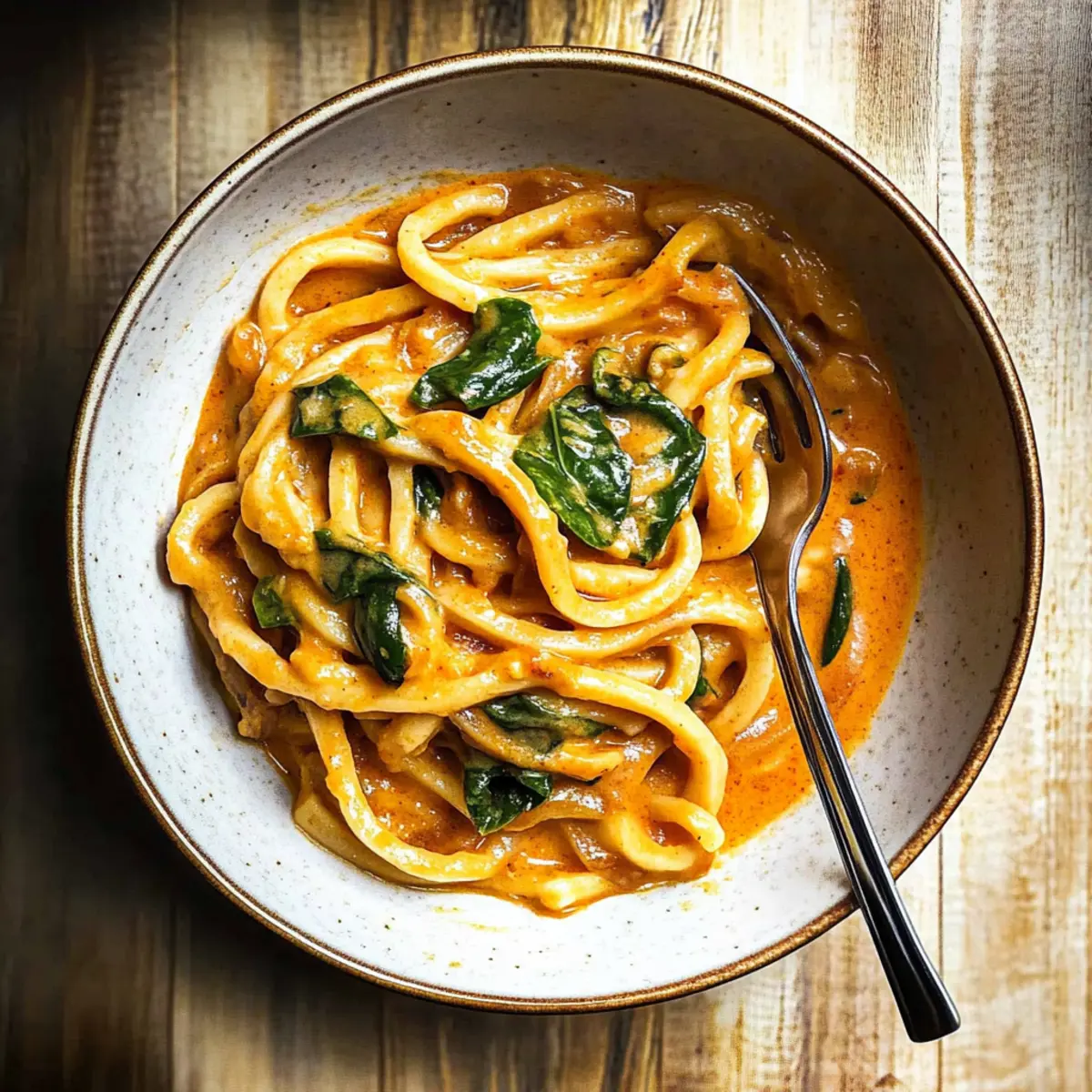 Jump to Recipe Print RecipeThe aroma of fresh ginger and red curry paste swirling in the kitchen transports me straight to the streets of Bangkok. With a mere 20 minutes to spare, I can whip up a bowl of Creamy Thai Red Curry Udon Noodles that feels like a warm hug on a plate. This quick meal combines chewy udon noodles with a luscious coconut-based sauce, making it not just a dinner, but a comforting escape—a perfect remedy for those hectic weeknights. Plus, it’s vegetarian-friendly, so everyone can join in on the deliciousness. Whether you embrace the spice of Sriracha or add extra veggies for a colorful twist, this recipe offers flexibility to suit your preferences. Curious about how to feed your cravings and bring a dash of Thailand into your home? Let’s dive into this creamy indulgence together! Why are Creamy Thai Udon Noodles irresistible? Simplicity makes these noodles a breeze to prepare, with only 20 minutes from start to finish. Creamy flavor from the coconut milk combines perfectly with the bold spices of Thai red curry, creating a delightful harmony in every bite. Versatile enough to adapt to your pantry—add chicken, shrimp, or extra veggies like bell peppers or bok choy for a personal touch. Crowd-pleaser status makes it an ideal weeknight meal for family gatherings or cozy dinners. Plus, this dish stands out for its vegetarian-friendly twist, ensuring that everyone can enjoy a comforting bowl of goodness! Want more quick meals? Check out my Lemon Chicken Pasta and Tuscan Sausage Pasta for delicious dinner ideas! Creamy Thai Red Curry Udon Noodles Ingredients For the Noodles • Udon Noodles – The primary carbohydrate base; offers a hearty bite. Substitute with rice noodles for a gluten-free version. For the Aromatics • Vegetable Oil – Ideal for sautéing; you can substitute with olive or sesame oil for unique flavors. • Garlic – Adds depth; fresh minced garlic will elevate the flavor profile. • Shallot – Provides a subtle sweetness; feel free to replace with yellow onion if needed. • Grated Ginger – Brings warmth and spice; fresh ginger is key for that vibrant taste. For the Sauce • Tomato Paste – Acts as a flavorful base; it enriches the sauce with umami richness. • Thai Red Curry Paste – Infuses authentic Thai flavor; opt for mild if you prefer less heat. • Coconut Milk – Creates a creamy texture; use full-fat for richer taste or light for a healthier option. • Low Sodium Soy Sauce – Enhances umami flavors; tamari is a great gluten-free alternative. • Fish Sauce – Adds a unique salty punch; simply omit for a vegetarian-friendly recipe. • Toasted Sesame Oil – Introduces a nutty complexity; regular sesame oil will also work. • White Miso Paste – Contributes to creaminess and savory notes; tahini can be a quick substitute. • Sriracha – Brings in heat; adjust to suit your spice tolerance! • Lime Juice – Offers a zesty brightness; lemon juice is a good alternative if you’re out. • Black Pepper – Sparks subtle warmth; freshly cracked pepper is always best. For the Greens • Spinach – Adds color and nutrition; swap with kale or any leafy green you have on hand. • Basil Leaves (or Thai Basil) – Used as a fresh garnish; regular basil works beautifully if Thai basil isn’t available. Step‑by‑Step Instructions for Creamy Thai Red Curry Udon Noodles Step 1: Prep Your Ingredients Start by gathering all your ingredients. Mince 3 cloves of garlic, chop 1 shallot finely, and grate about 1 tablespoon of fresh ginger. Having everything prepared will make the cooking process smooth and enjoyable. You’ll want to have your udon noodles and other sauce ingredients nearby for easy access as you whip up this delicious Creamy Thai Red Curry Udon Noodles dish. Step 2: Cook the Udon Noodles In a large pot, bring water to a rolling boil over high heat. Add the udon noodles and cook according to the package instructions, usually around 4-6 minutes, until they are tender but still slightly chewy. Once done, drain the noodles and rinse them under cold water to halt the cooking process. Set them aside while you work on the flavorful sauce. Step 3: Sauté the Aromatics Heat a large skillet over medium-low heat and add 2 tablespoons of vegetable oil. Once the oil is shimmering, add your minced garlic, chopped shallot, and grated ginger. Sauté these aromatic ingredients for 3-5 minutes until they soften and become fragrant, making sure not to let them brown too much. This flavorful base is essential for your Creamy Thai Red Curry Udon Noodles. Step 4: Build the Sauce Stir in 2 tablespoons of tomato paste followed by 2 tablespoons of Thai red curry paste. Mix well to combine and let the flavors meld for about 1-2 minutes. You’ll notice a vibrant color forming as the paste blends into the sautéed aromatics, which will create a luscious sauce for your noodles. Step 5: Create the Creamy Base Pour in 1 can (about 13.5 oz) of coconut milk, stirring to create a rich and creamy sauce. Then, add 2 tablespoons of low-sodium soy sauce, 1 tablespoon of fish sauce, 1 teaspoon of toasted sesame oil, 1 tablespoon of white miso paste, 1 teaspoon of sriracha, and the juice of 1 lime. Let the mixture simmer gently for about 5 minutes, allowing the flavors to deepen and the sauce to thicken slightly. Step 6: Add Spinach and Noodles Incorporate 2 cups of fresh spinach into the sauce and cook for an additional 2 minutes, allowing the spinach to wilt beautifully. Then, add the drained udon noodles into the skillet, tossing them thoroughly with the sauce to ensure they’re well-coated. Cook for another minute to heat everything through, and watch as the noodles absorb the delicious, creamy flavors. Step 7: Finish and Serve Remove from heat and stir in a handful of fresh basil leaves and a crack of black pepper for added flavor. Your Creamy Thai Red Curry Udon Noodles are now ready to be served! Plate them up and enjoy a comforting meal that