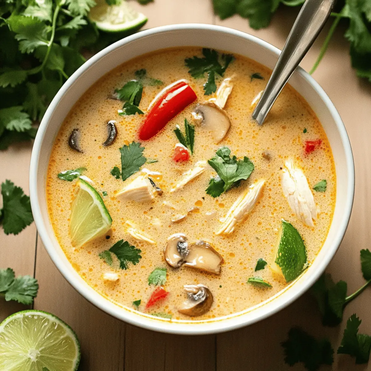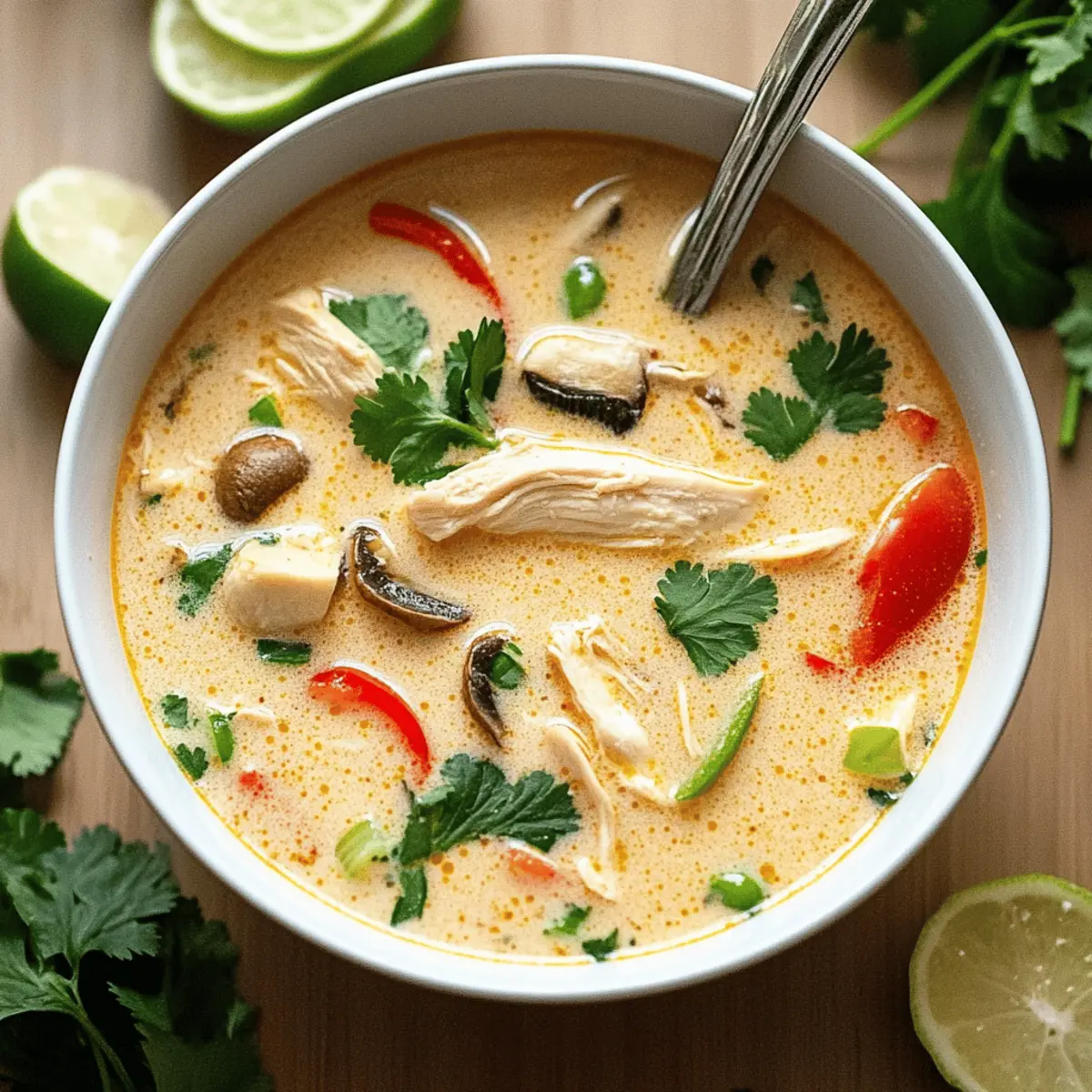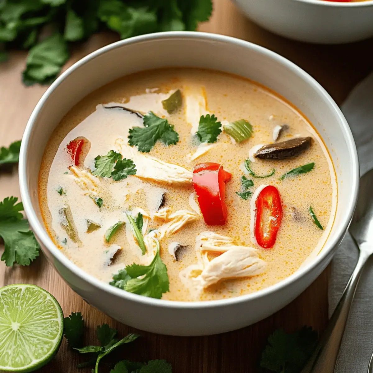 Jump to Recipe Print RecipeThe gentle hum of the crockpot fills my kitchen, a sign that something comforting is on the way. As I prepare this Crockpot Thai Coconut Chicken Soup, I’m reminded of cozy nights spent savoring rich, creamy flavors and fragrant spices. This dish is more than just a quick meal; it’s an adaptable delight that can please any palate—swap out chicken for shrimp or tofu, and throw in whatever veggies you have on hand. With its effortlessly rich taste and the ability to simmer while you go about your day, it’s the kind of comfort food that not only warms your belly but also your spirit. Whether you’re seeking a hearty family dinner or a peaceful moment of indulgence, this soup has you covered. Want to discover how to create this crowd-pleaser that gets even better in the fridge? Let’s dive in! Why is This Soup So Irresistible? Comforting Warmth: The Crockpot Thai Coconut Chicken Soup is like a warm hug for your soul, perfect for chilly evenings or simply when you crave something cozy. Easily Adaptable: You can easily swap proteins to suit your dietary preferences—chicken, shrimp, or tofu all work beautifully! Flavor Explosion: With rich coconut milk and zesty lime juice, every spoonful explodes with delightful flavors that will keep you coming back for more. Time-Saving Convenience: Simply add your ingredients to the crockpot, set it, and forget it! It’s a hassle-free way to serve a gourmet meal at home. Nutritional Benefits: Packed with protein and healthy fats, this soup isn’t just delicious; it also nourishes your body, making it feel good in every way. Family-Friendly Appeal: This dish’s vibrant flavors and hearty texture make it a hit with kids and adults alike, ensuring it quickly becomes a family favorite. Crockpot Thai Coconut Chicken Soup Ingredients For the Soup Base • Chicken Breast (1.5 lbs) – The main protein source; thigh meat or tofu can be substituted for a vegetarian option. • Coconut Milk (2 cans) – Provides a creamy texture and rich flavor; light coconut milk can be used for a lighter option. • Chicken Broth (3 cups) – Adds depth to the flavor; homemade is best, but store-bought works perfectly. • Red Curry Paste (2 tablespoons) – This adds spice and vibrant color; feel free to adjust according to your spice preference. For the Seasoning • Fish Sauce (1 tablespoon) – Enhances umami flavor in the soup; can be swapped with soy sauce for a gluten-free choice. • Lime Juice (3 tablespoons) – Brightens up the dish; fresh lime juice gives the best results, but bottled is okay too. • Brown Sugar (2 tablespoons) – Balances the savory and spicy notes; honey is an option if you run out. For Vegetables • Onion (1, chopped) – Provides sweetness and depth to the soup flavor. • Red Bell Peppers (2, sliced thin) – Adds sweetness and a satisfying crunch; any bell pepper can be used instead. • Mushrooms (1 cup, sliced) – Introduces a lovely earthy texture; swap with any veggies for personal preference. For Garnishing • Fresh Cilantro – Adds a pop of freshness and color; optional based on taste preferences. Feel free to customize this Crockpot Thai Coconut Chicken Soup ingredients list to suit your taste—it’s all about making it your own! Step‑by‑Step Instructions for Crockpot Thai Coconut Chicken Soup Step 1: Combine the Base Ingredients Start by placing the chicken breast into your crockpot, breaking it up if necessary for even cooking. Pour in the two cans of coconut milk and the three cups of chicken broth, and then add two tablespoons of red curry paste. Use a wooden spoon to stir everything together until well combined, ensuring the curry paste is fully integrated. Step 2: Mix in the Flavors Next, add the tablespoon of fish sauce, three tablespoons of lime juice, and two tablespoons of brown sugar. Fold these ingredients into the soup mixture, tasting as you go to adjust the seasoning if desired. The combination of these flavors will deepen the richness of your Crockpot Thai Coconut Chicken Soup, creating a fragrant base. Step 3: Add the Vegetables Toss in the chopped onion and sliced red bell peppers next. Don’t worry if the ingredients are unevenly distributed; they will all come together during cooking. Stir once again to incorporate these fresh elements into the broth, letting their natural sweetness enhance the soup’s overall flavor profile. Step 4: Set the Cooking Conditions Cover your crockpot with the lid securely and set it to cook on low heat for 6–8 hours or on high for 3–4 hours. Halfway through, take a moment to stir the soup gently to prevent any sticking at the bottom. Your kitchen will begin to fill with that irresistible aroma of the Crockpot Thai Coconut Chicken Soup. Step 5: Add the Final Touches About 30 minutes before serving, incorporate the sliced mushrooms into the soup, stirring them carefully into the bubbling broth. This will ensure they cook lightly, adding a lovely texture without becoming mushy. Allow the soup to continue cooking, filling your home with even more delectable scents. Step 6: Shred the Chicken Just before it’s time to serve, use two forks to shred the chicken right in the pot, allowing it to meld into the soup. This step ensures that each spoonful of your Crockpot Thai Coconut Chicken Soup brims with tender chicken, vibrant vegetables, and luscious broth, creating an inviting and hearty dish perfect for any meal. Make Ahead Options These Crockpot Thai Coconut Chicken Soup preparations are perfect for busy home cooks looking to save time during hectic weeknights! You can chop the vegetables and measure the spices up to 24 hours in advance, storing them in an airtight container in the refrigerator to maintain freshness. If you’re short on time, you can also combine the coconut milk, chicken broth, and curry paste ahead, keeping it refrigerated until you’re ready to cook. When you’re set to enjoy this cozy soup, simply add the prepped 