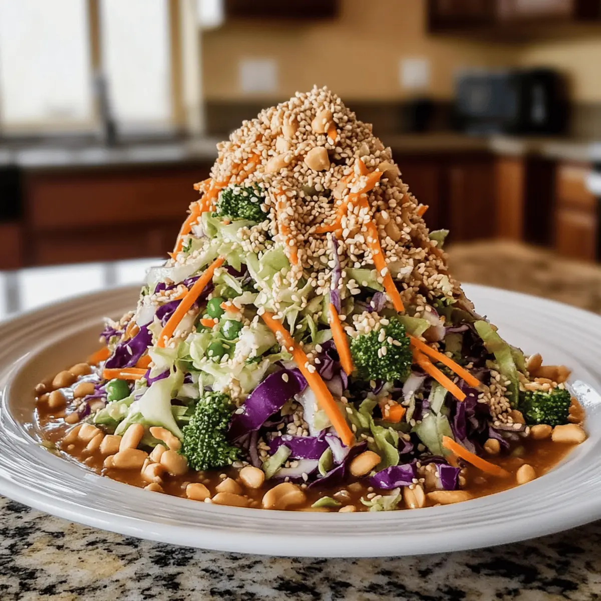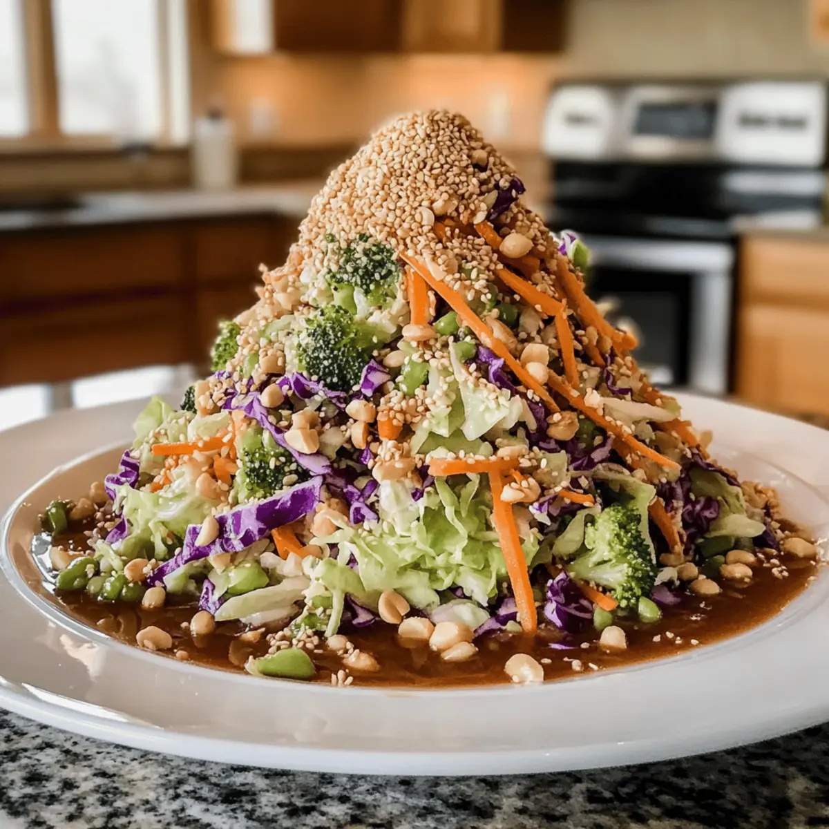 Finish your Crunchy Asian Cabbage Slaw by sprinkling toasted sesame seeds and chopped peanuts over the top. This garnish not only adds extra flavor but also elevates the visual appeal of the dish. Serve immediately for the best crunch, or let it sit for a few minutes to allow the flavors to meld. Enjoy your vibrant and healthy creation!