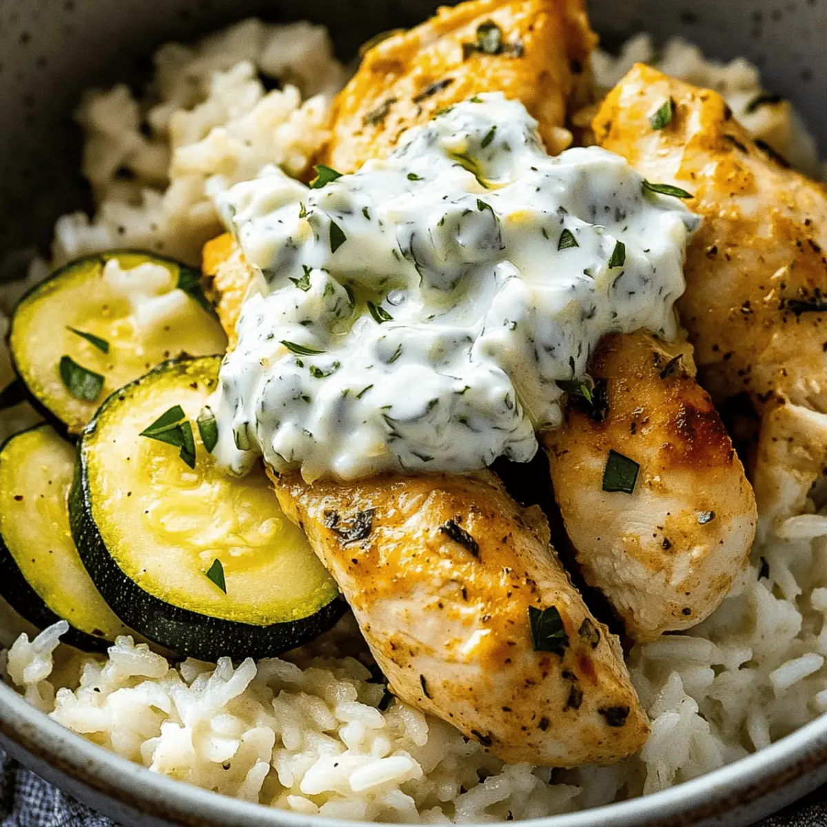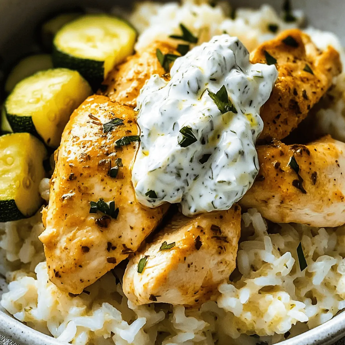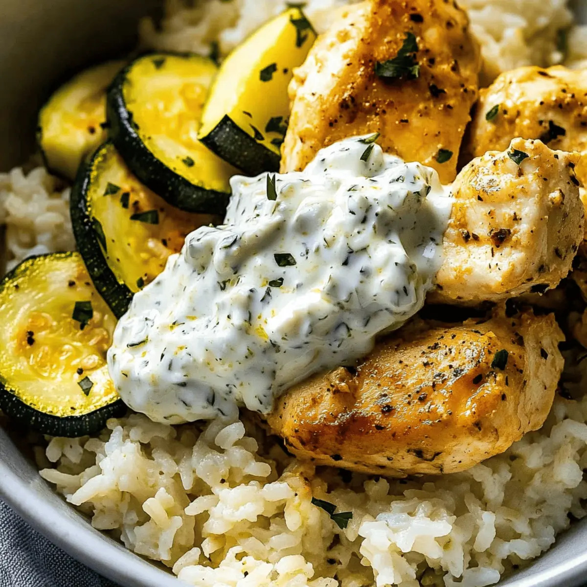 Jump to Recipe Print RecipeEvery bite of this Dump-and-Bake Chicken Tzatziki Rice Bake transports me straight to a sun-kissed Mediterranean terrace, with its vibrant flavors and comforting textures. This dish is not just a meal; it’s a celebration of simplicity and versatility, perfect for those weeknights when you crave something healthy yet delicious. The best part? It’s gluten-free and dairy-free, making it suitable for a variety of dietary preferences. Plus, with minimal prep and just one pan to clean, you can spend less time cooking and more time gathered around the table with loved ones. Are you ready to indulge in a dish that’s both effortless and packed with Mediterranean flair? Let’s dive in! Why is This Recipe So Appealing? Simplicity shines through with this effortless dish; just dump, bake, and enjoy! Flavor explosion awaits; zesty lemon and aromatic spices come together beautifully. Versatile ingredients let you customize; add veggies or swap proteins to suit your taste. Family-friendly means everyone will love digging into this comforting meal. Plus, this dish can be paired with options like warm pita or a fresh salad for a complete Mediterranean experience, echoing the delightful vibes of my Chicken Gyro Bowls or a heartwarming Butter Chicken Comfort. Dump-and-Bake Chicken Tzatziki Rice Ingredients For the Chicken • Boneless Skinless Chicken Breast or Thighs – This main protein is juicy and tender, but turkey or firm tofu can replace it for a vegetarian-friendly dish. • Lemon Juice – Adds acidity that brightens the flavors; lime juice works well as a substitute too. • Olive Oil – Moisture and flavor enhancer; consider avocado oil for a different twist. • Chopped Fresh Parsley – Provides a vibrant herb flavor; if fresh isn’t available, use dried parsley in a pinch. • Fresh Oregano & Thyme – These herbs infuse the dish with Mediterranean essence; substitute with dried herbs if needed (1 tsp dried for every 1 tbsp fresh). For the Rice Mixture • Long Grain White Rice – This is the base, delivering that fluffy texture; swap for brown rice, adjusting the cooking time as necessary. • Medium Zucchini – Adds moisture and nutritional value; swap with grated carrots or bell peppers for variation. • Chicken Broth – Gives the dish flavor and moisture; for a vegetarian option, use vegetable broth. For the Spices • Smoked Paprika – It brings that delightful smoky flavor; regular paprika can be an alternative, but it lacks the signature smokiness. • Seasoned Salt, Cumin, Onion Powder, Garlic Powder, Black Pepper, Turmeric, Cayenne Pepper – This seasoning blend creates a rich depth of flavor; feel free to adjust the spices according to your preference. For Serving • Tzatziki Sauce – Top your completed dish with this creamy, tangy addition to enhance the Mediterranean experience. This Dump-and-Bake Chicken Tzatziki Rice is not only delicious but also gluten-free and dairy-free, making it ideal for a variety of dietary needs! Enjoy transforming your weeknight dinners with this recipe. Step‑by‑Step Instructions for Dump-and-Bake Chicken Tzatziki Rice Step 1: Preheat the Oven Begin by preheating your oven to 375°F (190°C). This temperature is essential for achieving the perfect balance between cooked chicken and tender rice in your Dump-and-Bake Chicken Tzatziki Rice Bake. While the oven heats up, you can prepare the chicken to maximize flavor absorption. Step 2: Prepare the Baking Dish Grease a 9×13-inch baking dish with olive oil to prevent sticking and enhance the flavor. This will be the vessel for your Mediterranean masterpiece. Set it aside, and let’s focus on marinating the chicken so that each bite bursts with zesty goodness. Step 3: Marinate the Chicken In a mixing bowl, combine diced boneless skinless chicken breast or thighs with lemon juice, olive oil, and a medley of spices including smoked paprika, cumin, and garlic powder. Let this marinate for about 30 minutes at room temperature. This allows the flavors to meld beautifully, ensuring your Dump-and-Bake Chicken Tzatziki Rice is flavorful and aromatic. Step 4: Mix Rice and Veggies Once the chicken has marinated, add uncooked long grain white rice and grated zucchini into the greased baking dish. Pour chicken broth over the mixture, ensuring the rice is evenly distributed. Use a spoon to gently combine these ingredients, creating a harmonious blend that will absorb all the flavors as they bake. Step 5: Bake the Dish Cover the baking dish tightly with aluminum foil to lock in moisture. Place it in the preheated oven and bake for approximately 40 minutes. Keep an eye on it, as the rice should be tender and most of the liquid absorbed. If necessary, extend baking by an additional 5 to 10 minutes for perfect doneness. Step 6: Fluff the Rice After baking, carefully remove the foil, letting the steam escape. Use a fork to fluff the rice, which will make it light and airy. Taste and adjust the seasoning if needed; this is your chance to enhance the flavor profile of your delicious Dump-and-Bake Chicken Tzatziki Rice. Step 7: Serve with Tzatziki Spoon the rice mixture onto plates and finish with a generous dollop of tzatziki sauce. Consider garnishing with fresh parsley and a squeeze of lemon for an extra touch of brightness. Serve warm and delight in the comforting Mediterranean flavors that embody this effortless weeknight meal. Expert Tips for Dump-and-Bake Chicken Tzatziki Rice • Don’t Skip Marinating: Allowing the chicken to marinate for at least 30 minutes significantly enhances flavor absorption, ensuring your Dump-and-Bake Chicken Tzatziki Rice is bursting with taste. • Avoid Foil Fumbles: Keep the foil tightly sealed during baking to maintain moisture. Opening it can lead to dry rice and tenders; resist the temptation to peek! • Monitor Rice Texture: Overcooking can turn the rice mushy, so check for tenderness after 40 minutes. If it’s still firm, extend bak