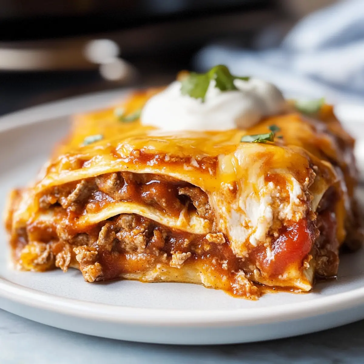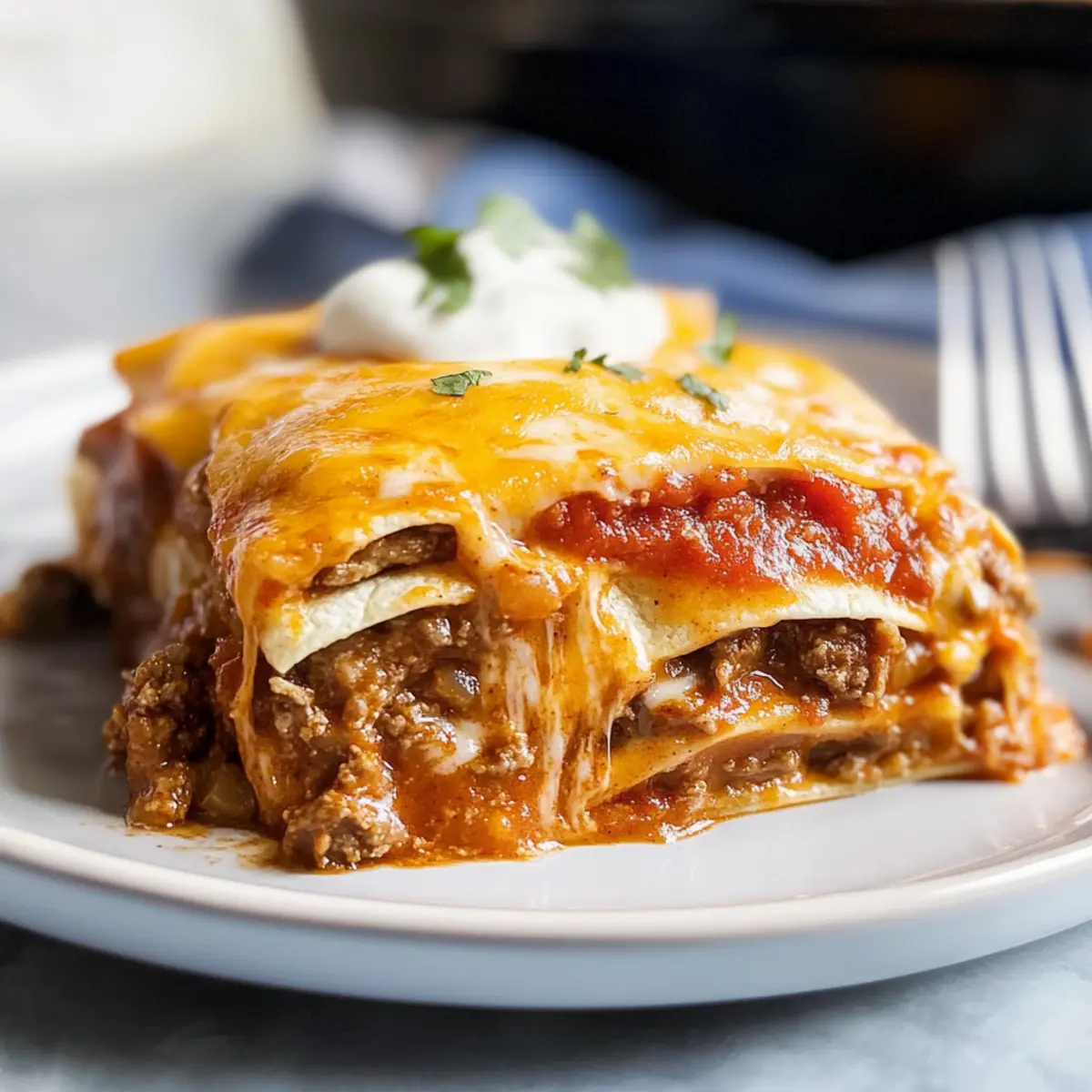 Continue layering the remaining tortillas, beef mixture, enchilada sauce, and cheese until all ingredients are used, finishing with a generous layer of cheese on top. Press down gently to ensure everything melds together, creating those delightful layers that will turn golden and bubbly as they bake.