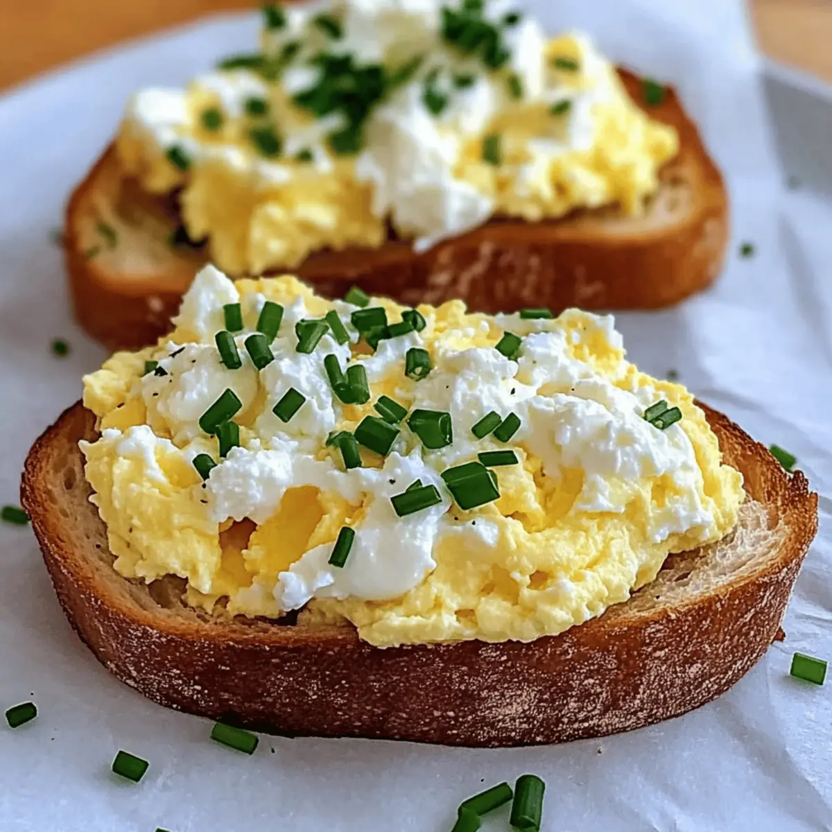 Jump to Recipe Print RecipeEach morning feels like a mini adventure in my kitchen, and I’m always on the lookout for quick yet delightful meals that can kickstart my day. Today, I’m excited to share my Easy 6-Ingredient Egg and Ricotta Toast—a breakfast revelation that brings both richness and satisfaction to the table without demanding hours of prep. The creamy ricotta paired with soft, fluffy scrambled eggs over crispy sourdough toast makes it the perfect dish for busy weekdays or leisurely brunching sessions with friends. Plus, it’s incredibly adaptable; whether you’re adding fresh herbs or a sprinkle of spice, this recipe can easily cater to your taste. Are you ready to turn your breakfast into a gourmet experience? Why You’ll Love Egg and Ricotta Toast Simplicity: With just six ingredients, this recipe is a breeze to whip up, making it perfect for even the busiest mornings. Creamy Delight: The combination of soft scrambled eggs and creamy ricotta creates a luxurious breakfast that feels indulgent yet remains quick and easy. Endless Adaptability: This toast is a blank canvas! Experiment with toppings like crispy bacon or even a sprinkle of chili flakes for a flavor boost. Texture Perfection: Enjoy the satisfying crunch of toasted sourdough, providing the ideal base to hold your delicious toppings without getting soggy. Crowd-Pleasing: Whether you’re cooking for yourself or friends, this dish impresses everyone at the table, making it a great choice for brunch gatherings or cozy dinners. Elevate your breakfast routine with this delightful Egg and Ricotta Toast that beautifully complements options like Sausage Egg Cheese or a refreshing side of Cheesy Ranch Sausage. Egg and Ricotta Toast Ingredients • To create your Egg and Ricotta Toast, here’s everything you need for a scrumptious breakfast! For the Egg Mixture Eggs – Rich in protein, use fresh eggs for the best flavor and fluffy texture. Chives – Adding a mild onion taste; feel free to substitute with green onions or parsley for a twist. Coarse Salt – Elevates the natural flavors of your dish; opt for sea salt or kosher salt for an enhanced taste. For Cooking Unsalted Butter – Provides richness while cooking the eggs; olive oil can substitute for a dairy-free alternative. For the Toast Base Whole Milk Ricotta – The star of your dish, adding creaminess and flavor; try to use fresh ricotta for the best results and drain any excess liquid. Sourdough Bread – The perfect base for the toppings; ensure it’s toasted to a golden brown for the ideal crunch. Now that you have your ingredients ready, let’s dive into the experience of making this delightful Egg and Ricotta Toast! Step‑by‑Step Instructions for Egg and Ricotta Toast Step 1: Whisk the Egg Mixture In a medium bowl, crack the fresh eggs and add the chopped chives and coarse salt. Using a whisk or fork, blend them together until the mixture is smooth and well-combined, with a light airy texture. This should take about 1 minute. The vibrant yellow of the eggs combined with the green chives will be visually appealing, setting the stage for a delicious Egg and Ricotta Toast. Step 2: Prepare the Skillet Heat a nonstick skillet over medium-low heat for about 1 minute. Add the unsalted butter to the skillet, allowing it to melt gently without browning. You’ll want to watch closely as it begins to foam; this indicates it’s melted and ready for the egg mixture. The butter should coat the skillet evenly, providing a rich flavor to your scrambled eggs. Step 3: Cook the Eggs Carefully pour the whisked egg mixture into the skillet. Using a spatula, gently stir the eggs continuously in a folding motion, scraping the bottom of the skillet for about 2 minutes. The goal is to cook the eggs slowly until they are mostly set but still slightly runny, creating soft, fluffy curds. They should look creamy but not dry, bringing you one step closer to that delightful Egg and Ricotta Toast. Step 4: Add the Ricotta Remove the skillet from heat once the eggs are cooked to your liking. Fold in the whole milk ricotta gently, making sure to leave some larger clumps for texture. This process should take about 30 seconds. The warmth of the scrambled eggs will enhance the creaminess of the ricotta, creating a rich filling that’s perfect for your toast. Step 5: Toast the Sourdough While the egg and ricotta mixture rests, toast slices of sourdough bread in a toaster or on a skillet until golden brown, which should take around 2-3 minutes. Aim for a crunchy texture that can hold the toppings without becoming soggy. The visual cue of a warm golden-brown crust will enhance the overall appeal of your Egg and Ricotta Toast. Step 6: Assemble Your Toast Once the sourdough is toasted, place the crispy slices on a plate. Generously spoon the egg and ricotta mixture over the toast, letting it spill over the edges for a rustic look. Garnish with extra chives or a sprinkle of coarse salt for a finishing touch. The contrast of the rich toppings against the toast will make this Egg and Ricotta Toast irresistible. Step 7: Serve & Enjoy Serve your Egg and Ricotta Toast immediately while warm. Pair it with fresh berries or a side salad for a balanced meal. The combination of creamy ricotta, fluffy eggs, and crunchy toast will create a delightful experience, making each bite a joyful moment to savor. What to Serve with Easy 6-Ingredient Egg and Ricotta Toast Elevate your breakfast experience with delightful complements that bring balance and flavor to your creamy creation. Fresh Berries: Juicy strawberries and blueberries add a sweet contrast, brightening the dish with bursts of flavor and freshness. Crisp Green Salad: A light salad with arugula and lemon vinaigrette offers a refreshing crunch, perfectly balancing the richness of the toast. Crispy Bacon: The salty crunch of bacon complements the soft textures beautifully, and its savory notes enhance the overall flavor profile. Smoked Salmon: 