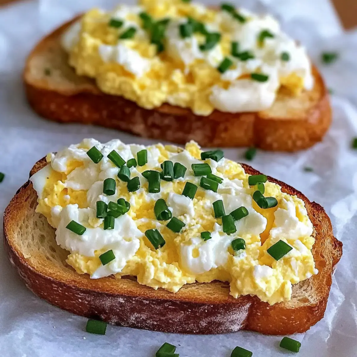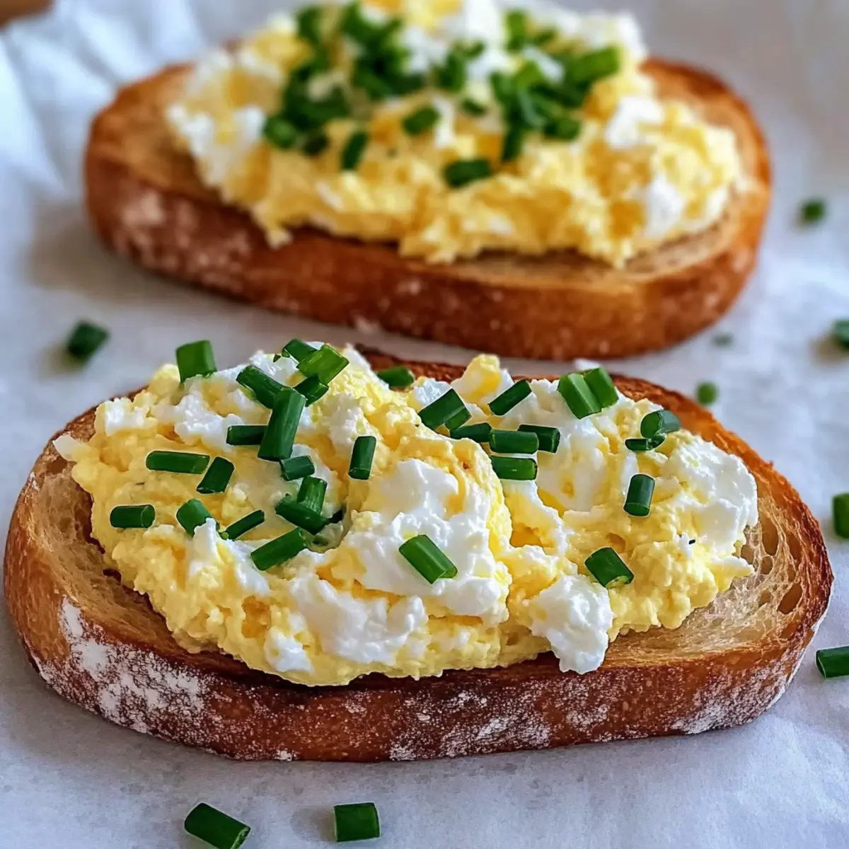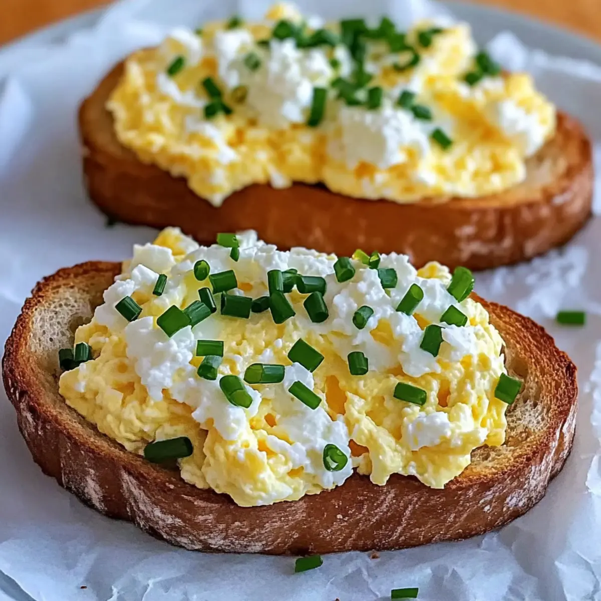 Jump to Recipe Print RecipeAs I sipped my morning coffee, the tantalizing aroma from the kitchen beckoned me like a warm hug. A quick glance at the clock reminded me that I was in need of something comforting yet simple, and that’s when the idea of Easy 6-Ingredient Egg and Ricotta Toast struck me. This recipe not only promises a delightful breakfast that takes mere minutes to prepare but also offers a creamy, nourishing start to the day, perfect for those chaotic mornings or leisurely weekend brunches. The luscious ricotta paired with soft scrambled eggs on a crispy sourdough base creates a harmony of textures that’s both satisfying and indulgent. Trust me, once you make this dish, it will quickly become a go-to favorite in your breakfast repertoire. Curious about how to whip up this creamy delight yourself? Let’s dive right in! Why choose Egg and Ricotta Toast? Quick Preparation: This recipe comes together in under 10 minutes, making it perfect for busy mornings when time is of the essence. Nourishing Ingredients: With fresh eggs and creamy ricotta, this dish is packed with protein and richness, ensuring you start your day right. Versatile: Feel free to customize it! Add crispy bacon for extra flavor or swap ricotta for mascarpone for a twist that’s just as delicious. Delicious Texture: The combination of soft scrambled eggs and crispy sourdough creates a perfect balance that you’ll love with every bite. Crowd-Pleaser: Impress your family or brunch guests with this simple yet satisfying dish—everyone will be asking for seconds! For more variations, check out my Chicken Mac Cheese or the delightful Cheesy Ranch Sausage for more tasty breakfast ideas! Egg and Ricotta Toast Ingredients For the Toast • Eggs – Use fresh, large eggs for the best flavor and texture. • Whole Milk Ricotta – Adds creaminess and is best when freshly drained for optimal richness. • Sourdough Bread – This bread provides a crispy base; feel free to use your preferred bread type for a different flavor. For Flavor Enhancement • Chives – Offers a mild onion flavor; can be swapped for green onions or left out if unavailable. • Coarse Salt – Adjust to taste; it enhances the flavor of both the eggs and the ricotta. • Unsalted Butter – Key for cooking the eggs gently without browning, ensuring a delicate flavor profile. Curious about how to bring this delicious Egg and Ricotta Toast to life? Let’s get cooking! Step‑by‑Step Instructions for Easy 6-Ingredient Egg and Ricotta Toast Step 1: Whisk the Eggs In a medium bowl, crack fresh large eggs and add chopped chives along with a pinch of coarse salt. Using a whisk or fork, mix them together gently until fully combined, aiming for a frothy consistency. This process should take about 1-2 minutes. The mixture will look slightly frothy and well blended, setting the stage for a rich and fluffy egg filling. Step 2: Heat the Skillet Place a nonstick skillet over medium-low heat and add a small knob of unsalted butter. Allow the butter to melt completely until it just coats the surface of the skillet, producing a gentle sizzling sound, which should take approximately 1-2 minutes. Keep your eyes on the butter to ensure it doesn’t brown, as we want a delicate flavor for our creamy egg and ricotta toast. Step 3: Cook the Eggs Carefully pour the whisked egg mixture into the skillet, stirring gently with a heat-proof spatula. Cook the eggs for about 2 minutes, being mindful to stir slowly and continuously. You want the eggs to begin to set while still slightly runny and soft, contributing to the creamy texture of your Egg and Ricotta Toast. Remove from heat just before they are fully cooked, as the residual heat will continue to cook them. Step 4: Incorporate Ricotta After removing the skillet from the heat, gently fold in the well-drained whole milk ricotta into the soft scrambled eggs with your spatula. Continue folding until just combined; leaving some clumps of ricotta will elevate the texture of your dish. Aim to do this quickly, ideally within 1-2 minutes, to maintain the warmth of the eggs and maximally blend in the creamy ricotta without overmixing. Step 5: Toast the Bread While you’re mixing the eggs and ricotta, toast your sourdough bread slices until they reach a golden brown and crispy texture. This should take about 3-4 minutes in a toaster or under a broiler. Keep an eye on them to avoid burning, as the crispy base will beautifully complement the creamy topping of your Egg and Ricotta Toast. Step 6: Assemble the Dish Once your bread is toasted, place the crispy sourdough on plates and generously spoon the creamy egg and ricotta mixture over the top. The vibrant colors of the scrambled eggs and ricotta against the hearty bread create an inviting presentation. Serve it immediately for the best experience, enjoying your homemade Egg and Ricotta Toast warm and fresh to savor each comforting bite. Make Ahead Options These Easy 6-Ingredient Egg and Ricotta Toast are perfect for meal prep! You can chop the chives and prepare portions of ricotta up to 24 hours in advance, keeping them in separate sealed containers in the refrigerator to maintain freshness. For those busy mornings, you can even whisk the eggs together and store them covered in the fridge, so you just need to cook them fresh when ready to assemble. When it’s time to enjoy your toast, simply toast the bread, pour the egg mixture into the skillet, and quickly add the ricotta. This way, you’ll have a delicious breakfast ready in no time, just as creamy and satisfying as if you made it all in one go! What to Serve with Easy 6-Ingredient Egg and Ricotta Toast Elevate your breakfast experience with delightful pairings that bring both flavor and fun to your table. Fresh Berries: These sweet, juicy gems add a refreshing contrast, balancing the creaminess of the toast beautifully. A burst of vibrant color, they make each bite a delight. Crispy Bacon: The savory saltiness creat