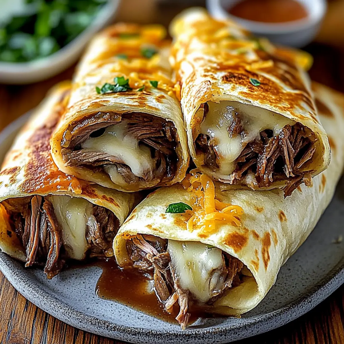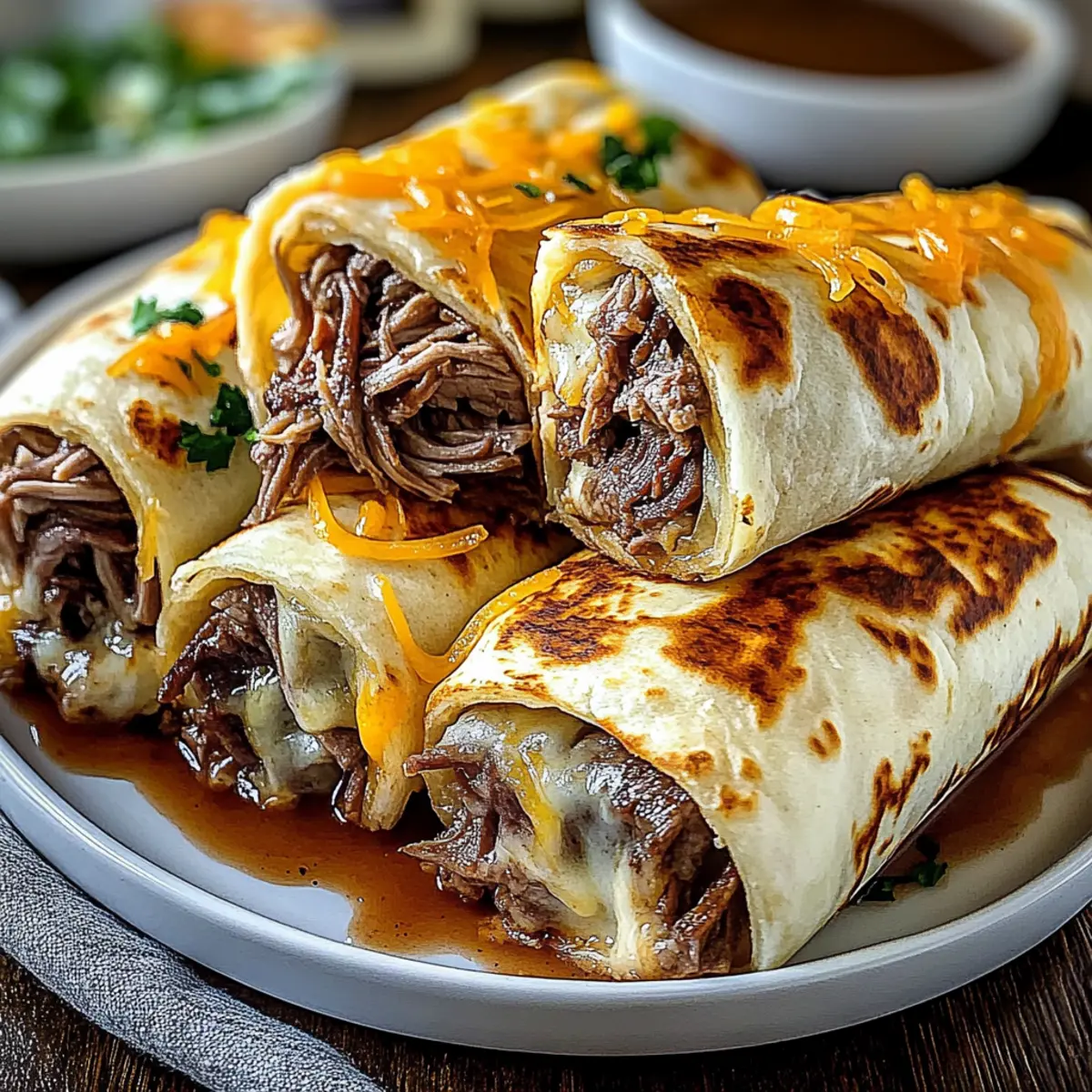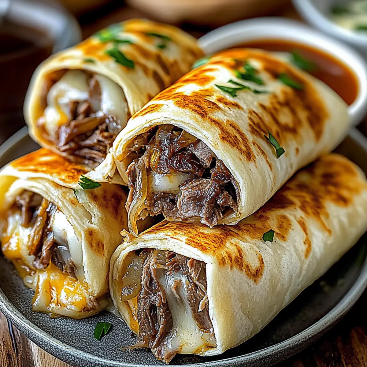 • Crispy Finish: Brush the tops with olive oil; consider broiling for the last minute to achieve extra crunchiness on your French Dip Tortilla Roll Ups.