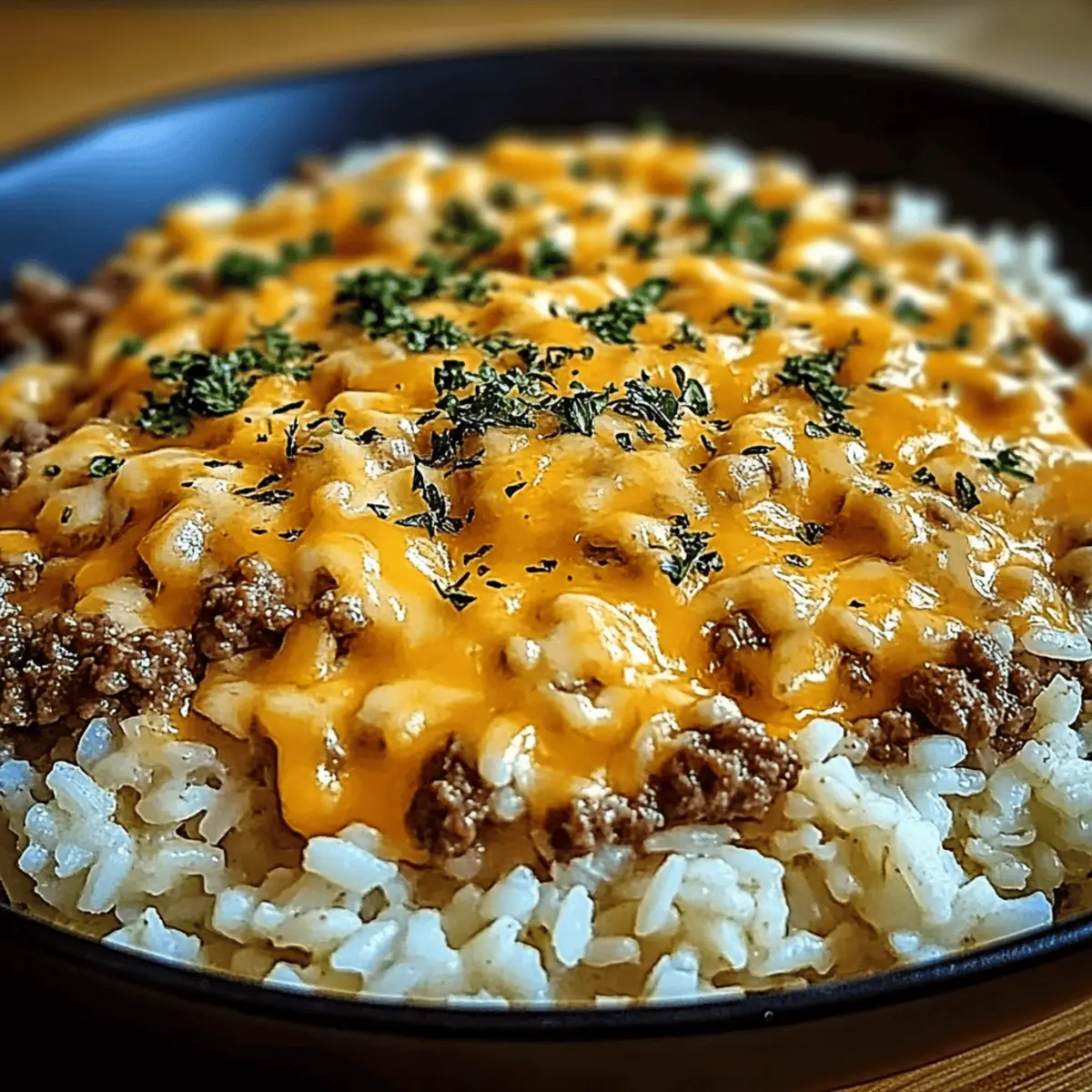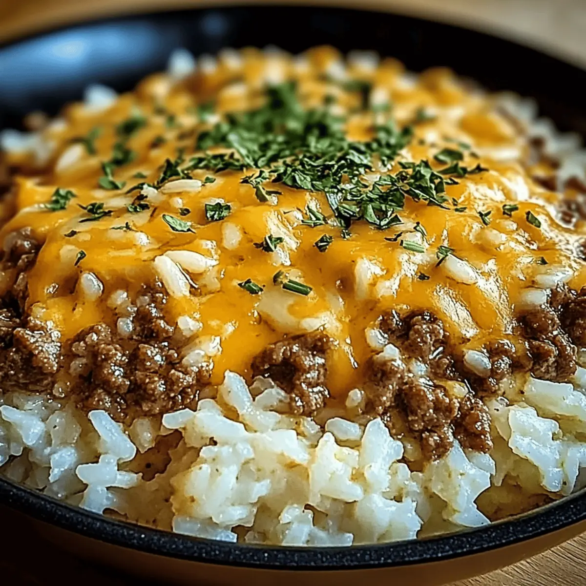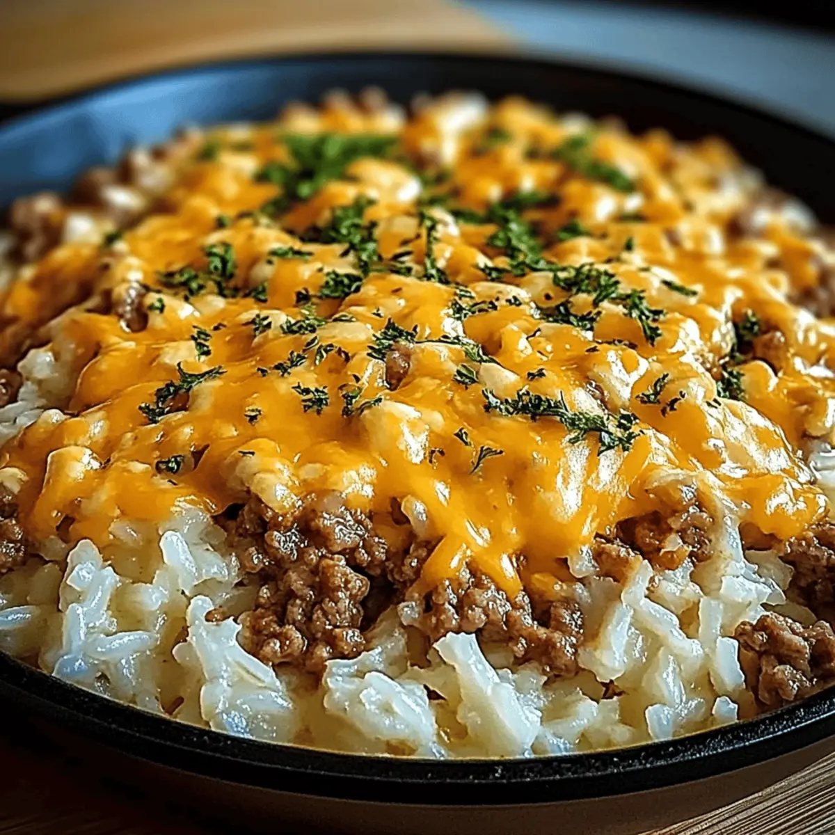 Jump to Recipe Print RecipeAs I stirred the bubbling mixture in my skillet, the aroma of garlic and sizzling beef instantly transported me to a cozy kitchen filled with laughter and love. The Garlic Butter Beef and Rice Skillet with Cheddar Parmesan Sauce is my go-to recipe for those hectic weeknights when time slips away, but a hearty meal is still expected. This dish effortlessly combines the savory depth of ground beef with creamy, cheesy goodness that warms the soul. It takes less than 40 minutes to whip up, making it perfect for busy families seeking comfort food without the fuss. Plus, it’s a one-pan wonder, ensuring fewer dishes and more time with loved ones. Have you ever craved a meal that feels like a warm hug? Let’s dive into this delightful recipe that’s bound to become a staple in your home! Why is This Skillet a Must-Try? One-Pan Convenience: Enjoy a delicious homemade dinner without the mess, as everything cooks in just one skillet! Rich, Cheesy Flavor: The creamy cheddar parmesan sauce melds beautifully with garlic-infused beef, creating a flavor explosion that’s simply irresistible. Quick to Prepare: Ready in under 40 minutes, this dish is perfect for busy weeknights when you crave comfort food without the long prep time. Family-Friendly Delight: Kids and adults alike will love this hearty meal, making it an excellent choice for family dinners. Versatile & Customizable: Feel free to swap the beef for turkey or chicken, or add veggies for a nutritious twist—like in our Garlic Parmesan Chicken Skewers. Next time you want a cozy meal that brings everyone together, this Garlic Butter Beef and Rice Skillet with Cheddar Parmesan Sauce will surely hit the spot! Garlic Butter Beef and Rice Skillet Ingredients For the Skillet • Ground Beef – the main protein source; opt for lean ground beef to reduce grease. • Long-Grain White Rice (uncooked) – acts as the meal’s hearty base, absorbing flavors; brown rice or quinoa can be substituted, adjusting the cooking time accordingly. • Olive Oil – the perfect cooking fat to sauté; feel free to swap it with canola or vegetable oil if preferred. • Garlic (minced) – infuses the dish with aromatic flavor; fresh garlic is always the better choice for taste. • Onion Powder – enhances the savory profile; you can use fresh onions for a more robust flavor. • Cajun Seasoning – adds a zesty kick and depth; a mix of paprika, garlic powder, onion powder, and cayenne works as a handy substitute. • Salt and Pepper – essential for seasoning to taste; don’t forget those little boosts of flavor. • Beef Broth – adds moisture and robust flavor to the mix; for a lighter version, vegetable broth is a great alternative. For the Cheesy Sauce • Cheddar Cheese (shredded) – provides wonderful creaminess and richness; feel free to use any melty cheese you love, like Monterey Jack. • Parmesan Cheese (grated) – enhances creaminess and umami flavor; Pecorino Romano is a wonderful substitute for a sharper taste. This delightful Garlic Butter Beef and Rice Skillet with Cheddar Parmesan Sauce is sure to reflect warmth and comfort in your home! Step‑by‑Step Instructions for Garlic Butter Beef and Rice Skillet with Cheddar Parmesan Sauce Step 1: Heat the Oil In a large skillet, heat 2 tablespoons of olive oil over medium-high heat for about 2 minutes, or until shimmering. This prepares the skillet for cooking the ground beef, ensuring a nice sear. Look for a slight ripple in the oil, signaling it’s ready for the next step. Step 2: Brown the Beef Add 1 pound of ground beef to the skillet. Cook the beef for 5-7 minutes, stirring occasionally, until it’s browned and fully cooked. Make sure to break it up into small pieces as it cooks. Once browned, drain excess fat if needed, keeping the beef juicy and flavorful. Step 3: Sauté the Garlic Push the beef to one side of the skillet, creating space for the garlic. Add 3 cloves of minced garlic and sauté for 1 minute, stirring constantly until fragrant. This will infuse the skillet with a delightful garlic aroma, enhancing the overall flavor of your Garlic Butter Beef and Rice Skillet. Step 4: Season the Mixture Sprinkle in 1 tablespoon of onion powder and 1 tablespoon of Cajun seasoning over the beef and garlic. Stir everything together for about 30 seconds, allowing the spices to coat the beef. This step builds depth in flavor, making your dish truly irresistible. Step 5: Introduce Rice and Broth Pour in 1 cup of uncooked long-grain white rice and 2 cups of beef broth. Stir to combine all ingredients thoroughly. Increase the heat slightly and bring the mixture to a gentle boil, allowing the rice to soak in the flavors of the Garlic Butter Beef and Rice Skillet. Step 6: Simmer to Perfection Once boiling, reduce the heat to low, cover the skillet, and let it simmer for 18-20 minutes. Stir occasionally to prevent the rice from sticking to the bottom. You’ll know it’s done when the rice is tender and has absorbed most of the liquid, creating a comforting, hearty base. Step 7: Create the Cheesy Sauce Turn off the heat and add 1 cup of shredded cheddar cheese and ½ cup of grated parmesan cheese to the skillet. Stir until the cheeses melt completely, creating a rich and creamy sauce that envelops the beef and rice. This luscious cheese mixture is what makes the dish unforgettable. Step 8: Final Seasoning Taste the Garlic Butter Beef and Rice Skillet and adjust the seasonings with salt and pepper as needed. If desired, add a little more Cajun seasoning for extra spice, tailoring the flavors to your family’s preference. Your skillet meal is now ready to be served, bursting with flavor and warmth! What to Serve with Garlic Butter Beef and Rice Skillet with Cheddar Parmesan Sauce Creating the perfect meal is about more than just the main dish— it’s about crafting a harmonious dining experience! Crisp Green Salad: A refreshing side that adds a crunchy texture and balan