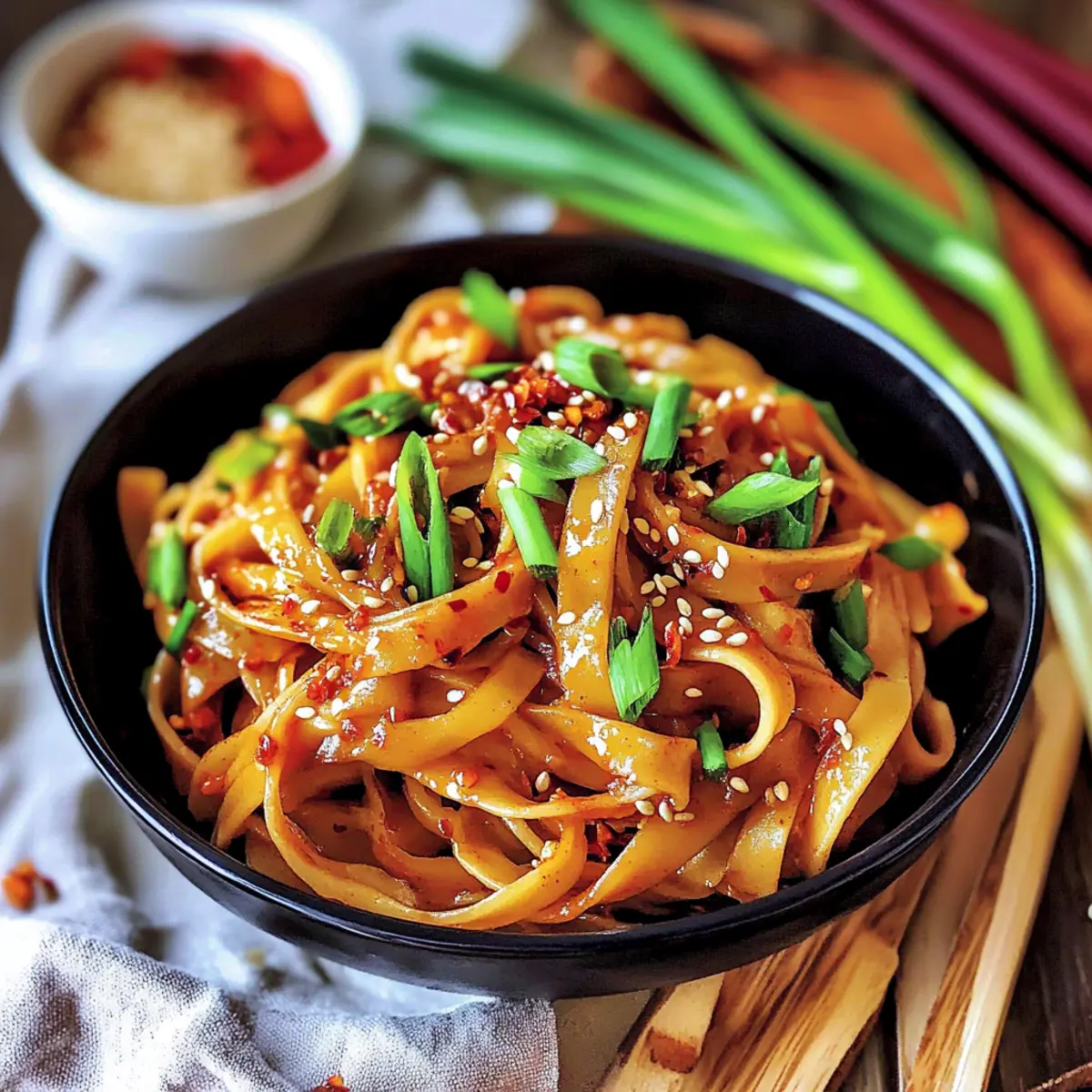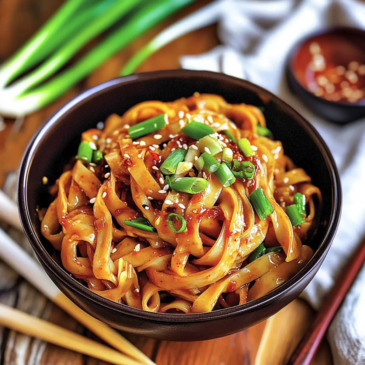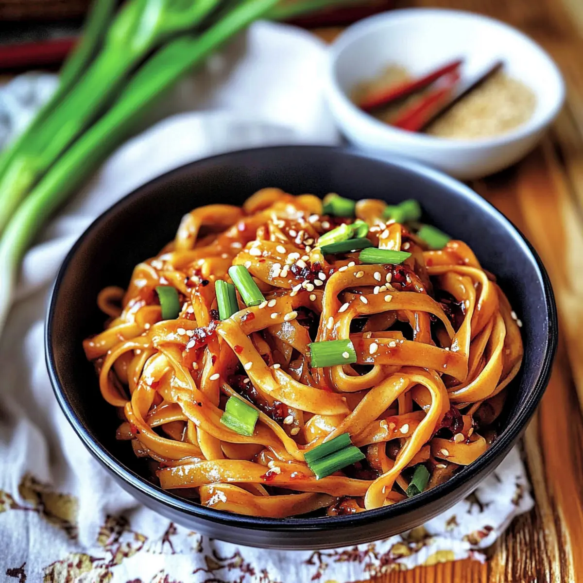 Jump to Recipe Print RecipeAs I stood by the stove, the unmistakable scent of garlic sizzling in hot oil enveloped my kitchen, igniting a rush of anticipation. These 10-Minute Spicy Garlic Chili Oil Noodles are a beloved go-to for busy weeknights, effortlessly combining fiery heat with comforting flavors. Each bite bursts with bold chili and fragrant garlic, creating a deliciously addictive dish that takes only moments to whip up. Whether you’re a passionate home-chef or someone looking to escape the mundane fast-food cycle, you’ll appreciate how customizable this recipe is—perfect for accommodating different spice levels or adding your favorite proteins and veggies. Who’s ready to dive into a plate of vibrant noodles that deliver both satisfaction and a delightful kick? Let’s get started! Why Are Garlic Chili Oil Noodles a Must-Try? Quick and Easy: In just 10 minutes, you can create a culinary masterpiece that dazzles your taste buds without spending hours in the kitchen. Bold Flavors: The robust combination of spicy chili flakes and freshly minced garlic creates an irresistible flavor explosion in every mouthful. Customizable Delight: This dish is perfect for anyone wanting to tailor their meal. From proteins to veggies, you can easily adapt ingredients to suit your preferences! Try adding some crispy tofu or shrimp for an extra punch. Versatile Meal Option: Whether it’s a quick lunch or a cozy dinner, these noodles fit the bill for any occasion. Feeling adventurous? Serve alongside Garlic Butter Steak or Garlic Parmesan Pasta to elevate your meal further. Crowd-Pleasing: These noodles aren’t just for you; they are bound to impress family and friends too, making them a go-to choice for gatherings! Garlic Chili Oil Noodles Ingredients • Note: Get ready to whip up a batch of these delightful Garlic Chili Oil Noodles with the following simple ingredients. For the Noodles • Wide Wheat Noodles (150g / 5 oz) – The base for this dish, providing a satisfying chewy texture; feel free to substitute with egg or gluten-free rice noodles if preferred. For the Garlic Oil • Oil (2 tablespoons) – Essential for toasting aromatics; a neutral oil like canola or sunflower will work wonders. • Garlic (3 cloves, finely diced) – The aromatic star of this dish; always opt for fresh garlic for maximum flavor. • Green Onion (2, separated) – Adds a crunchy, mildly sweet contrast; chives can be a good substitute if needed. For the Spice & Flavor • Red Chili Flakes (2-3 teaspoons) – This key ingredient brings the heat; adjust to suit your spice tolerance. • White Sesame Seeds (1 teaspoon, untoasted) – Adds a delightful nuttiness; toast them lightly for an extra flavor boost if you like. • Red Chili Powder (¼ teaspoon) – Offers an additional layer of spice and vibrant color; consider using smoked paprika for a twist. • Chicken Bouillon Powder (½ teaspoon) – Enhances the umami depth; swap with vegetable bouillon for a vegetarian version. For Saucing the Noodles • Dark Soy Sauce (2 teaspoons) – Imparts a rich color and complexity; avoid swapping it with regular soy sauce without adjusting the amount. • All-Purpose Soy Sauce (1 tablespoon) – Provides essential saltiness; can use light soy sauce if desired. • Rice Vinegar (1 teaspoon) – Adds a touch of acidity to balance flavors; substitute with white vinegar if that’s what you have. • Brown Sugar (½ teaspoon) – This hint of sweetness helps counter the heat; feel free to adjust to taste. • Toasted Sesame Oil (2 teaspoons) – A final flourish that elevates the dish; don’t use regular cooking sesame oil here, as the flavor is different. Optional Enhancements • Chili Crisp (1-2 teaspoons, optional) – Adds a crunchy texture and more spice; leave it out for a milder bowl. • Green Part of Spring Onion & White Sesame Seeds (for topping) – These add fresh flavor and a beautiful finishing touch. Get your ingredients ready, and let’s dive into creating these delicious Garlic Chili Oil Noodles that will make your taste buds dance with joy! Step‑by‑Step Instructions for Garlic Chili Oil Noodles Step 1: Boil the Noodles Begin by boiling a pot of water over high heat. Once it reaches a rolling boil, add the wide wheat noodles and cook according to package instructions until al dente, typically around 5-7 minutes. Once cooked, reserve about ¼ cup of the starchy water for later use, then drain the noodles and set them aside while you prepare the sauce. Step 2: Prepare the Garlic Oil In a medium-sized pan, heat 2 tablespoons of oil over medium heat. Once the oil shimmers, add 3 finely diced garlic cloves along with the white parts of 2 green onions, 2-3 teaspoons of red chili flakes, and 1 teaspoon of white sesame seeds. Stir the mixture constantly for about 2-3 minutes until the garlic turns golden and fragrant, ensuring you don’t let it burn. Step 3: Enhance the Flavor Next, sprinkle in ¼ teaspoon of red chili powder and stir for an additional minute to develop the flavors further. After that, carefully pour in the reserved starchy water, mixing well to combine all ingredients swiftly. This step adds moisture and depth to your Garlic Chili Oil Noodles sauce, ensuring it clings beautifully to the noodles. Step 4: Incorporate Seasonings Remove the pan from heat and stir in ½ teaspoon of chicken bouillon powder, 2 teaspoons of dark soy sauce, 1 tablespoon of all-purpose soy sauce, 1 teaspoon of rice vinegar, and 2 teaspoons of toasted sesame oil. Finally, add ½ teaspoon of brown sugar along with the green parts of the green onions. Mix everything until evenly incorporated, creating a rich, flavorful sauce for your noodles. Step 5: Toss the Noodles Add the drained noodles directly into the sauce in the pan. Using tongs or a fork, toss the noodles until they are thoroughly coated in the chili oil mixture, which should glisten with a vibrant color from the spices. This process not only combines th
