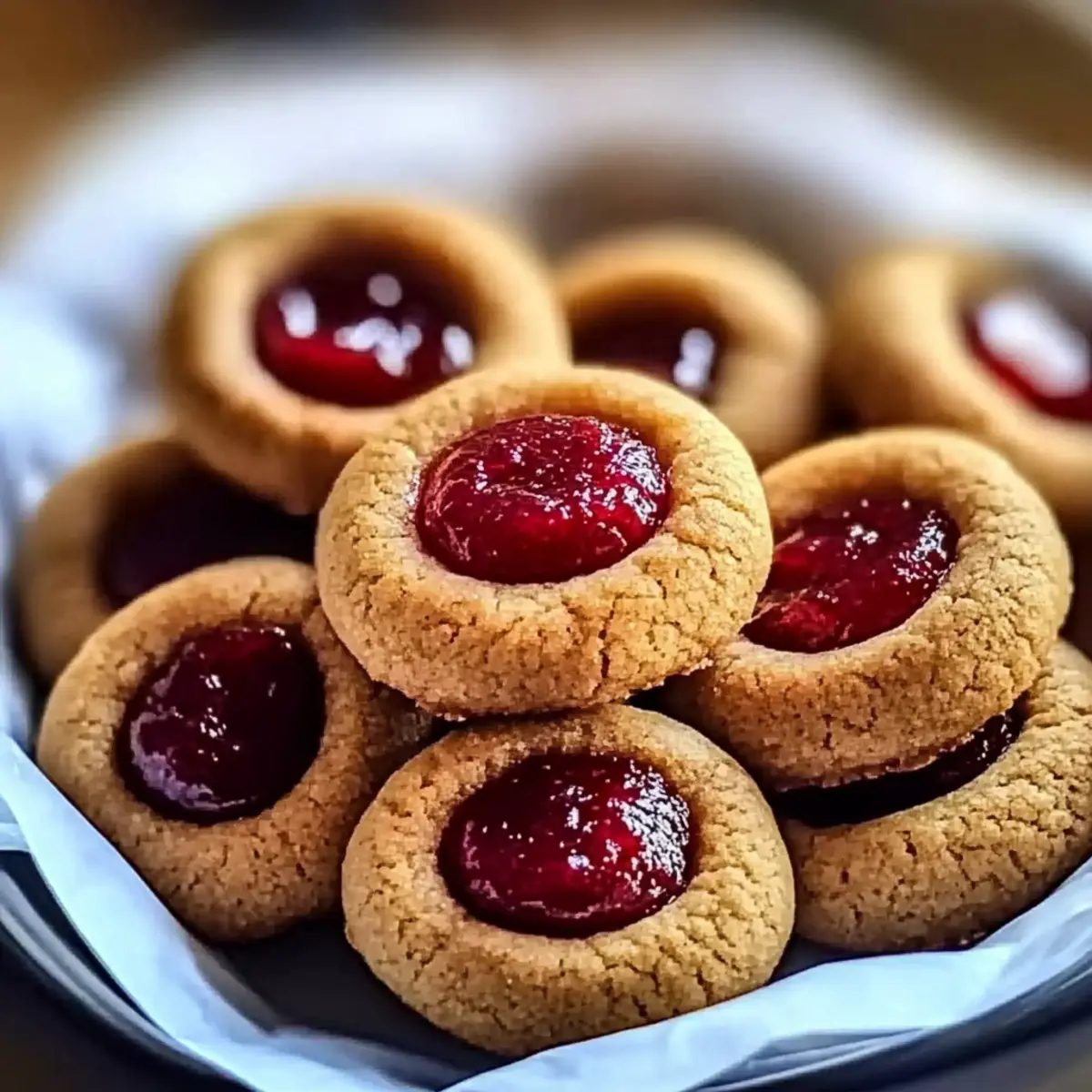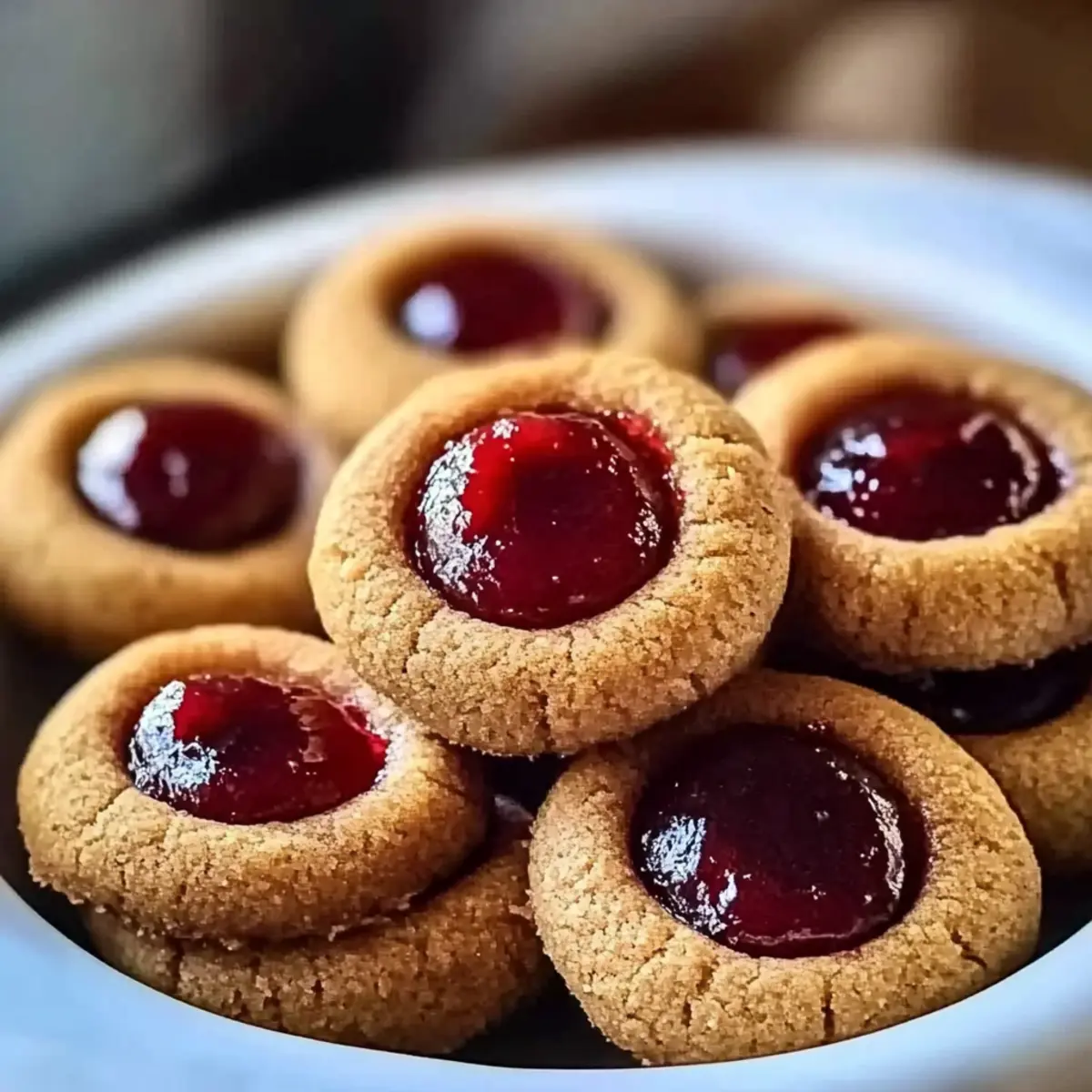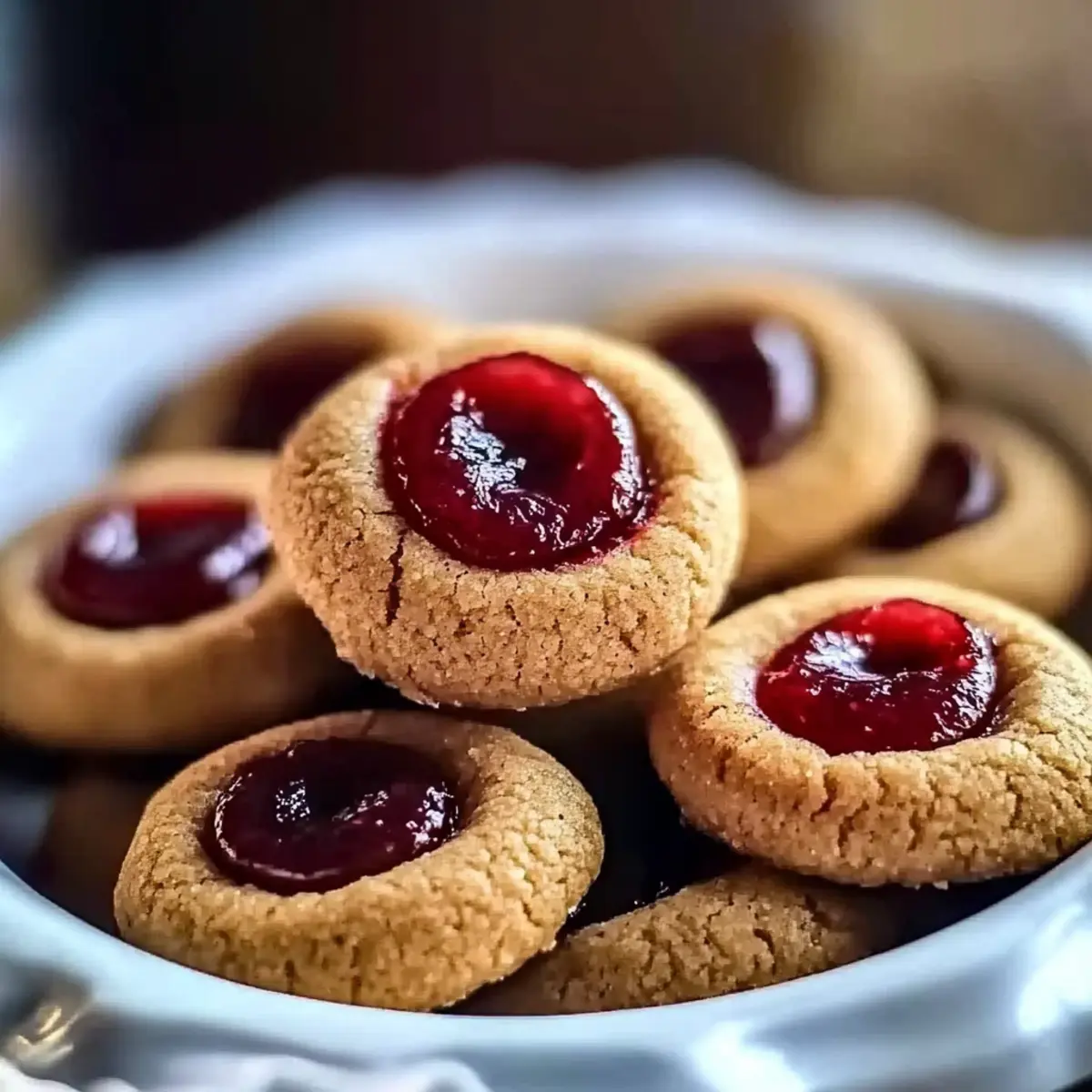 Jump to Recipe Print RecipeAs I pulled the first batch of Gingerbread Thumbprint Cookies with Cranberry Jam from the oven, the warm, spicy aroma wrapped around me like a comforting hug. Each bite of these delightful cookies delivers a perfect balance of soft, chewy gingerbread and a sweet, tangy surprise at the center. Not only do they make for an irresistible treat that’s perfect for holiday gatherings, but their quick preparation means you’ll be savoring them in no time—no more relying on fast food! With festive colors and the promise of spice laced with jammy goodness, these cookies are destined to become a seasonal favorite. So, why not dive in and discover how this easy-to-follow recipe can bring warmth and joy to your kitchen? Why are these cookies a crowd favorite? Deliciously Unique: These Gingerbread Thumbprint Cookies cater to both cookie lovers and gingerbread enthusiasts, offering a delightful twist on a classic favorite. Festive Colors: The vibrant cranberry jam perfectly complements the rich, dark tones of gingerbread, making them a feast for the eyes as well as the palate. Quick & Simple: With minimal prep time, you can whip these up faster than you can order takeout, making them ideal for spontaneous baking sessions or last-minute gatherings. Versatile Variation: Feel free to switch out the cranberry jam with your favorite flavor like raspberry or peach for a fun change! And if you’re looking for more holiday-inspired treats, check out my Lemon Raspberry Cookies for another delicious bake. Perfect Pairing: Enjoy these cookies with a hot cup of tea or coffee for that cozy afternoon treat, making every moment a holiday celebration! Gingerbread Thumbprint Cookies Ingredients • Indulge your baking spirit with these delightful components. For the Cookie Dough All-Purpose Flour – Provides structure to the cookies; substitute with gluten-free flour for a gluten-free option. Baking Soda – Helps cookies rise for a light texture; ensure it’s fresh for best results. Ground Ginger – Adds warm spice; can be substituted with fresh grated ginger for a more intense flavor. Ground Cinnamon – Offers sweetness and warmth; omit if a non-spiced flavor is preferred. Ground Nutmeg – Contributes subtle earthy flavor; can reduce or replace with more cinnamon. Ground Cloves – Adds depth of flavor; omit for a less spiced cookie. Salt – Enhances flavor balance in the cookies. Unsalted Butter – Provides richness; use room temperature for easy creaming; substitute with vegan butter for a dairy-free version. Granulated Sugar – Contributes sweetness and texture; can be replaced with coconut sugar for a lower glycemic option. Brown Sugar – Adds moisture and caramel notes; substitute with white sugar if not available. Molasses – Essential for the gingerbread flavor; dark corn syrup can be used as a substitute. Large Egg – Acts as a binder; replace with flax egg (1 tablespoon flaxseed meal + 3 tablespoons water) for a vegan option. Vanilla Extract – Enhances the flavor profile; omit if using another flavored extract. For the Jam Filling Cranberry Jam – Used for filling; feel free to use store-bought or homemade; can substitute with raspberry or apricot jam if preferred. For Rolling the Cookies Additional Granulated Sugar – Used for rolling the cookie balls, adding sweetness and texture. Step‑by‑Step Instructions for Gingerbread Thumbprint Cookies with Cranberry Jam Step 1: Preheat the Oven Begin by preheating your oven to 350°F (175°C). While the oven warms, prepare your baking sheets by lining them with parchment paper to prevent sticking. This simple step sets the stage for baking perfect Gingerbread Thumbprint Cookies with Cranberry Jam. Step 2: Combine the Dry Ingredients In a medium bowl, whisk together the all-purpose flour, baking soda, ground ginger, cinnamon, nutmeg, cloves, and salt until well combined. This process not only infuses the dry components with flavor but also ensures even distribution. Set this mixture aside as you move to the next step. Step 3: Cream the Butter and Sugars In a large mixing bowl, beat the softened unsalted butter, granulated sugar, and brown sugar together using an electric mixer on medium speed. Continue until the mixture becomes light and fluffy, approximately 3-5 minutes. The creaminess of this blend is essential for the texture of your Gingerbread Thumbprint Cookies. Step 4: Mix in Wet Ingredients Gradually add the molasses, large egg, and vanilla extract to the butter-sugar mixture, mixing on low speed until fully incorporated. This should take about 1-2 minutes. The addition of these ingredients introduces a rich, sweet base that will complement the spices beautifully. Step 5: Combine Mixtures Slowly add the dry ingredient mixture to the wet ingredients, stirring gently with a spatula or wooden spoon until just combined. Be careful not to overmix, as this will maintain the soft and chewy texture of your cookies. The dough should be slightly sticky but manageable. Step 6: Chill the Dough Cover the bowl tightly with plastic wrap and refrigerate the dough for 15-20 minutes. This chilling step is crucial as it helps prevent the cookies from spreading too much while baking, ensuring your Gingerbread Thumbprint Cookies maintain their shape and chewy consistency. Step 7: Form Cookie Balls Once chilled, use a tablespoon to scoop portions of dough and roll them into balls, approximately 1 inch in diameter. After shaping, coat each ball in granulated sugar for extra sweetness and a lovely texture. This step is essential for creating that delightful outer layer on the cookies. Step 8: Create Indentations After rolling the dough into balls, use your thumb or the back of a spoon to create a small well in the center of each cookie ball. Make sure the indentation is deep enough to hold a generous amount of jam. This is where the magic of the cranberry jam comes into play! Step 9: Add Jam Filling Spoon cranberry jam into each ind