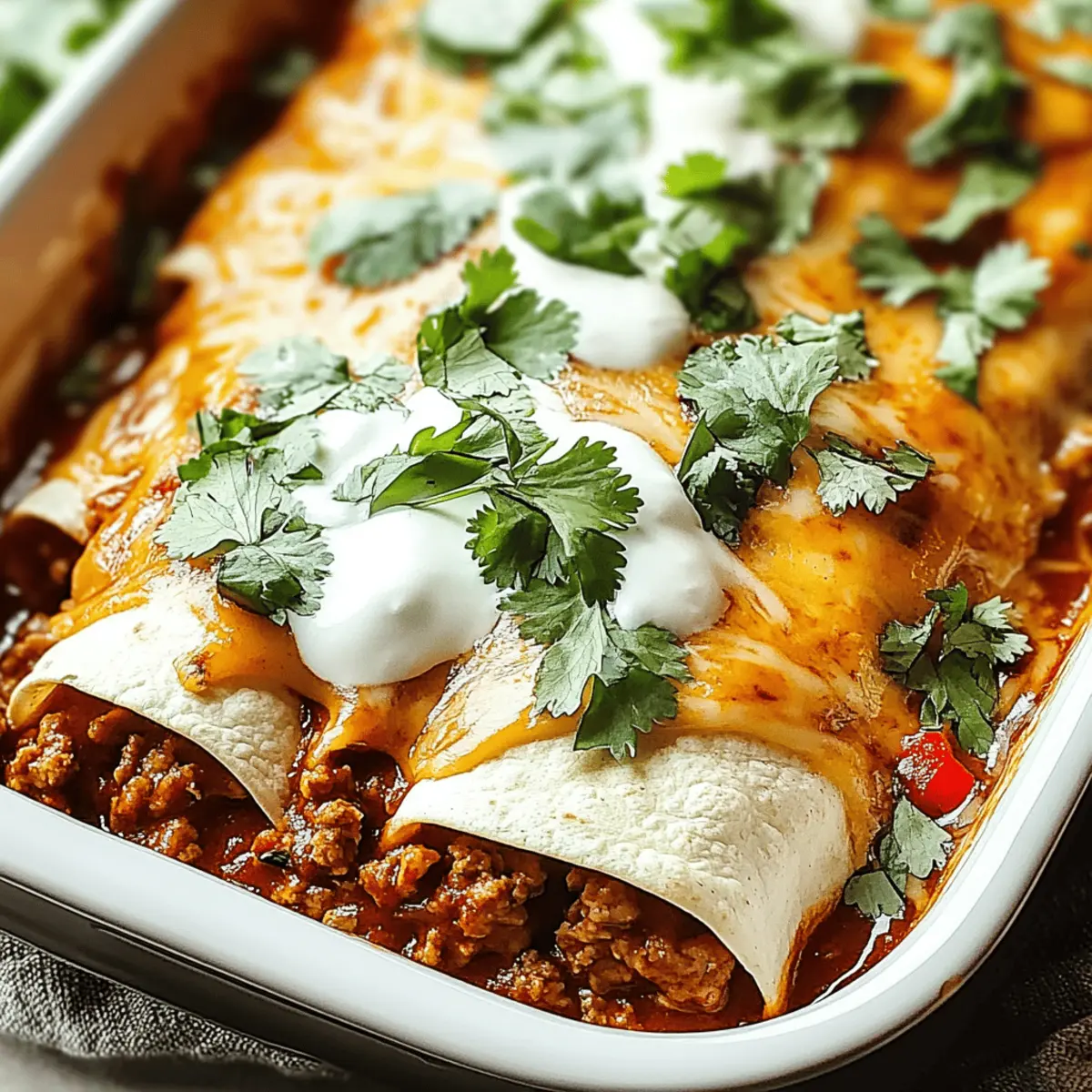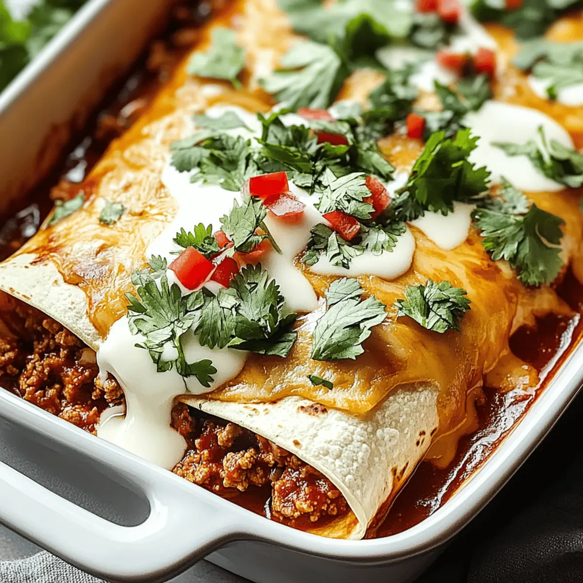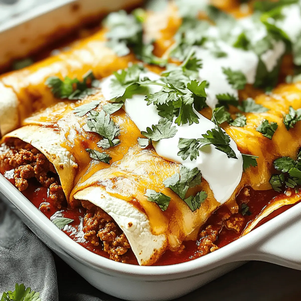 Jump to Recipe Print RecipeAs the savory scent of seasoned ground beef mingles with melting cheese, I can’t help but feel transported to family dinners filled with laughter. These Easy Ground Beef Enchiladas have earned their place in my heart for a reason; not only are they a comforting staple that brings everyone together, but they also adapt beautifully to what you have on hand—be it chicken, turkey, or lentils. The best part? They come together in a flash, making them a perfect solution for busy weeknights or last-minute gatherings. With a warm dish like this, who wouldn’t want to dive in headfirst? Are you ready to discover the joy of making these tasty enchiladas at home? Why Are These Enchiladas So Irresistible? Comforting and familiar, these Easy Ground Beef Enchiladas will instantly make your kitchen feel like home. Quick to prepare, they come together in under an hour, perfect for impromptu dinner guests. Versatile by nature, you can substitute proteins like chicken or even lentils to suit your needs. Flavor-packed with zesty seasonings, every bite bursts with savory goodness, making them a crowd-pleaser. If you’re in the mood for more delicious options, check out my Chicken Enchiladas Cheesy or add a twist with my Creamy Beef Pasta Protein for variety throughout the week! Ground Beef Enchiladas Ingredients • For the Filling Ground Beef – Provides hearty protein and flavor; substitutes like chicken, turkey, or lentils can be used for a lighter option. Onions – Adds sweetness and depth to the filling; yellow or white onions work best, with shallots as a milder alternative. Garlic – Enhances flavor; fresh minced garlic is preferred, but garlic powder can be a quick substitute. Cumin – Offers a warm, earthy flavor; adjust the quantity for a milder or stronger profile. Chili Powder – Adds heat and gives the enchiladas their characteristic flavor; smoked paprika can provide a unique twist. • For the Tortillas Tortillas – Encapsulate the filling; corn tortillas are traditional, while flour tortillas offer a softer choice. Lightly frying them can prevent sogginess. • For the Sauce & Topping Enchilada Sauce – Provides moisture and flavor; shop-bought is fine, but adding fresh spices can elevate a canned sauce. Shredded Cheese – Adds creaminess and richness; a blend of cheddar and Monterey Jack creates a deliciously melty topping. Step‑by‑Step Instructions for Ground Beef Enchiladas Step 1: Preheat the Oven Begin by preheating your oven to 375°F (190°C). While the oven warms up, take a moment to grease your baking dish with a bit of oil or cooking spray to prevent the enchiladas from sticking later. This simple step sets the stage for a perfectly baked dish of Ground Beef Enchiladas. Step 2: Sauté Aromatics In a large skillet over medium heat, add the ground beef along with finely diced onions. Cook for about 5-7 minutes, stirring occasionally, until the beef is browned and the onions become translucent. The aroma of the sautéed onions will fill your kitchen, foreshadowing the delicious Ground Beef Enchiladas to come. Step 3: Add Seasonings Next, stir in minced garlic, cumin, and chili powder into the skillet. Allow the mixture to cook for another minute, letting the flavors meld and the garlic become fragrant. This step is crucial for infusing your filling with a zesty kick that elevates your Ground Beef Enchiladas to new heights. Step 4: Assemble Enchiladas Take warm tortillas and spoon a generous amount of the beef mixture onto each. Carefully roll them up tightly and place them seam-side down in your prepared baking dish. Make sure to fit them snugly; this packing enhances the flavor and presentation of your Ground Beef Enchiladas. Step 5: Top with Sauce Pour a hearty amount of enchilada sauce evenly over the rolled tortillas in the baking dish. Then, sprinkle a generous layer of shredded cheese on top, ensuring that every inch is covered for that deliciously melty finish. The combination of sauce and cheese is what makes these Ground Beef Enchiladas so irresistible. Step 6: Bake Transfer the baking dish to your preheated oven and let the enchiladas bake uncovered for 20-25 minutes. Keep an eye on them until the cheese is bubbly and golden brown, looking just perfect. This final touch of baking creates a delightful contrast of textures in your Ground Beef Enchiladas that everyone will love. Expert Tips for Ground Beef Enchiladas Fry Tortillas: Frying the tortillas briefly creates a moisture barrier, preventing soggy enchiladas. This step ensures a delightful texture that enhances your Ground Beef Enchiladas. Cool Before Slicing: Let the enchiladas cool slightly before cutting. This helps keep their shape intact, preventing messy servings and ensuring a beautiful presentation. Seal Properly: Ensure the rolls are tightly sealed to avoid cheese or meat leakage during baking. A well-rolled enchilada yields tastier results. Customize for Taste: Don’t hesitate to experiment with toppings like fresh cilantro, jalapeños, or sour cream. These can elevate your Ground Beef Enchiladas and cater to different palates. Use Fresh Ingredients: Opt for fresh garlic and spices for the best flavor. Quality ingredients make all the difference in creating a memorable dish. Ground Beef Enchiladas Variations & Substitutions Feel free to get creative with your enchiladas and personalize them to your liking—your taste buds will thank you! Dairy-Free: Substitute shredded cheese with dairy-free options or a sprinkle of nutritional yeast for added flavor. Spicy Kick: Add chopped jalapeños into the filling or scatter them on top for a fiery twist that elevates your Ground Beef Enchiladas. Vegetarian Delight: Swap out ground beef for lentils or black beans for a delicious plant-based alternative that doesn’t skimp on taste. Grain-Free: Use zucchini or eggplant slices instead of tortillas for a low-carb version; just bake until tender before filling. Flavor Boost: Inco