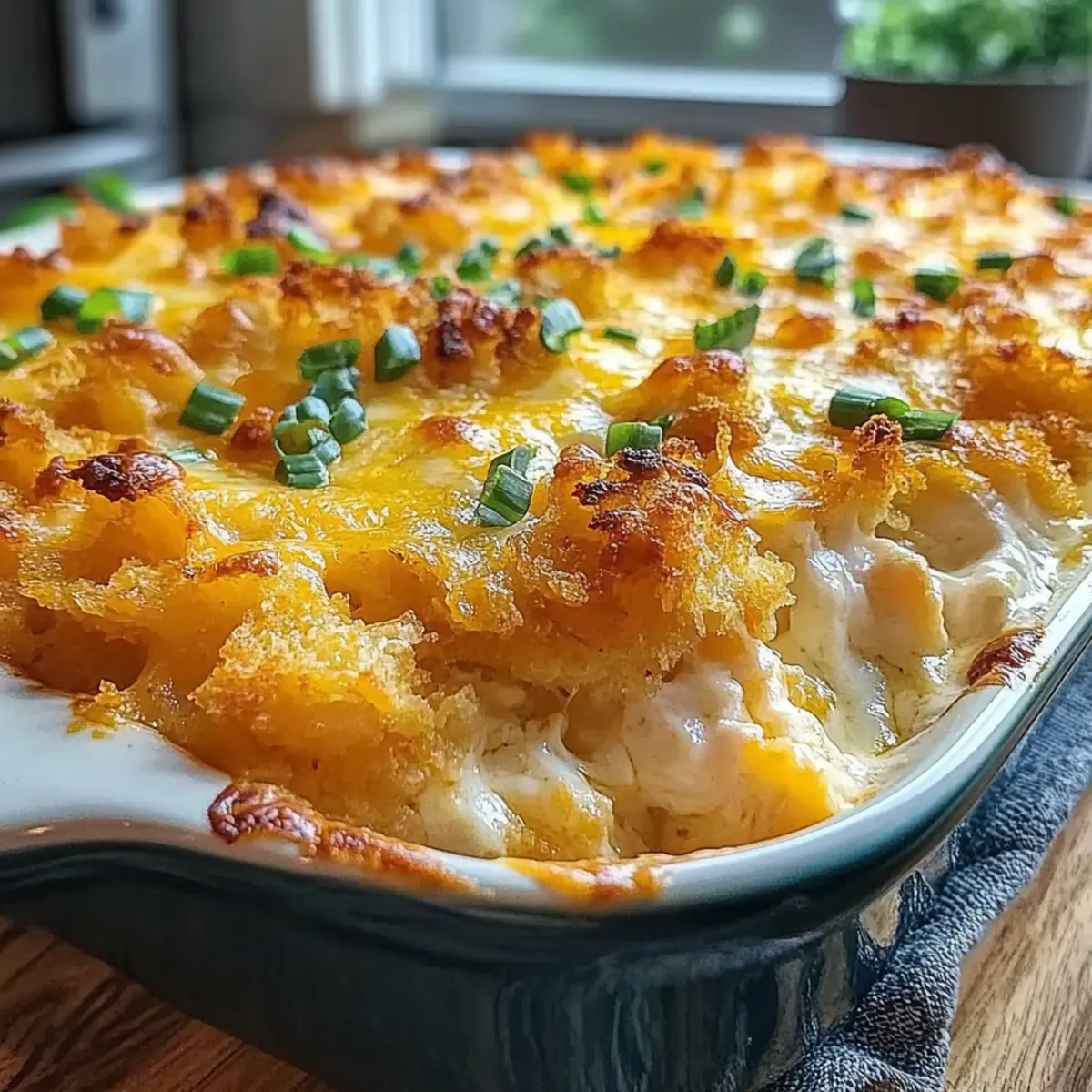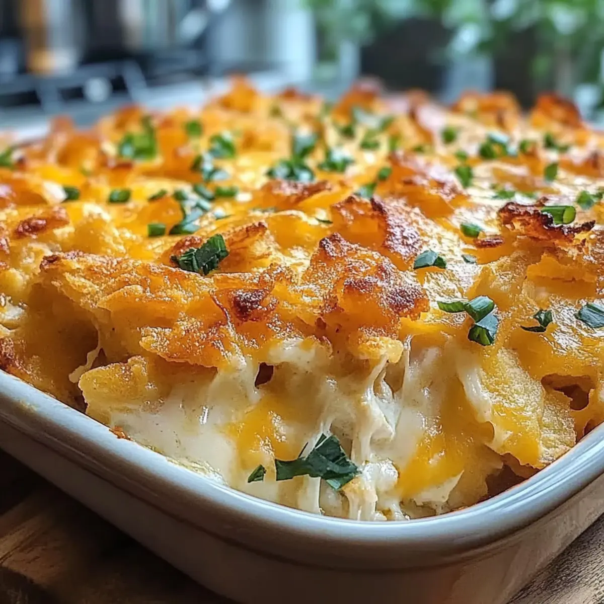 Jump to Recipe Print RecipeAs I stood in the kitchen, the aroma of crispy hashbrowns and melting cheese wafted through the air, instantly transporting me to cozy family dinners of my childhood. This Creamy Hashbrown Chicken Casserole brings together juicy chicken, crunchy hashbrowns, and a delightful cheese sauce, making it a family-favorite that never fails to impress. With its easy-to-prepare nature and crowd-pleasing flavors, this hearty dish is perfect for busy weeknights or potluck gatherings. Plus, it’s versatile enough to accommodate various proteins and dietary needs, ensuring everyone at the table feels included. Intrigued by how to whip up this comforting classic? Let’s dive into the recipe! Why Is This Casserole So Beloved? Family-Friendly: This Hashbrown Chicken Casserole appeals to all ages, making it an instant hit at the dinner table. KIds adore the cheesy, comforting flavors, while adults appreciate its heartiness. Make-Ahead Marvel: Perfect for busy schedules, it can be prepared ahead of time, allowing you to spend more quality moments with loved ones. Customizable: Whether you opt for turkey, ham, or a vegetarian twist, its versatility makes it easy to cater to everyone’s tastes. Don’t miss trying the Butter Chicken Comfort for another delightful flavor! Satisfying Texture: The contrast between the creamy interior and crispy hashbrown topping creates an irresistible mouthfeel that keeps everyone coming back for more. Quick & Easy: With minimal prep and just one dish to clean, dinner can be a breeze. Save time and effort without sacrificing flavor—this casserole does it all! Hashbrown Chicken Casserole Ingredients For the Casserole Cooked, Shredded Chicken – Primary protein source; stays moist in the casserole. Substitute with cooked turkey or diced ham for variety. Frozen Hashbrown Potatoes (30 oz) – Provides the crunchy topping; ensures a golden crust. Pat dry to improve crispiness. Shredded Sharp Cheddar Cheese (1.5 cups) – Adds rich, cheesy flavor; can substitute with Monterey Jack or Gruyère for a slightly different taste. Sour Cream (1 cup) – Contributes creamy texture and richness; for a lighter option, use Greek yogurt or dairy-free alternatives. Whole Milk (½ cup) – Enhances sauce body; opt for a non-dairy milk for lactose-free. Cream of Chicken Soup (10.5 oz can) – Acts as the sauce base; can use gluten-free cream of chicken soup or a homemade roux. Melted Butter (2 tbsp) – Adds flavor and helps brown the topping; substitute with olive oil for a lighter version. Diced Onion (½ cup) – Provides aromatic flavor; can replace with shallots or omit for a milder taste. Minced Garlic (2 cloves) – Enhances overall flavor; garlic powder can be used for convenience. Smoked Paprika (1 tsp) – Adds a subtle smoky note; omit or reduce for less heat. Salt and Freshly Ground Black Pepper – Season to taste; add cayenne for a spicy kick. Grated Parmesan Cheese (¼ cup) – Boosts flavor and helps create a crisp topping; can exchange with pecorino cheese. Chopped Fresh Chives or Green Onions (2 tbsp) – For garnish; fresh herbs brighten the dish. Optional Toppings Additional Cheese – Extra layers of cheese can create a delicious, gooey finish. Breadcrumbs – A sprinkle on top can provide added crunch! This Hashbrown Chicken Casserole is not just a meal; it’s a delightful experience wrapped in layers of comforting goodness. Step‑by‑Step Instructions for Hashbrown Chicken Casserole Step 1: Preheat the Oven Begin by preheating your oven to 375°F (190°C). This temperature will ensure that your Hashbrown Chicken Casserole bakes evenly, resulting in a golden, crispy topping and a warm, creamy interior. Allow the oven to fully heat up while you prepare the other ingredients. Step 2: Prepare the Ingredients While the oven heats, gather and prepare your ingredients. Dice the onion, mince the garlic, and shred the cooked chicken if it isn’t pre-shredded. These steps are crucial for flavor distribution in your casserole, as they allow the aromatic elements to blend perfectly in the final dish. Step 3: Dry the Hashbrowns Take the frozen hashbrowns and pat them dry with paper towels to remove excess moisture. This step is key to achieving that delicious, crispy topping on your Hashbrown Chicken Casserole. The drier the hashbrowns, the better they will crisp up in the oven. Step 4: Mix the Filling In a large mixing bowl, combine the shredded chicken, sour cream, cream of chicken soup, and milk. Then, add melted butter, diced onion, minced garlic, smoked paprika, salt, pepper, and half of the cheddar cheese. Stir this mixture until well combined, allowing all the flavors to meld together for a rich and creamy filling. Step 5: Layer the Casserole In a greased 9×13 inch baking dish, create the first layer by spreading half of the hashbrowns evenly across the bottom. Next, spoon the chicken mixture over the hashbrowns, spreading it out to cover completely. Finally, add the remaining hashbrowns on top, followed by the rest of the cheddar cheese and the grated Parmesan for that extra crispy finish. Step 6: Bake the Casserole Place the casserole in the preheated oven and bake it for 30-35 minutes. Keep an eye on it; you’re looking for bubbling edges and a golden brown topping. If you notice the top browning too quickly, cover it loosely with aluminum foil to ensure it cooks through perfectly. Step 7: Rest and Garnish Once baked, remove the Hashbrown Chicken Casserole from the oven and let it rest for about 5 minutes. This resting period allows the casserole to set, making it easier to serve. Before serving, sprinkle chopped fresh chives or green onions on top to add a burst of color and freshness. What to Serve with Hashbrown Chicken Casserole Elevate your dining experience by pairing this comforting casserole with delicious sides that complement its creamy richness and crispy texture. Crispy Green Salad: A fresh salad with tangy vinaigrette adds cru