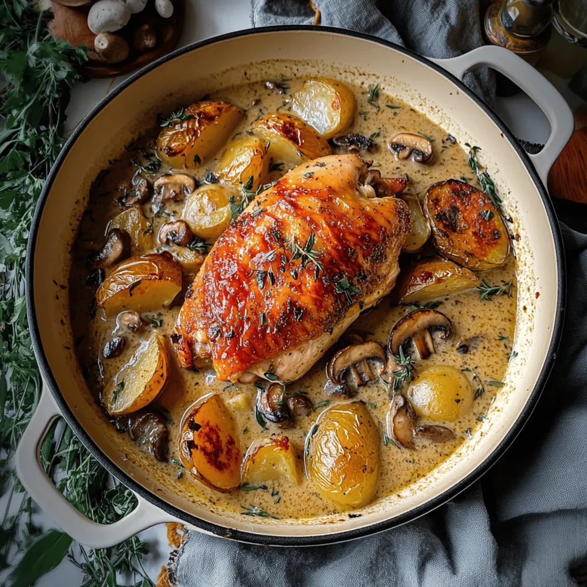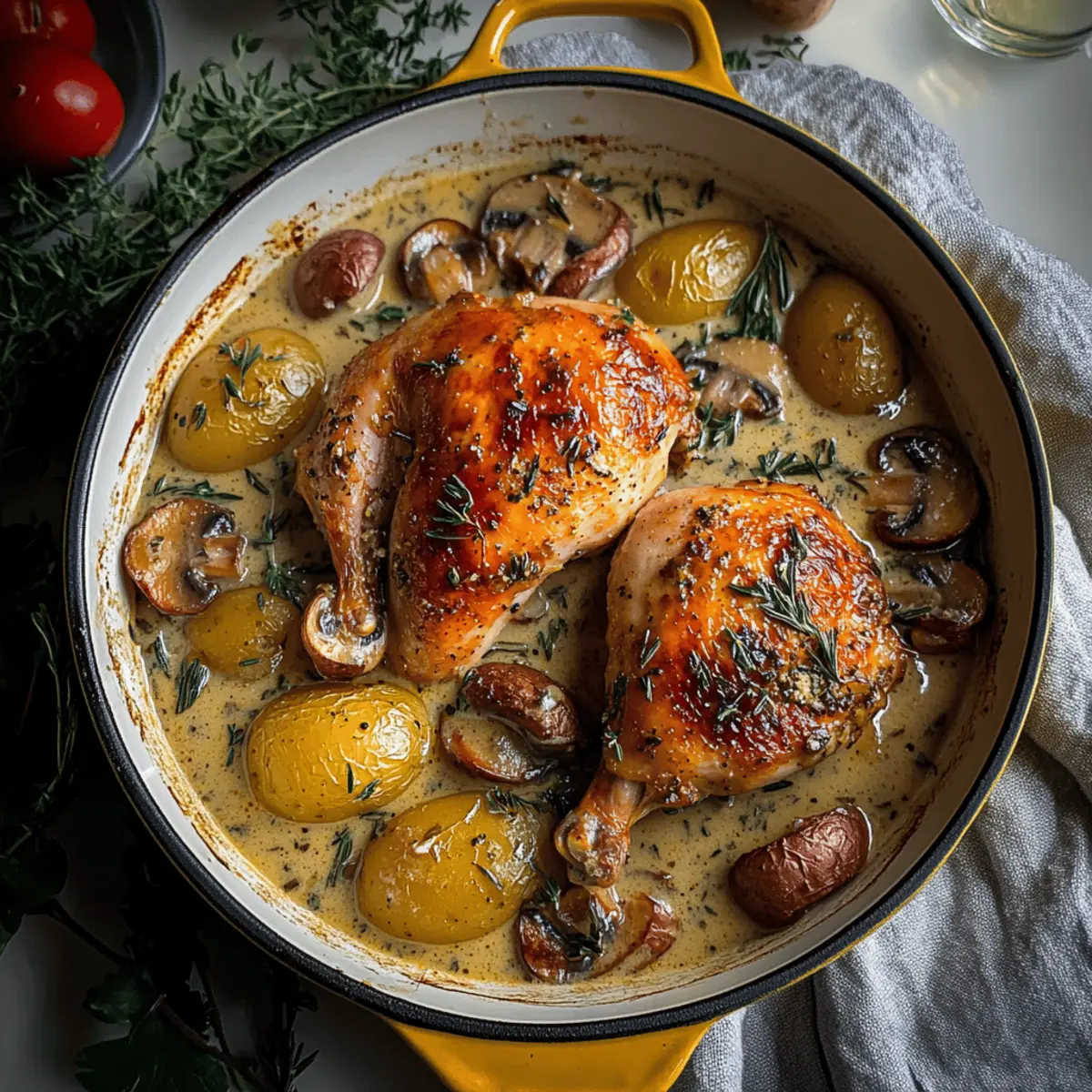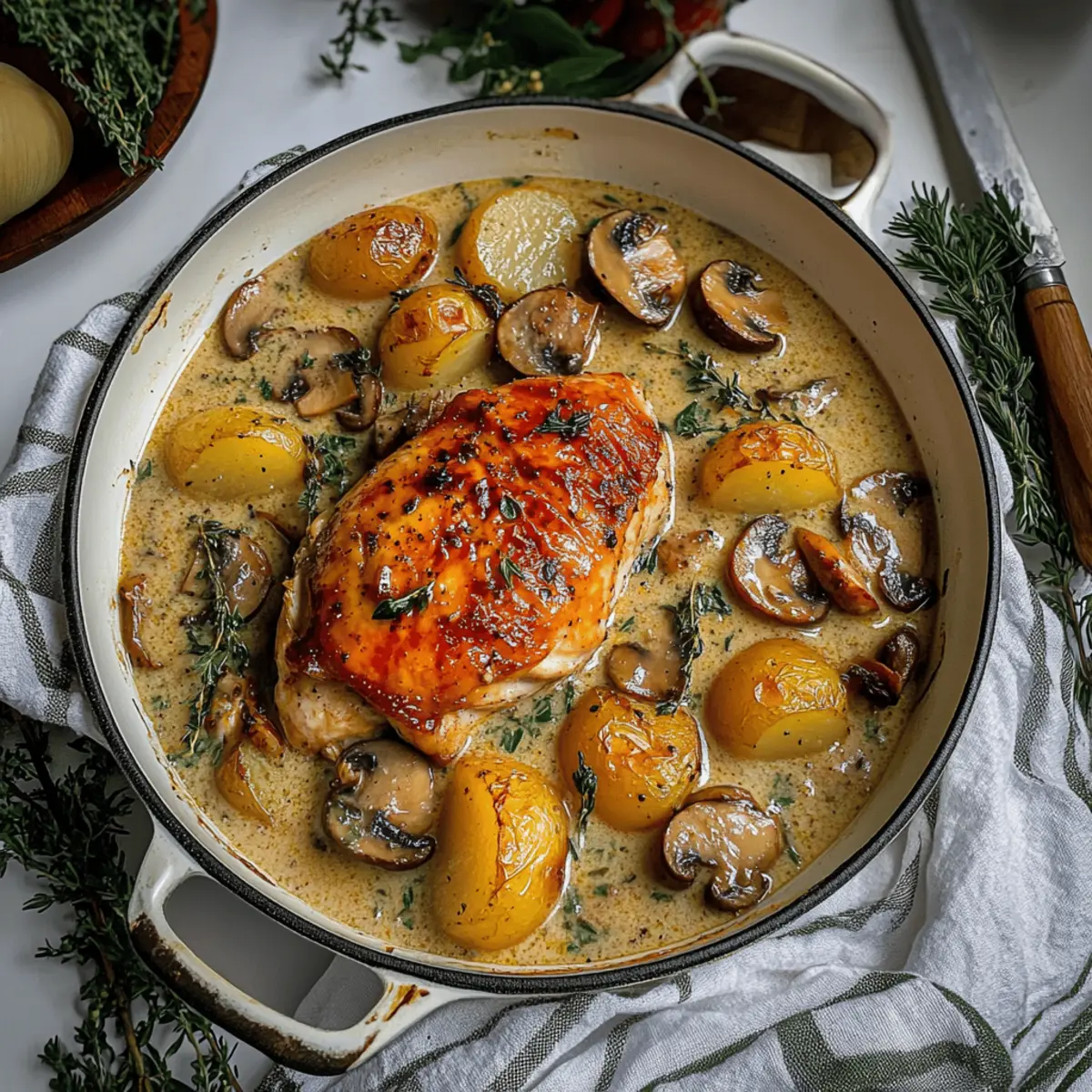 Jump to Recipe Print RecipeIn the midst of a busy week, there’s nothing quite like the comforting aroma of Herb Roasted Chicken in Creamy White Wine Sauce wafting through my kitchen. This dish captures my heart with its golden, crispy-skinned chicken nestled on a bed of tender potatoes, all enveloped in a rich, creamy sauce loaded with fragrant herbs and savory mushrooms. Not only is it perfect for weeknight dinners, but it also transforms any holiday gathering into a cozy celebration filled with warmth and flavor. With a quick prep time and a crowd-pleasing finish, this meal effortlessly balances sophistication and comfort, making it a staple in my recipe collection. Ready to embark on a culinary journey that will leave your family asking for seconds? Let’s dive into the delights of this wholesome creation! Why is this chicken recipe irresistible? Comforting and Elegant: The Herb Roasted Chicken in Creamy White Wine Sauce delivers both a cozy vibe for casual dinners and an upscale flair for special occasions. Easy Prep: With simple steps, you can whip it up even on your busiest days. Customizable Flavors: Feel free to adapt the ingredients, like using seasonal veggies or dairy-free alternatives, making it perfect for any dietary preference. Crowd Pleaser: Its rich, savory flavor will have your family and friends raving, alongside a side of Pumpkin Soup for a complete meal. One-Pot Wonder: Roast everything together for minimal cleanup, leaving you more time to enjoy the company at the table! Herb Roasted Chicken in Creamy White Wine Sauce Ingredients For the Chicken • Bone-in, skin-on chicken cuts – Ensure moisture and flavor by using these cuts; skin-on chicken breasts or thighs are great substitutions. For the Sauce • Butter – Adds richness; substitute with olive oil for a lighter version. • Mushrooms – Use brown mushrooms for depth; cremini or wild mushrooms work well too. • Shallots – Provides a mild onion flavor; yellow onions can be a substitute if needed. • Celery – Adds freshness and depth; optional, but highly recommended for added flavor. • Garlic – Infuses delightful aroma and flavor; adjust the amount to your preference. • Herbs (Sage & Parsley) – Offer earthy notes; alternatively, rosemary or thyme may enhance your dish. • Flour – Necessary for thickening the sauce; cornstarch can be used as a gluten-free option. • White Wine – Opt for a dry wine like Sauvignon Blanc; for an alcohol-free twist, combine chicken stock with lemon juice. • Chicken Stock – Provides a flavorful base; vegetable stock is a suitable alternative. • Cream – For that luxurious richness; consider half-and-half or dairy-free alternatives if desired. For the Veggies • Baby Potatoes – Adds heartiness to the dish; swap with butternut squash or parsnips for tasty variations. This Herb Roasted Chicken in Creamy White Wine Sauce is destined to become a favorite. Its rewarding flavors and comforting aroma make any dinner a celebration! Step‑by‑Step Instructions for Herb Roasted Chicken in Creamy White Wine Sauce Step 1: Prepare Chicken Begin by patting the bone-in, skin-on chicken cuts dry using paper towels, ensuring the skin gets crispy. Season generously with salt and pepper on all sides. This step is essential for enhancing the overall flavor of your Herb Roasted Chicken in Creamy White Wine Sauce. Step 2: Brown Chicken In a large Dutch oven, melt a couple of tablespoons of butter over medium heat. Once the butter is sizzling, add the chicken pieces skin-side down and sear for about 3-5 minutes until golden brown. Flip each piece and brown the other side for an additional 3-5 minutes. Remove the chicken and set aside on a plate. Step 3: Sauté Vegetables In the same pot, add chopped mushrooms, minced shallots, diced celery, and minced garlic. Sauté these veggies for about 7 minutes until the mushrooms are softened and the shallots are translucent. Stir frequently, allowing the flavors to meld beautifully; it’s all part of the magic of the Herb Roasted Chicken in Creamy White Wine Sauce. Step 4: Create Sauce Sprinkle flour over the sautéed vegetables, stirring well to combine. Pour in the dry white wine, scraping the browned bits from the bottom of the pot to deglaze. Gradually add chicken stock while stirring continuously, allowing the sauce to thicken, which should take about 5 minutes. The sauce will become rich and creamy, ideal for the upcoming chicken. Step 5: Combine and Bake Stir in the baby potatoes, ensuring they are well-coated with the sauce. Return the browned chicken pieces to the pot, nestling them among the potatoes. Cover the pot and roast in a preheated oven at 375°F for 40-45 minutes, or until the chicken reaches an internal temperature of 165°F and is juicy. Step 6: Finish Sauce Once roasted, carefully remove the pot from the oven. Stir in the cream, allowing its richness to enhance the sauce. Cover the pot again and let it rest for about 10 minutes. This resting time enriches the flavors, making your Herb Roasted Chicken in Creamy White Wine Sauce even more delightful. Step 7: Serve Finally, ladle out servings of the succulent chicken, tender potatoes, and luscious creamy sauce onto warm plates. This comforting dish is best enjoyed immediately, perfect for family dinners or special occasions, bringing warmth and satisfaction to your table. Make Ahead Options These Herb Roasted Chicken in Creamy White Wine Sauce options are perfect for busy home cooks looking to save time without sacrificing flavor! You can prepare the chicken by seasoning it and browning it up to 24 hours in advance; simply refrigerate it after cooking. Additionally, chop the vegetables (mushrooms, shallots, celery, and garlic) and store them in an airtight container for up to 3 days. When you’re ready to serve, just combine the prepped ingredients in the pot as instructed, simmer, and finish by stirring in the cream. This way, you ensure a delicious and comf