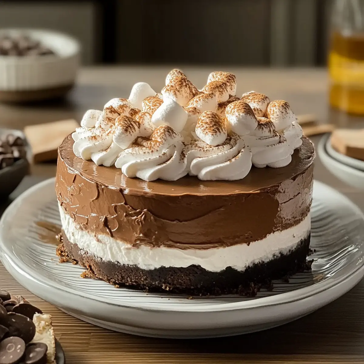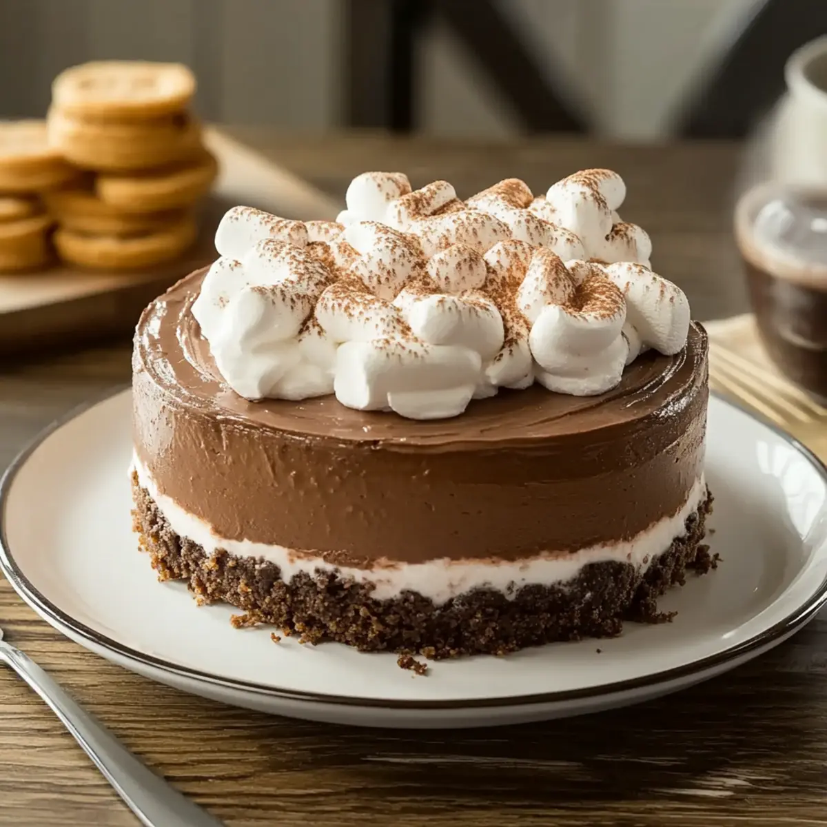 Jump to Recipe Print RecipeAs I stood in my kitchen last winter, the familiar aroma of warm chocolate enveloped me like a cozy hug. That’s when inspiration struck for my Hot Cocoa Cheesecake with Marshmallow Whipped Cream, a dessert that captures the essence of chilly evenings and festive gatherings. This rich and creamy cheesecake features a decadent chocolate cookie crust and a fluffy marshmallow topping, perfect for satisfying your sweet tooth without all the fuss. Not only is it impressively easy to whip up, but it’s also an interactive treat that invites everyone to indulge. Imagine serving this delightful comfort dessert at your next get-together; it’s sure to leave your guests smiling and asking for seconds. Are you ready to make winter a little sweeter? Why is Hot Cocoa Cheesecake Irresistible? Decadent Delight: This cheesecake blends the nostalgia of hot cocoa with creamy cheesecake, creating a flavor that’s rich yet comforting. Effortless Preparation: With simple ingredients and straightforward steps, even novice bakers can impress with this dessert. Interactive Appeal: Elevate your serving experience by offering toppings like mini marshmallows and chocolate shavings—perfect for engaging guests as seen in our Churro Cheesecake Indulge. Versatile Variations: Add a twist with peppermint or caramel; the possibilities are as delightful as our Fruity Pebbles Cheesecake! Holiday Favorite: This cheesecake embodies the holiday spirit, making it a delightful centerpiece at your festive gatherings. Stress-Free Storage: Leftovers can easily be stored, ensuring the sweetness lasts well beyond the first serving. Hot Cocoa Cheesecake Ingredients • Dive into the rich flavors of Hot Cocoa Cheesecake with Marshmallow Whipped Cream with these essential ingredients! For the Cheesecake Filling Cream Cheese – Provides creaminess and structure; low-fat cream cheese can be used for a lighter alternative. Granulated Sugar – Adds sweetness; consider a sugar substitute for a lower-sugar option. Eggs – Binds ingredients and gives structure; no egg replacement needed in this recipe. Sour Cream – Enhances creaminess with a slight tang; Greek yogurt is a healthy substitute. Unsweetened Cocoa Powder – Infuses rich chocolate flavor; Dutch-processed cocoa offers a unique twist. Chocolate Cookie Crumbs – Forms the crust; alternatively, a pre-made chocolate crust saves time. For the Marshmallow Whipped Cream Topping Marshmallow Fluff – Adds sweetness and fluffiness to the topping; can be swapped with a mix of heavy cream and sugar for freshness. Heavy Whipping Cream – Creates the light, airy marshmallow whipped cream; lower-fat alternatives are available. Embrace the cozy joy of creating this mouthwatering dessert with these ingredients that promise warmth and sweetness! Step‑by‑Step Instructions for Hot Cocoa Cheesecake with Marshmallow Whipped Cream Step 1: Preheat and Prepare Preheat your oven to 325°F (160°C) while you prepare a springform pan lined with parchment paper. To prevent cracking, create a water bath by wrapping the bottom of the pan with aluminum foil. This will ensure a smooth and creamy texture for your hot cocoa cheesecake. Step 2: Blend the Cream Cheese Mixture In a large mixing bowl, beat 16 oz of cream cheese and 1 cup of granulated sugar using an electric mixer on medium speed until smooth and creamy. Add in the eggs, one at a time, mixing well after each addition. The mixture should be velvety with no lumps, showcasing a lovely creaminess. Step 3: Add the Sour Cream, Cocoa, and Crust Gently incorporate ½ cup of sour cream, ½ cup of unsweetened cocoa powder, and 1 cup of chocolate cookie crumbs into the cream cheese mixture. Stir until fully combined and smooth, ensuring that no dry ingredients remain visible. This rich mixture embodies the flavors of hot cocoa and will form the filling for your cheesecake. Step 4: Pour and Smooth Carefully pour the cheesecake filling into the prepared crust, smoothing the top with a spatula for an even surface. Place the springform pan in the preheated oven inside the water bath. Bake for 45-50 minutes, or until the center is just set—meaning it should slightly jiggle, similar to jello. Step 5: Cool and Chill Once baked, turn off the oven and crack the door open, allowing the cheesecake to cool gradually for about an hour. Afterward, let it cool completely at room temperature before covering it and refrigerating for at least 4 hours or overnight. This cooling period helps enhance the flavors of your hot cocoa cheesecake. Step 6: Whip the Cream For the marshmallow whipped cream topping, use a clean mixing bowl to whip 1 cup of heavy whipping cream on medium-high speed until soft peaks form. Carefully fold in 1 cup of marshmallow fluff until fully combined, creating a light and fluffy texture that perfectly complements the rich cheesecake. Step 7: Top and Serve Once your hot cocoa cheesecake is thoroughly chilled, gently spread the marshmallow whipped cream on top, ensuring an even layer. You can garnish it with chocolate shavings or mini marshmallows for extra flair. Slice your cheesecake and serve it as a delightful centerpiece for your next gathering! Hot Cocoa Cheesecake with Marshmallow Whipped Cream Variations Feel free to get creative and customize your cheesecake with these enticing variations that spark joy with every bite! Peppermint Twist: Add ½ teaspoon of peppermint extract for a spirited holiday flavor. It’s like a warm hug on a cold winter’s night! Caramel Delight: Swirl in ½ cup of caramel sauce into your filling before baking for a luscious salted caramel flavor. Everyone loves a surprise twist in their dessert! Nutty Addition: Toss in ½ cup of finely chopped toasted pecans to the crust for an added crunch. This little change creates a delightful texture contrast. Chocolate Chips: Stir in ½ cup of mini chocolate chips to the filling for extra chocolatey goodness that oozes with every forkful. Wh