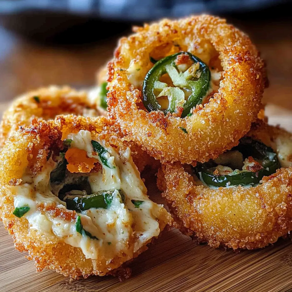Jump to Recipe Print RecipeScrolling through my social feed, I stumbled upon a delicious twist on a classic favorite: Jalapeño Popper Stuffed Onion Rings. Just the idea of this crispy, cheesy concoction made my mouth water! Imagine sinking your teeth into a flaky, golden onion ring, only to discover a luscious filling of cream cheese, sharp cheddar, and zesty jalapeños nestled inside. These irresistible snacks not only deliver a satisfying crunch but are also a fantastic party pleaser that can easily be whipped up for game day or an intimate gathering. Plus, you can customize them to your heart’s content, playing with different cheeses and spices. So, are you ready to elevate your snack game with this scrumptious recipe? Why You’ll Love This Recipe Irresistible Crunch: Each bite delivers a delightful crunch from the crispy onion ring exterior. Cheesy Goodness: The combination of cream cheese and sharp cheddar creates a decadent, creamy filling that perfectly complements the spice of the jalapeños. Perfect Party Snack: Great for gatherings, these Jalapeño Popper Stuffed Onion Rings are sure to impress friends and family, making them a go-to for game days or celebrations. Endless Customization: Feel free to swap ingredients! Want to get a little spicy? Try using pepper jack cheese. Prefer to skip the meat? Just omit bacon for a vegetarian delight. Time-Saving Option: If you’re short on time, these can be prepared ahead and fried just before serving. They are also easy to reheat in the oven, ensuring that crispy texture returns. Elevate your appetizer game with these tasty treats, and don’t forget to check out Lemon Pizza Refreshing for another delightful recipe to impress your guests! Jalapeño Popper Stuffed Onion Rings Ingredients • Dive into the delightful world of Jalapeño Popper Stuffed Onion Rings with these essential ingredients! For the Rings Large Yellow or Sweet Onions – Choose thicker slices to support the filling better while frying. For the Filling Cream Cheese (8 oz, softened) – Provides a creamy base; low-fat options work well here, too! Shredded Sharp Cheddar (1 cup) – Adds a rich, sharp flavor; try pepper jack for an extra kick! Jalapeños (1–2, finely diced, seeded for mildness) – Infuses the filling with spice; adjust quantity based on your heat preference. For Breading and Coating All-Purpose Flour (½ cup) – Helps breading stick nicely; opt for gluten-free flour if desired. Eggs (2, beaten) – Essential for adhering the breadcrumbs; substitute with a flax egg for a vegan twist! Seasoned Breadcrumbs or Panko (1½ cups) – Offers a crunchy coating; double coating is recommended for extra crispiness. For Frying Oil for Frying – Vegetable or canola oil works best; an air fryer can be used for a healthier option. Optional Add-ins Bacon Bits (¼ cup) – Gives a smoky flavor; feel free to leave this out for a meatless variation! Garlic Powder (½ tsp) – Enhances the flavor profile for a satisfying taste. Chopped Scallions (2 tbsp) – Adds a fresh note to the filling, elevating every bite. Gather these ingredients and prepare to impress with your homemade Jalapeño Popper Stuffed Onion Rings! Step‑by‑Step Instructions for Jalapeño Popper Stuffed Onion Rings Step 1: Prep Onions Begin by slicing large yellow or sweet onions into thick ½-inch rings, then carefully separate them into sturdy layers. Make sure to select the thicker outer layers for your Jalapeño Popper Stuffed Onion Rings, as they will hold up better against the filling during frying. Set aside while you prepare the filling. Step 2: Make Filling In a mixing bowl, combine 8 ounces of softened cream cheese, 1 cup of shredded sharp cheddar, and 1 to 2 finely diced jalapeños, adjusting based on your desired spice level. If you’re feeling adventurous, mix in optional ingredients like bacon bits or garlic powder. Chill this flavorful filling in the fridge for about 10 minutes to make it easier to handle. Step 3: Stuff Rings Take each onion ring and use a piping bag or a spoon to fill it generously with the creamy jalapeño mixture. Smooth the edges to ensure an even layer of filling throughout your Jalapeño Popper Stuffed Onion Rings. Repeat this process until all your rings are filled, creating a delicious surprise hidden within. Step 4: Freeze Place the stuffed onion rings on a parchment-lined tray in a single layer. Freeze the rings for 20 to 30 minutes until they firm up, which will help them maintain their shape during frying. This crucial step ensures that your Jalapeño Popper Stuffed Onion Rings come out perfectly shaped and hold their cheesy filling beautifully. Step 5: Bread Rings Once frozen, set up a breading station: one bowl for ½ cup all-purpose flour, another for 2 beaten eggs, and a third for 1½ cups of seasoned breadcrumbs or panko. Dredge each ring in flour, dip it into egg, and coat it with breadcrumbs. For extra crunch, repeat the egg and breadcrumb process for your respective Jalapeño Popper Stuffed Onion Rings. Step 6: Fry Heat vegetable or canola oil in a deep skillet or frying pan to 350°F (175°C). Working in batches, gently place the breaded onion rings into the hot oil and fry for 2 to 3 minutes on each side. They should turn a beautiful golden brown and become crispy; keep an eye on them to prevent burning. Step 7: Drain & Serve After frying, use a slotted spoon to transfer your Jalapeño Popper Stuffed Onion Rings onto a paper towel-lined plate to drain any excess oil. Serve them hot alongside your favorite dipping sauces, such as ranch, chipotle mayo, or salsa, and enjoy the delightful crunch and savory goodness! Make Ahead Options These Jalapeño Popper Stuffed Onion Rings are perfect for meal prep, allowing you to enjoy crispy, cheesy goodness with less hassle during busy weeknights. You can prepare the stuffed onion rings up to 24 hours in advance by following the initial steps of slicing the onions and making the filling, then stuff the r