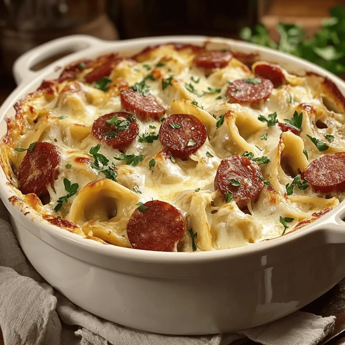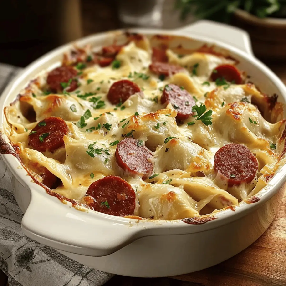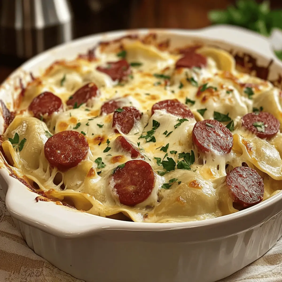 Jump to Recipe Print RecipeAs I stirred the bubbling mixture in my oven-safe dish, the aroma of smoky kielbasa filled the kitchen, instantly transporting me to family gatherings of my childhood. This Hearty Kielbasa and Pierogi Bake is more than just a meal; it’s a comforting one-dish wonder that turns any weeknight into a cozy occasion. Not only is it adaptable to suit various dietary preferences—so even vegetarians can indulge—but it also promises a quick prep that leaves you with more time to savor every bite. Imagine creamy, cheesy pierogies nestled among caramelized onions and savory sausage, all topped with a golden, melty finish. Doesn’t that sound like the perfect meal to bring your loved ones together? Why is this dish a must-try? Comforting and Satisfying: This Kielbasa and Pierogi Bake is the epitome of comfort food, perfect for warming up chilly evenings. Versatile Options: Easily swap out kielbasa for vegetarian sausage or mushrooms, ensuring everyone can enjoy it. Quick Prep Time: From stovetop to oven, you’re only 15 minutes away from a hearty, delicious dinner! Crowd-Pleasing Flavor: Mouthwatering layers of creamy, cheesy pierogies mixed with savory kielbasa are bound to impress family and friends alike. Easy Clean-Up: One-dish cooking means less mess to tackle after dinner—just savor the compliments and the flavorful bites! If you love this fusion of flavors, check out my delightful Chicken Mac Cheese for another easy-going favorite. Kielbasa and Pierogi Bake Ingredients For the Bake Kielbasa – Adds a smoky flavor and protein; substitute with vegetarian sausage or sautéed mushrooms for a vegetarian twist. Frozen Pierogies – Provides a creamy potato and cheese filling with minimal prep time; fresh pierogies work wonderfully if available. Sour Cream – Creates a tangy sauce base; use low-fat variants for a lighter dish. Cream Cheese – Adds rich creaminess to the sauce; ensure it’s softened for easier mixing. Onions – Caramelized for a touch of sweetness and extra depth; consider leeks or shallots for a fun change. Cheddar Cheese – Topped for that melty, salty finish; smoked gouda or Monterey Jack can be delightful alternatives. For Garnish Parsley – Adds freshness and vibrant color to the final dish; swap it for chives or green onions for a different flair. This Kielbasa and Pierogi Bake is sure to please a crowd, whether it’s a busy weeknight dinner or a cozy family gathering! Step‑by‑Step Instructions for Kielbasa and Pierogi Bake Step 1: Preheat the Oven Begin by preheating your oven to 375°F (190°C). This is essential to ensure that the Kielbasa and Pierogi Bake cooks evenly. While the oven is warming up, prepare your ingredients so everything is ready for the delicious layers to come. Step 2: Cook the Kielbasa and Onions In a large skillet over medium heat, add a touch of oil and the sliced kielbasa. Cook for about 5–7 minutes until browned and crispy, stirring occasionally. Add the chopped onions and continue cooking for an additional 5–6 minutes until they are caramelized and golden. This step will enrich the flavors of your dish considerably. Step 3: Make the Creamy Sauce In a mixing bowl, combine the sour cream and softened cream cheese. Mix until smooth and well blended, ensuring there are no lumps for a perfectly creamy texture. This luscious sauce will be the glue that holds your Kielbasa and Pierogi Bake together, adding rich flavor. Step 4: Layer the Ingredients In a greased 9×13-inch baking dish, start layering the dish by placing half of the frozen pierogies at the bottom. Next, evenly distribute half of the kielbasa and onion mixture over the pierogies, followed by half of the cheddar cheese. Repeat this layering process with the remaining ingredients for a hearty, satisfying bake. Step 5: Add the Creamy Sauce Once your layers are complete, pour the creamy sauce evenly over the top, ensuring it covers everything without leaving any dry spots. This will help create the beautiful, bubbly finish as the Kielbasa and Pierogi Bake cooks in the oven. Step 6: Bake the Dish Cover the baking dish with aluminum foil to prevent the cheese from burning. Place it in the preheated oven and bake for 25–30 minutes, or until everything is heated through and bubbling. Keep an eye on it—this comforting dish should look golden and inviting as the time ticks down. Step 7: Broil for a Crispy Finish When baking time is complete, carefully remove the foil and sprinkle the remaining cheese on top. Broil on high for an additional 2–3 minutes, watching closely until the cheese is melted and just turns golden brown. This step adds a delightful crunch and an inviting shine to your Kielbasa and Pierogi Bake. Step 8: Garnish and Serve Once you’ve achieved that lovely golden color, remove the baking dish from the oven. Allow it to cool for a few minutes, then generously garnish with freshly chopped parsley for a pop of color and flavor. Your Kielbasa and Pierogi Bake is now ready to serve—enjoy this comforting dish with your family and friends! What to Serve with Kielbasa and Pierogi Bake To truly elevate your Kielbasa and Pierogi Bake into an unforgettable meal, consider these delightful pairings that bring flavor, texture, and balance to the table. Fresh Green Salad: A crisp, refreshing green salad with a light vinaigrette provides a vibrant contrast to the creamy bake, adding crunch and brightness. Roasted Brussels Sprouts: These caramelized bites add a nutty flavor that pairs beautifully, enhancing the dish’s complexity while remaining simple to prepare. Garlic Bread: A warm, buttery garlic bread brings a satisfying crunch and makes the perfect vehicle for scooping up those rich, creamy layers. Steamed Broccoli: Lightly steamed broccoli not only adds nutrition but its fresh flavor counterbalances the richness of the dish, creating a colorful plate. Mashed Potatoes: Silky creamy mashed potatoes offer a comforting addition, soaking up