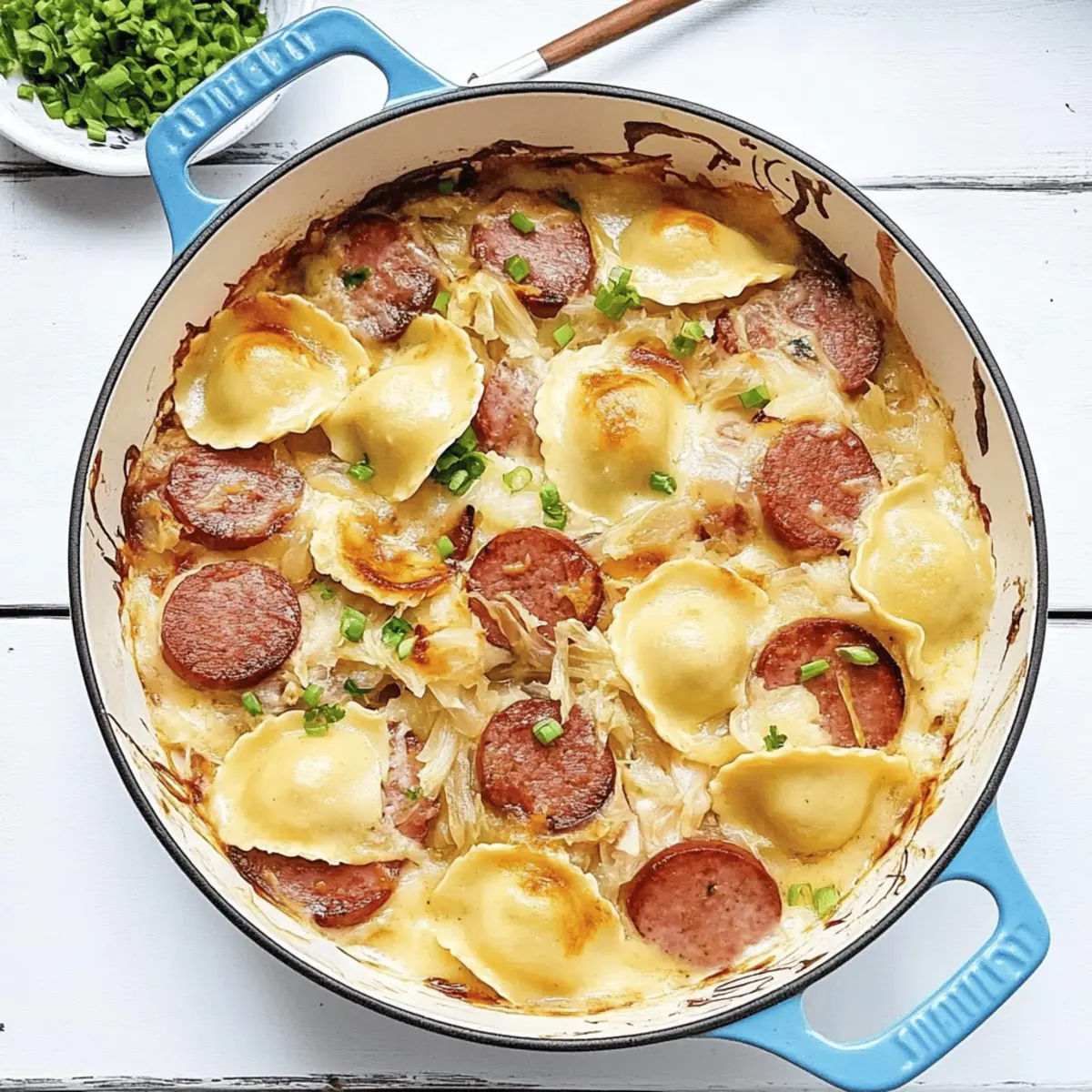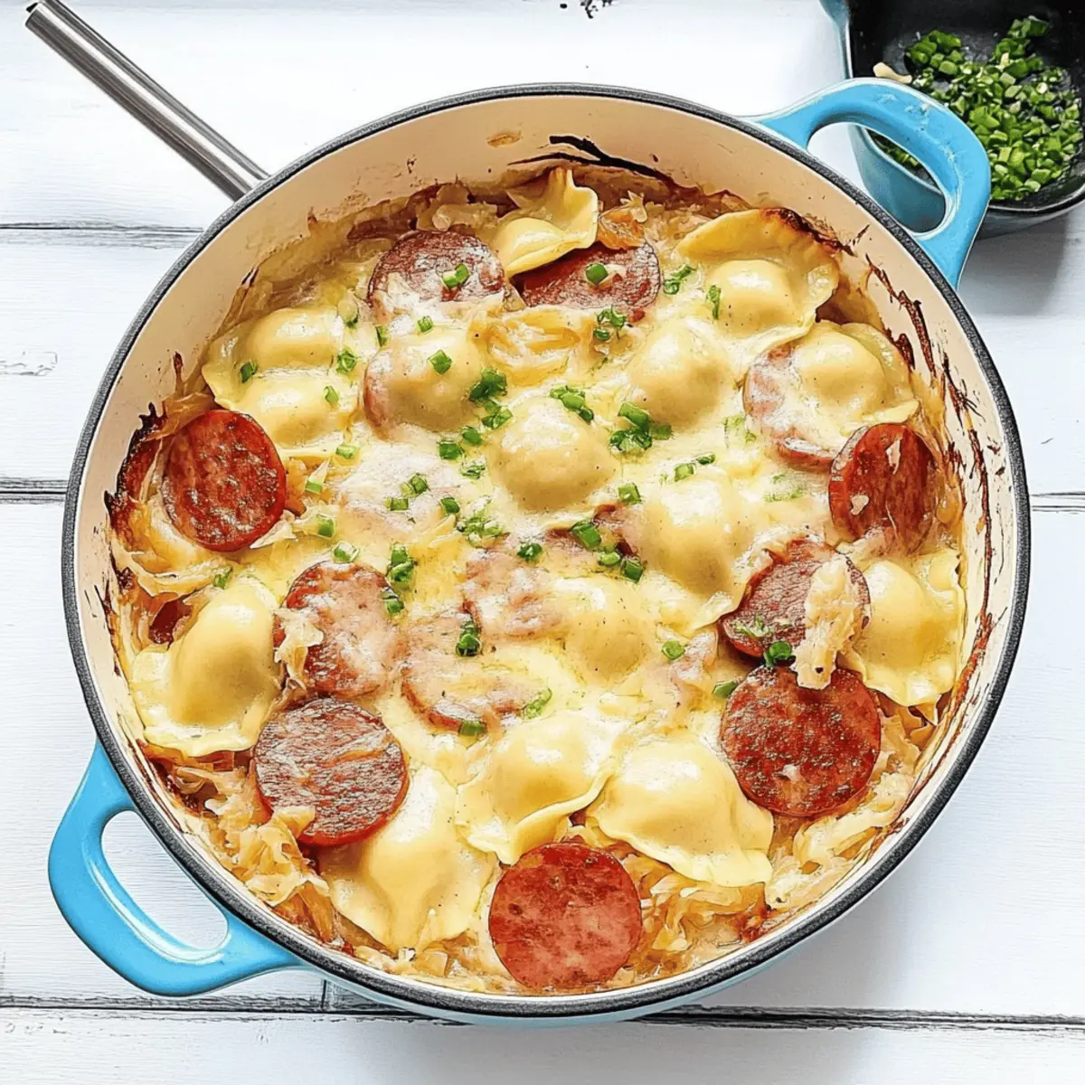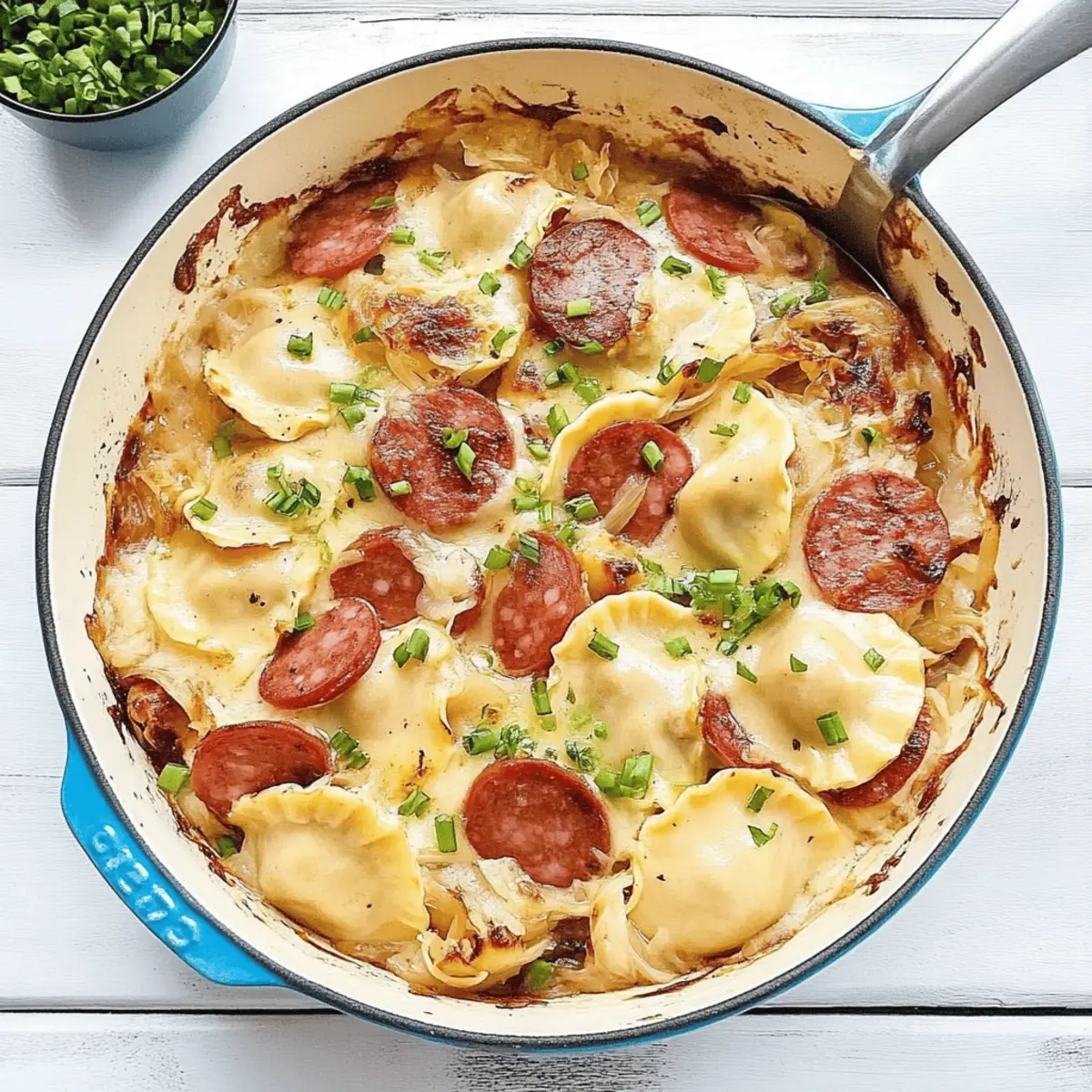 Jump to Recipe Print RecipeThere’s a subtle magic that happens when you bring the flavors of Eastern Europe into your kitchen. This Kielbasa, Pierogies & Sauerkraut Bake is a heartwarming dish that evokes memories of family gatherings and cozy dinners. Imagine biting into tender pierogies nestled among flavorful Polish kielbasa and zesty sauerkraut, all topped with gooey, melted cheese. Not only is this one-pan wonder a quick and easy comfort food solution, but it’s perfect for serving a crowd—everyone will gather around for seconds! Whether you opt for the stovetop method or grab your pressure cooker, you’ll find that this recipe easily adapts to your busy lifestyle. Ready to dive into a culinary experience that warms the soul? Let’s get you started on this delicious journey! Why is this recipe a must-try? Simplicity at your fingertips: Prepare this comfort food in just one pan! Versatile cooking methods: Choose between stovetop or pressure cooker to suit your schedule. Flavors that comfort: The combination of kielbasa, pierogies, and sauerkraut creates an irresistible hearty dish. Crowd pleaser: Perfect for family gatherings, everyone will love the melty cheese and vibrant flavors! Quick prep time: Get a delicious homemade meal on the table without fuss—ideal for busy weeknights. Elevate your comfort food game with our Kielbasa, Pierogies & Sauerkraut Bake, and consider pairing it with a side of crusty bread or maybe even a simple salad to complete your meal. Kielbasa, Pierogies and Sauerkraut Bake Ingredients For the Bake • Sauerkraut – Provides tanginess and moisture; fresh cabbage sautéed with vinegar is a great alternative. • Canola Oil – Used for frying the Kielbasa; olive oil can be substituted for a different flavor. • Polish Kielbasa Sausage – The main protein, offering rich, smoky flavors; any smoked sausage or turkey sausage works well too. • Onion – Adds sweetness and depth; shallots are a milder substitute. • Salt & Pepper – Essential seasonings that elevate flavor; adjust to taste for preference. • Caraway Seeds – Infuse a unique earthiness; fennel seeds can be used for a different flavor profile. • Stone-ground Mustard – Delivers a sharp tang; Dijon mustard is a convenient substitute if needed. • Chicken Stock or Beer – Moistens the dish and enhances depth; vegetable broth can lighten it up. • Frozen Potato and Cheese Filled Pierogies – Adds heartiness and texture; fresh pierogies can be substituted if available. • Grated White Cheddar Cheese – Melts beautifully, enriching the dish; Monterey Jack can be swapped for a different melt. • Grated Swiss Cheese – Provides a nutty flavor; Gruyère makes for a heartier alternative. • Chopped Scallions – Fresh garnish that brightens the dish; chives create a milder onion essence. Indulge in the incredible flavors of this Kielbasa, Pierogies & Sauerkraut Bake and enjoy the ease of prepping a beloved family favorite! Step‑by‑Step Instructions for Kielbasa, Pierogies and Sauerkraut Bake Step 1: Preheat Your Oven Begin by preheating your oven to 350°F (175°C). This step ensures your Kielbasa, Pierogies, and Sauerkraut Bake cooks evenly and reaches the perfect gooey cheese consistency. If you’re opting for the pressure cooker method, prepare that according to the manufacturer’s instructions while you gather your ingredients. Step 2: Prepare the Sauerkraut Drain the sauerkraut thoroughly, reserving about half a cup of its liquid. Set aside the drained sauerkraut in a bowl. This will keep the dish light and flavorful while preventing excess moisture, allowing the flavors of the Kielbasa and pierogies to shine through in your comforting bake. Step 3: Brown the Kielbasa In an oven-proof skillet or pressure cooker, heat a couple of tablespoons of canola oil over medium heat. Add the Kielbasa slices and cook for about 5-7 minutes, flipping them occasionally, until they are nicely browned on both sides. Once browned, remove the Kielbasa from the pan and set it aside on a plate, letting it rest while you sauté the onions. Step 4: Sauté the Onions In the same skillet, add diced onions and sauté for 3-5 minutes until they become translucent and start to caramelize. The leftover oil and flavors from the Kielbasa will infuse the onions, enhancing the overall taste of your Kielbasa, Pierogies, and Sauerkraut Bake – a delightful medley of comforting flavors. Step 5: Combine Sauerkraut and Spices Stir in the drained sauerkraut and caraway seeds to the skillet with the onions. Cook for another 3-4 minutes, allowing the sauerkraut to warm through and mingle with the onions. You’ll notice an aromatic tanginess that will set the stage for your scrumptious bake, perfectly complementing the Kielbasa. Step 6: Add the Liquids Pour in the reserved sauerkraut liquid along with the chicken stock or beer and stone-ground mustard. Stir well to combine and bring the mixture to a gentle boil. This will help to deglaze any bits stuck to the bottom of the pan, enhancing the flavors of your dish. Step 7: Mix in the Kielbasa Return the browned Kielbasa to the skillet, ensuring it’s nestled amongst the sauerkraut mixture. Let everything simmer together for an additional 2-3 minutes to allow the flavors to meld beautifully. Your Kielbasa, Pierogies, and Sauerkraut Bake is well on its way to being a hearty masterpiece! Step 8: Add the Pierogies Gently nestle the frozen pierogies into the sauerkraut mixture, spreading them out evenly. Carefully submerge a few into the liquid, ensuring they will cook through during baking. Allow the mixture to simmer for about 5 minutes, melding all those rich flavors – your comforting bake is coming together! Step 9: Top with Cheeses Sprinkle the grated white cheddar and Swiss cheese evenly over the top of the dish. This cheesy layer will melt into a luscious blanket, making your Kielbasa, Pierogies and Sauerkraut Bake even more irresistible. Step 10: Bake to 