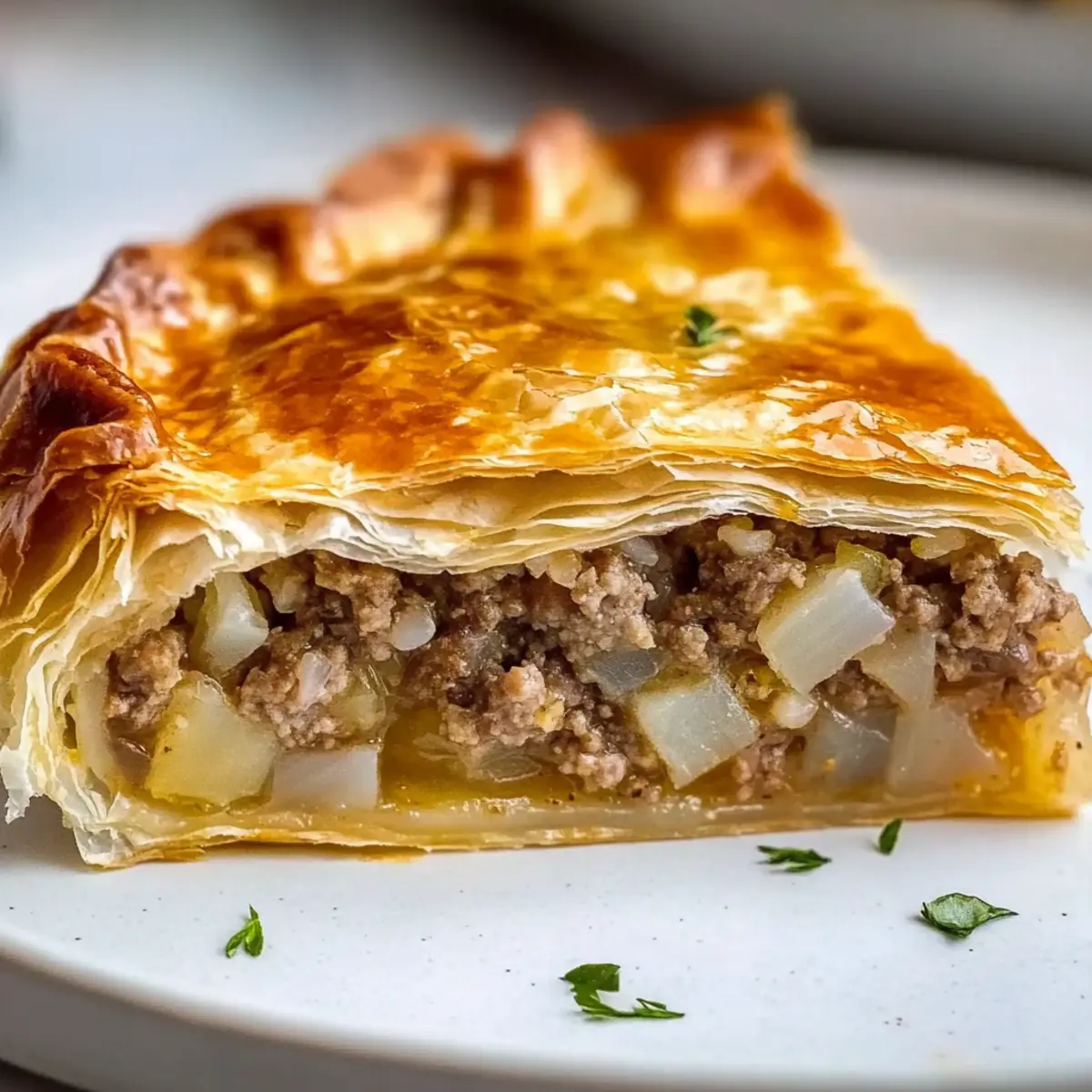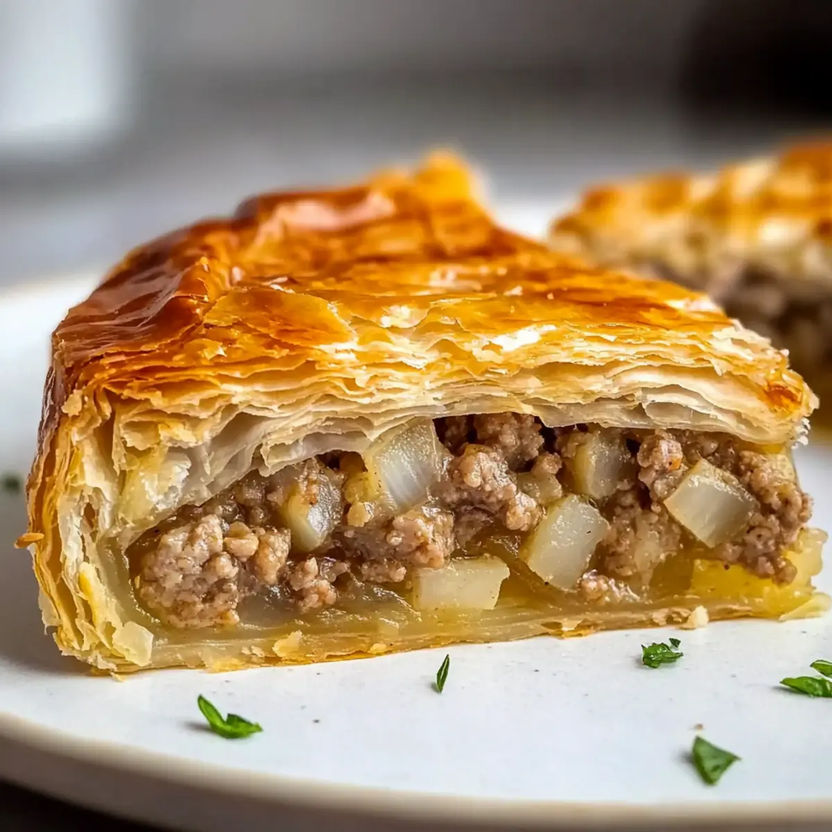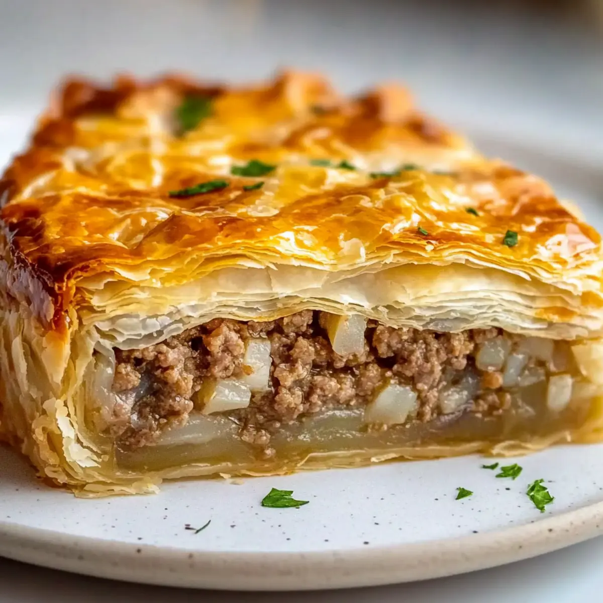Jump to Recipe Print RecipeAs I pulled the golden-brown Kreatopita from the oven, the aroma enveloped my kitchen, transporting me to the sun-soaked streets of Greece. This delightful Greek meat pie, filled with seasoned ground beef and rice, has become one of my go-to comfort foods—perfect for cozy family dinners or an elegant gathering with friends. What I love most about this savory Kreatopita is how easily it comes together, making it a hassle-free option for any night of the week. Plus, each bite offers a satisfying crunch from the flaky phyllo dough, wrapping up a hearty filling that feels both comforting and gourmet. Curious about how to make this Mediterranean masterpiece for your next meal? Let’s dive in! Why is Kreatopita a must-try? Comforting, hearty filling: The blend of seasoned ground beef and tender rice creates an irresistible center that warms the soul. Flaky layers: The use of phyllo dough ensures a delightful crunch, making each bite a textural delight. Quick to prepare: With straightforward steps, you can whip this dish up on a busy weeknight without breaking a sweat. Versatile variations: Easily adapt the recipe by swapping meats or introducing veggies, allowing for endless creativity. Impressive presentation: Serve it hot from the oven to impress friends at any gathering, adding a touch of Greek charm to your table, alongside a refreshing Greek salad or a dollop of tzatziki. Kreatopita Ingredients For the Filling Ground Beef – Provides protein and richness; you can substitute with ground lamb for a classic touch. Onion – Adds aromatic sweetness and depth; finely chop for the best flavor infusion. Rice – Acts as a binder and filling component; consider using short-grain for a better texture. Tomato Sauce – Adds moisture and enhances flavor; can be replaced with crushed tomatoes for a chunkier filling. Oregano – Provides a classic Mediterranean herb flavor; fresh or dried can be used interchangeably. Salt & Pepper – Essential for seasoning; adjust to taste for a perfectly balanced dish. For the Crust Phyllo Dough – Forms the flaky crust; keep covered to prevent drying out while assembling. Butter or Oil – Used to brush between layers of phyllo for that irresistibly crisp texture; olive oil is a great authentic choice. This savory Kreatopita will surely become a beloved addition to your homemade meals! Step‑by‑Step Instructions for Kreatopita Step 1: Sauté the Aromatics In a large skillet, heat two tablespoons of olive oil over medium heat. Add one finely chopped onion and sauté for about 5 minutes until it becomes translucent and soft. The aroma will fill your kitchen, setting the stage for your savory Kreatopita filling. Step 2: Brown the Ground Beef Once the onion is softened, add 500 grams of ground beef to the skillet. Cook for about 8–10 minutes, stirring occasionally, until the meat is browned and no longer pink. The beef should have a deep, rich color, enhancing the flavor of your Kreatopita. Step 3: Combine Filling Ingredients Stir in 1 cup of uncooked short-grain rice, 1 cup of tomato sauce, a tablespoon of dried oregano, and salt and pepper to taste. Add a splash of water, cover, and let the mixture simmer on low heat for 10 minutes. The rice will absorb the flavors while the mixture thickens, creating a hearty filling. Step 4: Preheat the Oven While the filling simmers, preheat your oven to 180°C (350°F). This ensures that your Kreatopita bakes evenly and achieves that perfect golden-brown crust that we all love. Prepare a 9×13 inch baking dish by brushing it generously with melted butter or olive oil. Step 5: Layer the Phyllo Dough Unwrap the phyllo dough and keep it covered with a damp towel to prevent drying. Start layering five sheets of phyllo in the prepared baking dish, brushing each layer with melted butter or oil. Each brush of butter adds to the flaky texture of your Kreatopita. Step 6: Add the Filling Carefully spoon the beef and rice mixture evenly over the layered phyllo dough, spreading it out to cover the surface. Press it down gently to make an even layer. This filling is the heart of your Kreatopita, promising comfort in every bite. Step 7: Top with More Phyllo Cover the filling with five additional layers of phyllo, again brushing each layer with butter or oil. Make sure to tuck the edges of the phyllo down into the dish to seal in all the deliciousness. This will create a crispy crust that contrasts beautifully with the savory filling beneath. Step 8: Bake the Kreatopita Carefully place the baking dish in the preheated oven and bake for 40 to 45 minutes or until the top is golden brown and crispy. Keep an eye on it as it bakes; the visual cue of deep golden perfection means your Kreatopita is ready to be enjoyed. Step 9: Let it Rest Once baked, remove the Kreatopita from the oven and let it rest for about 10 minutes before slicing. This rest time allows the juices to settle, ensuring that each slice holds together beautifully when served. Step 10: Serve and Enjoy Slice your savory Kreatopita into squares and serve warm. Consider garnishing with fresh parsley and a wedge of lemon for an extra burst of flavor. Enjoy this delightful Greek meat pie with family and friends—it’s a meal that truly warms the heart! Expert Tips for Savory Kreatopita Phyllo Care: Keep phyllo sheets covered with a damp towel while assembling to prevent them from drying out, which could lead to cracking. Moisture Control: Slightly cooking the filling before adding it to the pie reduces moisture, ensuring a crispy crust rather than a soggy one. Fat Management: If using lean ground beef, always drain excess fat after browning to maintain the right texture in your savory Kreatopita. Make-Ahead Magic: Prepare your Kreatopita in advance and refrigerate it before baking. This not only saves time but also enhances the flavors. Check for Doneness: Keep an eye on the baking time; your Kreatopita should be golden brown and crispy for the best