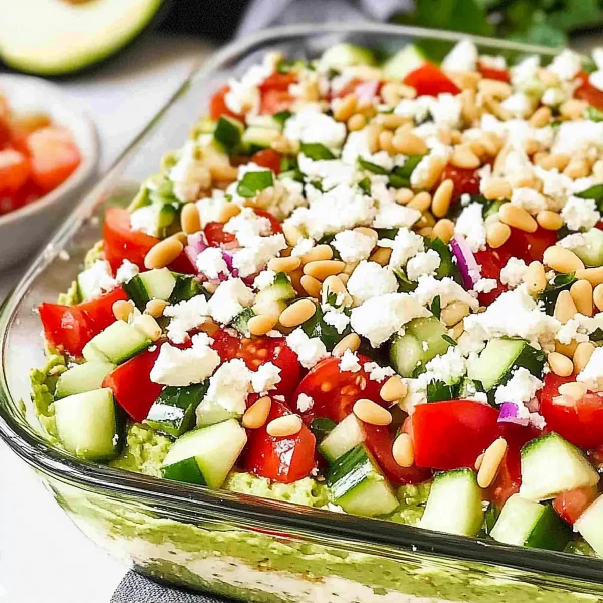 Jump to Recipe Print RecipeAs I arranged my vibrant snack platter one sunny afternoon, a delightful idea sparked—what if I layered all my favorite flavors into one dazzling dish? Enter the Healthy Layered Avocado Dip! This crowd-pleaser brings together rich layers of hummus, creamy avocado, tangy sour cream, and crisp veggies for a mouthwatering Mediterranean masterpiece. Not only is this dip a fantastic addition to any gathering, but it’s also healthy and incredibly easy to whip up. Perfect for when you’re craving a satisfying snack that feels indulgent without the guilt! Want to impress your guests with a gorgeous presentation that’s a joy to share? Keep reading to discover how to create this stunning and delicious dip that will make your next get-together a hit! Why is this Layered Avocado Dip a Must-Try? Crowd-Pleasing Delight: This dip is guaranteed to impress your guests at any gathering, blending enticing flavors that everyone loves. Healthy Indulgence: With creamy avocados and nutritious hummus, you can savor every bite without any guilt. Vibrant presentation: The colorful layers make it as visually appealing as it is delicious, perfect for adding flair to your snack table. Easy to Make: Quick and simple steps ensure you can whip it up in no time, allowing you to focus more on enjoying the party! Pair it with some assorted crackers or explore other recipes like Steak Tacos Avocado to make an impressive spread! Layered Avocado Dip Ingredients Here’s what you’ll need to create your delicious Layered Avocado Dip! For the Creamy Base Hummus – Serves as the foundation of this dip, adding both creaminess and flavor; opt for low-fat for a healthier choice. Avocados – Ensure they are ripe for that rich, creamy texture; great for a healthy twist in any dip. Light Sour Cream – Creates a luscious layer on top; choosing a reduced-fat version helps keep calories in check. Lemon Juice – Brightens and enhances all the flavors in the dip. For the Crunchy Layers Mini Roma Tomatoes – They bring sweetness and bright color; remember to drain them to avoid excess moisture. Mini Cucumbers – Adds a refreshing crunch; also drain before using to keep the dip at its best. Red Onion – Offers a sharp bite and appealing color; finely minced gives a milder taste. For the Toppings Danish Feta – Crumbled on top for a creamy and salty kick that elevates the flavor profile. Toasted Pine Nuts – Sprinkle for a nutty crunch; toasting brings out their flavor. Fresh Parsley – Adds a burst of freshness and vibrant color; finely chop for even dispersion across the layers. Step‑by‑Step Instructions for Layered Avocado Dip Step 1: Prepare the Base Layer In a glass dish, take a generous portion of hummus and spread it evenly across the bottom using a spatula. Aim for a ½-inch thick layer, ensuring a smooth surface. This will be the delicious foundation of your Layered Avocado Dip. Set the dish aside as you prepare the next layer. Step 2: Mash the Avocados Next, cut two ripe avocados in half, removing the pits. In a mixing bowl, mash them together with the juice of one lemon until the mixture is creamy and free of lumps, about 2-3 minutes. The lemon juice will enhance flavor and prevent browning. Spoon this vibrant avocado mixture over the hummus layer, spreading it evenly to create a bright green layer. Step 3: Add the Crunchy Veggies Now it’s time to layer on the vegetables! Sprinkle half of the diced mini Roma tomatoes and mini cucumbers over the avocado layer, ensuring even coverage. Follow up with finely minced red onion, crumbled Danish feta, and toasted pine nuts. Each ingredient adds texture and flavor, so take a moment to arrange it beautifully for an appetizing presentation. Step 4: Spread the Sour Cream Dollop light sour cream over the veggie layer, using a spatula to spread it gently into an even layer. This creamy layer should be about ¼ inch thick, complementing the flavors while giving the dip a luxurious finish. Be careful to not disturb the colorful layers below as you spread, showcasing the delightful rainbow of ingredients in your Layered Avocado Dip. Step 5: Final Layer of Toppings For the finishing touch, sprinkle the remaining diced tomatoes and cucumbers atop the sour cream layer, followed by another generous sprinkle of crumbled feta and toasted pine nuts. This final layer adds vibrancy and a burst of flavor to your dip. Take a moment to admire the colorful contrast before serving! Step 6: Serve and Enjoy Your beautiful Layered Avocado Dip is now complete! Serve it immediately with an assortment of crackers, pita chips, or fresh vegetable sticks. If you prefer to make it ahead of time, cover it tightly and refrigerate for up to a few hours to enhance the flavors, but enjoy the best texture when served fresh. Make Ahead Options These easy-to-make Layered Avocado Dip options are perfect for busy weeknights and party planning! You can prepare the hummus and avocado base up to 24 hours in advance. Simply layer the hummus at the bottom of your serving dish, and mash the avocados with lemon juice, then spread it over the hummus. For the vegetable layers, chop the mini tomatoes, cucumbers, and onions ahead of time, storing them separately in airtight containers in the fridge for up to 3 days. To maintain freshness and prevent browning, add the veggies and toppings just before serving. When ready to enjoy, simply layer the remaining components and serve with your favorite dippers for a stunning presentation and delicious results! Storage Tips for Layered Avocado Dip Fridge: Store any leftovers in an airtight container for up to 2 days. This will help preserve flavors, but keep in mind the avocado may brown slightly. Freezer: While it’s best enjoyed fresh, you can freeze individual layers, like the hummus or avocado mix, for up to 3 months. Just ensure they’re sealed well to prevent freezer burn. Reheating: If you’re planning to serve it warm, gently reheat the ch