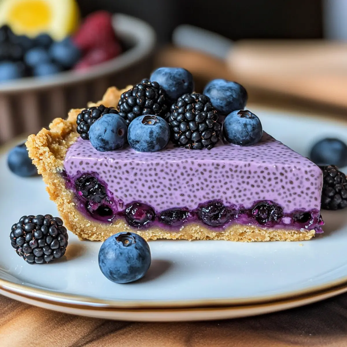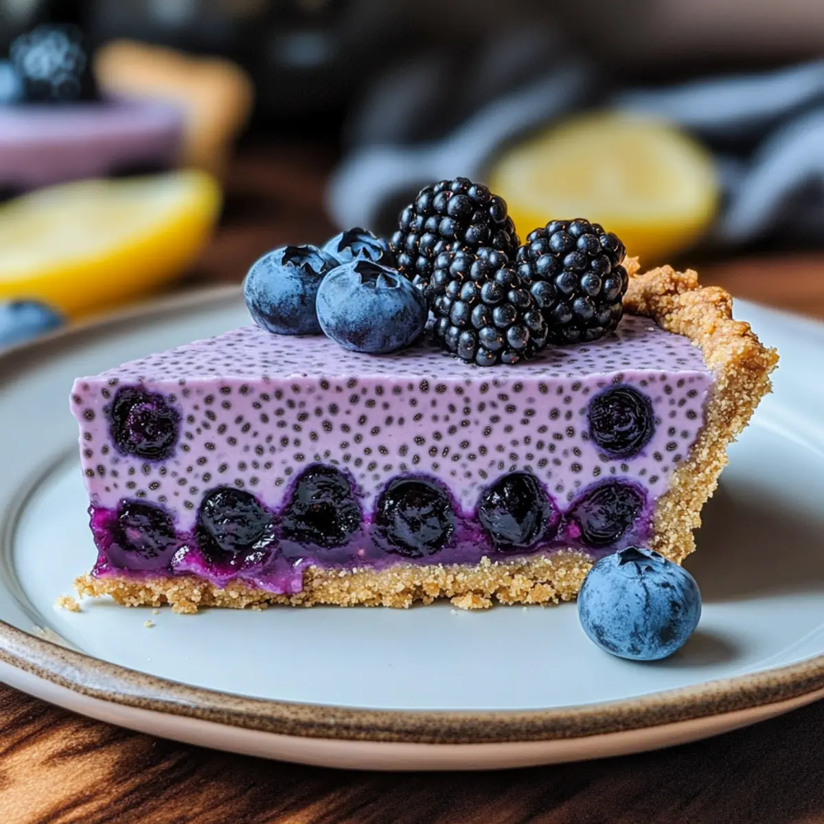Jump to Recipe Print RecipeHave you ever felt the joy of creating something beautiful without turning on the oven? I adore the simplicity and delight of a No-Bake Blueberry Chia Seed Pie—it’s a refreshing escape into guilt-free indulgence, combining juicy blueberries and nutritious chia seeds effortlessly. This healthy dessert is not only stunning to look at, but it also embraces the essence of summer gatherings. You can whip it up quickly, making it a perfect companion for those warm evenings spent with friends and family while keeping your wellness goals in check. Plus, it’s customizable with various sweeteners and dairy alternatives, making it a breeze to cater to any palate. Curiosity piqued? Let’s dive into the recipe that will undoubtedly become a star at your next get-together! Why is this pie a must-try? Simplicity at Its Finest: You won’t believe how easy it is to whip up this No-Bake Blueberry Chia Seed Pie. With just a few ingredients and no baking required, it’s perfect for everyone! Versatile & Customizable: Feel free to swap out sweeteners or yogurt types, making it suitable for vegan or gluten-free diets. Guilt-Free Indulgence: Packed with antioxidants and fiber, this pie is a healthier alternative without skimping on flavor. Impressive Presentation: Vibrantly colorful and beautiful, it’s sure to impress your guests and elevate any gathering. Quick to Make: In under 30 minutes, you can prepare a dessert that refrains from using traditional baking methods. For more delightful berry desserts, check out Blueberry Cheesecake Bars or Berry Peach Cheesecake. No-Bake Blueberry Chia Seed Pie Ingredients For the Crust Graham Crackers (or Digestive Biscuits) – Provides structure and flavor for the crust; use gluten-free cookies for a gluten-free version. Unsalted Butter – Binds the crust ingredients together; substitute with coconut oil for a dairy-free option. For the Filling Fresh or Frozen Blueberries – The main flavor component; utilize frozen berries if needed, but thaw and drain to avoid excess moisture. Chia Seeds – Acts as a thickening agent, creating a creamy filling with added health benefits; adjust quantity for desired filling thickness. Granulated Sugar (or Sweetener) – Provides sweetness; adjust according to taste, and alternatives like honey or maple syrup can be used. Greek Yogurt or Cream Cheese – Creates a rich, creamy texture; for a vegan option, replace with plant-based yogurt or cream cheese. Lemon Juice – Enhances the flavor of blueberries and balances sweetness. Vanilla Extract – Adds depth and warmth to the flavor profile. Pinch of Salt – Balances sweetness and enhances flavor. Optional Garnishes Fresh Blueberries – Elevates presentation and adds fresh flavor. Lemon Zest – Offers a burst of citrus brightness. Mint Leaves – Adds a refreshing touch to the presentation. Get ready to create your stunning No-Bake Blueberry Chia Seed Pie! Step‑by‑Step Instructions for No-Bake Blueberry Chia Seed Pie Step 1: Prepare the Crust Start by crushing graham crackers in a food processor or placing them in a plastic bag and using a rolling pin. Combine the crushed crackers with melted unsalted butter until the mixture resembles wet sand. Press this mixture firmly into the bottom of a 9-inch pie dish, ensuring it’s evenly distributed. Chill the crust in the refrigerator for 15 minutes to set. Step 2: Make the Blueberry Chia Filling While the crust chills, blend or mash 1 cup of fresh or thawed blueberries in a bowl until smooth. In a separate bowl, whisk together this blueberry puree with chia seeds, sweetener of choice, lemon juice, and a pinch of salt. This mixture will become the luscious filling for your No-Bake Blueberry Chia Seed Pie. Let it sit for 5–10 minutes, allowing the chia seeds to absorb moisture and thicken the filling. Step 3: Incorporate Creaminess Once the chia seed mixture has thickened, gently fold in Greek yogurt or cream cheese until smooth. This creates a rich, creamy texture that complements the blueberry flavor beautifully. Ensure that there are no lumps and everything is well combined. The filling should be thick but pourable to sit atop the crust without sliding off. Step 4: Assemble the Pie Retrieve the chilled crust from the refrigerator and carefully spoon the blueberry chia filling over it, spreading it evenly with a spatula. Smooth the top to create a beautiful appearance. Cover the pie with plastic wrap and place it back in the fridge. Chill for at least 2 hours, preferably overnight, to allow the filling to fully set and flavors to meld. Step 5: Garnish and Serve Just before serving, take your stunning No-Bake Blueberry Chia Seed Pie out of the fridge. Garnish the top with fresh blueberries, a sprinkle of lemon zest, and mint leaves for an eye-catching finish. When ready to cut, use a hot, sharp knife to slice through, ensuring clean edges. Enjoy your delicious, refreshing pie! Make Ahead Options The No-Bake Blueberry Chia Seed Pie is a delightful choice for meal prep! You can prepare the crust and filling individually up to 24 hours in advance. Begin by making the crust and storing it in an airtight container in the refrigerator. For the filling, combine the blueberries, chia seeds, sweetener, lemon juice, and salt, then fold in your yogurt or cream cheese, and refrigerate it separately. When you’re ready to serve, simply assemble the pie by spreading the chilled filling over the crust, letting it set for a few extra minutes if needed. This method preserves the pie’s quality, ensuring it remains just as delicious when served! How to Store and Freeze No-Bake Blueberry Chia Seed Pie Fridge: Store the pie in an airtight container for up to 3-4 days. This keeps it fresh while preserving the delicious flavors and textures you’ve created. Freezer: For longer storage, you can freeze the pie (without garnishes) for up to 1 month. Wrap it tightly in plastic wrap and aluminum foil to prevent freezer