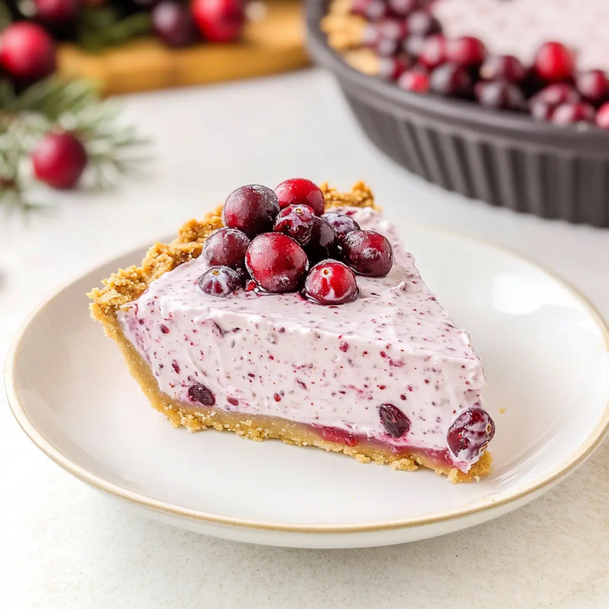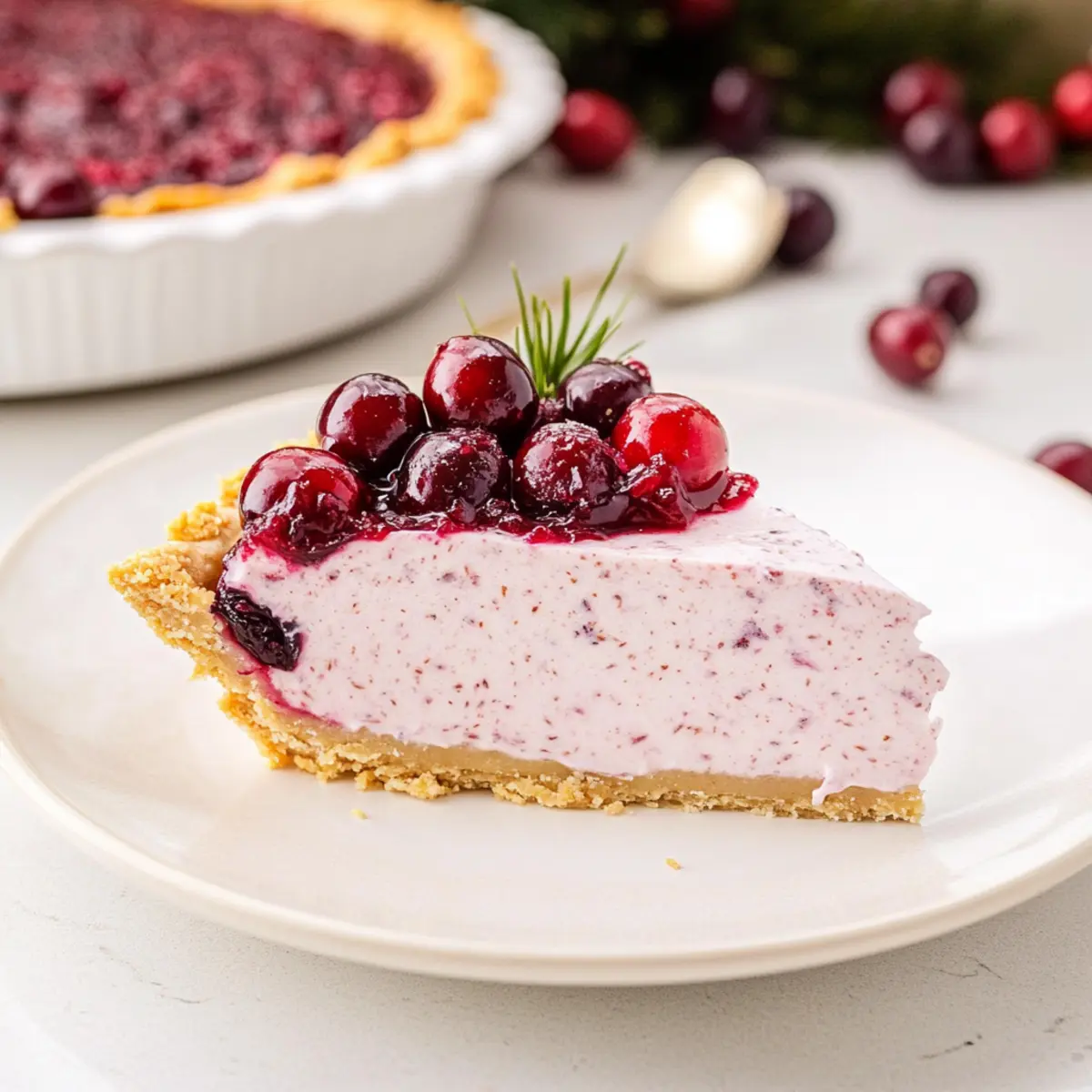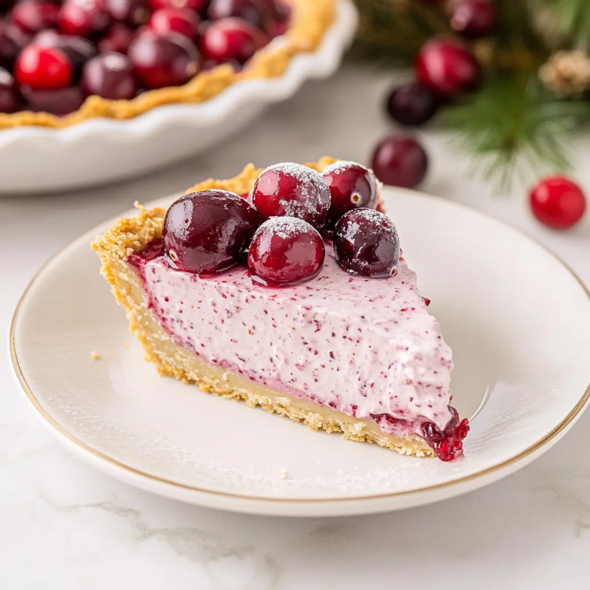 Jump to Recipe Print RecipeAs the holiday buzz fills the air, a world of flavors opens up before us. Among the multitude of festive delights, my No Bake Cranberry Pie stands out—a creamy, tart triumph that effortlessly blends into any holiday gathering. With its quick prep time and make-ahead convenience, this dessert is a stress-free solution for busy home chefs eager to impress without burning out. Picture a luscious filling, brightened with zesty orange and swirled with tart cranberry, all nestled within a crunchy graham cracker crust. It’s the perfect culmination of seasonal flavors, inviting friends and family to indulge. Curious about how to get started on this delightful treat? Let’s dive into this easy recipe that will make your next gathering unforgettable! Why is No Bake Cranberry Pie a Must-Try? Effortless Preparation: Just mix, chill, and serve—no baking required! Luscious Creaminess: The blend of cream cheese and whipped topping creates an irresistible, smooth filling. Holiday Flavor Blast: Tangy cranberries paired with zesty orange elevate this dessert to festive heights. Versatile Base: While this recipe shines, feel free to experiment with other fruits like raspberry for a unique twist. Crowd-Pleasing Appeal: Perfect for potlucks, this pie will be the star of any gathering—just like my Berry Peach Cheesecake! Quick Chill Time: With minimal wait, it’s a fast solution for last-minute holiday dessert needs. Let’s whip up joy in every bite! No Bake Cranberry Pie Ingredients • Perfect for your holiday gathering! For the Filling Cream Cheese – Provides a rich and creamy base for the filling; consider using low-fat for a lighter treat. Powdered Sugar – Sweetens the filling while giving it a smooth texture; if you’re in a pinch, granulated sugar works but may alter the consistency. Orange Zest – Adds a refreshing citrus brightness that enhances the cranberries; lemon zest can also bring a delightful twist. Whole-Berry Cranberry Sauce – The star of the pie, lending its tartness; switch it up with homemade sauce for a fresh taste. Whipped Topping – Introduces lightness and fluffy texture; for a homemade feel, substitute with heavy cream whipped to soft peaks. For the Crust Graham Cracker Crust – Provides a crunchy base that juxtaposes the creamy filling; pre-made crusts are convenient, while a homemade one can boost flavor. Step‑by‑Step Instructions for No Bake Cranberry Pie Step 1: Prepare the Filling In a large mixing bowl, beat 8 ounces of softened cream cheese and 1 cup of powdered sugar with an electric mixer on medium speed until the mixture is smooth and creamy, about 2-3 minutes. You want it to be free of lumps. Add the zest of one orange and continue mixing for another minute to incorporate the bright citrus flavor into the filling. Step 2: Combine with Cranberry Sauce Gently fold in 1 cup of whole-berry cranberry sauce into your cream cheese mixture using a spatula. Mix on low speed just until combined—this should take about 30 seconds. Be careful not to overmix, as you want to maintain a speckled look with the cranberry sauce visible throughout the filling. Step 3: Incorporate Whipped Topping Next, add 1 cup of whipped topping to the cranberry filling, using the spatula to fold it in gently. This will take about 1-2 minutes. You’re aiming for a light, fluffy texture, so be cautious not to deflate the mixture. The filling for your No Bake Cranberry Pie should start to look light and airy. Step 4: Fill the Crust Carefully spoon the filling into a pre-made graham cracker crust, spreading it evenly to ensure a nice, smooth top. Use the back of a spatula to help you create an even layer, making sure it reaches all edges of the crust. The filling should be just below the top of the crust, creating a beautiful presentation. Step 5: Chill to Set Cover the pie with plastic wrap or a lid and place it in the refrigerator to chill for at least 2 hours. This step is essential to allow the filling to set properly. If you have the time, chilling overnight enhances the flavors even more, making your No Bake Cranberry Pie an even more delightful treat. Step 6: Garnish and Serve Once your No Bake Cranberry Pie is set, remove it from the refrigerator. You can garnish it with extra whipped topping or a sprinkle of orange zest for a pop of color and flavor. Slice the pie into wedges and serve chilled, inviting your guests to savor this creamy, tart dessert that’s perfect for holiday gatherings! No Bake Cranberry Pie Variations & Substitutions Feel free to let your creativity shine as you customize this delightful dessert! Each twist can bring new flavors and textures to the table. Gluten-Free Crust: Substitute regular graham crackers with gluten-free ones to make it suitable for those with gluten sensitivities. It’s an easy swap that allows everyone to enjoy! Different Berries: Try using raspberry or blueberry sauce instead of cranberry for a deliciously fruity variation. The change in flavor adds a unique touch while keeping the creamy filling intact. Nutty Filling: Add in ½ cup chopped pecans or walnuts for extra crunch in the filling. The nuttiness beautifully complements the sweetness of the cream cheese and tang of the cranberries. Coconut Twist: Incorporate shredded coconut for a tropical flair. Just fold in ½ cup during the mixing process to give your pie a new layer of texture and flavor. Chocolaty Delight: Opt for a chocolate crumb crust instead of a graham cracker crust. The rich chocolate taste will make your pie even more indulgent and appealing. Spiced Up: Add a pinch of cinnamon or nutmeg to the creamy filling for a warm, spiced flavor that compliments the cranberries beautifully. It’s an aromatic twist that’ll enhance the experience. Dairy-Free Option: Use a dairy-free cream cheese and whipped topping to adapt this recipe for vegan diets, making it a wonderful all-inclusive dessert for gatherings! Citrus Boost: Swap orange zest w