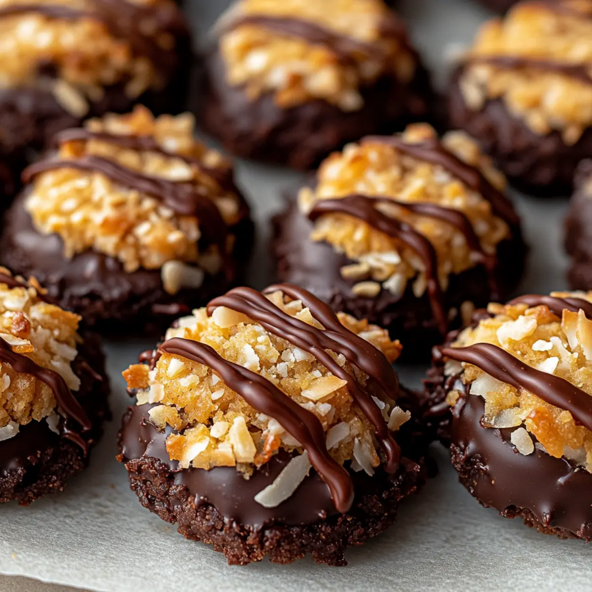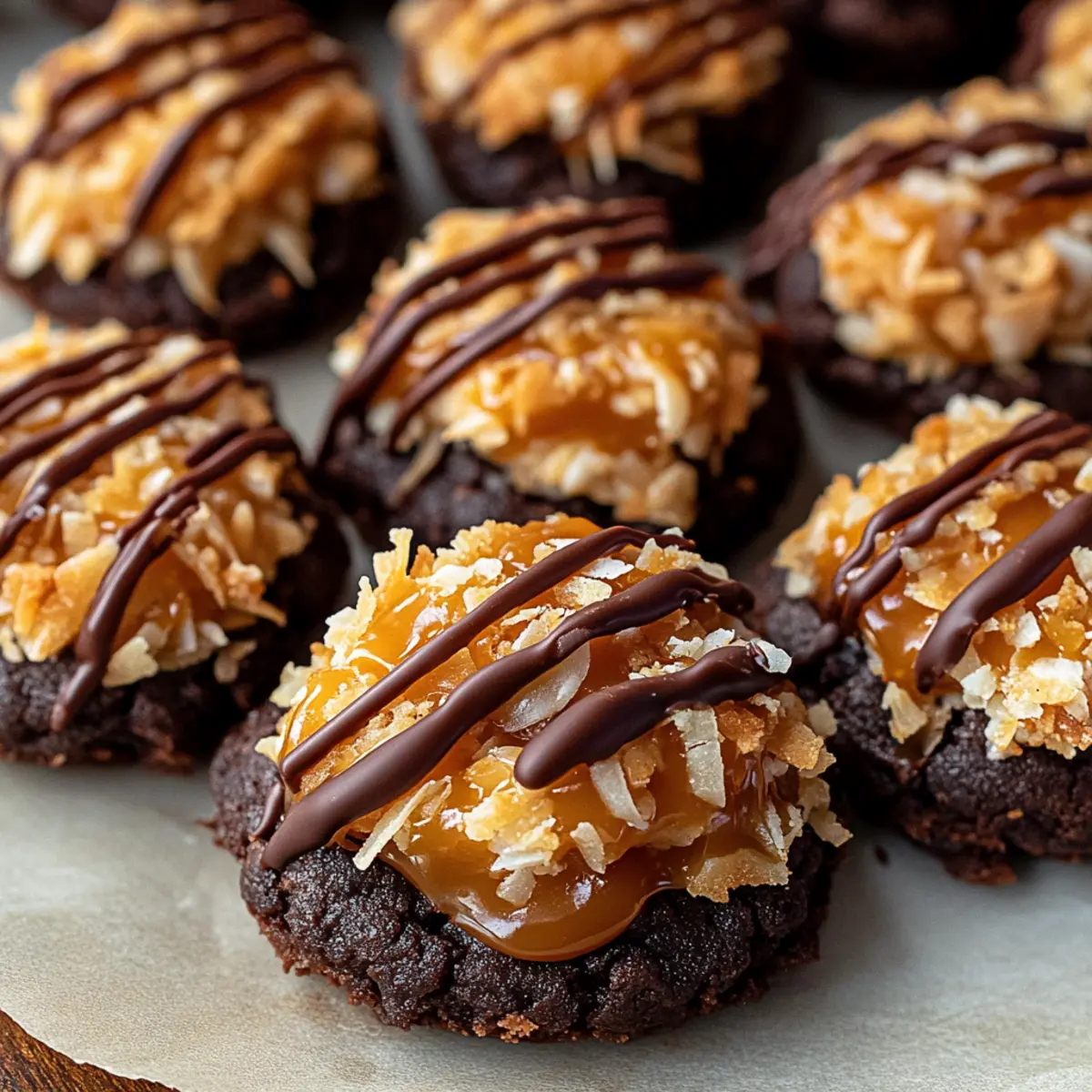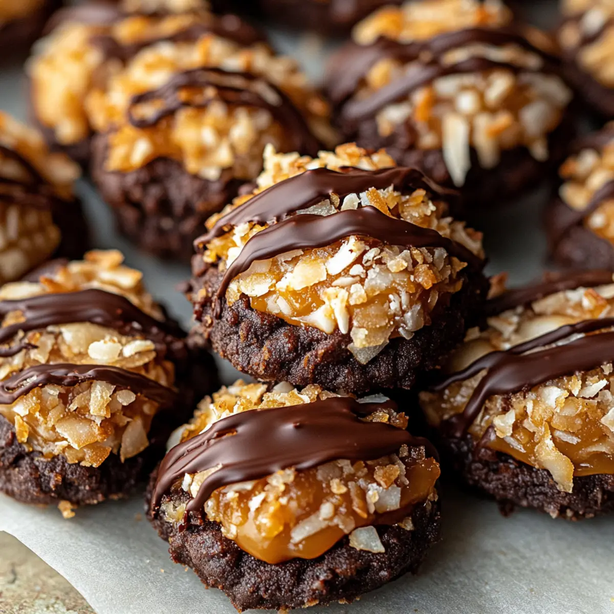 These No-Bake Samoa Cookies are perfect for busy home cooks who love a little sweet indulgence without the hassle! You can prepare the chocolate bases up to 24 hours in advance by melting and spreading the chocolate on parchment; simply cover them tightly with plastic wrap to maintain their quality. Additionally, the caramel-coconut mixture can be made up to 3 days ahead—just store it in an airtight container in the refrigerator. When you’re ready to assemble the treats, spoon the chilled caramel-coconut mixture onto the prepared chocolate bases and drizzle with melted chocolate. This way, you’ll have delightful cookies ready to impress with minimal last-minute effort!