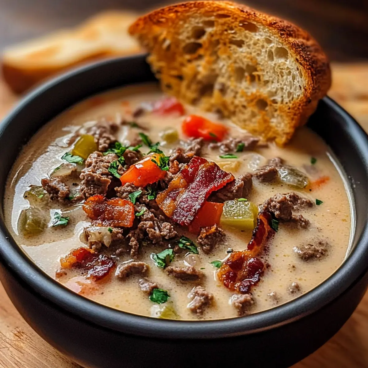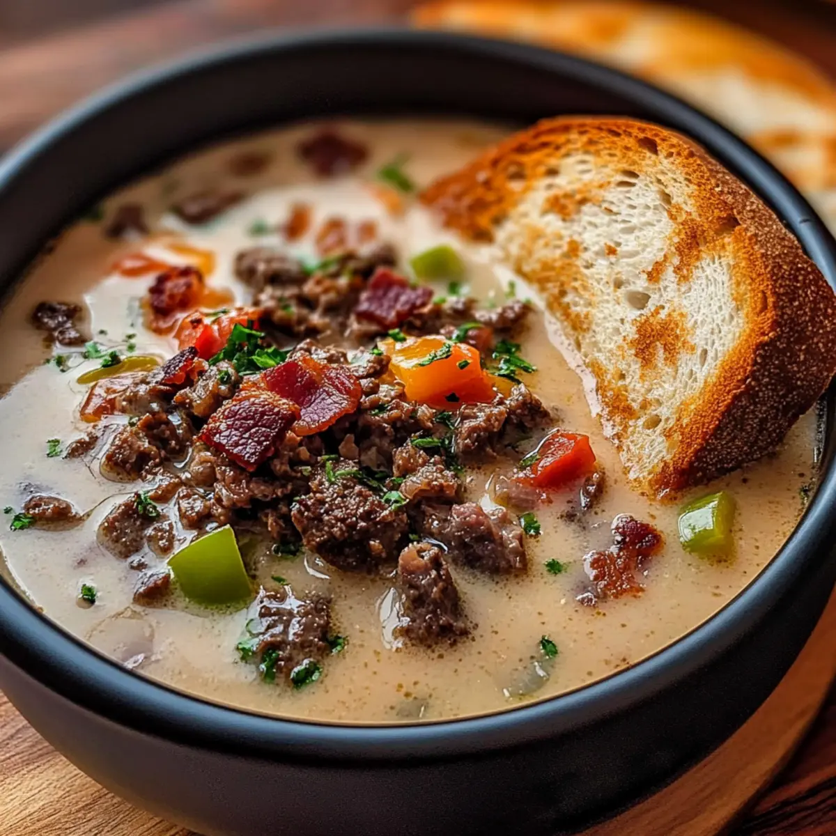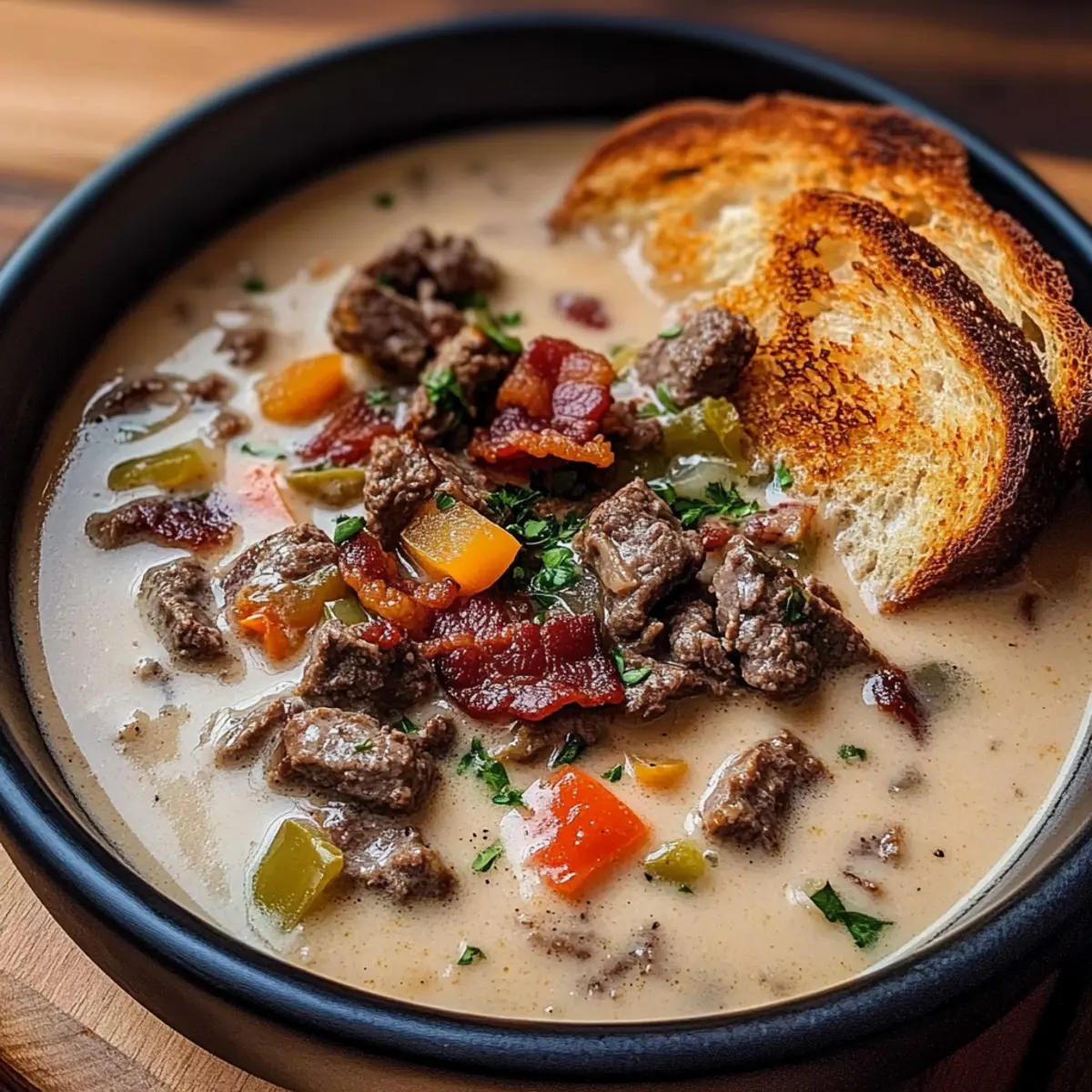 Jump to Recipe Print RecipeIn the hustle and bustle of everyday life, I often find myself yearning for the rich and hearty flavors of a traditional cheesesteak, but with the comfort of a cozy soup. That’s where my One-Pot Philly Cheesesteak Soup comes in, transforming all the savory goodness of that beloved sandwich into a soul-soothing bowl. This recipe is a lifesaver for busy weeknights, combining tender beef, melty cheese, and crispy bacon—all in one easy pot. Plus, it’s gluten-free and perfect for those who crave comfort food without the guilt. Imagine savoring a creamy soup with bites of hearty beef and smoky bacon, complemented by a side of cheesy toast for dipping. You won’t believe how quickly it comes together! Are you ready to dive into this delicious twist on a classic? Why is This Soup a Must-Try? Comforting Warmth: This One-Pot Philly Cheesesteak Soup captures the essence of a classic sandwich, providing a warm embrace in every bowl. Easy Preparation: With just one pot needed, cleanup is a snap, making it ideal for busy weeknights or last-minute gatherings. Flavor Explosion: The combination of tender beef, creamy cheese, and crispy bacon results in a savory depth that will leave everyone wanting more. Versatile Options: Whether you prefer a traditional take or a lighter version with turkey, this recipe easily caters to various tastes. Consider using plant-based proteins for a delicious vegetarian twist! Crowd-Pleasing Appeal: This dish transforms a beloved favorite into a cozy meal that’s perfect for sharing with family and friends, ensuring happiness all around! It’s a fantastic way to enjoy comfort food without the guilt. One-Pot Philly Cheesesteak Soup Ingredients • Dive into deliciousness with all the essentials! For the Soup Beef – Use tender cuts like sirloin or ribeye for the best texture in your One-Pot Philly Cheesesteak Soup. Cheese – Provolone or American cheese adds a creamy flavor, perfect for that comforting touch. Bacon – Thick-cut bacon introduces smokiness and crunch, enhancing the overall richness. Cornstarch – This is used for thickening; mix it with water beforehand to prevent clumping. Vegetables (Bell Peppers, Onions) – Dice them finely to create a flavorful base that cooks evenly. Almond or Oat Milk – These options provide a creamy texture without dairy while keeping the taste balanced. Seasonings (Garlic, Oregano, etc.) – Enhance the flavor by adjusting to your personal taste preferences. For the Cheesy Toast Bread – Choose a hearty loaf that crisps well in the oven, perfect for toasting alongside the soup. Cheese (for Toast) – Go for your choice of a melting cheese variety to top the bread beautifully. Indulge in this hearty bowl of warmth—it’s comfort food at its finest! Step‑by‑Step Instructions for One-Pot Philly Cheesesteak Soup Step 1: Cook Bacon In a large pot, heat it over medium heat and add thick-cut bacon. Cook until crispy, about 5–7 minutes, stirring occasionally to ensure even cooking. Once golden brown, remove the bacon and set it aside, leaving the delicious drippings in the pot to flavor the One-Pot Philly Cheesesteak Soup. Step 2: Sauté Vegetables Using the same pot with the bacon drippings, add finely diced onions and bell peppers. Sauté for about 5 minutes, until the vegetables are softened and fragrant, stirring frequently. This will create a flavorful base for the soup, enhancing the overall taste of your comforting dish. Step 3: Prepare Beef Add the tender beef, such as sirloin or ribeye, to the pot along with the sautéed vegetables. Cook for 3–5 minutes, breaking the beef into smaller pieces. Stir until the beef is nicely browned and no longer pink. This step will lock in the savory flavors that make the One-Pot Philly Cheesesteak Soup so delicious. Step 4: Combine Ingredients Now, stir in the remaining ingredients: beef broth, cornstarch mixed with a little water, and seasonings like garlic and oregano. Bring the mixture to a delicious simmer over medium-high heat, which should take about 3–4 minutes. The broth will start to bubble, signaling it’s time to continue thickening your soup. Step 5: Thicken Soup Reduce the heat to low and let the soup simmer, uncovered, for about 10 minutes. Stir occasionally to prevent sticking. The soup should thicken and become creamy, achieving the desired consistency for your heartwarming One-Pot Philly Cheesesteak Soup. Step 6: Add Cheese Once the soup has thickened to your liking, stir in cubed provolone or American cheese. Continue to cook on low heat, stirring until the cheese melts completely and creates a smooth, cheesy texture throughout the soup. This creamy addition enhances the cheesesteak flavor that everyone loves. Step 7: Toast Bread While the soup simmers, prepare the cheesy toast. Preheat your oven to 400°F (200°C). Top slices of your hearty bread with a generous amount of your choice of melting cheese. Bake on a baking sheet for about 5–7 minutes, until the cheese is bubbly and golden. This will add a delightful crunch to accompany your soup. Step 8: Serve Ladle the One-Pot Philly Cheesesteak Soup into bowls, ensuring each serving is rich with beef and vibrant vegetables. Top with the crispy bacon you set aside earlier for an extra crunch. Serve it hot alongside the cheesy toast for dipping, creating a cozy meal that everyone will enjoy together! One-Pot Philly Cheesesteak Soup Variations Feel free to customize this comforting dish to suit your taste buds and dietary needs—it’s all about making it yours! Lightened Up: Substitute ground turkey or chicken for the beef to create a lighter option while maintaining flavor. Vegetarian Delight: Use plant-based beef alternatives in place of meat and skip the bacon for a delicious vegetarian-friendly soup. Cheesy Twist: Try adding different cheeses like sharp cheddar or gouda for a unique flavor experience; mix and match for fun! Extra Veggies: Toss in additional vegetables like 