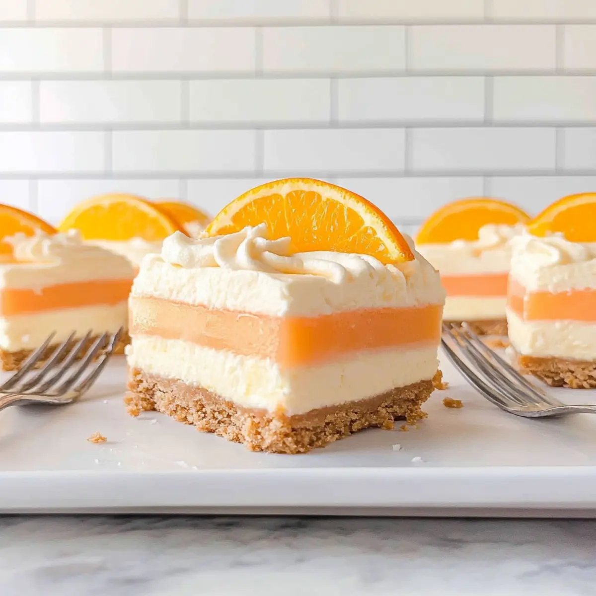 Jump to Recipe Print RecipeA sudden wave of nostalgia hits as I recall summers spent chasing the ice cream truck down the street, my heart set on creamy orange treats. Today, I’m excited to bring that blissful memory to life with my No-Bake Orange Creamsicle Dream Bars. This irresistible dessert combines a crunchy Nilla Wafer crust with a luscious cheesecake layer topped with refreshing orange cream. Perfect for hot days, these bars not only offer a delightful journey back to carefree summer afternoons but are also incredibly easy to whip up — no baking required! Whether you’re hosting a summer gathering or just craving something cool and sweet, these dreamy bars are sure to be a hit. Ready to take a bite of nostalgia and enjoy a sweet, tangy creation? Why Make Orange Creamsicle Dream Bars? Nostalgic Delight: Transport yourself to summer days with a dessert that captures the essence of ice cream trucks. No-Bake Convenience: Quick and easy to make, these bars save you from the heat of the oven! Creamy Layers: A perfect fusion of silky cheesecake and light orange cream offers a refreshing treat. Crowd-Pleasing Flavor: With the sweet crunch of a Nilla Wafer crust and vibrant orange taste, these bars are sure to impress guests. Versatile Serving: Dress them up with fresh orange slices or a dollop of Cool Whip for added flair. For another delightful no-bake option, check out my Maple Donut Bars! Orange Creamsicle Dream Bars Ingredients • Discover the layers of flavor in these delightful bars! For the Crust Nilla Wafer Cookie Crumbs – 1⅓ cups provide a sweet crunch to the base; can substitute with graham cracker crumbs. Unsalted Butter – 5 tablespoons bind the crust ingredients together; coconut oil works for a dairy-free alternative. For the Orange Cream Layer Cool Whip – 8 ounces divided into 3 cups adds lightness and creaminess; stabilized whipped cream is a great homemade substitute. Orange Gelatin – 3 ounces to give vibrant flavor and texture; ensure you use the recommended water amounts for stability. Boiling Water – ¾ cup helps dissolve the gelatin. Cold Water – ¾ cup cools down the gelatin mixture. Cream Cheese – 8 ounces at room temperature creates the creamy cheesecake layer; Neufchâtel can be used for a lighter option. Powdered Sugar – ¼ cup sweetens the cream cheese mixture. Flavor Enhancers Orange Extract – 2 teaspoons intensifies the delightful citrus flavor in these Orange Creamsicle Dream Bars. Pure Vanilla Extract – 1 teaspoon adds depth to the cheesecake layer. Confectioners’ Sugar – 1 cup sweetens the cheesecake layer further. Orange Wilton Gel Food Color – 8 drops (optional) enhance color presentation of the dessert. Get ready to create a beautiful, no-bake dessert that will take you back to those blissful summer days! Step‑by‑Step Instructions for Orange Creamsicle Dream Bars Step 1: Prepare the Crust Begin by lining an 8×8-inch baking pan with parchment paper for easy removal. In a mixing bowl, melt 5 tablespoons of unsalted butter and combine it with 1⅓ cups of Nilla Wafer crumbs. Stir until the crumbs are evenly coated, then press the mixture firmly into the bottom of the prepared pan. Freeze this crust for at least 30 minutes to achieve a firm base. Step 2: Make Orange Gelatin Mixture In a separate bowl, pour 3 ounces of orange gelatin and add ¾ cup of boiling water. Stir vigorously until the gelatin is completely dissolved, then mix in ¾ cup of cold water. Allow this mixture to cool for about 10 minutes, ensuring it doesn’t set but is still chilled, as you’ll want it fully integrated into your orange cream layer. Step 3: Create Orange Cream Layer Now, in a large mixing bowl, beat 8 ounces of room-temperature cream cheese with ¼ cup of powdered sugar and 2 teaspoons of orange extract. If desired, incorporate 8 drops of orange gel food color for a vibrant hue. Gradually mix in the cooled gelatin until you achieve a smooth consistency. Transfer the mixture to the refrigerator and chill for 1 hour, thickening the orange cream layer. Step 4: Prepare Cheesecake Layer While the orange cream is chilling, beat another 8 ounces of cream cheese with 1 cup of confectioners’ sugar and 1 teaspoon of pure vanilla extract until smooth and creamy. Carefully fold in 1 cup of Cool Whip to incorporate air, creating a fluffy texture. This rich cheesecake layer will complement the refreshing orange cream on top of your Orange Creamsicle Dream Bars. Step 5: Layer Dessert Once the orange cream layer has thickened, retrieve the chilled crust and spread the cheesecake mixture evenly on top. Use a spatula to smooth it out. Afterward, gently spoon the orange cream layer over the cheesecake, ensuring it is spread evenly across the surface to create a beautiful, colorful treat. Step 6: Chill Cover the assembled dessert with plastic wrap or foil and refrigerate it for at least 6 hours, but overnight is even better for enhanced flavors and firming up the layers. This makes the Orange Creamsicle Dream Bars easier to slice and shows off the delightful layers. Step 7: Serve When ready to serve, carefully lift the chilled dessert from the pan using the parchment paper. Use a hot, dry knife to slice into bars, wiping the blade between cuts for clean edges. Enjoy the burst of nostalgia from the Orange Creamsicle Dream Bars, garnished with a touch of Cool Whip or fresh orange slices if desired. Make Ahead Options These Orange Creamsicle Dream Bars are a fantastic choice for meal prep, making them perfect for those busy weeknights! You can prepare the crust and the orange cream layer up to 24 hours in advance. Simply make the crust and freeze it for at least 30 minutes to set, while the orange gel layer can be prepared and refrigerated. For the cheesecake layer, mix it the day you plan to serve, as it’s best fresh to maintain its fluffy texture. When you’re ready to enjoy, layer the cheesecake atop the chilled crust, top it with the orange cream, a