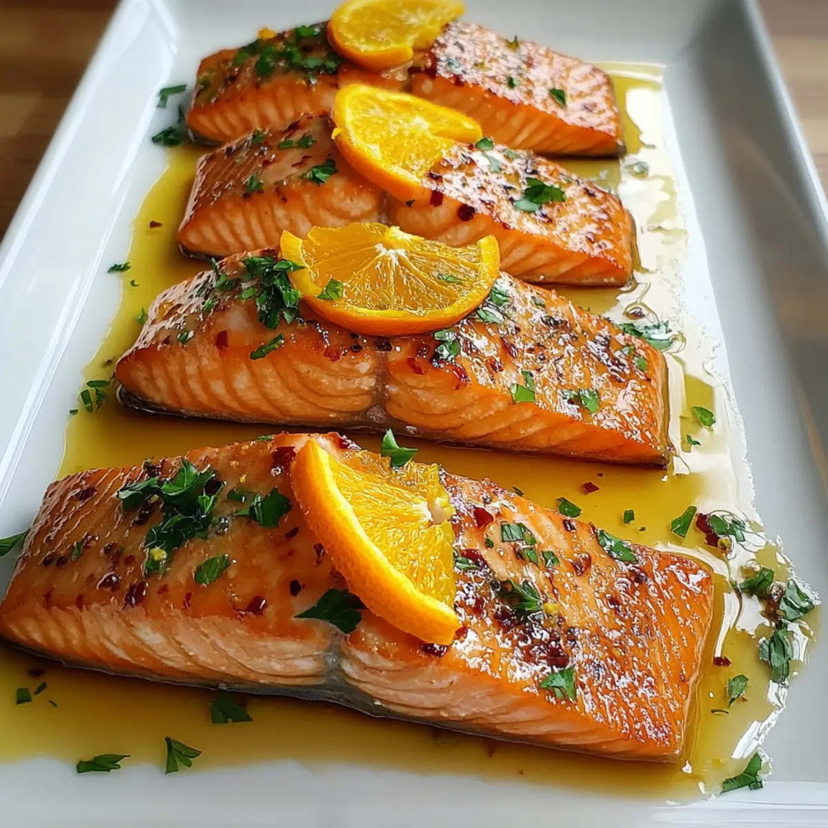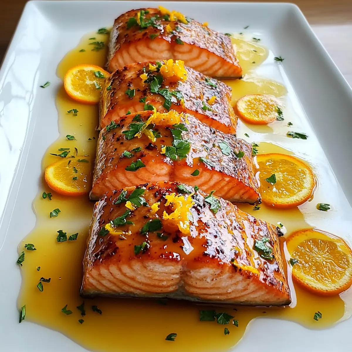 Jump to Recipe Print RecipeAs I pulled the orange from the bowl, the bright, citrusy scent wrapped around me like a warm hug, instantly lifting my spirits. That’s the magic of cooking with fresh ingredients—it creates not only meals but joy. Today, I’m excited to share my easy recipe for Orange Glazed Salmon, a delightful dish that can bring sunshine to your dinner table in just 25 minutes. With tender salmon fillets coated in a zesty orange glaze, this seafood recipe offers a perfect balance of sweetness and tangy brightness, making it ideal for both quick weeknight dinners and elegant gatherings. Plus, it’s a healthy option packed with omega-3s, ensuring you can indulge without hesitation. Curious about how to master this quick meal for your next occasion? Let’s dive in! Why is Orange Glazed Salmon a Must-Try? Quick and Easy: This recipe can be whipped up in just 25 minutes, making it an excellent choice for busy weeknights or last-minute entertaining. Flavor Explosion: The zesty orange glaze complements the rich salmon, offering a sweet and tangy flavor that will impress your guests without the fuss. Healthy Delight: Packed with omega-3 fatty acids, this dish is a delicious way to nourish your body while satisfying your taste buds. Versatile Pairing: Whether served with fluffy jasmine rice or a fresh garden salad, Orange Glazed Salmon complements various sides and easily adapts to your dietary preferences. Crowd-Pleaser: Guaranteed to impress both family and friends, this dish transforms an ordinary dinner into a memorable occasion. Check out more delightful seafood recipes like our Salmon Sushi Bake for more inspiration! Orange Glazed Salmon Ingredients For the Salmon • Salmon Fillets – Rich in omega-3s, use fresh Atlantic or sockeye salmon for the best flavor and texture. • Salt – Enhances the natural flavor of the salmon; adjust according to your taste. • Black Pepper – Adds a touch of spice that elevates the dish. • Olive Oil – Ideal for searing, it creates a crispy exterior while keeping the salmon moist. For the Glaze • Fresh Orange Juice – Provides essential sweetness and acidity, ensuring the glaze clings beautifully to the salmon. • Honey – Adds a silky sweetness for that luscious glaze; can substitute with maple syrup if desired. • Soy Sauce – Instills umami richness while giving the glaze a beautiful color. • Minced Garlic – Infuses the glaze with aromatic depth and warmth. • Grated Ginger – Brings a subtle heat and bright citrus notes that lift the dish. • Cornstarch mixed with Water – Thickens the glaze to prevent it from sliding off the salmon. For Garnishing • Fresh Parsley – Adds a pop of color and herbal freshness, enhancing both appearance and flavor. • Orange Zest – Intensifies the citrus flavor, bringing an aromatic touch at garnishing. This Orange Glazed Salmon recipe promises to make your dinner not just a meal, but a celebration! Step‑by‑Step Instructions for Orange Glazed Salmon Step 1: Season the Salmon Start by seasoning your salmon fillets with a sprinkle of salt and black pepper on both sides. Ensure an even coating to enhance the flavor of the Orange Glazed Salmon. Allow the fillets to sit for about 5 minutes while you prepare to heat the skillet, which will help in creating a crispy exterior when cooked. Step 2: Heat the Skillet In a large skillet, pour in a tablespoon of olive oil and heat it over medium-high heat until it shimmers, approximately 2 minutes. You want the oil hot enough to sizzle when the salmon is added. This step is crucial as it ensures that the salmon gets a beautiful golden crust while cooking. Step 3: Cook the Salmon Carefully place the seasoned salmon fillets skin side down into the hot skillet. Cook for about 4 minutes without moving them, allowing the skin to crisp up beautifully. When the fillets turn golden brown, flip them gently and cook for an additional 4 minutes, until the salmon flakes easily with a fork. Remove the fillets from the skillet and set aside on a plate. Step 4: Prepare the Glaze In the same skillet, add the freshly squeezed orange juice, honey, soy sauce, minced garlic, and grated ginger. Stir the mixture well to combine all the ingredients, scraping up any browned bits from the skillet for added flavor. Allow the glaze to cook for about 1 minute, letting the aromas fill your kitchen. Step 5: Thicken the Sauce Bring the mixture to a gentle simmer over medium heat. Once simmering, add the cornstarch mixed with water to the pan, stirring continuously. In about 2 minutes, you should see the glaze thicken and become glossy, perfect for coating your Orange Glazed Salmon to enhance its flavor. Step 6: Combine Salmon and Glaze Return the salmon fillets to the skillet, placing them in the thickened glaze, and spoon some of the glaze over the fillets. Allow the salmon to cook in the glaze for an additional 1-2 minutes, ensuring it is heated through. This step infuses the fish with the zesty sweetness of the orange glaze. Step 7: Plate the Salmon Carefully transfer the salmon fillets to serving plates. Drizzle any remaining glaze from the skillet over the fillets, ensuring they are beautifully coated. The glossy glaze not only enhances the taste but also the presentation of your Orange Glazed Salmon. Step 8: Garnish and Serve For a vibrant finish, garnish your dish with fresh parsley and a sprinkle of orange zest. This adds a pop of color and helps elevate the citrus flavors. Your Orange Glazed Salmon is now ready to be enjoyed—serve it with a side of fluffy jasmine rice or sautéed vegetables for a well-rounded meal! Make Ahead Options Preparing Orange Glazed Salmon in advance is a fantastic way to save time during busy weeknights! You can season the salmon fillets with salt and pepper and store them in the refrigerator for up to 24 hours. Additionally, prepare the orange glaze by mixing the fresh orange juice, honey, soy sauce, minced garlic, and grated g