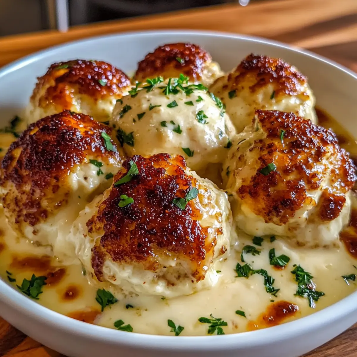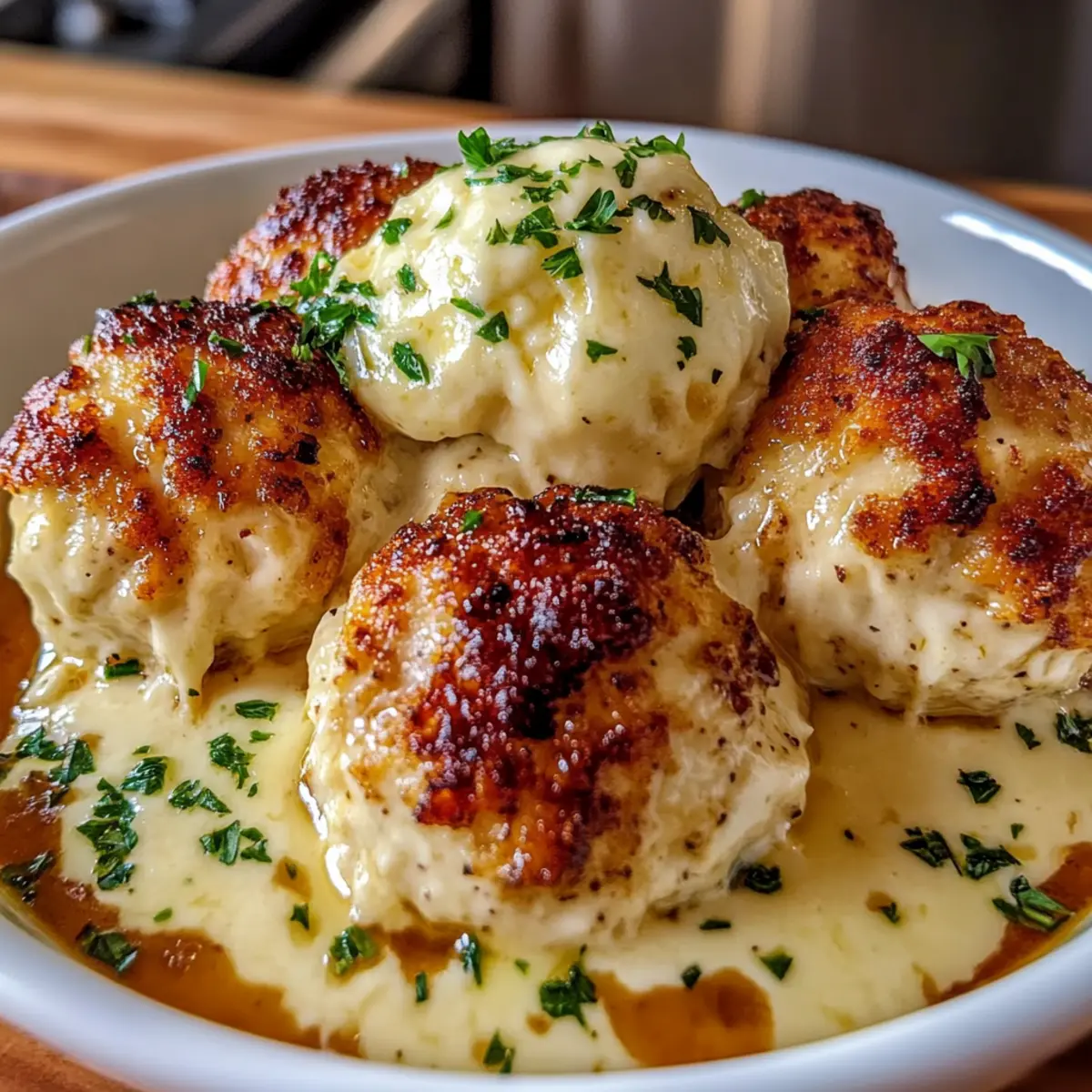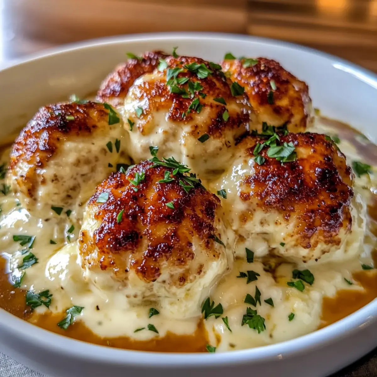 Jump to Recipe Print RecipeAs I stood in my kitchen, the aroma of baking filling the air, I couldn’t help but feel a wave of nostalgia wash over me. Those lovely evenings spent savoring hearty comfort food with friends and family lingered in my memory. That’s when I decided to whip up a batch of Creamy Parmesan Cloud Chicken Bombs, a dish that’s not only gluten-free but incredibly quick to prepare. These little bites of joy are your answer to busy weeknights or when you’re looking to impress at gatherings. Imagine sinking your teeth into tender, golden chicken enveloped in a rich, creamy sauce—pure bliss! With just a few simple ingredients, you can create a delightful meal that’s as satisfying as it is scrumptious. Ready to make your kitchen the heart of culinary comfort? Let’s dive into this recipe that promises to warm your soul! Why Choose Parmesan Cloud Chicken Bombs? Comforting bites: These Creamy Parmesan Cloud Chicken Bombs offer a warm, satisfying experience, perfectly capturing the essence of homemade goodness. Quick to make: With only a handful of ingredients and simple preparation steps, you’ll have a delicious meal ready in no time! Versatile flavor: Feel free to swap ground chicken for turkey or customize the creamy sauce to suit your taste, ensuring every bite is tailored to your liking. Crowd-pleasing appeal: Perfect for family dinners or potlucks, these chicken bombs are sure to impress your guests, inviting them for seconds. Gluten-free option: Easily adjust the recipe with gluten-free breadcrumbs for a tasty dish that everyone can enjoy! Pair with sides like Chicken and Broccoli Sizzling for a wholesome meal. Parmesan Cloud Chicken Bomb Ingredients • Gather these simple ingredients for your comforting meal! For the Chicken Bombs Ground Chicken – Provides the main protein and structure; substitute with ground turkey for a lighter option. Egg – Acts as a binder to hold the mixture together nicely. Breadcrumbs – Adds structure; use gluten-free breadcrumbs to keep it gluten-free. Parmesan Cheese – Infuses a rich, salty flavor that makes each bite delightful. Minced Garlic – Enhances the overall flavor profile with its aromatic spice. Chopped Parsley – Brings freshness and a pop of color to your dish. Onion Powder – Introduces an additional layer of flavor that complements the chicken. Paprika – Offers a mild heat and a beautiful hue to each bomb. Salt and Pepper – Essential seasonings to amplify all the wonderful flavors. For the Creamy Sauce Butter – Used as the base for the rich, creamy sauce. Flour – Forms the roux that thickens the sauce beautifully. Milk – Creates a smooth and creamy consistency for the sauce; feel free to use a dairy-free alternative! Mozzarella – Adds extra creaminess and flavor to the sauce, making it irresistible. Nutmeg – Provides a warm, aromatic hint that enhances the sauce. 👉 With these ingredients in hand, you’re just steps away from indulging in the delightful Parmesan Cloud Chicken Bombs! Step‑by‑Step Instructions for Parmesan Cloud Chicken Bombs Step 1: Preheat the Oven Start by preheating your oven to 200°C (400°F). This step is essential for achieving perfectly golden and cooked-through Parmesan Cloud Chicken Bombs. While the oven heats, gather your ingredients and ensure everything is ready for mixing, making the cooking process smooth and efficient. Step 2: Prepare the Chicken Mixture In a large mixing bowl, combine ground chicken, egg, breadcrumbs, Parmesan, minced garlic, chopped parsley, onion powder, paprika, salt, and pepper. Mix gently with your hands, ensuring the ingredients come together without overmixing, which can make the chicken bombs tough. The mixture should feel moist and cohesive, ready for shaping. Step 3: Shape the Chicken Bombs Using your hands, shape the mixture into golf ball-sized balls and place them on a parchment-lined baking tray. Make sure they have enough space between them for even cooking. This step is exciting as you watch your Parmesan Cloud Chicken Bombs come to life, setting the stage for delicious bites! Step 4: Bake the Chicken Bombs Slide the tray into the preheated oven and bake for 20-25 minutes. Keep an eye on them—you’re looking for a golden brown exterior and an internal temperature of 75°C (165°F). The sight of these beautiful chicken bombs will surely get your appetite going! Step 5: Make the Creamy Sauce While the chicken bombs bake, prepare the creamy sauce. In a saucepan, melt butter over medium heat, then stir in flour to create a roux. Gradually whisk in the milk, stirring continuously until the sauce thickens and is smooth. Finally, add Parmesan, mozzarella, salt, pepper, and a pinch of nutmeg, stirring until creamy and luscious. Step 6: Combine & Broil Once the chicken bombs are ready, transfer them to a serving dish. Pour the creamy sauce generously over the chicken bombs and place them under the broiler for 3-5 minutes. This will enhance the flavors and create a bubbly, tempting top. Watch closely, as they can brown quickly. Step 7: Serve and Enjoy Now it’s time to plate your delicious Parmesan Cloud Chicken Bombs! Serve them alongside mashed potatoes or cauliflower purée for that ultimate comfort meal experience. Drizzle extra sauce on top and garnish with fresh parsley, if desired. Each bite will be a lovely taste of home-cooked goodness! How to Store and Freeze Parmesan Cloud Chicken Bombs Fridge: Store leftover Parmesan Cloud Chicken Bombs in an airtight container for up to 3 days. This keeps them fresh and flavorful for quick meals later in the week. Freezer: If you’ve baked a large batch, freeze the chicken bombs in a single layer on a baking sheet. Once frozen, transfer them to a freezer-safe bag for up to 3 months. Reheating: For best results, reheat in the oven at 180°C (350°F) for 15-20 minutes or until heated through. This retains their crispness and delicious creamy texture. Pre-Baking Storage: You can