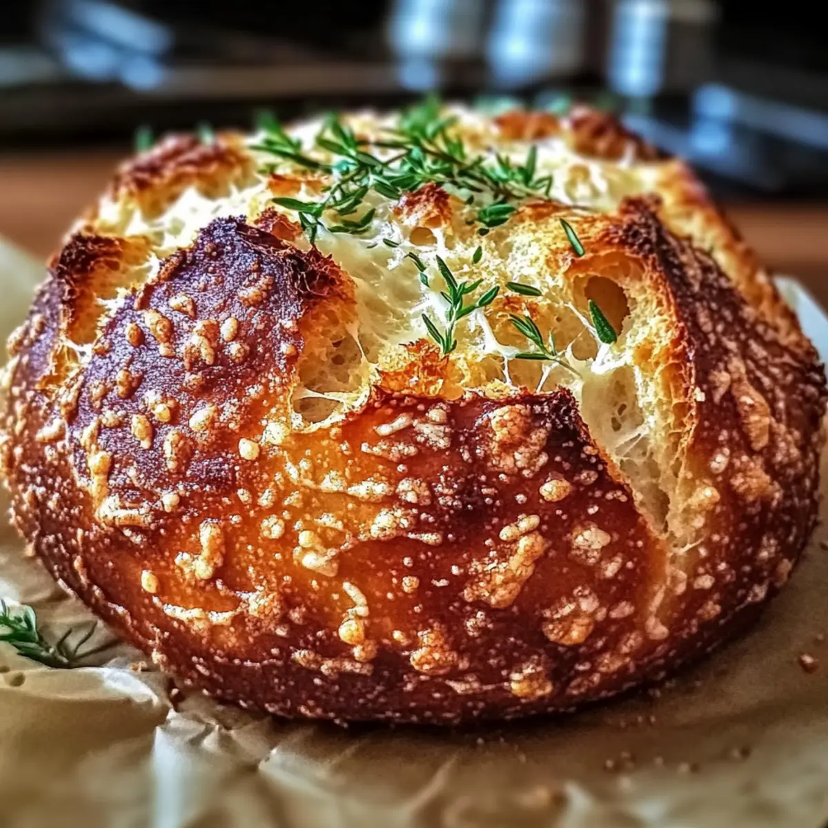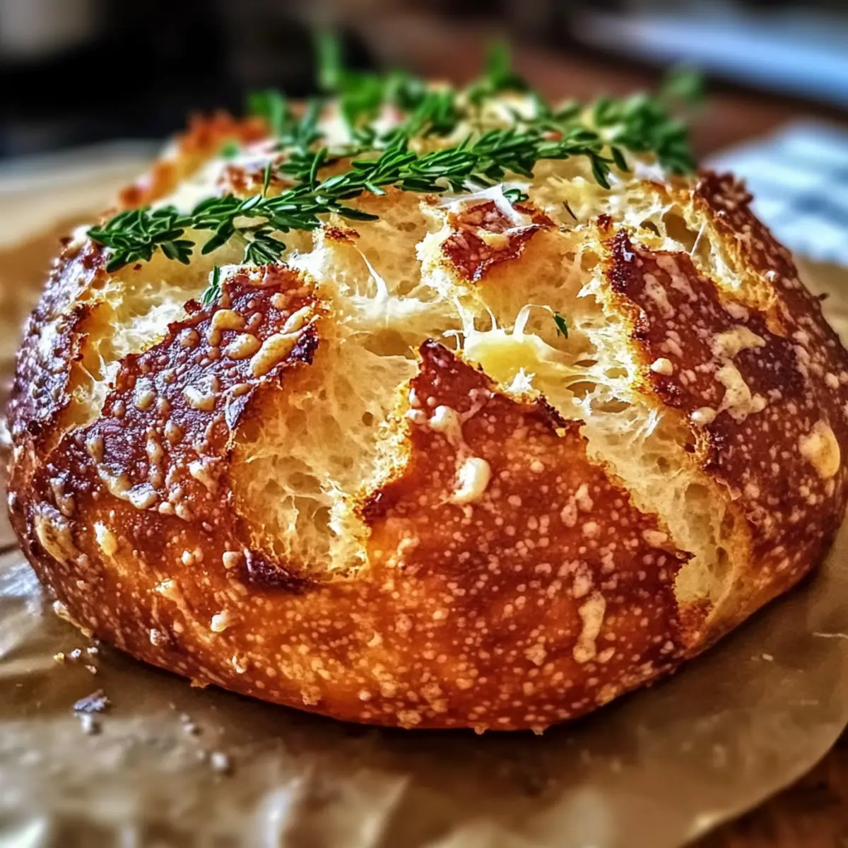 Jump to Recipe Print RecipeAs I pulled the loaf from the oven, the rich scent of garlic and parmesan filled the kitchen, transporting me to a quaint Italian bakery. This Perfect Parmesan Garlic Artisan Bread is not only a feast for the senses but also a lifesaver for busy home cooks craving comforting, homemade goodness. The beauty of this easy no-knead recipe lies in its simplicity—allowing you to create a crisp, golden crust with a soft, cheesy interior without spending hours in the kitchen. Whether you’re serving it warm beside a hearty soup, complementing a fresh salad, or enjoying it all on its own, this irresistible bread will leave your loved ones wanting more. Are you ready to discover the magic of artisan bread in your own home? Why is this bread a must-try? Simplicity at its finest: This no-knead recipe allows anyone to bake delicious artisan bread with minimal effort—no fancy equipment required! Irresistible aroma: The combination of garlic and parmesan fills your kitchen with a mouthwatering scent, making it impossible to resist. Ultimate versatility: Enjoy it warm with soups, salads, or as a standalone snack. You could even pair it with some Garlic Parmesan Pasta for a delightful meal! Crowd favorite: With its golden crust and cheesy interior, this bread will impress guests at any gathering or cozy dinner. Customizable options: Feel free to add herbs or other cheeses, like Asiago, to match your personal taste preferences. Parmesan Garlic Bread Ingredients For the Bread All-purpose flour – Provides structure; substitute with whole wheat flour for a heartier texture. Active dry yeast – Leavens the bread; ensure it is fresh to achieve the perfect rise. Salt – Enhances flavor; kosher salt works best for this recipe. Warm water – Activates the yeast and hydrates the dough; temperature should be warm, not hot. Parmesan cheese – Adds rich, savory flavor; freshly grated cheese melts beautifully in the bread. Garlic (fresh or powder) – Imparts a deliciously aromatic garlic flavor; fresh garlic packs a more robust punch, but garlic powder is a convenient substitute. Optional Add-Ins Herbs (like rosemary or thyme) – Customize flavors for an aromatic twist in your bread. Additional cheese – Incorporate cheeses like Asiago or Pecorino Romano for delightful variations. Sun-dried tomatoes or olives – Mix in for an Italian-inspired touch that complements the parmesan garlic bread beautifully. Step‑by‑Step Instructions for Perfect Parmesan Garlic Artisan Bread Step 1: Dough Preparation In a large bowl, combine 3 cups of all-purpose flour, 1 teaspoon of active dry yeast, and 1.5 teaspoons of salt. Stir in 1 cup of warm water until a sticky, shaggy dough forms, ensuring all dry ingredients are well combined. This simple mixture is the foundation of your delicious Parmesan Garlic Bread. Step 2: First Rise Cover the bowl tightly with a damp cloth or plastic wrap and let it rise at room temperature for 12 to 18 hours. The dough should double in size and become bubbly; this slow fermentation develops the wonderful flavor. When ready, it will have a slightly domed surface, signaling it’s time for shaping. Step 3: Shape & Second Rise Sprinkle flour on a clean surface and gently turn the dough out, careful not to deflate it too much. With floured hands, shape the dough into a ball by folding the edges inward. Let it rest on the floured surface, covered with a cloth, for about 1 to 2 hours until it puffs up further, preparing it for baking. Step 4: Preheat About 30 minutes before baking, preheat your oven to 450°F (232°C) with a Dutch oven inside. This allows the pot to heat thoroughly, creating the ideal environment for that beautifully crisp exterior on your artisan bread. Ensure your Dutch oven has a tight-fitting lid to trap steam during baking. Step 5: Bake Carefully remove the hot Dutch oven from the oven. Gently place the risen dough into the pot (you can use parchment paper for easy removal if desired) and cover with the lid. Bake for 30 to 35 minutes, checking for a deep golden crust, signaling that your Perfect Parmesan Garlic Bread is ready. Step 6: Cool Once baked, carefully lift the bread out of the Dutch oven (use the parchment paper if you used it) and let it cool on a wire rack. Allowing it to cool for at least 30 minutes helps maintain its structure and texture. Once cooled, slice and enjoy the irresistible aroma and the crusty goodness of your homemade bread! Make Ahead Options Preparing this Perfect Parmesan Garlic Artisan Bread ahead of time is a smart choice for busy home cooks looking to save time during the week! You can mix the dough and leave it to rise for up to 24 hours at room temperature, allowing the flavors to develop beautifully—you’ll be delighted by the enhanced aroma! If you want to take it a step further, shape the dough after the first rise and refrigerate it for up to 3 days. When you’re ready to bake, simply allow the dough to come to room temperature and rise for about 1-2 hours before preheating your oven. This ensures that your artisanal bread remains just as delicious and fresh as if it were made on the spot, without any extra fuss on your busy days! Storage Tips for Parmesan Garlic Bread Room Temperature: Keep your Parmesan Garlic Bread in an airtight container or wrapped in plastic wrap for up to 2-3 days to maintain its freshness and prevent it from becoming stale. Freezer: For longer storage, slice the bread and place it in a freezer-safe bag or container. This can be frozen for up to 3 months, and it’s perfect for quick snacks or meals later on. Reheating: To enjoy your bread, simply thaw slices at room temperature, then warm them in a toaster or oven at 350°F (175°C) for 5-10 minutes until heated through and crisp. Avoid Fridge Storage: Storing your bread in the fridge may dry it out, so it’s best to stick with room temperature or freezing for optimal flavor and texture. Expert Tips for Perfect Parmesan Garlic