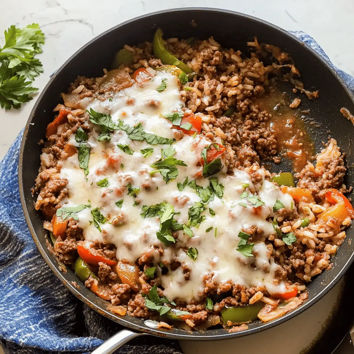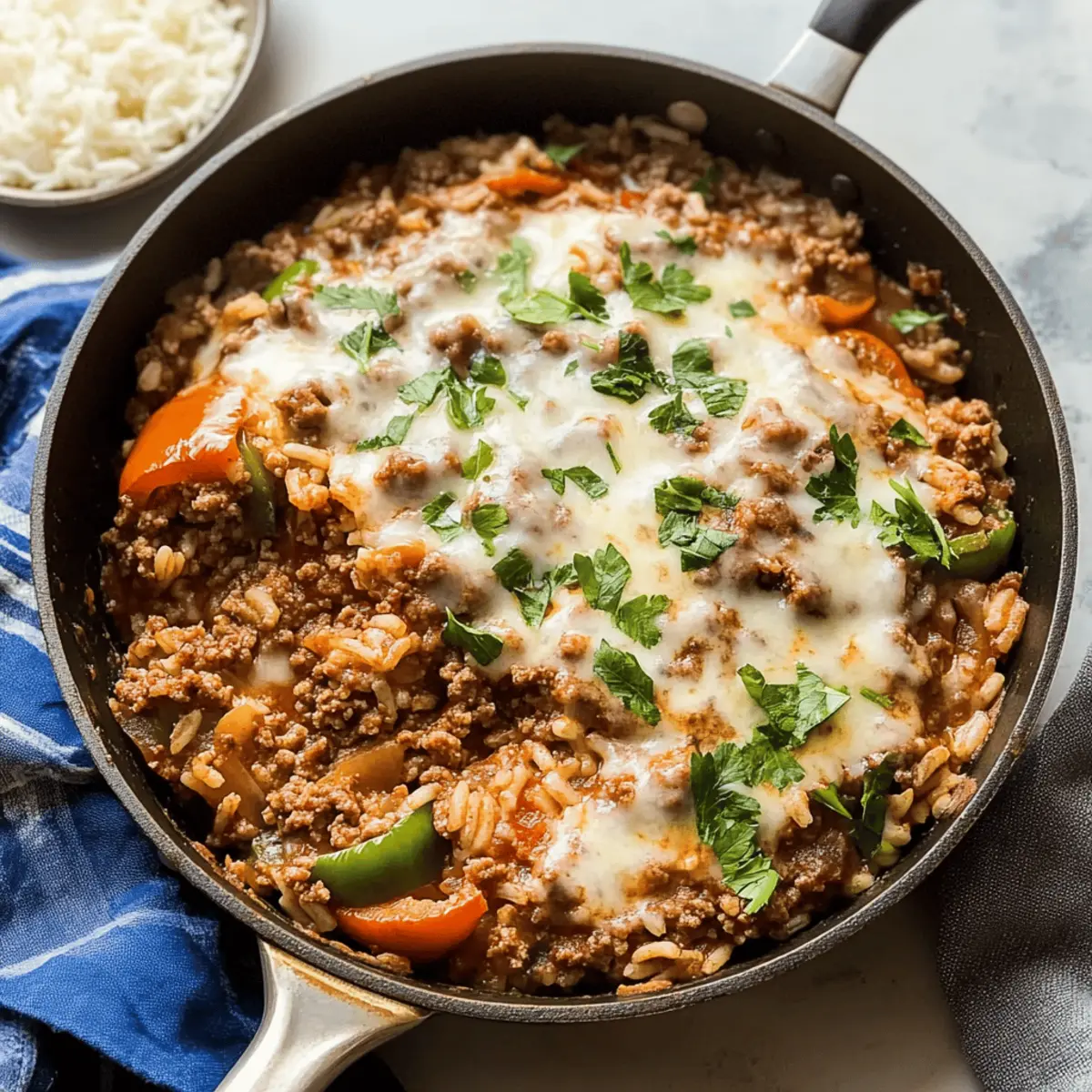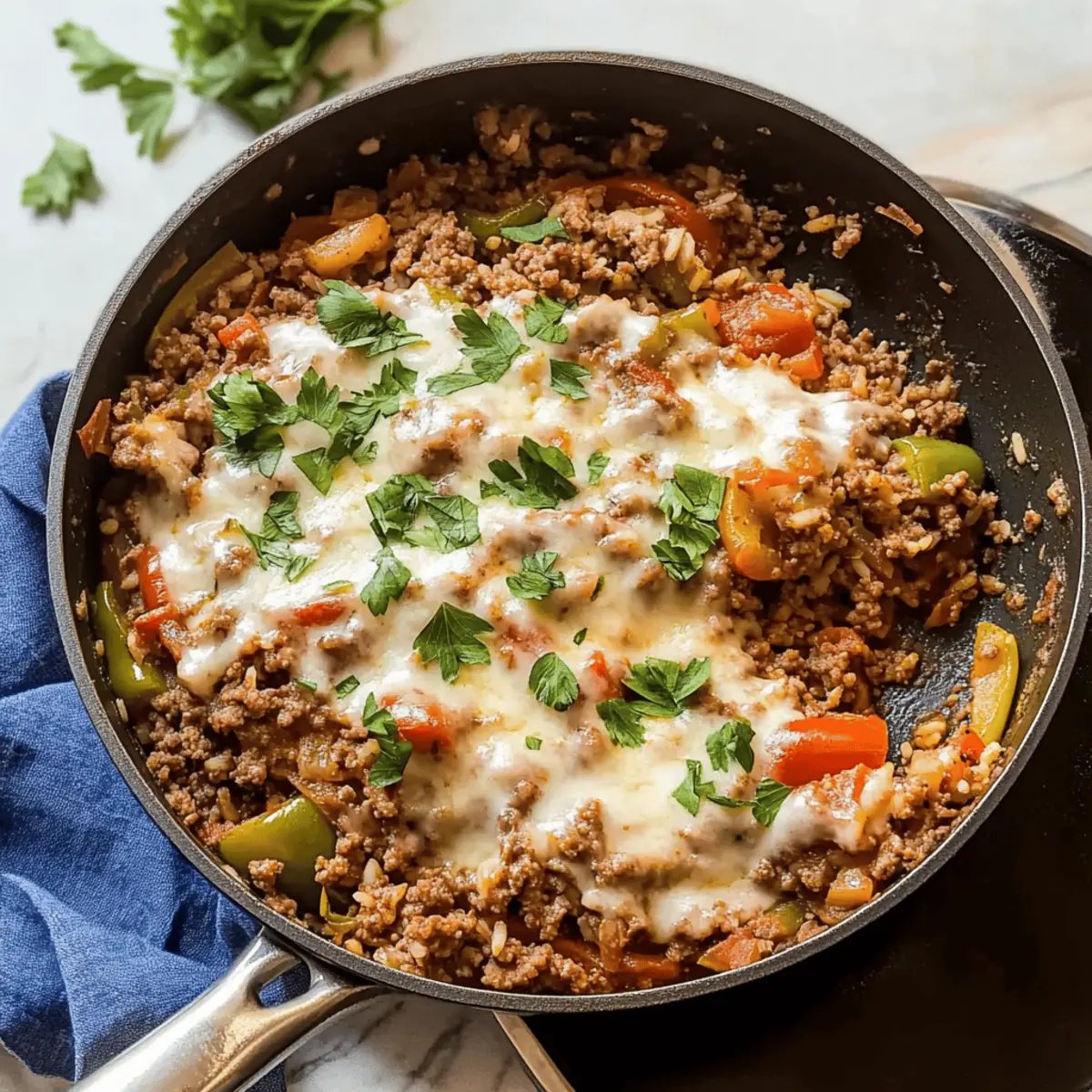 Jump to Recipe Print RecipeThe sizzle of ground beef mingling with the rich aroma of cooked onions and garlic can transform any ordinary weeknight into a comforting culinary retreat. This Easy One-Pot Unstuffed Peppers Skillet takes the classic flavors of stuffed peppers and simplifies them into a stress-free dish that’s ready in about 30 minutes. Not only is it a total crowd-pleaser perfect for family dinners, but it’s also a breeze to prepare with minimal cleanup—just one pot does it all! Imagine digging into tender rice infused with savory beef, vibrant bell peppers, and a gooey layer of melted mozzarella; it’s like warming up to a hug after a long day. Will you give this cozy recipe a try? Why is this Peppers Skillet a must-try? Convenience at Its Best: This easy one-pot dish minimizes cleanup and maximizes flavor. Quick Cooking: Ready in about 30 minutes, it’s perfect for busy weeknights. Deliciously Hearty: Packed with savory flavors from ground beef, colorful peppers, and melted mozzarella, every bite feels warm and fulfilling. Family-Friendly: It’s a recipe that everyone loves, making it a go-to for family dinners. Customizable: You can add your favorite veggies or even spice it up with jalapeños for a unique twist. Perfect Pairing: Serve with a light salad or some garlic bread for the ultimate comfort meal! Peppers Skillet Ingredients For the Base • Ground Beef – Main protein source for the dish; swap with ground turkey for a lighter option. • Yellow Onion – Adds sweetness and savory depth; white onion can serve as an alternative. • Garlic – Provides aromatic flavor; fresh minced garlic yields the best results. • Beef or Chicken Broth – Liquid base for cooking rice and enhancing flavor; vegetable broth can be a vegetarian substitute. • White Jasmine Rice – Maintains a fluffy texture and nicely absorbs flavors; brown rice works too if you adjust the liquid. For the Peppers & Tomatoes • Bell Peppers – Brings color, texture, and sweetness; red and yellow are sweeter, while green has a bit more bite. • Diced Tomatoes – Adds moisture and acidity; fresh tomatoes may be used for an even fresher taste. • Tomato Paste – Enriches tomato flavor and thickens the dish; you can swap it with crushed tomatoes if desired. For Seasoning • Worcestershire Sauce – Introduces umami depth; liquid aminos can replace it for gluten-free diets. • Italian Seasoning – Imparts a wonderful herbaceous flavor; a mix of dried basil, oregano, and thyme works in a pinch. • Kosher Salt & Black Pepper – Essential for balanced seasoning; adjust according to the broth used. For the Topping • Shredded Mozzarella – Adds creaminess and flavor; omit for a dairy-free version or substitute with vegan cheese. • Parsley (optional) – For garnish and a pop of freshness; enhances the dish’s overall presentation. Step‑by‑Step Instructions for Unstuffed Peppers Skillet Step 1: Brown the Base In a large skillet over medium-high heat, add the ground beef, yellow onion, and minced garlic. Cook for about 4-5 minutes, stirring regularly until the beef is browned, and the onions become translucent and fragrant. You’ll know it’s ready when no pink remains in the meat, and the onions are soft. Step 2: Stir in the Main Ingredients Once the beef is browned, drain any excess grease if necessary. Stir in the beef or chicken broth, white jasmine rice, diced tomatoes, tomato paste, Worcestershire sauce, Italian seasoning, kosher salt, and black pepper. Mix thoroughly until all ingredients are combined, and let it simmer for a moment, allowing the flavors to meld. Step 3: Simmer the Rice Bring the Unstuffed Peppers Skillet mixture to a gentle simmer, then reduce the heat to medium-low. Cover the skillet with a well-fitting lid and let it cook for 18-20 minutes. During this time, the rice will absorb the liquid and flavors, and you’ll want to check for tenderness and if the liquid is fully absorbed. Step 4: Add the Bell Peppers After 20 minutes, carefully remove the lid and gently fluff the rice with a fork. Fold in the chopped bell peppers, mixing them into the rice and beef mixture for maximum flavor infusion. Cover and cook for an additional 5 minutes, just until the peppers are slightly tender but still vibrant. Step 5: Melt the Cheese Once the peppers are tender, sprinkle the shredded mozzarella cheese over the top of the mixture. Cover the skillet again, allowing the cheese to melt for about 1-2 minutes. Alternatively, you can place the skillet under a broiler for a quick, crispy top if you prefer a golden layer of melted cheese. Step 6: Garnish and Serve After the cheese is melted to your liking, remove the skillet from the heat. Garnish with freshly chopped parsley for an uplifting touch of color. Serve warm, either on its own or with a side of garlic bread or salad for a complete family-friendly meal of Unstuffed Peppers Skillet. Make Ahead Options These Unstuffed Peppers Skillet are perfect for meal prep enthusiasts! You can brown the ground beef, onion, and garlic up to 24 hours in advance, then store them in an airtight container in the refrigerator. You can also measure out and combine the rice, broth, diced tomatoes, and seasoning ahead of time, keeping them refrigerated separately. Just remember to chop the bell peppers right before cooking to maintain their freshness and color. When you’re ready to serve, simply reheat the beef mixture in a skillet, add the rice blend, followed by the bell peppers, and cook until heated through, finishing with the melted mozzarella on top for delicious results with minimal effort! Peppers Skillet Variations & Substitutions Embrace your creativity and customize this delightful dish with these fun twists and swaps! Veggie Boost: Add chopped zucchini or carrots for extra nutrition and color, making it even more vibrant and wholesome. Whole Grain Goodness: Swap white jasmine rice for quinoa or couscous; both options bring u